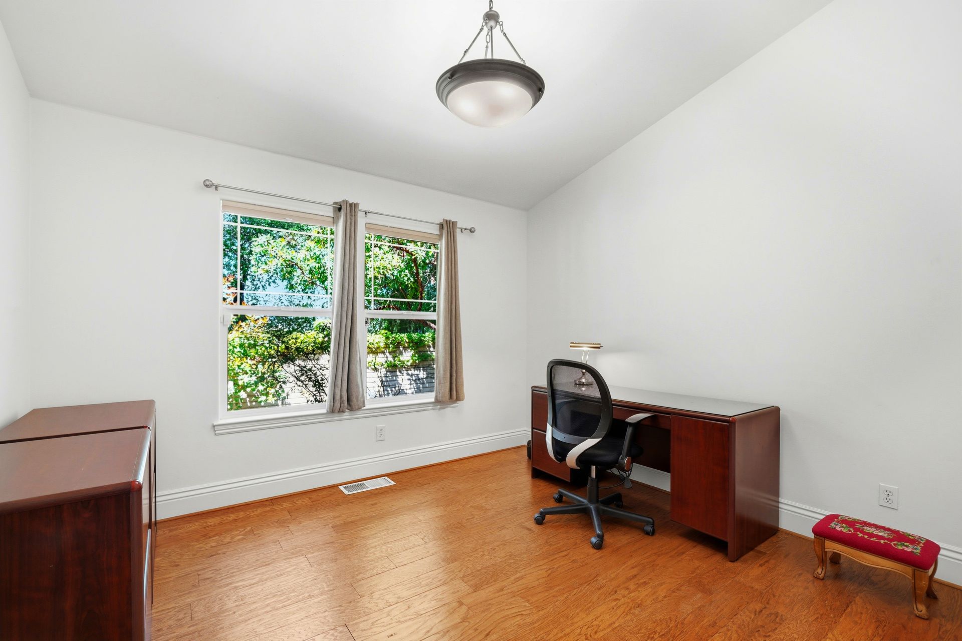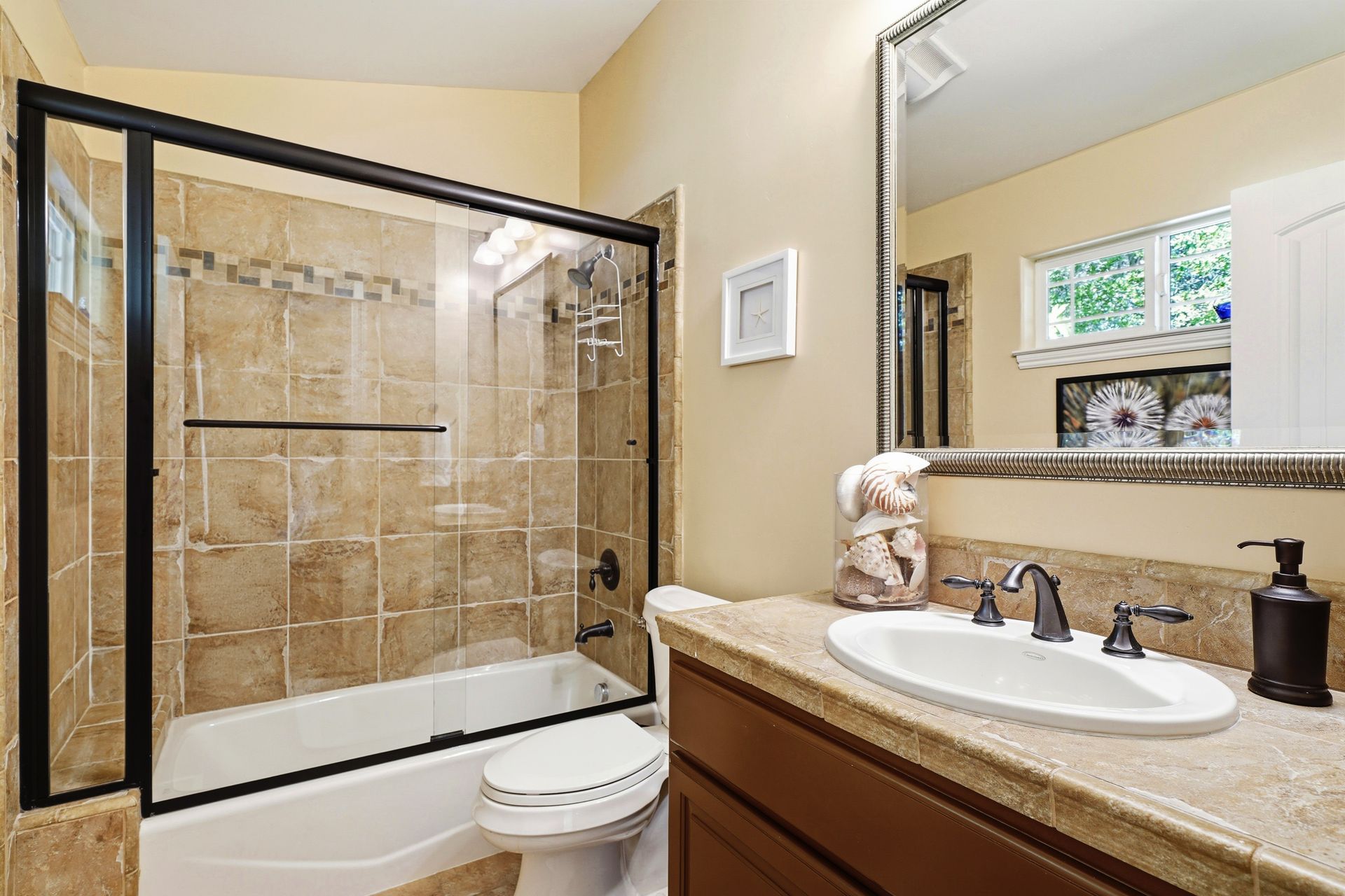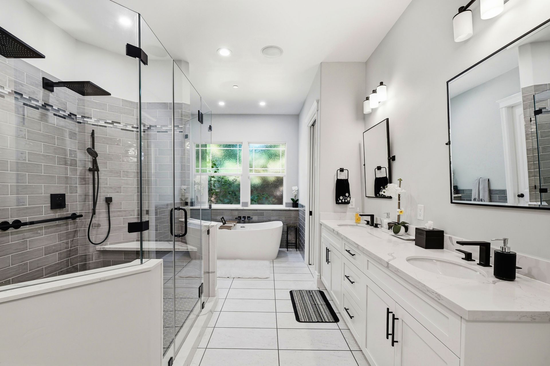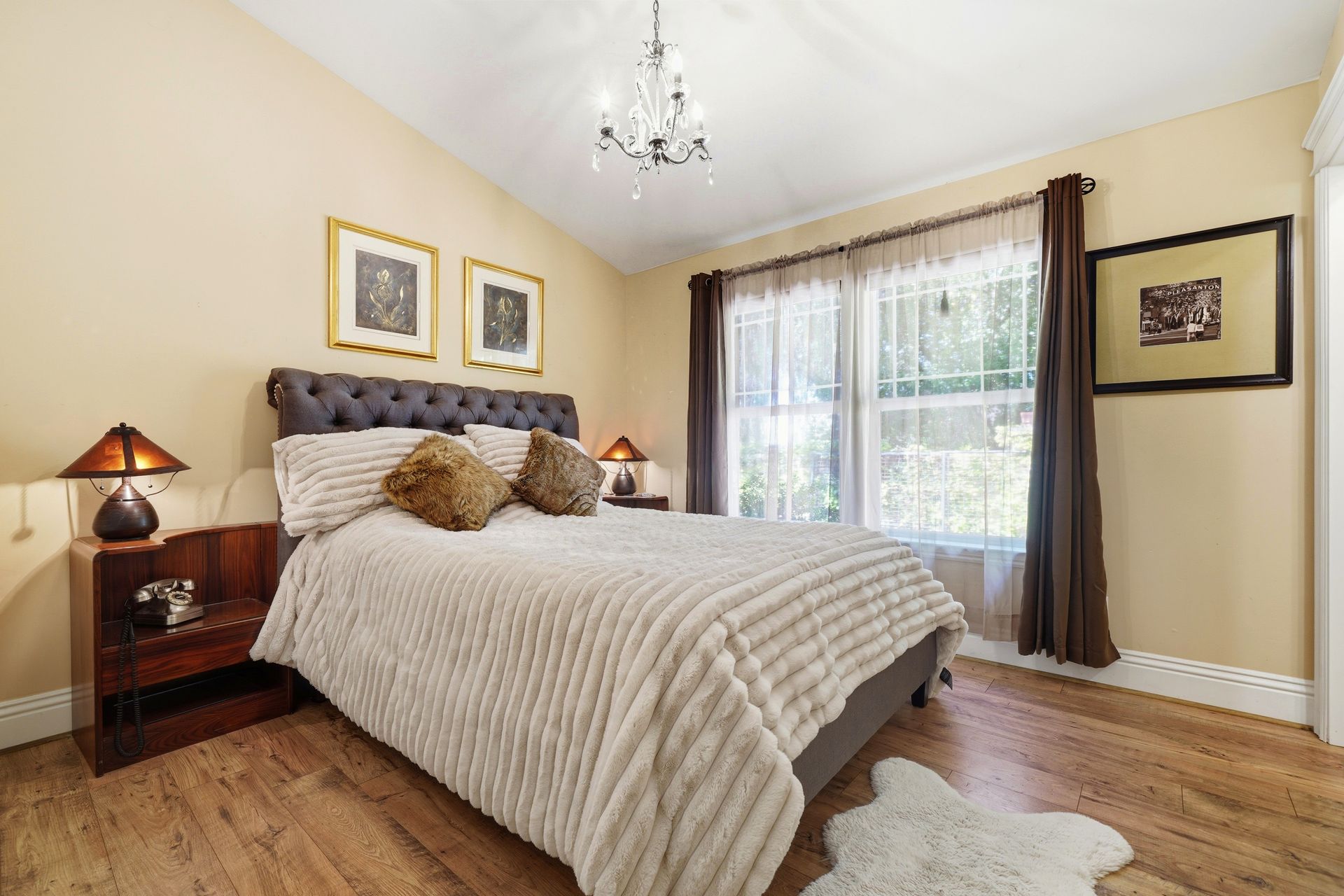The other wing has five bedrooms and four bathrooms. First bedroom has its own private bath. Two bedrooms on the right have a dual bathroom with two sinks. The laundry room is on the left, along with a hall bathroom, followed by another bedroom. The primary suite is at the end of the hallway. It features a fireplace, French Doors to an outdoor deck with hot tub, and large walk-in closet. The chic bath has a dual shower with seating, a soaking tub, vanity counter. Other features: plank hardwood flooring; tile floors in baths and laundry; two-zone heating; three-car garage.