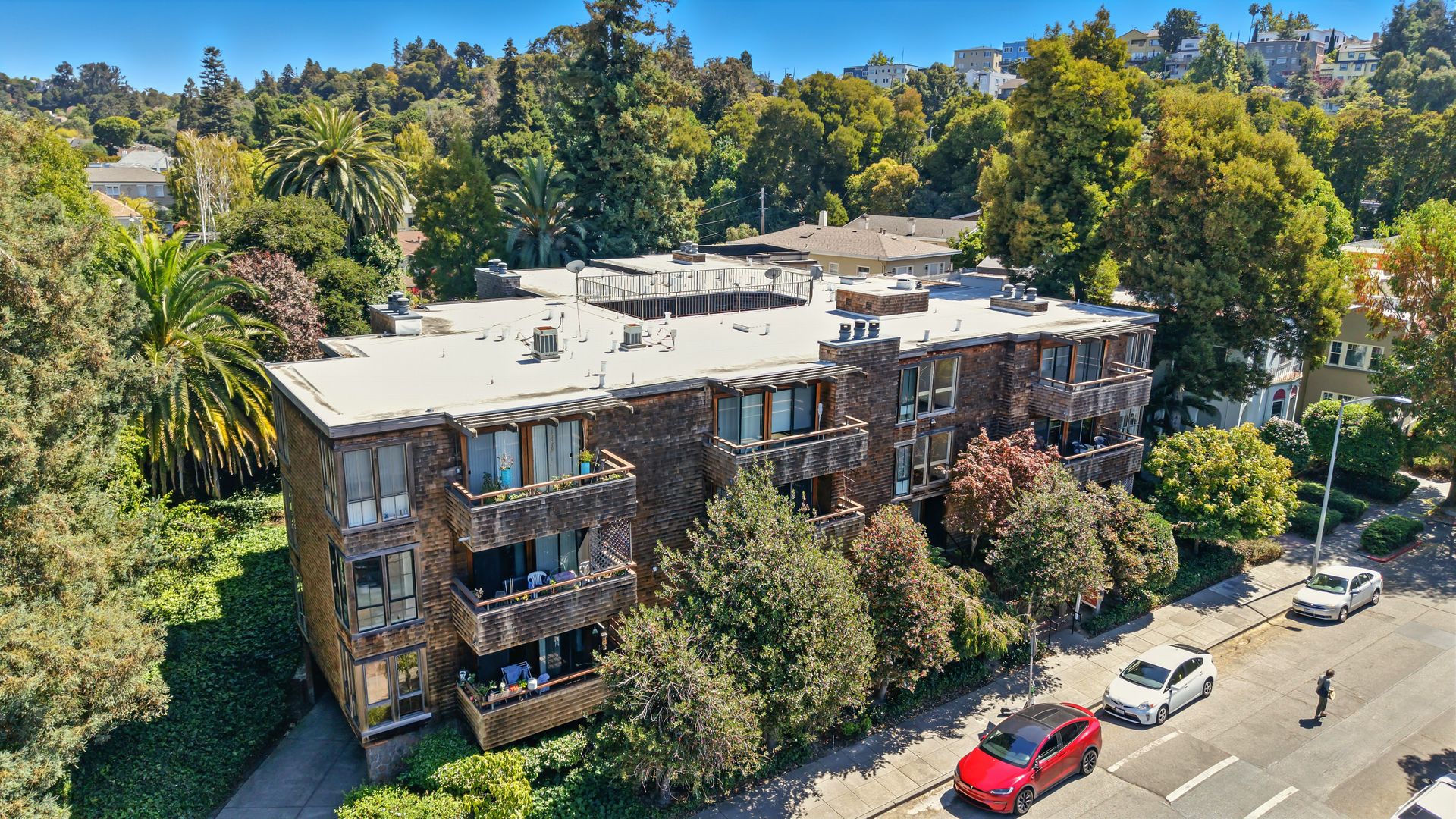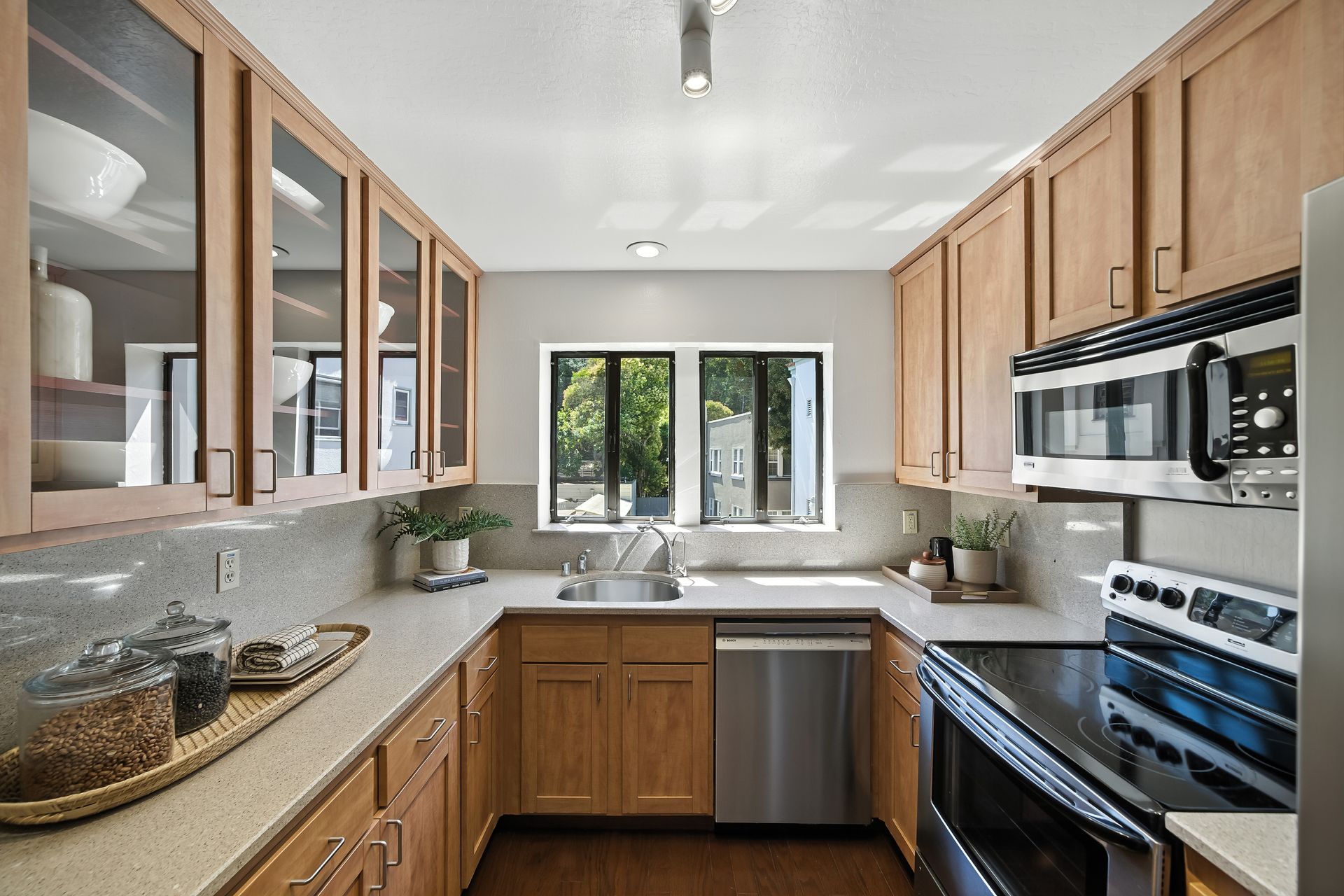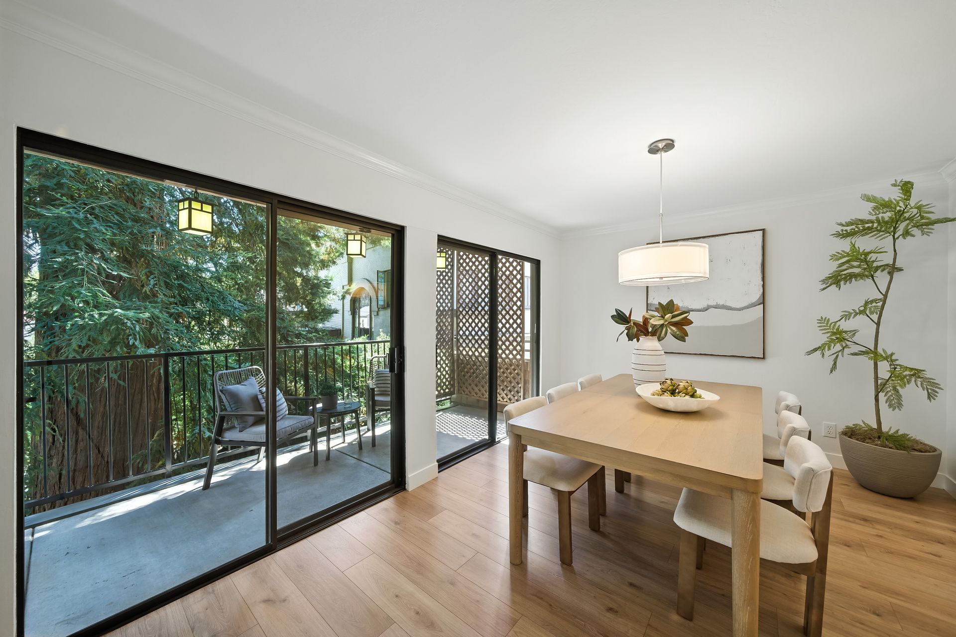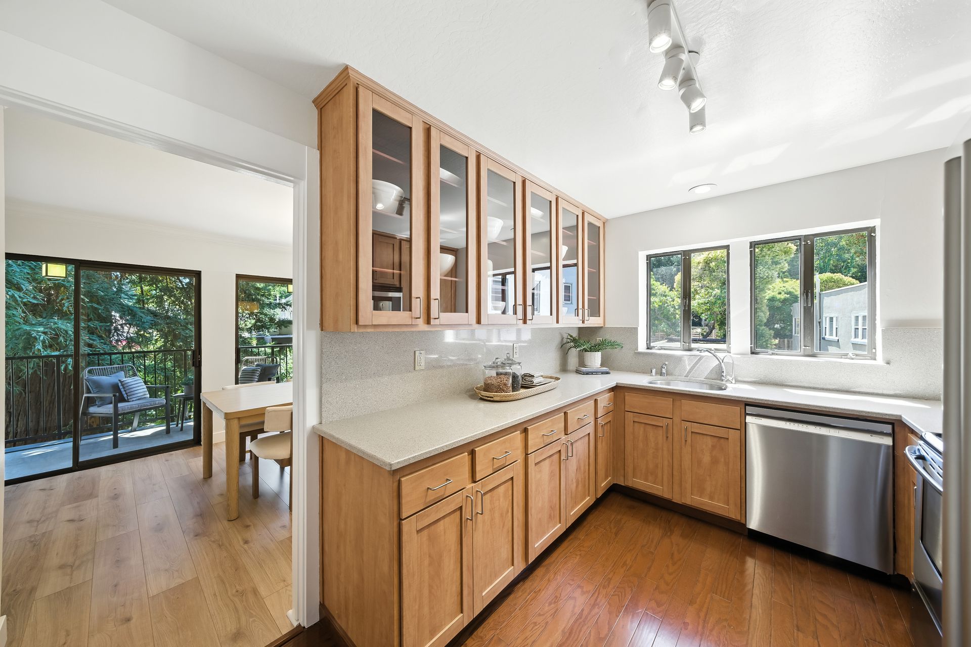 Do you dream of starting your day going out your front door to enjoy the best cup of coffee, warm freshly glazed donuts from the iconic Colonial Donuts, and a venture around the famous Lake Merritt? This extensively upgraded corner end-unit condo, peacefully situated at the back of a small, intimate 15-unit building at the intersection of Trestle Glen and Wesley, makes that dream a reality! With approximately 1,300 square feet, more than many single-family homes, you’ll enjoy a spacious, maintenance-free lifestyle. The desirable floor plan, with newly installed plank laminate flooring, offers a great distribution of rooms with a wealth of windows filling each space with natural light. The generous deck lets you unwind at day’s end or host friends before dinner in the adjacent dining room. The convenient kitchen features glass-front cabinets and a pantry for added storage. Retreat to the primary suite with its walk-in closet with organizers, dual vanity and illuminated mirrors. The second bedroom also offers impressive size and a spacious closet. The updated hall bath includes a stackable washer and dryer. Experience the best of neighborhood living with evenings at Bardo, Saturday Farmer's Market, Arizmendi pizza, Grand Lake Theater, and Trader Joe's - come for the beauty, stay for the convenience!