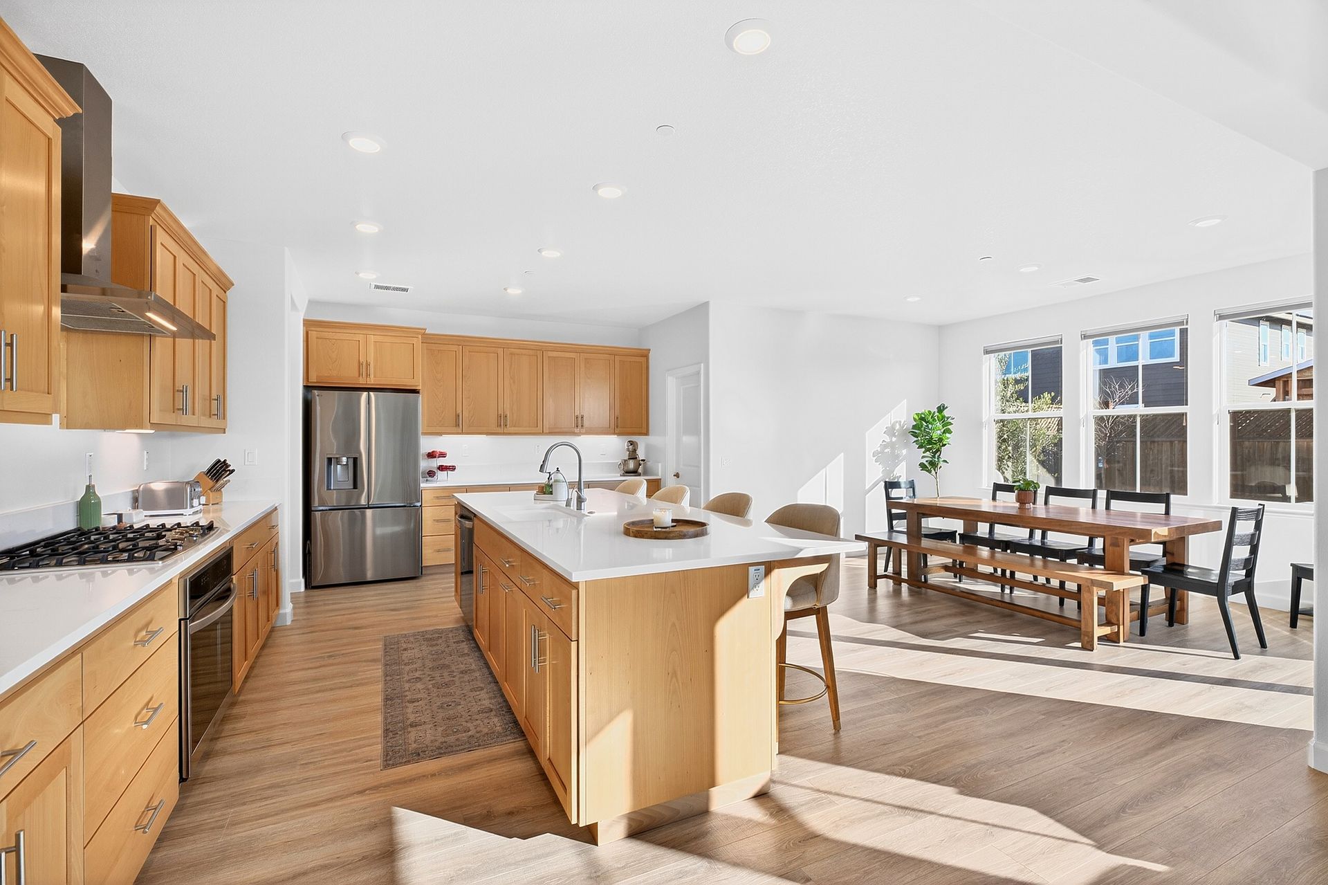 This beautifully appointed 4-bedroom (1 bedroom downstairs, 3 bedrooms upstairs), 3.5-bath, 2,549 square foot newer home built in 2023 located in Rohnert Park’s desirable Willowglen Community. This home offers the perfect blend of comfort and modern living w/a 5,050 square foot lot. Enjoy an open-concept layout flooded w/natural light, perfect for entertaining. The entry level bedroom and full bathroom (ideal for guests, or the convenience of a home office) plus a half bath on the main level. Chefs will love the gourmet kitchen w/an adjacent dining area, stainless steel appliances, 5-burner gas cooktop w/hood and built-in oven below, quartz countertops, a large island w/sink and instant hot water, dishwasher, cabinet/drawer storage, bar seating, ample counter space and cabinetry and a large walk-in pantry w/electrical outlet! Enjoy gatherings in the living room w/gas fireplace, raised heart and mantle. Enjoy views of the Sonoma Mountains from the primary suite, featuring a soaking tub, separate shower, double sinks, walk-in closet w/custom organizer w/shelves, drawers, cabinets and ample hanger space. Other features include a laundry room w/cabinets, heat-pump system for central A/C and heating, owned solar, tankless water heater, recessed lighting, Simply Safe alarm system, window coverings, water filtration system and additional lighting in garage. Outdoor features included a covered front porch, paver patio, lawn area, privacy lattice fencing, dog run and mature landscaping. Enjoy the Willowglen neighborhood park; w/a playground, dog park, basketball court, soccer field, lawn areas, benches and tables. Close to parks, schools, shopping, restaurants, wineries, regional parks/trails, equestrian centers, Sonoma State University, Somo Village, Wolf Den Plaza, SMART train, Sonoma Coast, Russian River and all that Sonoma County has to offer! Great for first-time buyers or looking to upgrade, this home is like new w/over $110,000 in upgrades.
