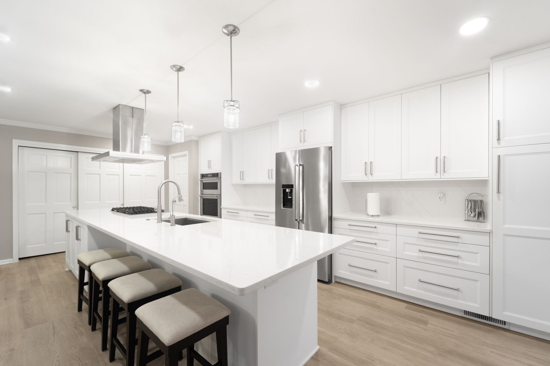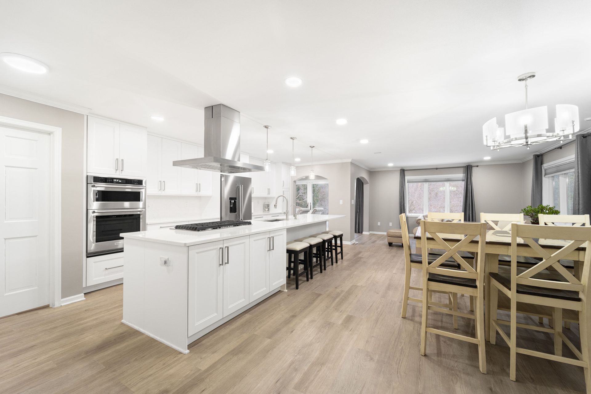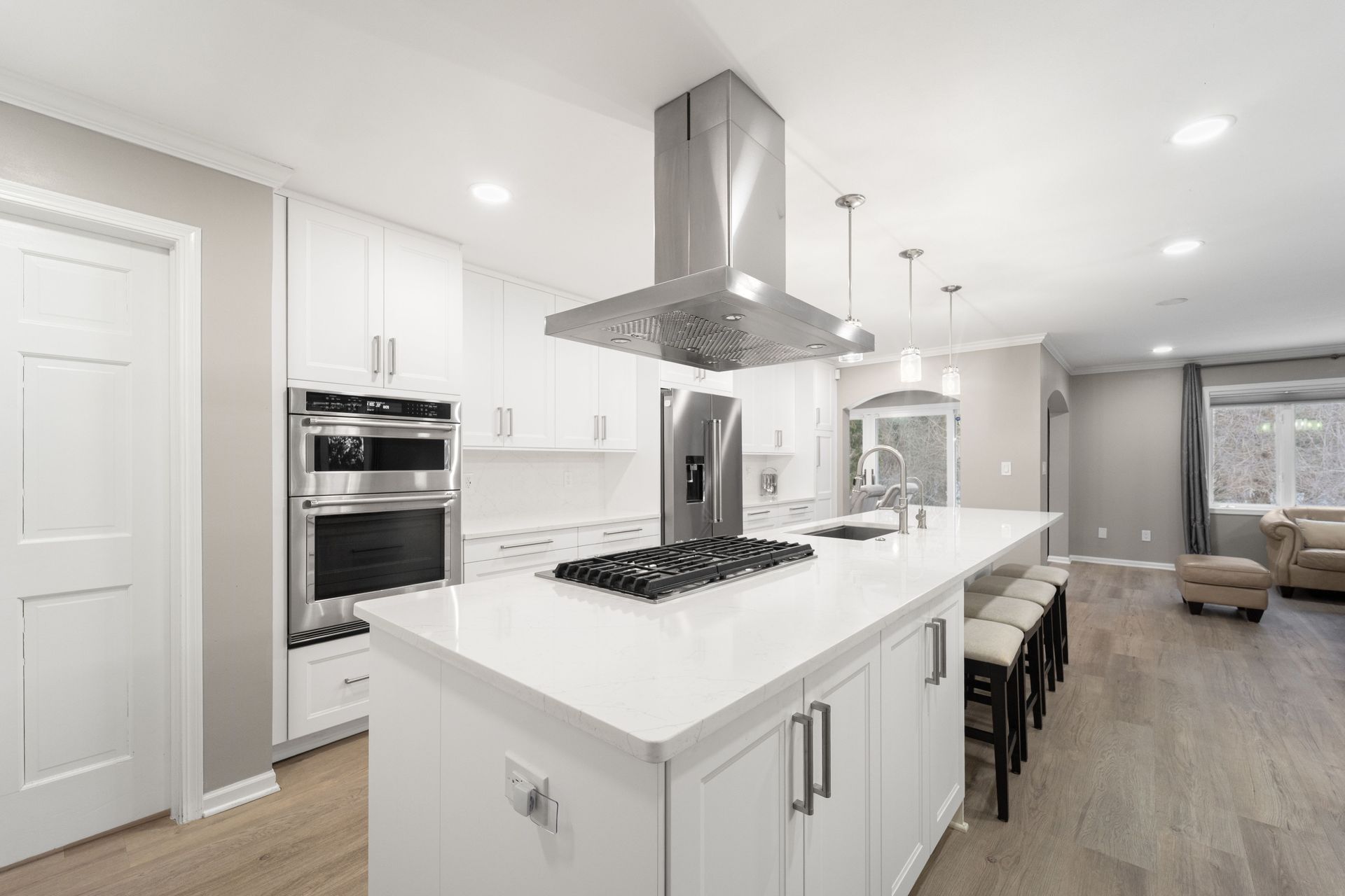 Thoughtfully refreshed throughout, this home features Luxury Vinyl Plank flooring, modern recessed lighting, and an open-concept living room that opens to the dining room, perfect for gathering with guests. The showstopper kitchen is designed to impress with quartz countertops with a breakfast bar, stainless steel appliances, ample cabinetry, a convenient pantry, and a discreet laundry closet for everyday ease.