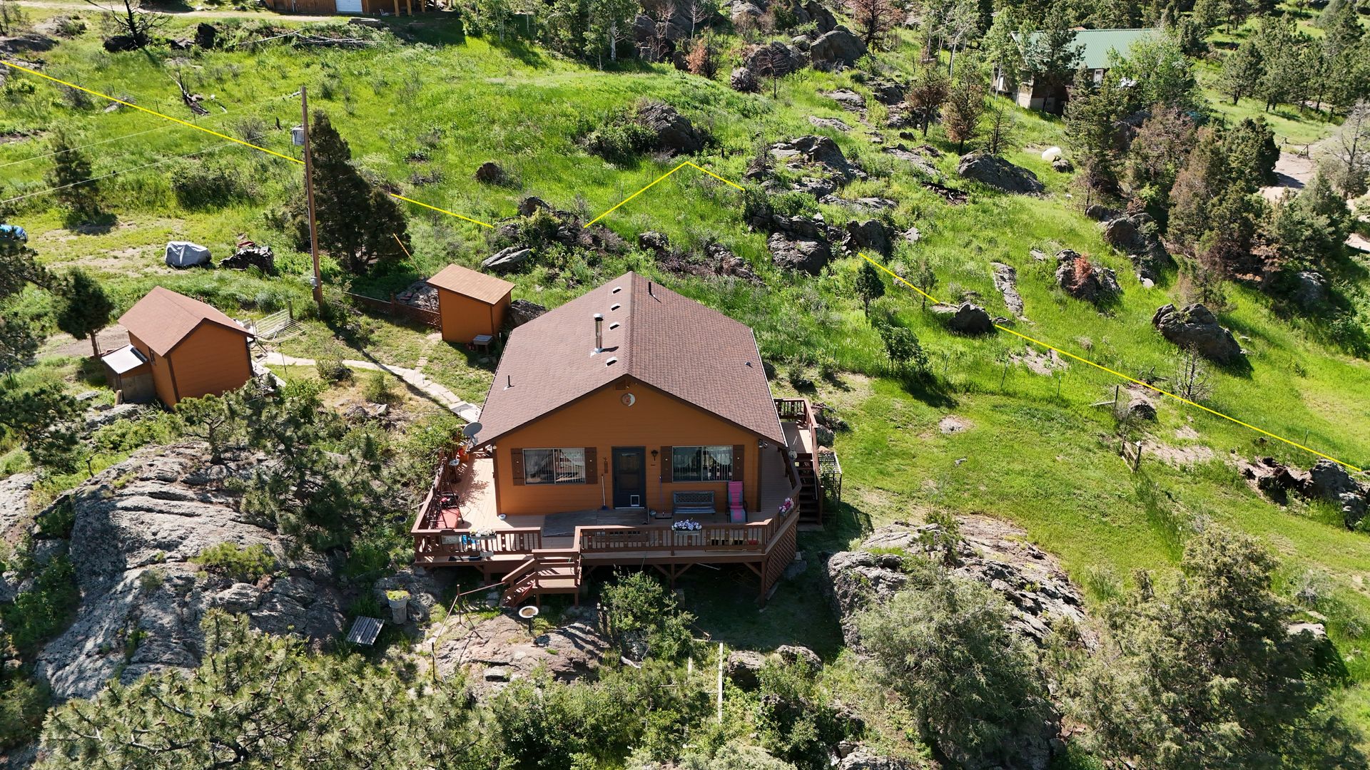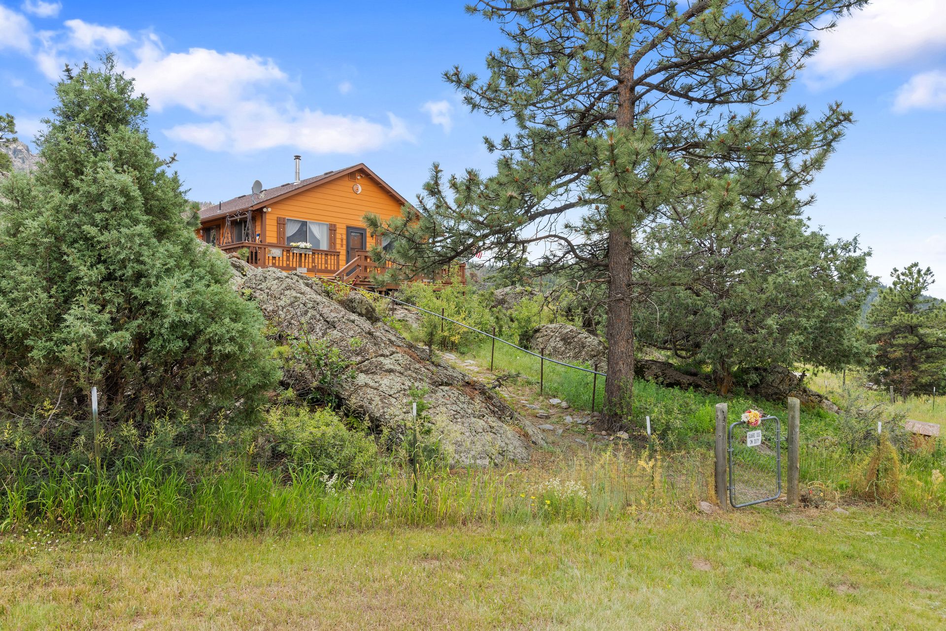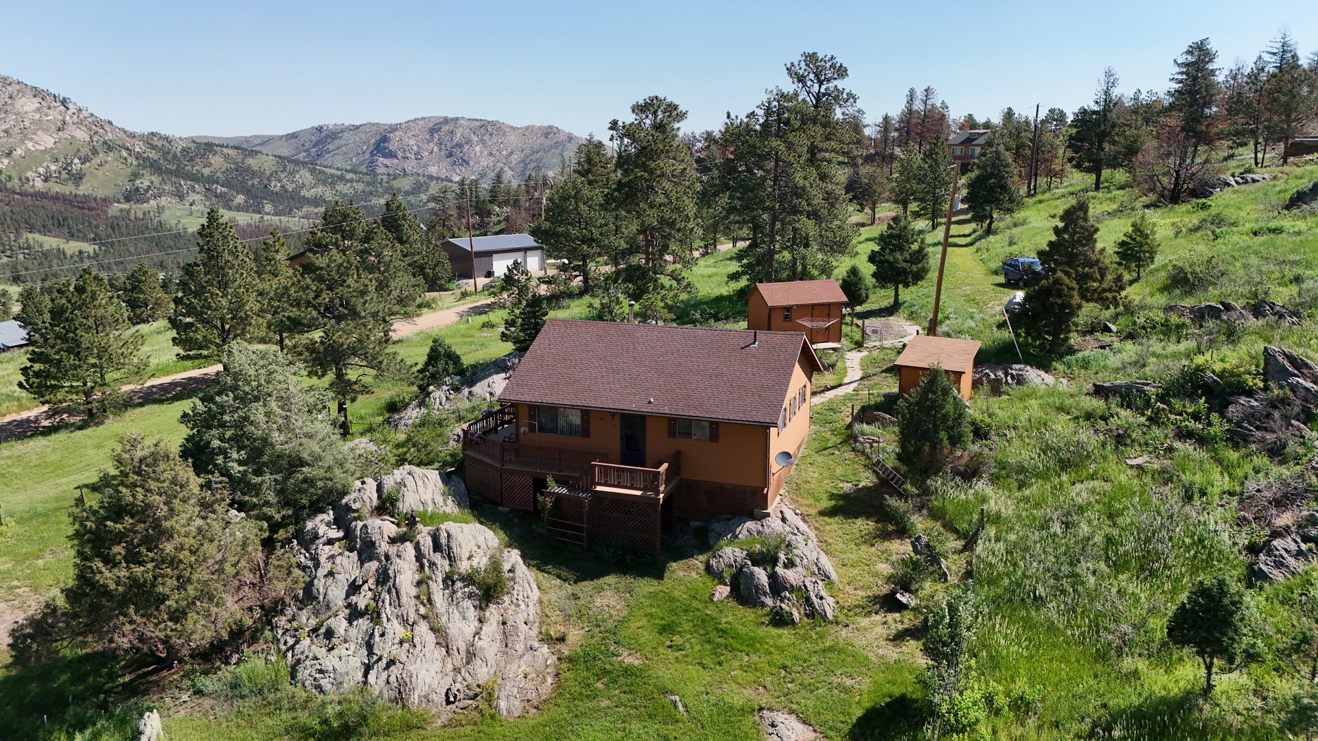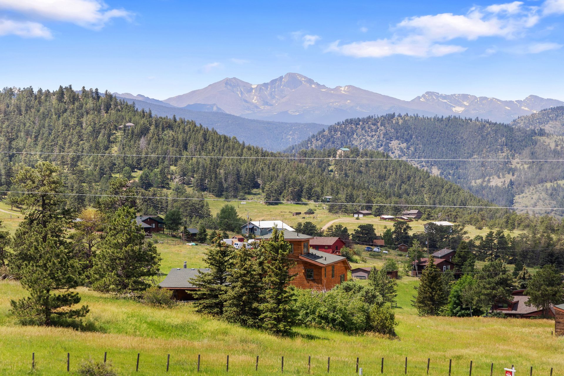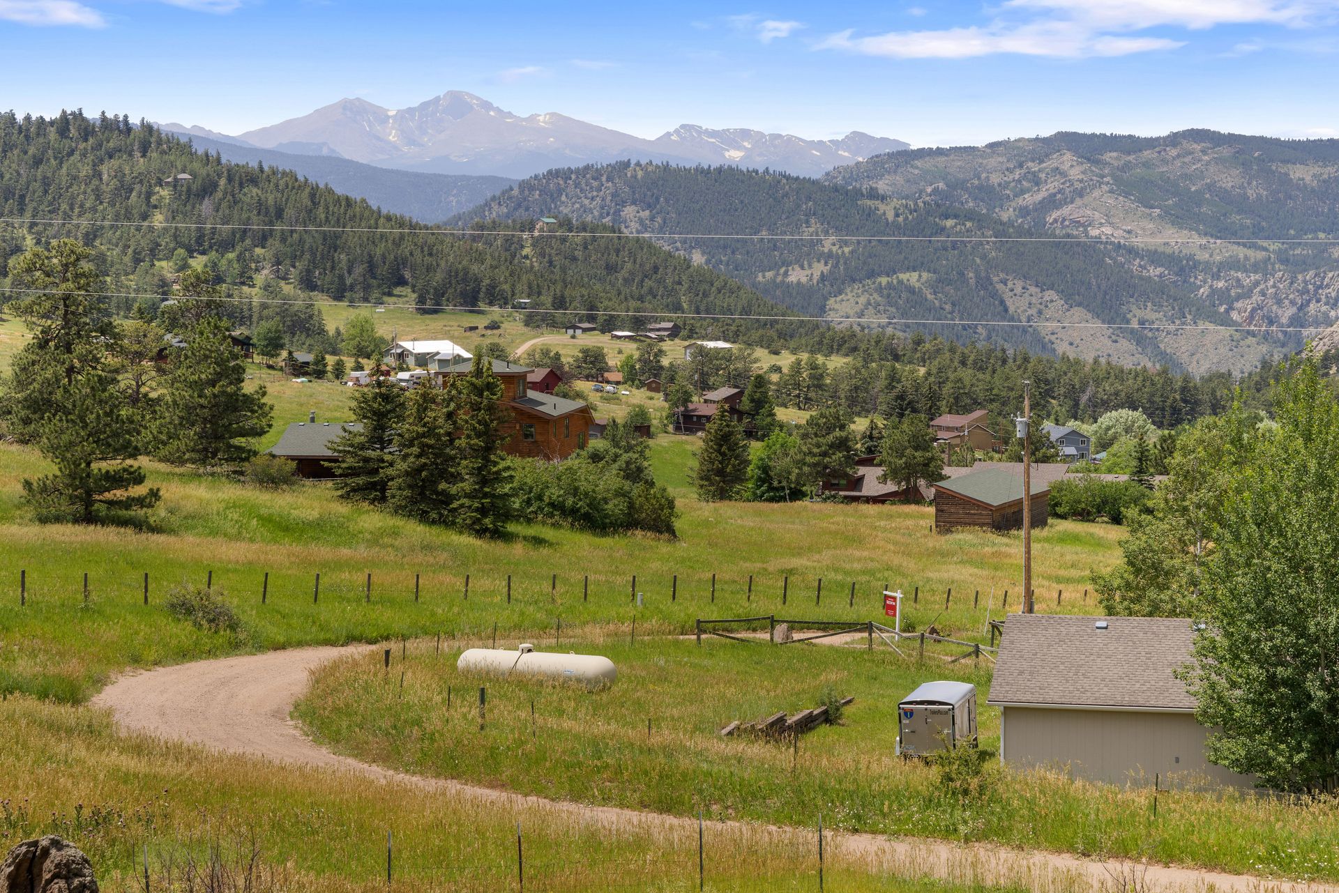 Perched high in the majestic Rocky Mountains, 760 Palisade Mountain Drive offers breathtaking views of Longs Peak, Storm Mountain, and the sweeping western horizon of Rocky Mountain National Park. Affectionately known as The Sun House, this cozy mountain cabin is perfect as a weekend getaway or a full-time residence. Set on a rare double lot totaling just over an acre, the property welcomes horses, ride down to the community lake, where you can enjoy quiet afternoons fishing or picnicking. A large, flat grassy area is ideal for yard games, gatherings, or parking. The land gently rolls into a wildflower-filled meadow with unique rock outcroppings. The cabin sits above it all, surrounded on 3 sides by a wrap-around deck designed to chase the sun. The views of the surrounding peaks and wildlife, and the sounds of hummingbirds in flight, create an immersive mountain experience. Inside, the warm and inviting interior features rustic pine plank walls and vaulted ceilings that create a sense of spaciousness and light. The open-concept living and dining area flows seamlessly into a functional kitchen, all centered around a wood-burning stove that radiates warmth on snowy winter nights. Two comfortable bedrooms and a full bath complete the single-level layout, providing an efficient living space. Ample storage is provided in the generous crawl space, tool shed/workshop, and woodshed. Three separate driveways offer convenient access and plenty of parking. Deep, good producing well and oversized septic system. The county allows for an additional dwelling-offering an incredible opportunity to live in the existing home while building your dream mountain retreat. At nearly 7,000 feet above sea level, Cedar Springs Estates feels like a true mountain sanctuary-peaceful, private, and surrounded by nature-yet close enough to the Front Range for an easy commute when needed. Whether you're seeking a tranquil escape, an adventure basecamp, or a place to expand your vision, The Sun House is ready to welcome you home.