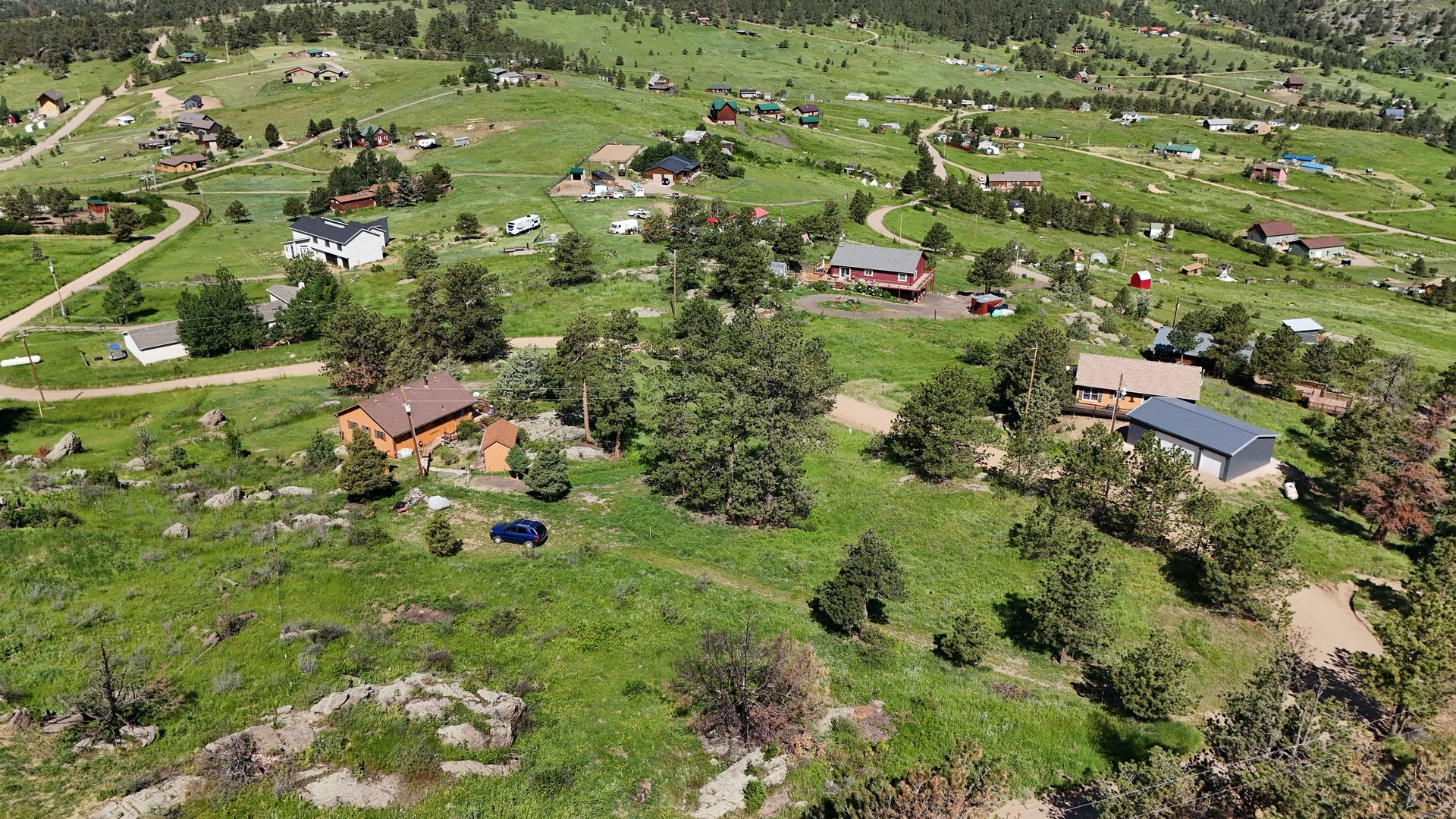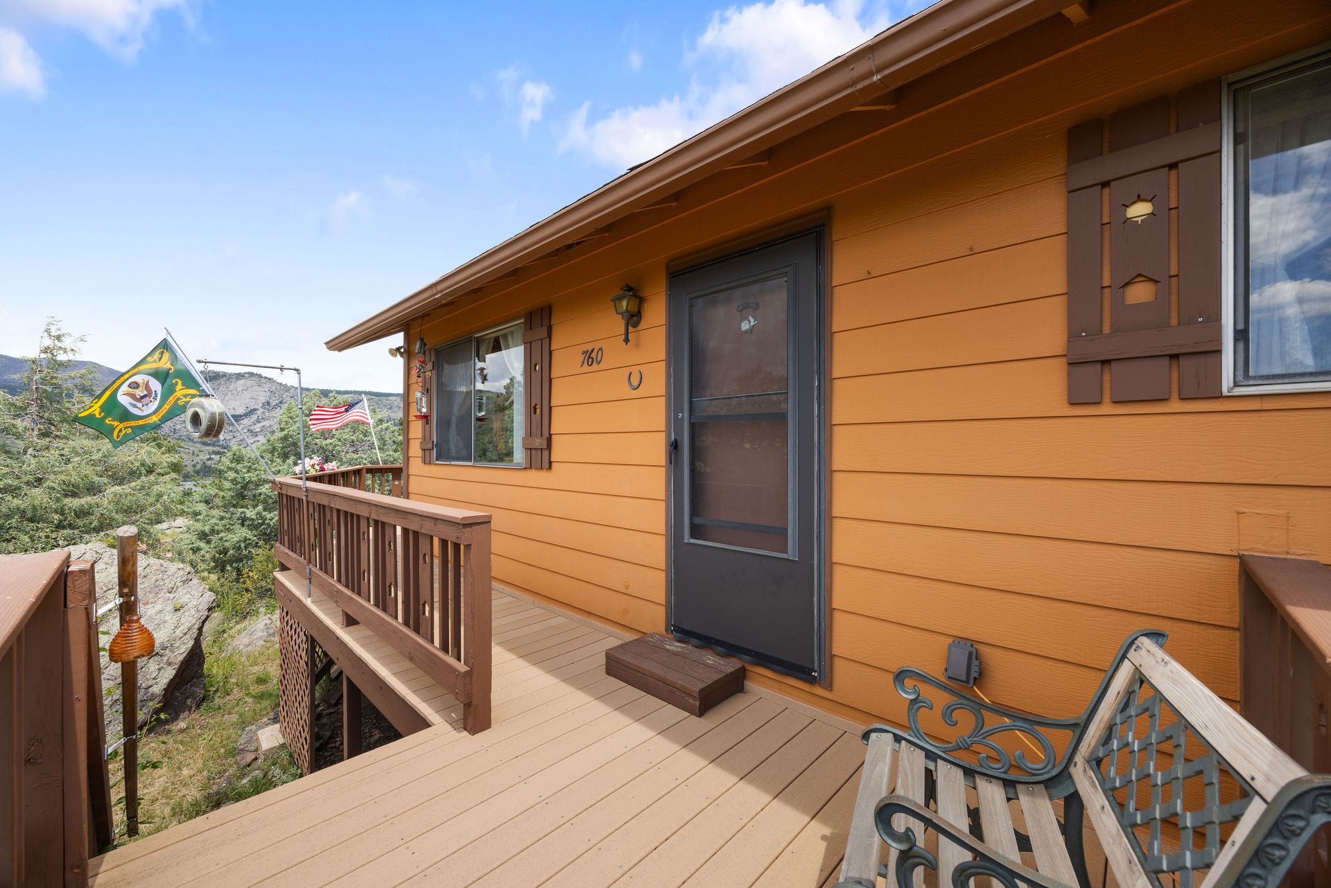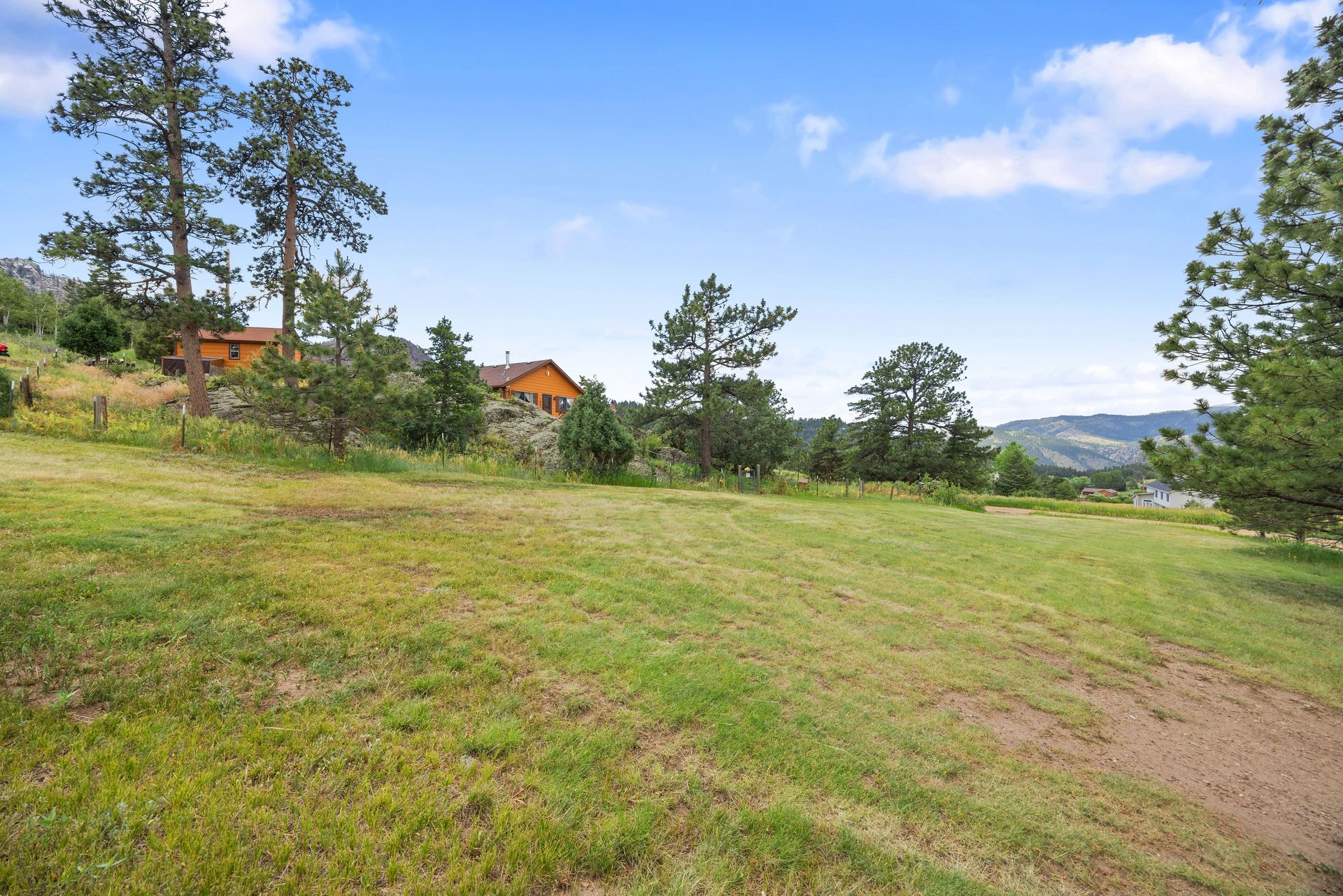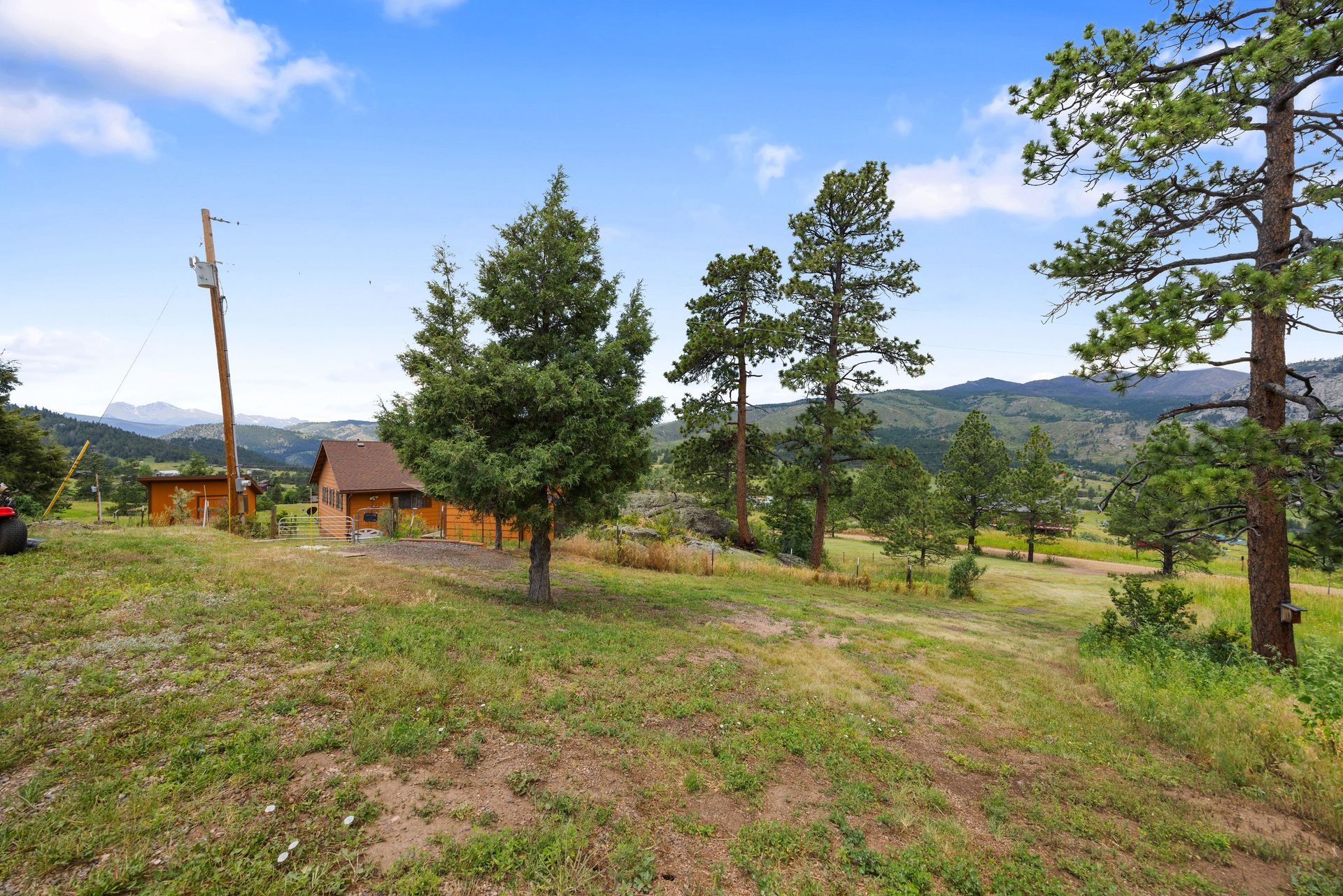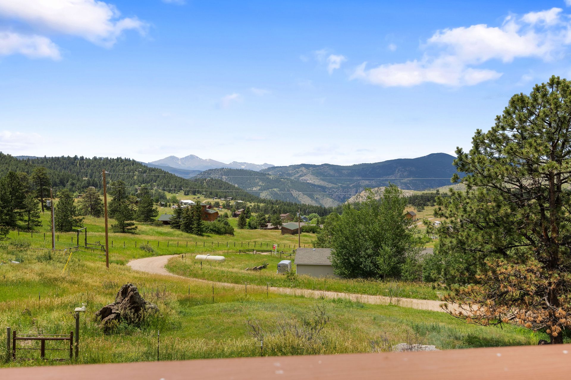 Perched high in the majestic Rocky Mountains, 760 Palisade Mountain Drive offers breathtaking views of Longs Peak, Storm Mountain, and the sweeping western horizon of Rocky Mountain National Park. Affectionately known as The Sun House, this cozy mountain cabin is perfect as a weekend getaway or a full-time residence. Set on a rare double lot totaling just over an acre, the property welcomes horses, ride down to the community lake, where you can enjoy quiet afternoons fishing or picnicking. A large, flat grassy area is ideal for yard games, gatherings, or parking. The land gently rolls into a wildflower-filled meadow with unique rock outcroppings. The cabin sits above it all, surrounded on 3 sides by a wrap-around deck designed to chase the sun. The views of the surrounding peaks and wildlife, and the sounds of hummingbirds in flight, create an immersive mountain experience. Inside, the warm and inviting interior features rustic pine plank walls and vaulted ceilings that create a sense of spaciousness and light. The open-concept living and dining area flows seamlessly into a functional kitchen, all centered around a wood-burning stove that radiates warmth on snowy winter nights. Two comfortable bedrooms and a full bath complete the single-level layout, providing an efficient living space. Ample storage is provided in the generous crawl space, tool shed/workshop, and woodshed. Three separate driveways offer convenient access and plenty of parking. Deep, good producing well and oversized septic system. The county allows for an additional dwelling-offering an incredible opportunity to live in the existing home while building your dream mountain retreat. At nearly 7,000 feet above sea level, Cedar Springs Estates feels like a true mountain sanctuary-peaceful, private, and surrounded by nature-yet close enough to the Front Range for an easy commute when needed. Whether you're seeking a tranquil escape, an adventure basecamp, or a place to expand your vision, The Sun House is ready to welcome you home.