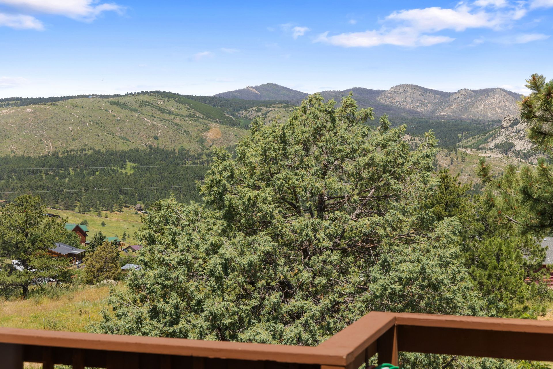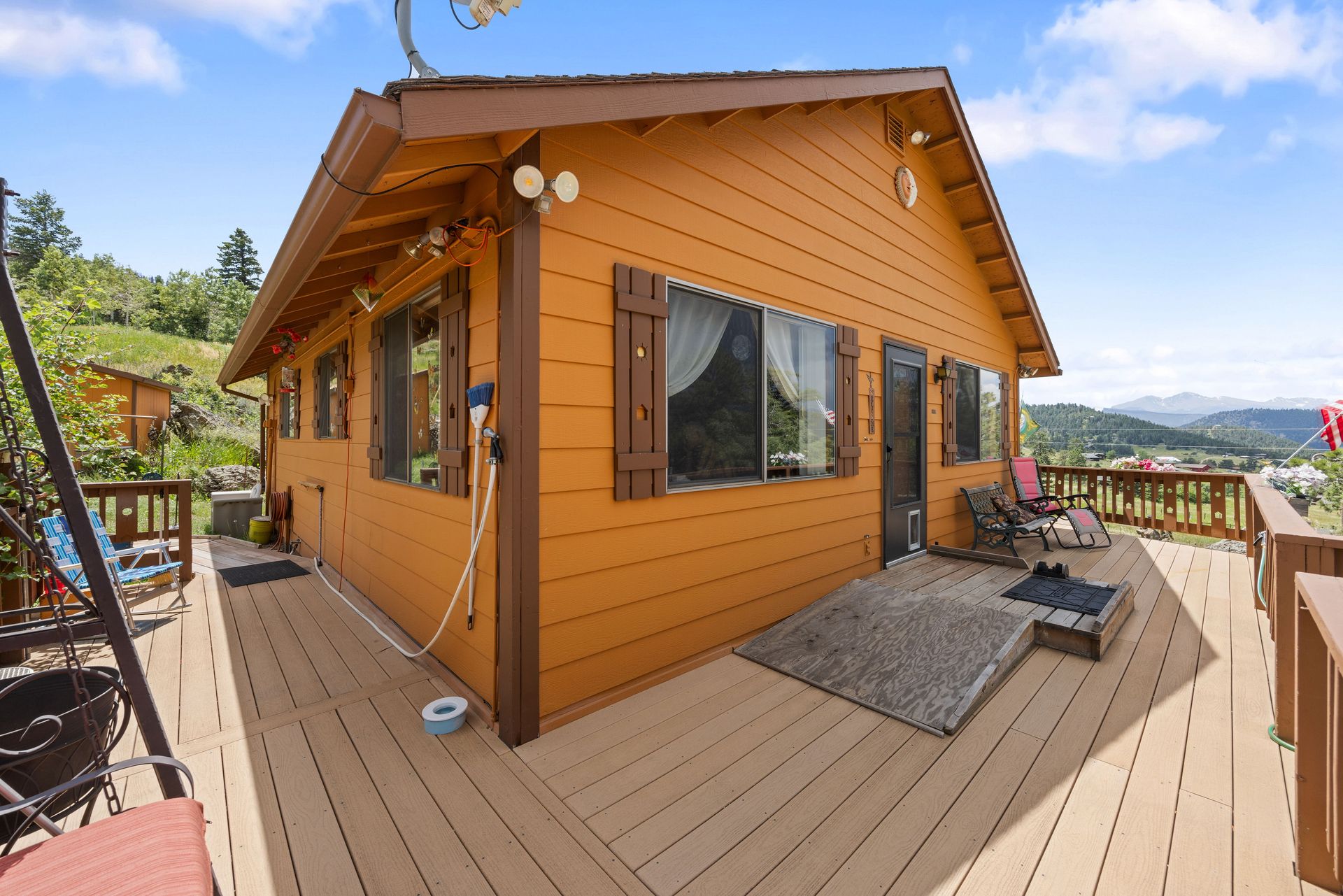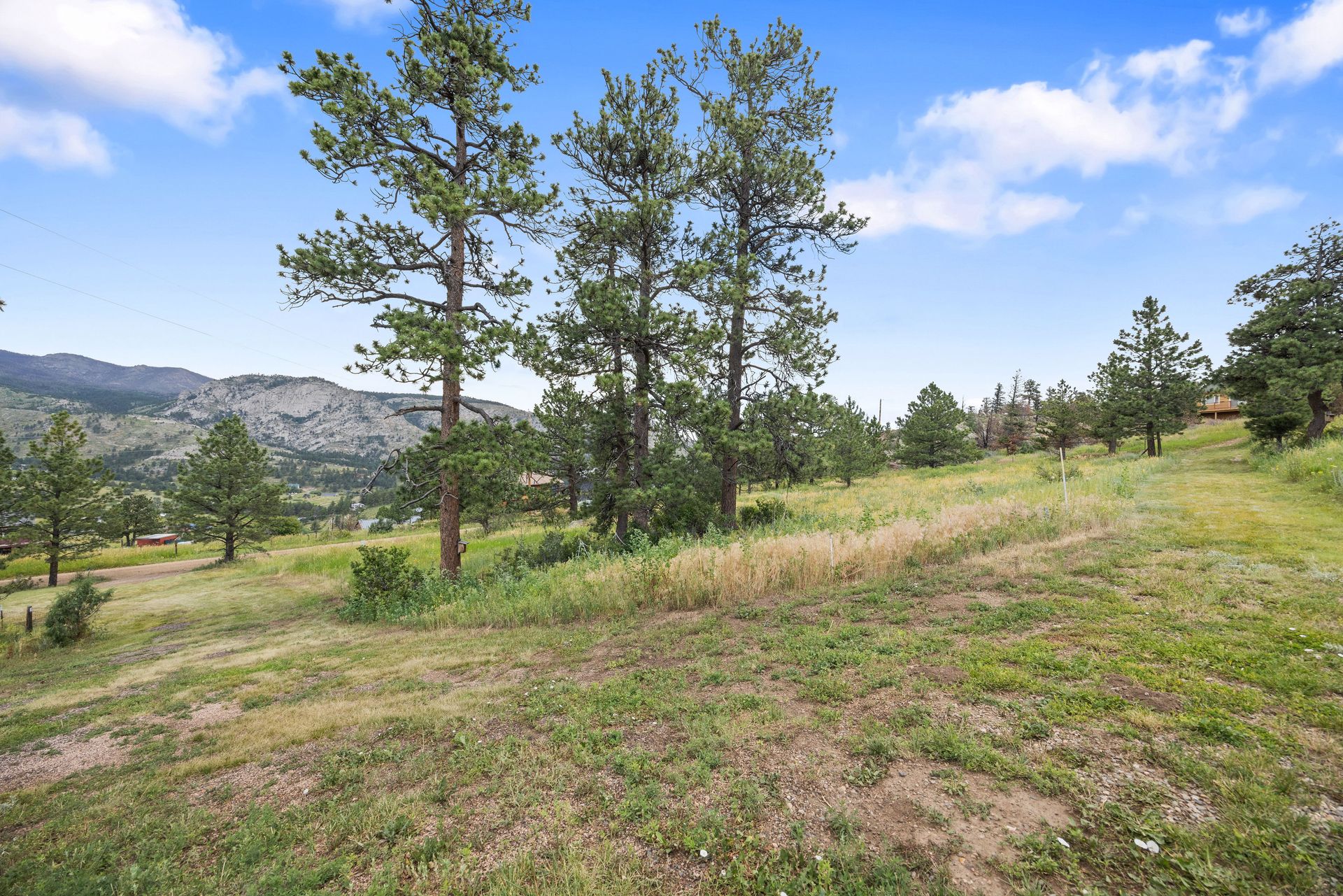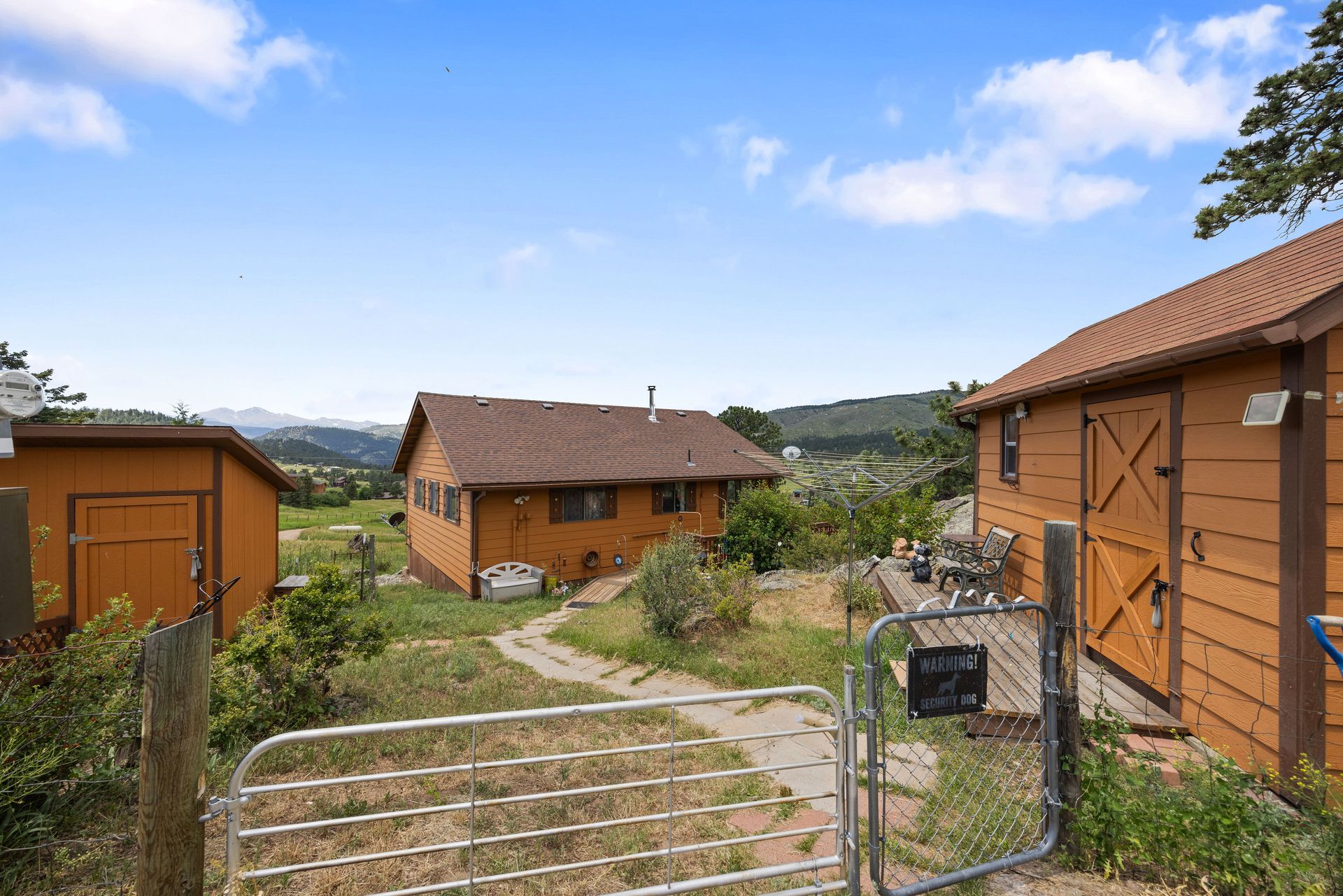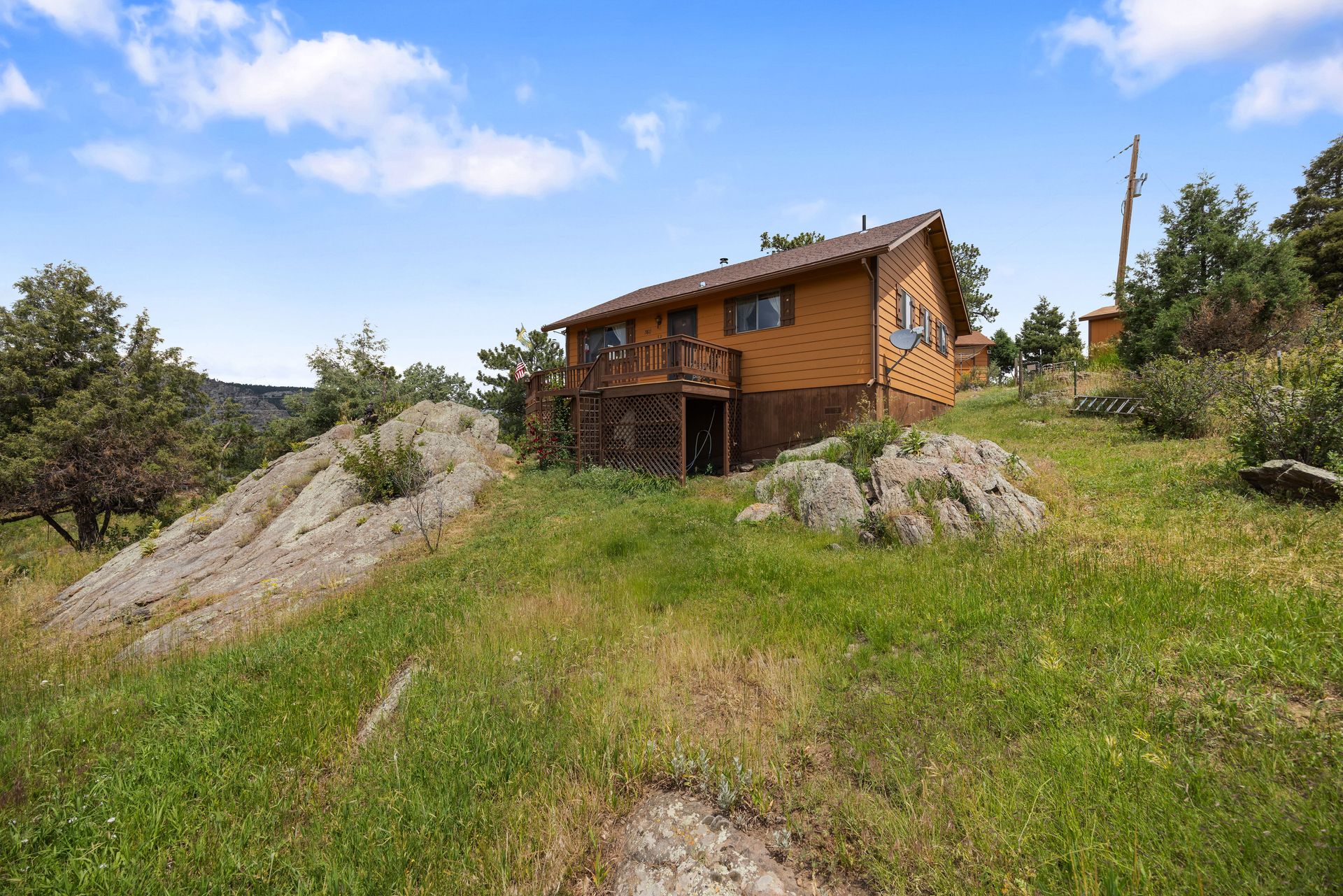 Perched high in the majestic Rocky Mountains, 760 Palisade Mountain Drive offers breathtaking views of Longs Peak, Storm Mountain, and the sweeping western horizon of Rocky Mountain National Park. Affectionately known as The Sun House, this cozy mountain cabin is perfect as a weekend getaway or a full-time residence. Set on a rare double lot totaling just over an acre, the property welcomes horses, ride down to the community lake, where you can enjoy quiet afternoons fishing or picnicking. A large, flat grassy area is ideal for yard games, gatherings, or parking. The land gently rolls into a wildflower-filled meadow with unique rock outcroppings. The cabin sits above it all, surrounded on 3 sides by a wrap-around deck designed to chase the sun. The views of the surrounding peaks and wildlife, and the sounds of hummingbirds in flight, create an immersive mountain experience. Inside, the warm and inviting interior features rustic pine plank walls and vaulted ceilings that create a sense of spaciousness and light. The open-concept living and dining area flows seamlessly into a functional kitchen, all centered around a wood-burning stove that radiates warmth on snowy winter nights. Two comfortable bedrooms and a full bath complete the single-level layout, providing an efficient living space. Ample storage is provided in the generous crawl space, tool shed/workshop, and woodshed. Three separate driveways offer convenient access and plenty of parking. Deep, good producing well and oversized septic system. The county allows for an additional dwelling-offering an incredible opportunity to live in the existing home while building your dream mountain retreat. At nearly 7,000 feet above sea level, Cedar Springs Estates feels like a true mountain sanctuary-peaceful, private, and surrounded by nature-yet close enough to the Front Range for an easy commute when needed. Whether you're seeking a tranquil escape, an adventure basecamp, or a place to expand your vision, The Sun House is ready to welcome you home.