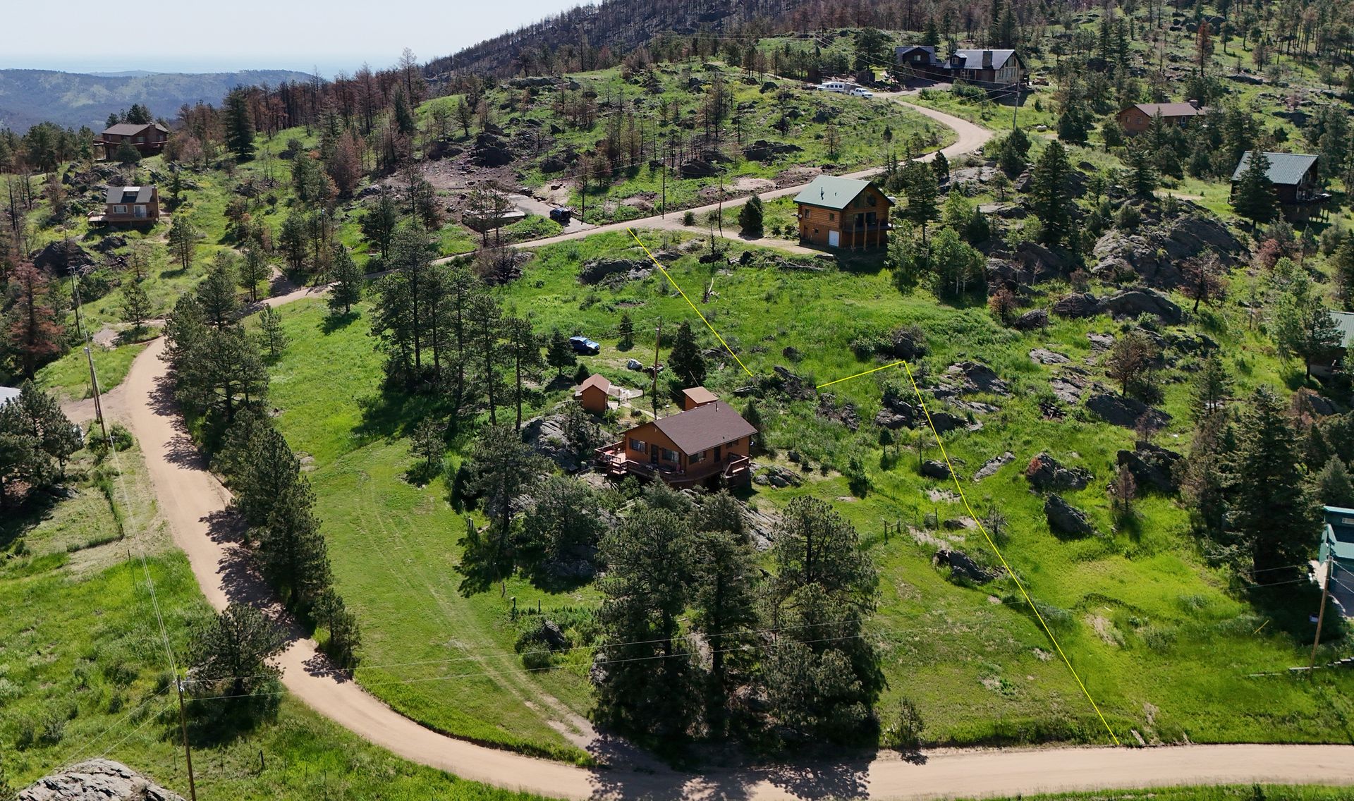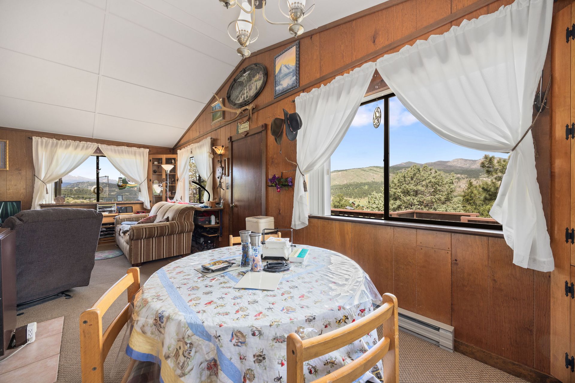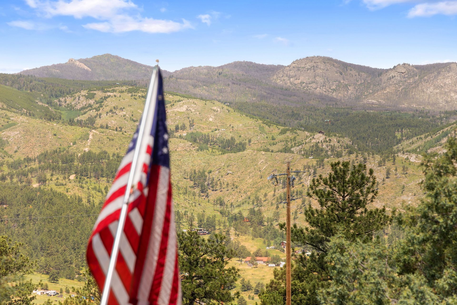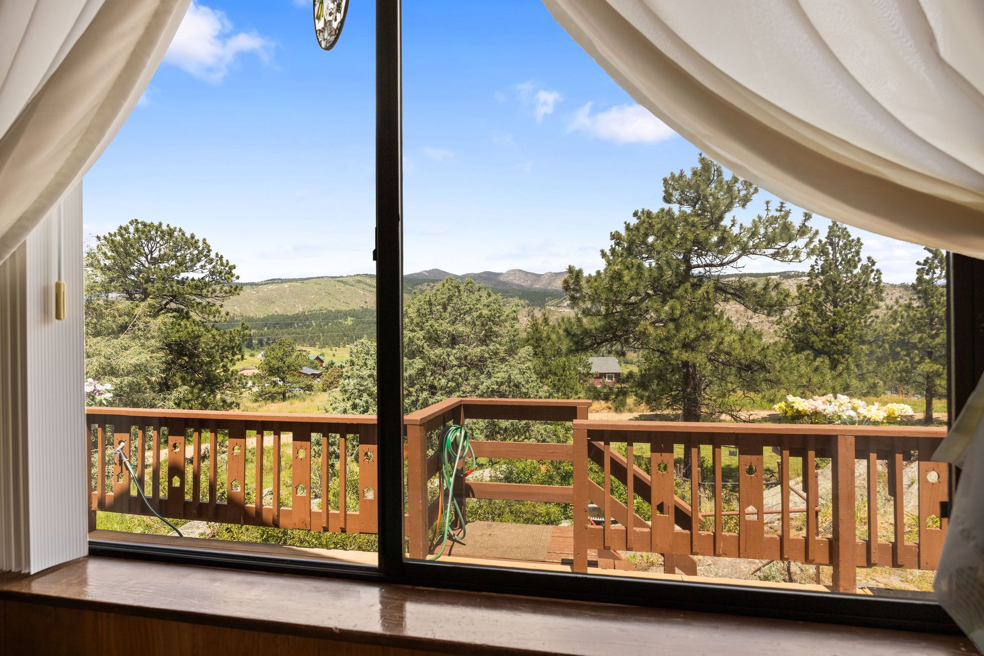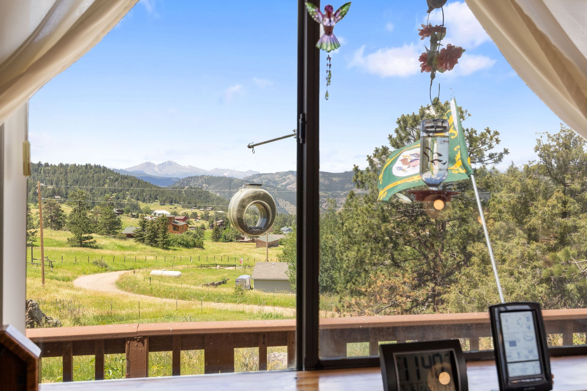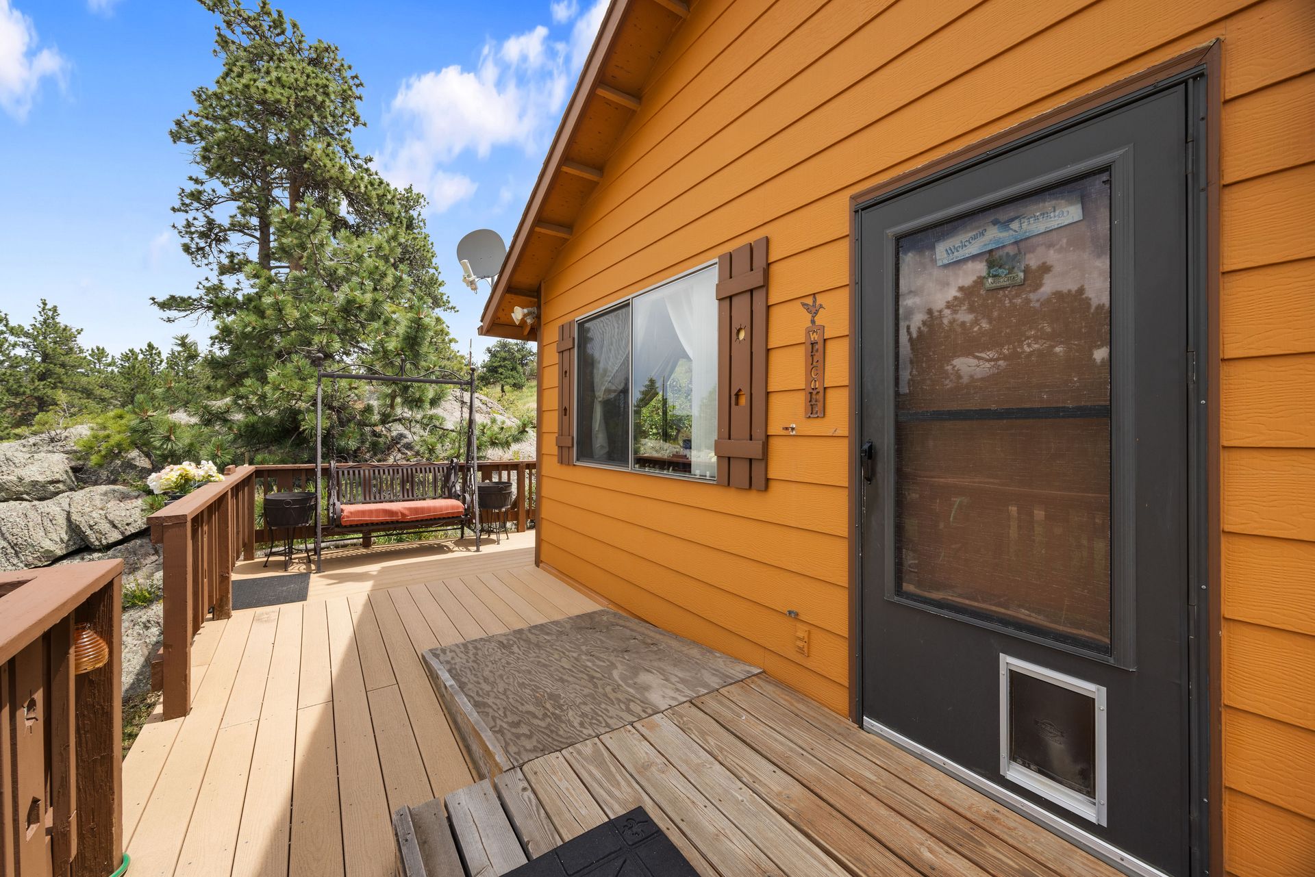 Perched high in the majestic Rocky Mountains, 760 Palisade Mountain Drive offers breathtaking views of Longs Peak, Storm Mountain, and the sweeping western horizon of Rocky Mountain National Park. Affectionately known as The Sun House, this cozy mountain cabin is perfect as a weekend getaway or a full-time residence. Set on a rare double lot totaling just over an acre, the property welcomes horses, ride down to the community lake, where you can enjoy quiet afternoons fishing or picnicking. A large, flat grassy area is ideal for yard games, gatherings, or parking. The land gently rolls into a wildflower-filled meadow with unique rock outcroppings. The cabin sits above it all, surrounded on 3 sides by a wrap-around deck designed to chase the sun. The views of the surrounding peaks and wildlife, and the sounds of hummingbirds in flight, create an immersive mountain experience. Inside, the warm and inviting interior features rustic pine plank walls and vaulted ceilings that create a sense of spaciousness and light. The open-concept living and dining area flows seamlessly into a functional kitchen, all centered around a wood-burning stove that radiates warmth on snowy winter nights. Two comfortable bedrooms and a full bath complete the single-level layout, providing an efficient living space. Ample storage is provided in the generous crawl space, tool shed/workshop, and woodshed. Three separate driveways offer convenient access and plenty of parking. Deep, good producing well and oversized septic system. The county allows for an additional dwelling-offering an incredible opportunity to live in the existing home while building your dream mountain retreat. At nearly 7,000 feet above sea level, Cedar Springs Estates feels like a true mountain sanctuary-peaceful, private, and surrounded by nature-yet close enough to the Front Range for an easy commute when needed. Whether you're seeking a tranquil escape, an adventure basecamp, or a place to expand your vision, The Sun House is ready to welcome you home.