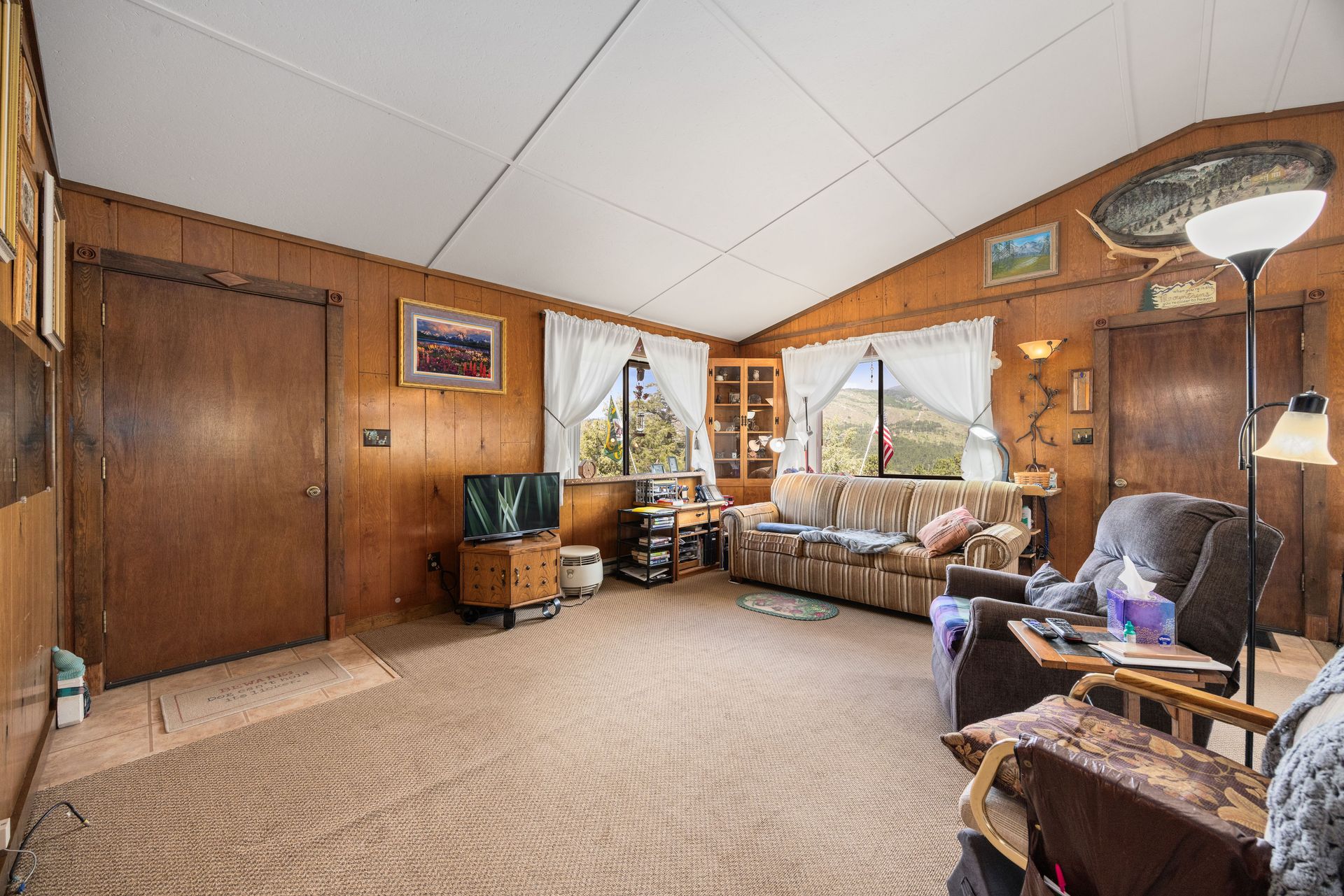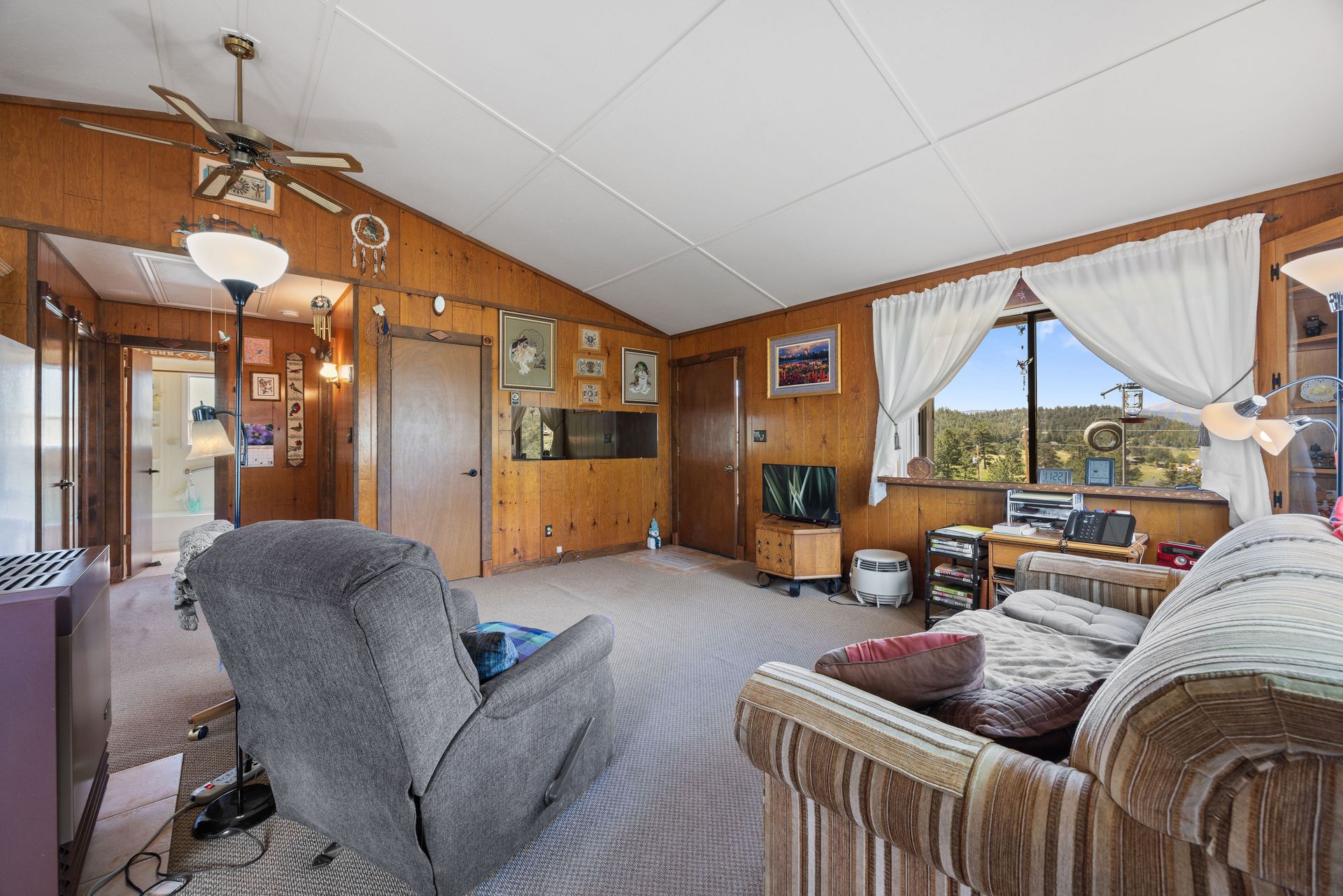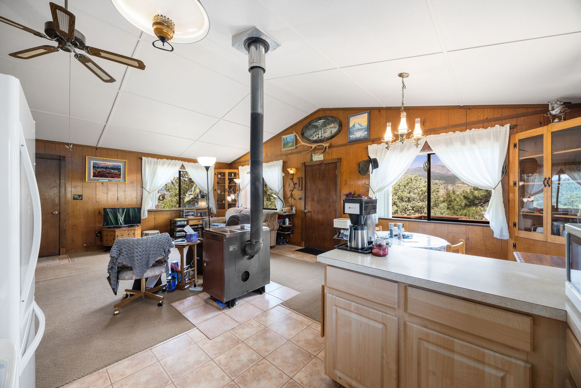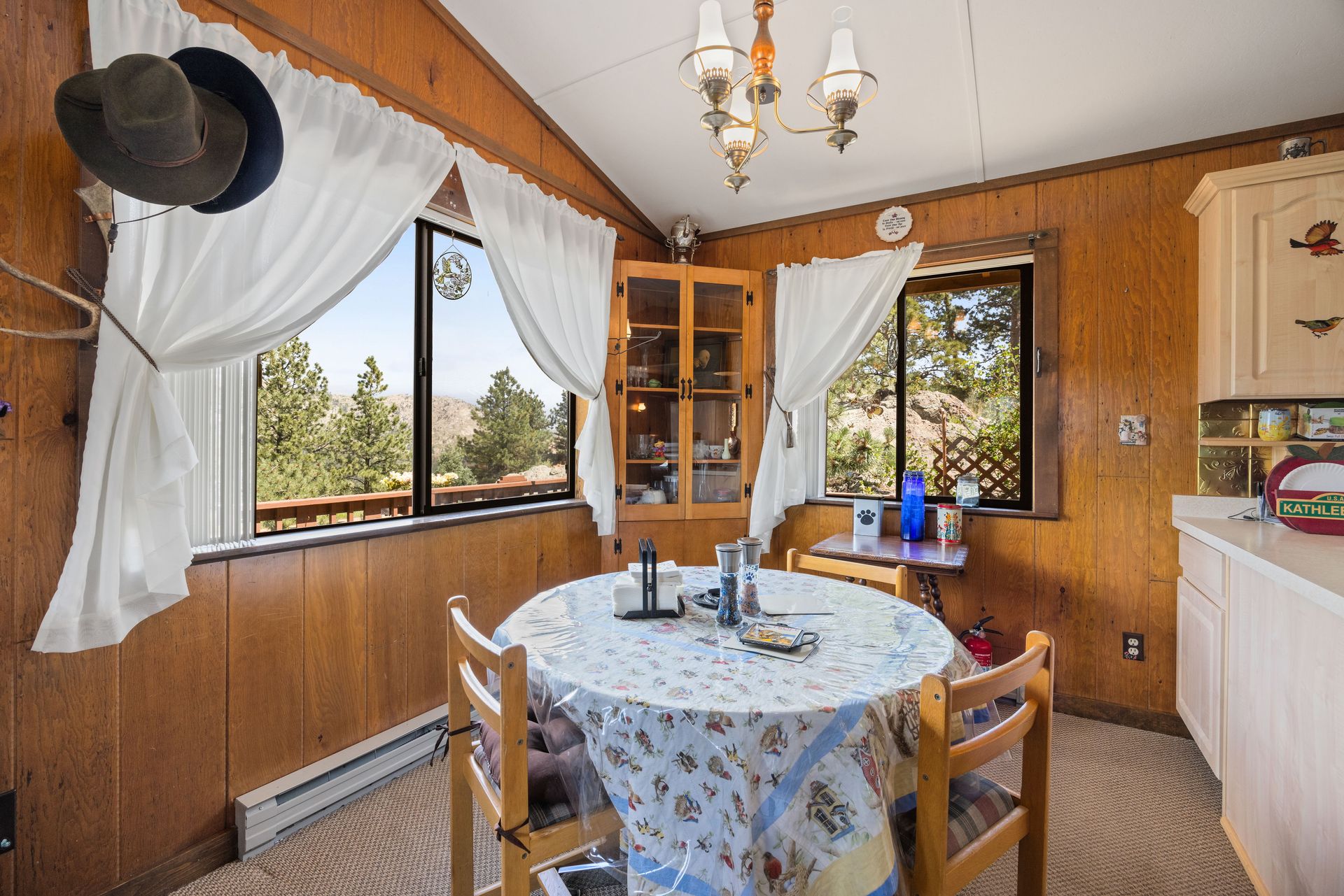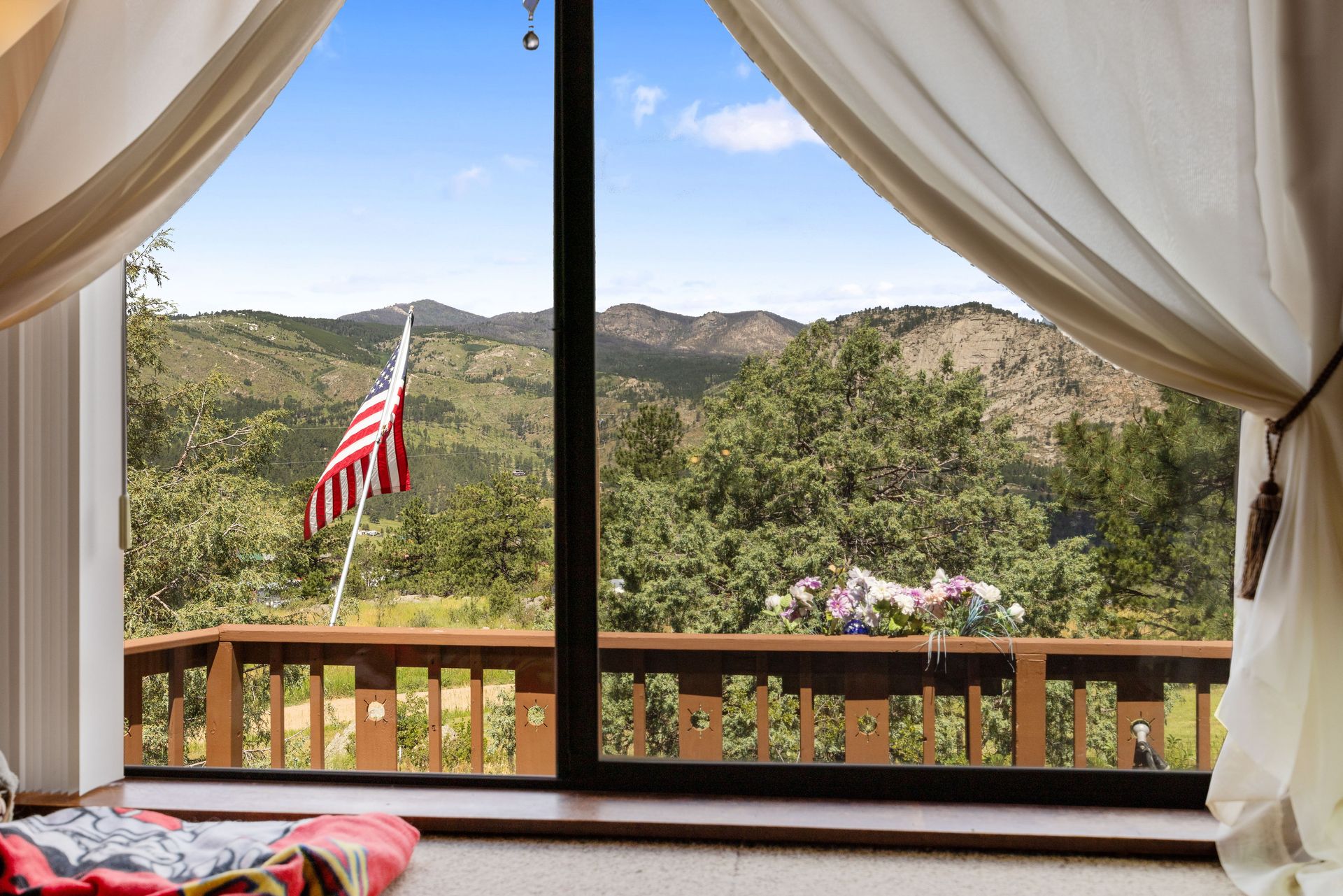 Perched high in the majestic Rocky Mountains, 760 Palisade Mountain Drive offers breathtaking views of Longs Peak, Storm Mountain, and the sweeping western horizon of Rocky Mountain National Park. Affectionately known as The Sun House, this cozy mountain cabin is perfect as a weekend getaway or a full-time residence. Set on a rare double lot totaling just over an acre, the property welcomes horses, ride down to the community lake, where you can enjoy quiet afternoons fishing or picnicking. A large, flat grassy area is ideal for yard games, gatherings, or parking. The land gently rolls into a wildflower-filled meadow with unique rock outcroppings. The cabin sits above it all, surrounded on 3 sides by a wrap-around deck designed to chase the sun. The views of the surrounding peaks and wildlife, and the sounds of hummingbirds in flight, create an immersive mountain experience. Inside, the warm and inviting interior features rustic pine plank walls and vaulted ceilings that create a sense of spaciousness and light. The open-concept living and dining area flows seamlessly into a functional kitchen, all centered around a wood-burning stove that radiates warmth on snowy winter nights. Two comfortable bedrooms and a full bath complete the single-level layout, providing an efficient living space. Ample storage is provided in the generous crawl space, tool shed/workshop, and woodshed. Three separate driveways offer convenient access and plenty of parking. Deep, good producing well and oversized septic system. The county allows for an additional dwelling-offering an incredible opportunity to live in the existing home while building your dream mountain retreat. At nearly 7,000 feet above sea level, Cedar Springs Estates feels like a true mountain sanctuary-peaceful, private, and surrounded by nature-yet close enough to the Front Range for an easy commute when needed. Whether you're seeking a tranquil escape, an adventure basecamp, or a place to expand your vision, The Sun House is ready to welcome you home.