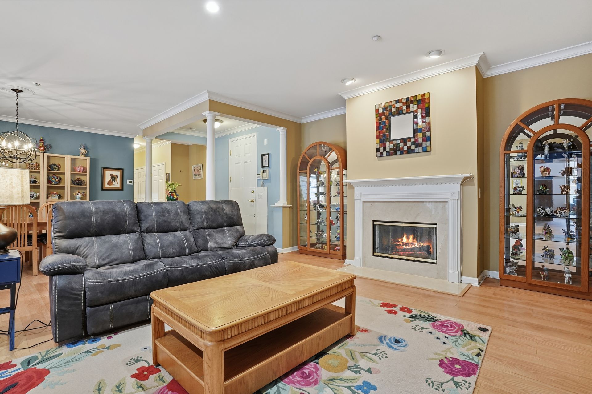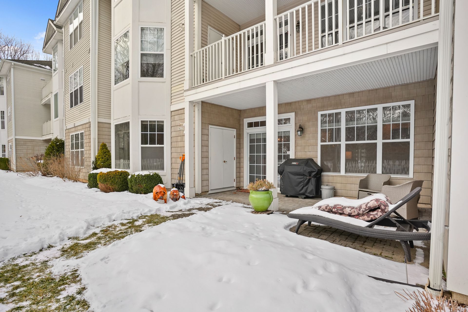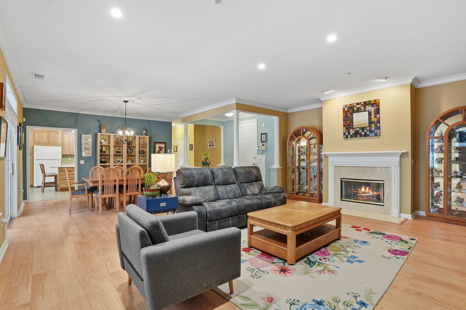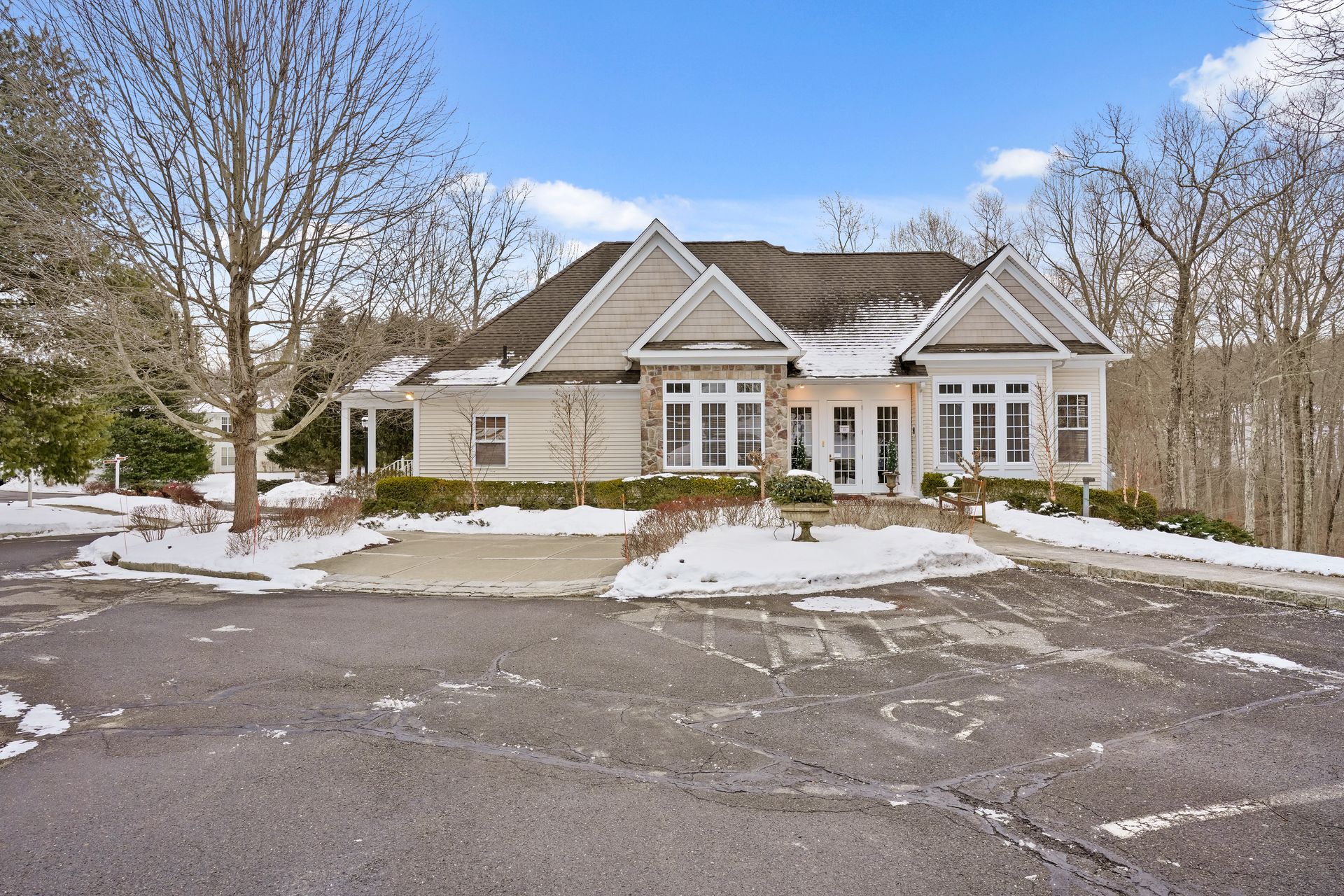 Two bedroom, two and half bath garden level ranch style condo that lives like a private home. This 55+ Active Adult unit offers an open concept Living Room and Dining Room with access to the paver patio. Spacious Kitchen has a large island, solid surface counter tops, and eating area with a large bow window. Large Primary Bedroom Suite is complete with a long walk-in closet, full bath with two sink vanity, glass block window, tub and separate shower. Library offers multiple uses: office, den, etc. Second bedroom is ensuite with a full bath. Beautiful moldings throughout, gas fireplace in Living Room. Community offers a Clubhouse, inground pool and more. Unit has nine-foot ceilings, a two-car garage and separate storage area. Monthly common charge is $650. Newer dishwasher, flooring and newer HVAC system. This condo offers privacy within a community.