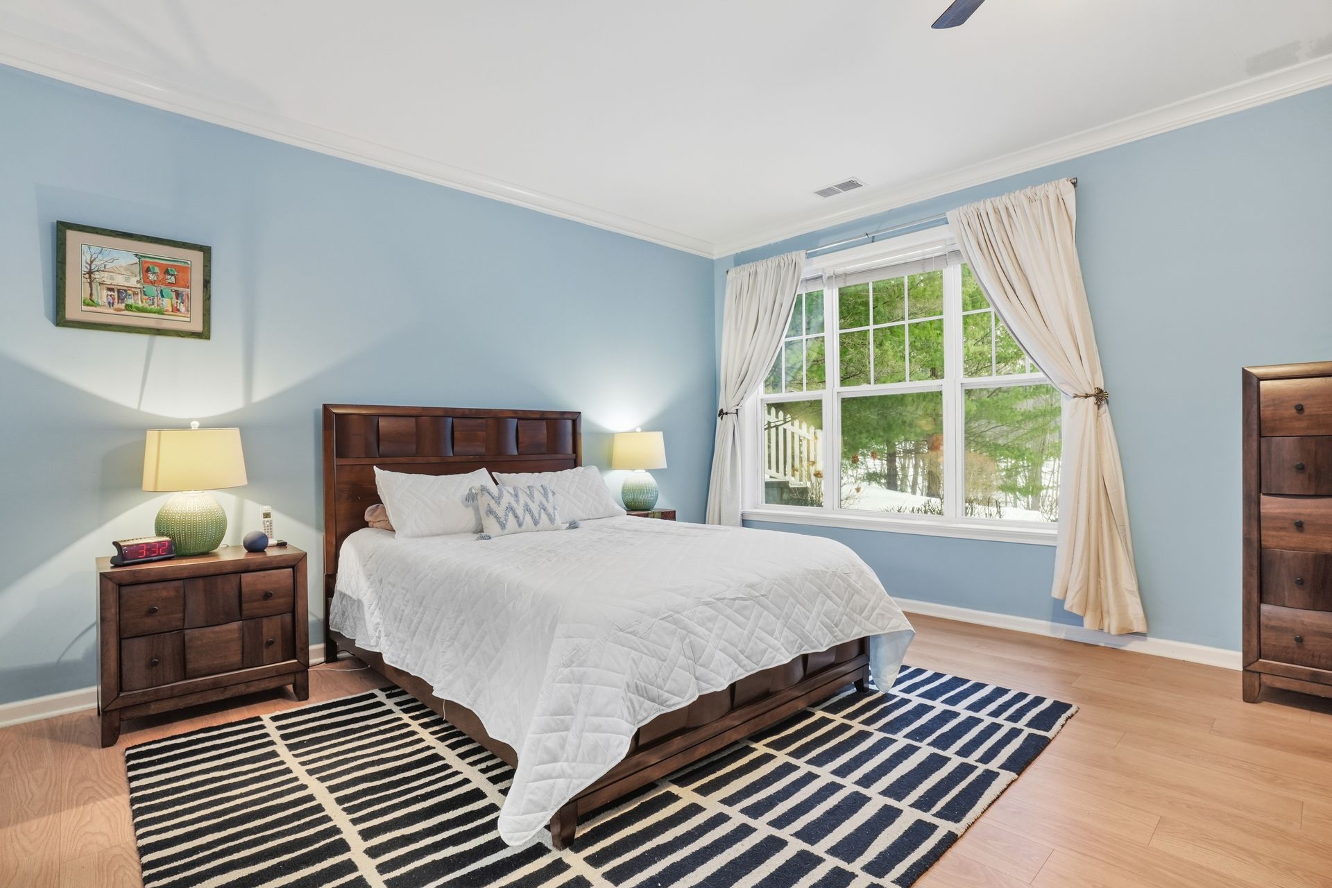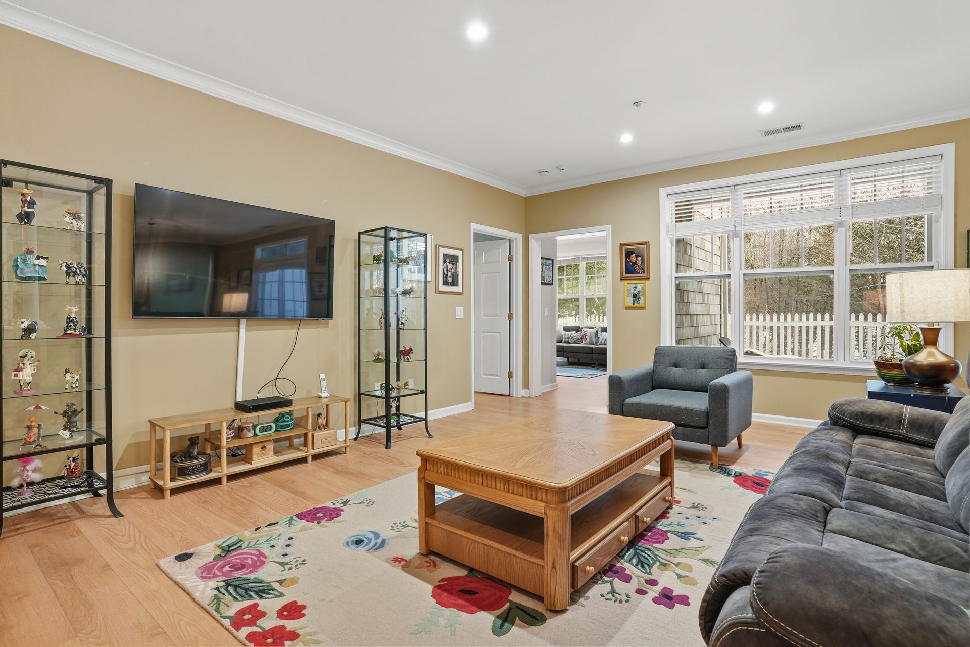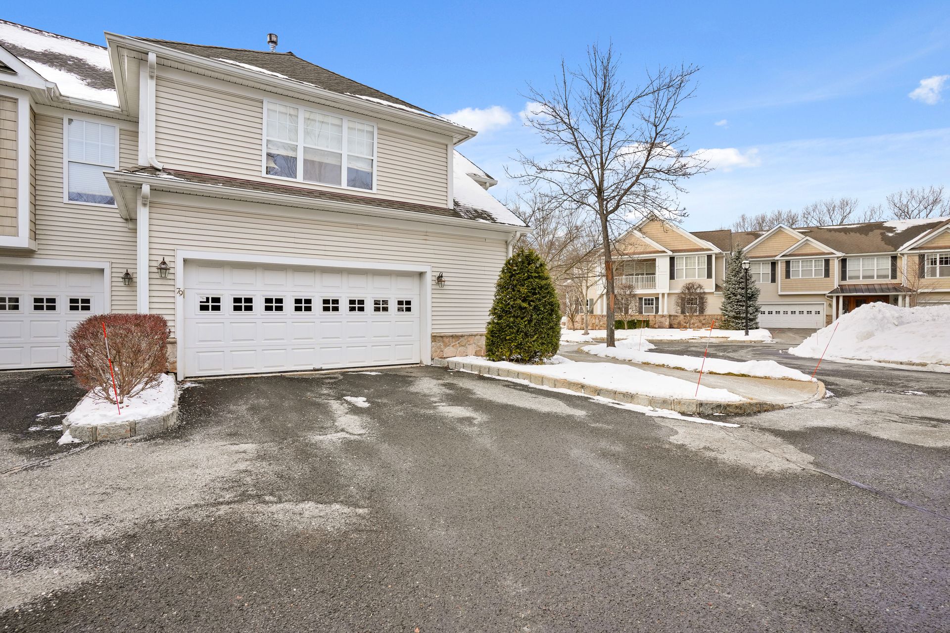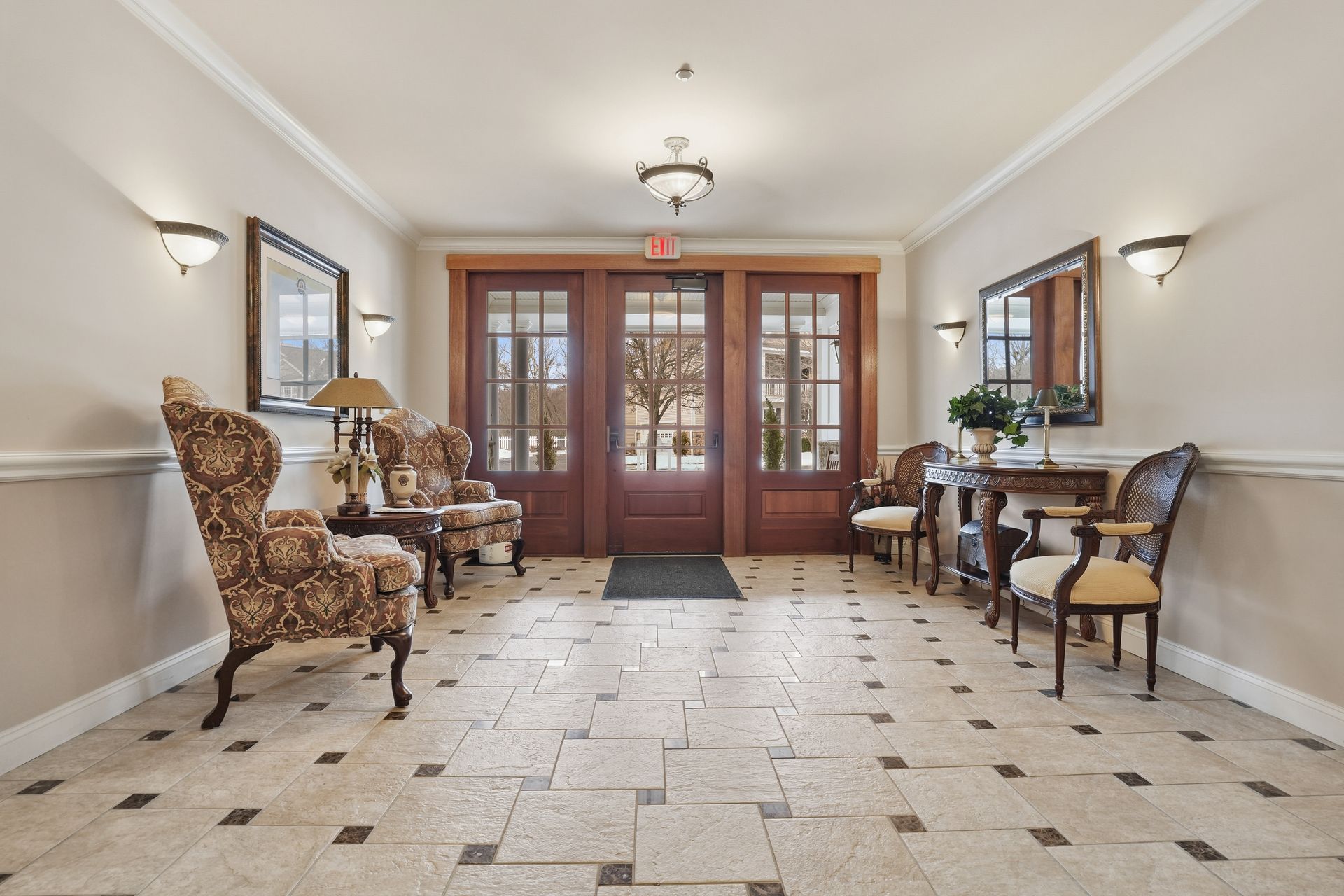 Two bedroom, two and half bath garden level ranch style condo that lives like a private home. This 55+ Active Adult unit offers an open concept Living Room and Dining Room with access to the paver patio. Spacious Kitchen has a large island, solid surface counter tops, and eating area with a large bow window. Large Primary Bedroom Suite is complete with a long walk-in closet, full bath with two sink vanity, glass block window, tub and separate shower. Library offers multiple uses: office, den, etc. Second bedroom is ensuite with a full bath. Beautiful moldings throughout, gas fireplace in Living Room. Community offers a Clubhouse, inground pool and more. Unit has nine-foot ceilings, a two-car garage and separate storage area. Monthly common charge is $650. Newer dishwasher, flooring and newer HVAC system. This condo offers privacy within a community.