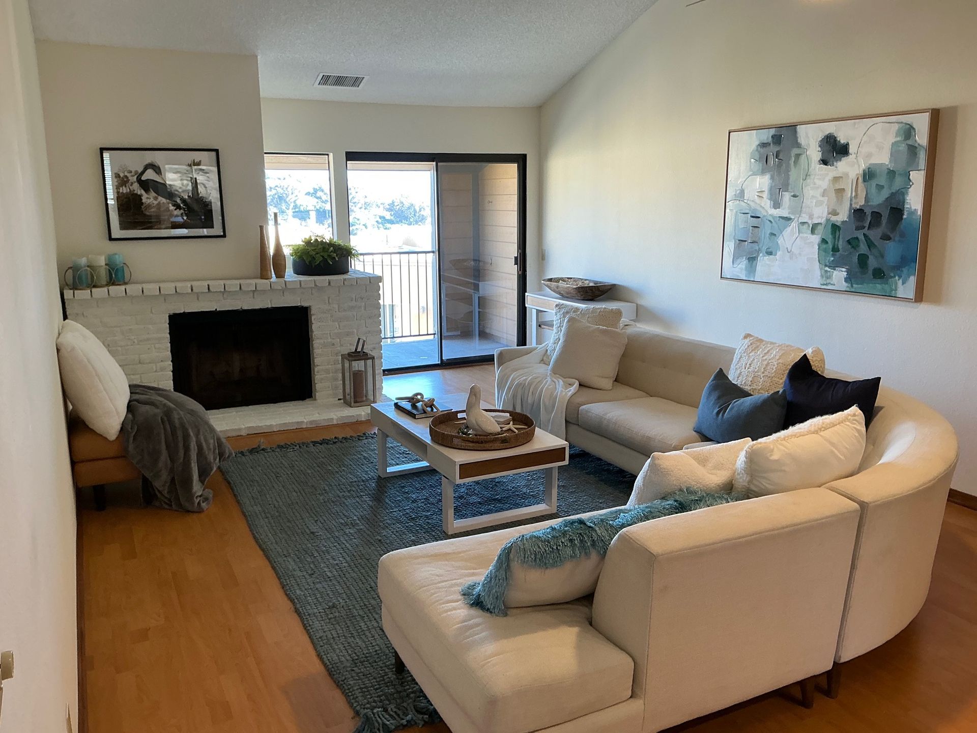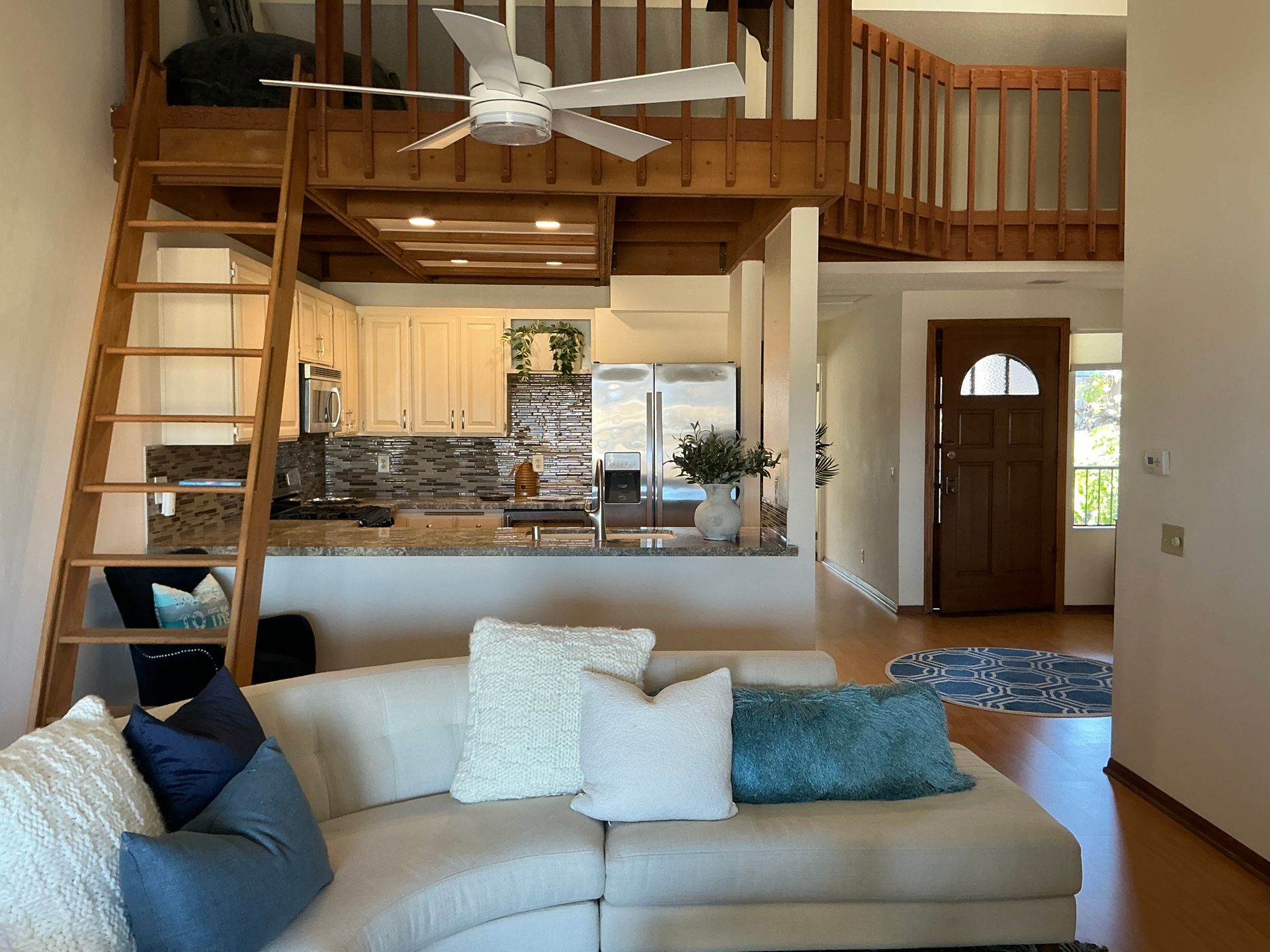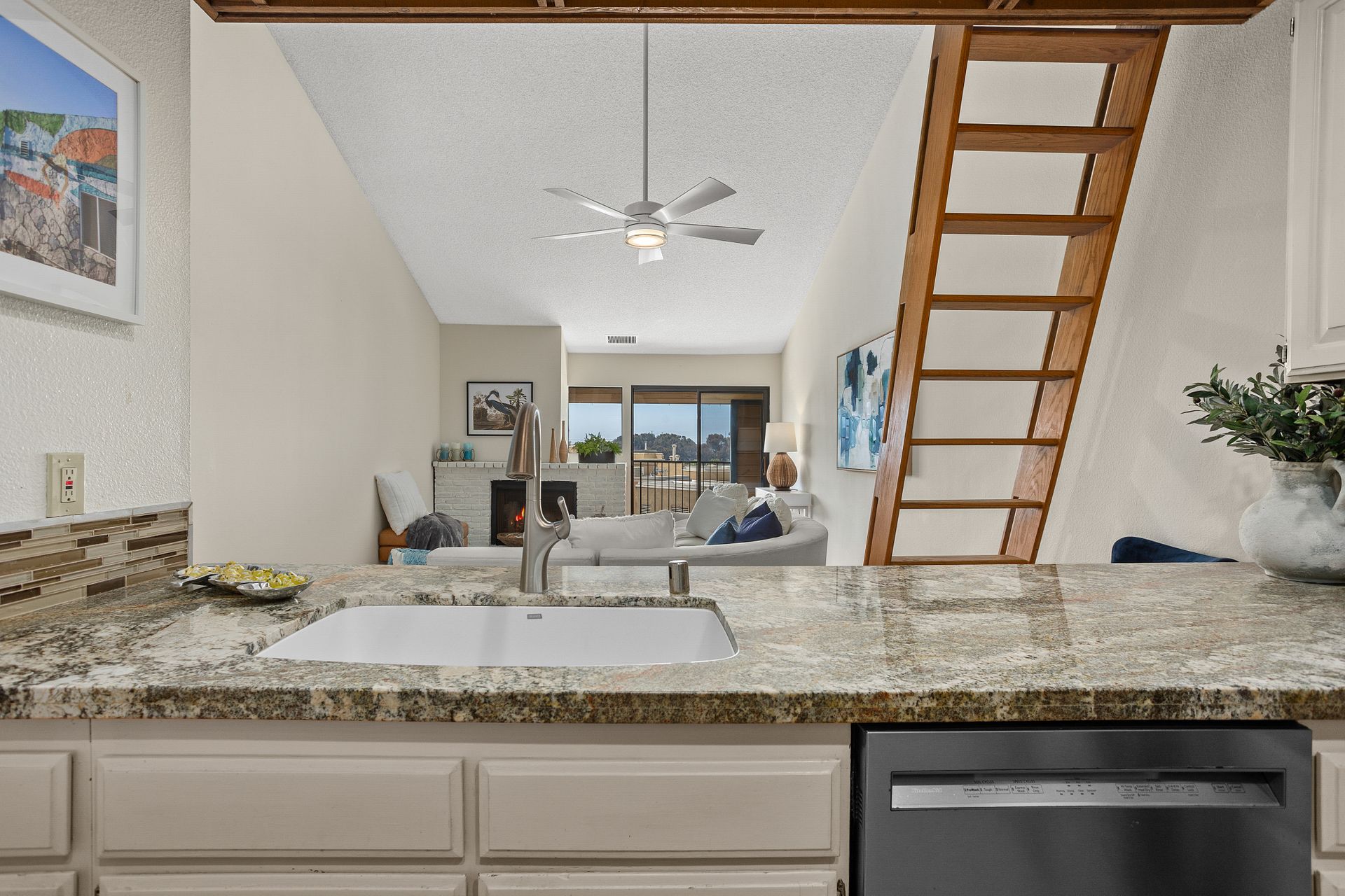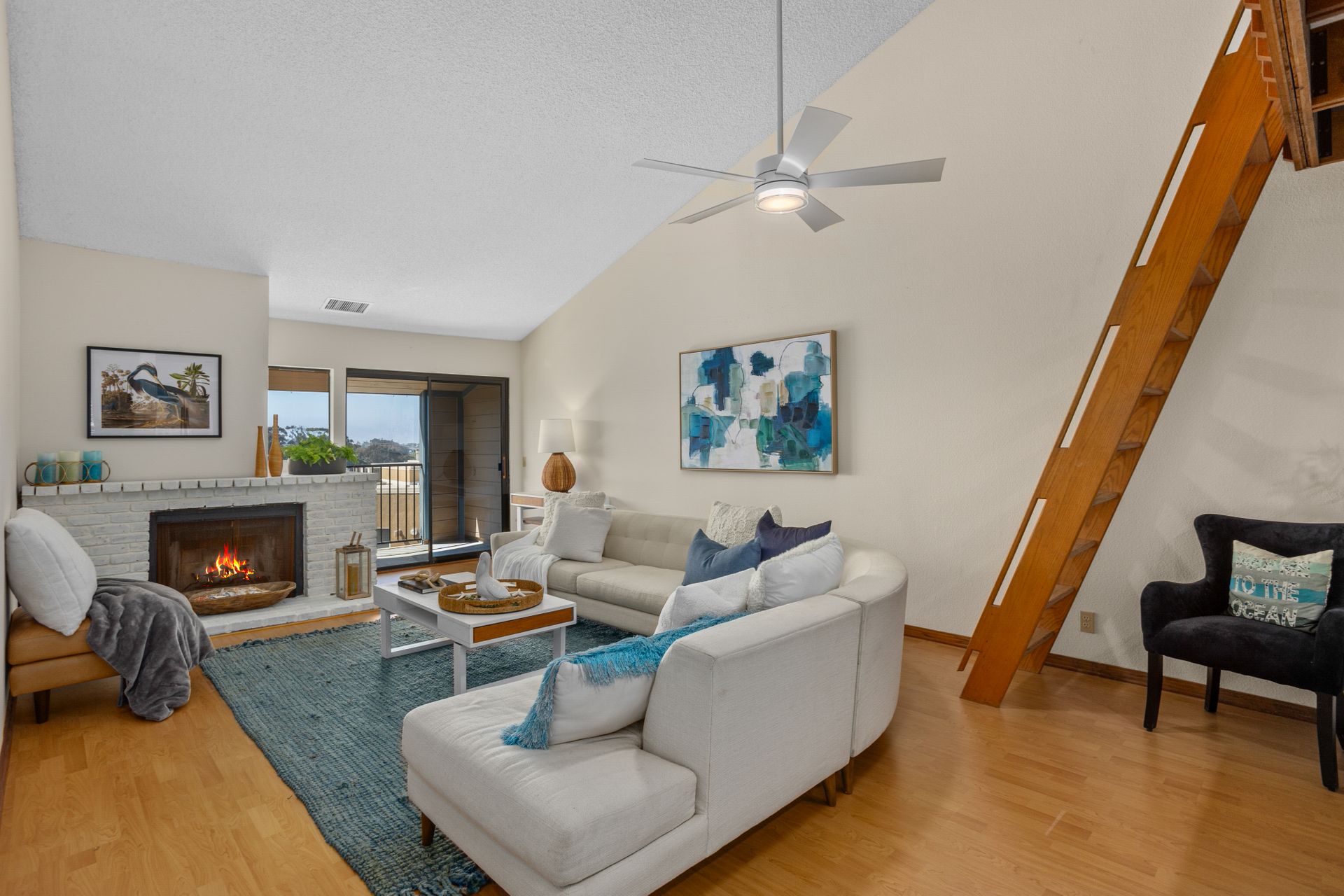 Ocean Views from this Upper-Level End Unit in Gated Windsong Cove, west of the I-5! Enjoy abundant natural light and soaring vaulted ceilings in this inviting coastal retreat. Featuring two bedrooms plus a spacious loft, this home offers a flexible and open layout. The remodeled kitchen boasts granite countertops, stainless steel appliances and even a wine fridge—ideal for entertaining! It overlooks the expansive living room with a cozy fireplace and direct access to a large ocean-view balcony, creating a seamless indoor-outdoor living experience. The primary suite also opens to the balcony, offering stunning ocean views. Relax in the spa-like primary bathroom, complete with dual vanities and a soaking tub. Additional features include two one-car garages and an assigned uncovered parking spot.