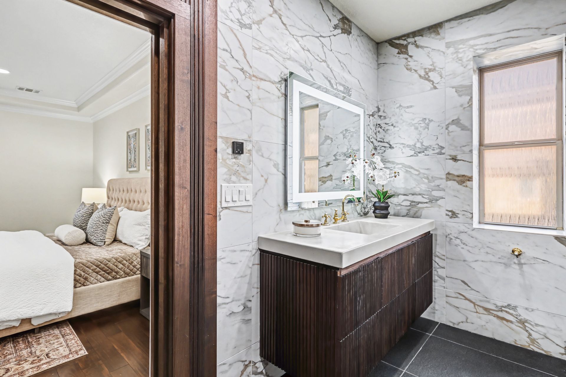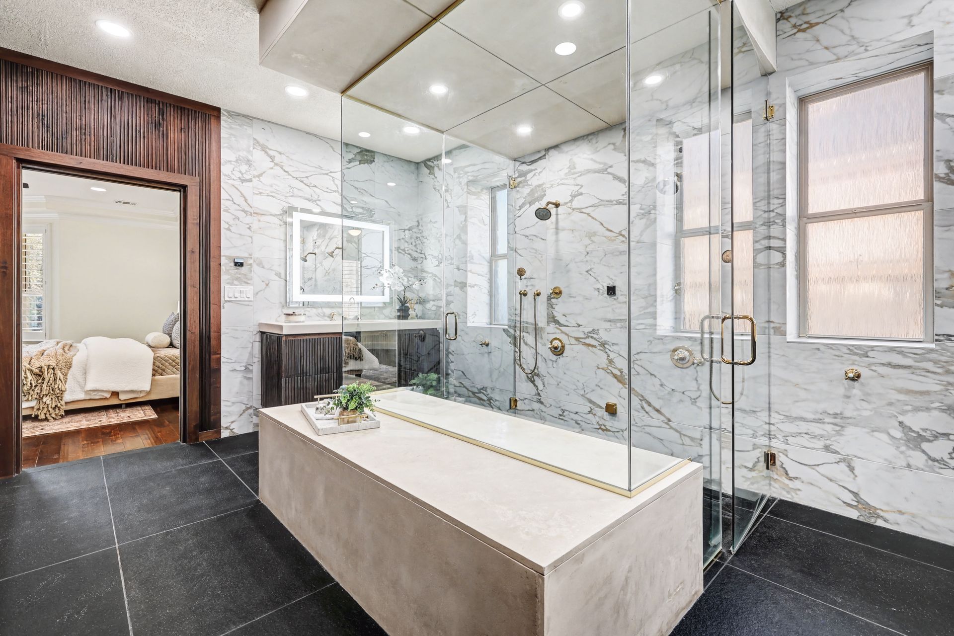 The backyard is a true resort-style retreat with an in-ground pool and spa, covered outdoor kitchen w/ a built-in grill, fridge & ice chest. Automated exterior shades, and misters + an outdoor fireplace provide year-round entertaining or unwinding amid serene, tree-lined views. Inside, a 2020, $300k luxury remodel of the primary suite delivers spa-level indulgence with nautical-grade solid walnut cabinetry, a fully enclosed steam shower with a six-foot slab bench, Waterworks fixtures. Two expansive walk-in closets feature Walnut professional organizers, a wall safe, and a discreet hydraulic in-ground safe.