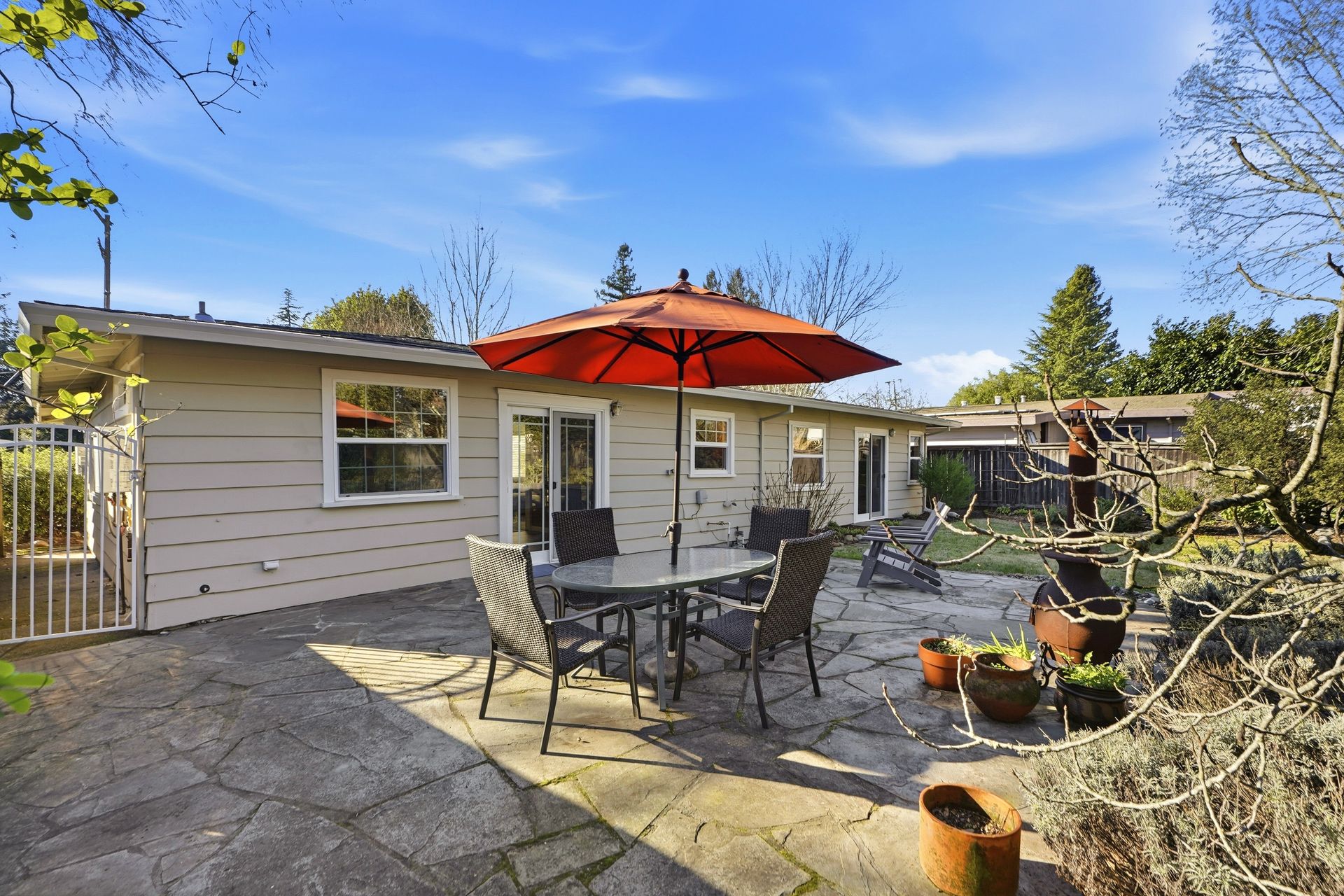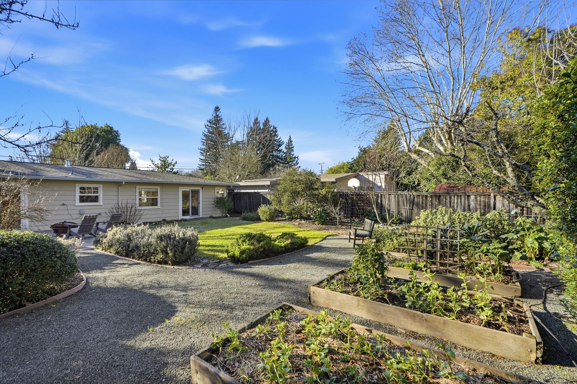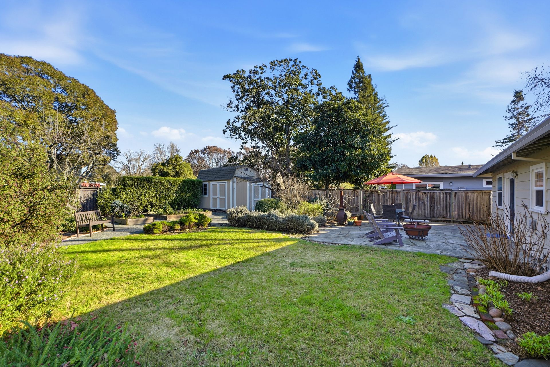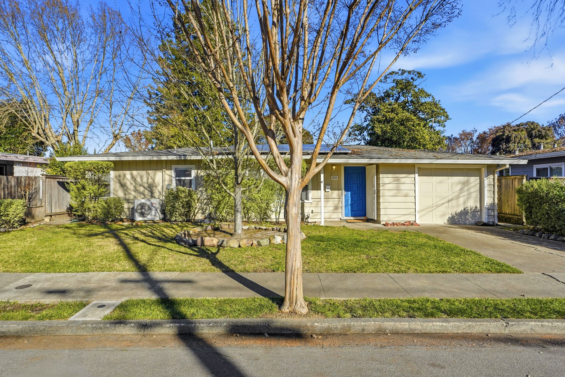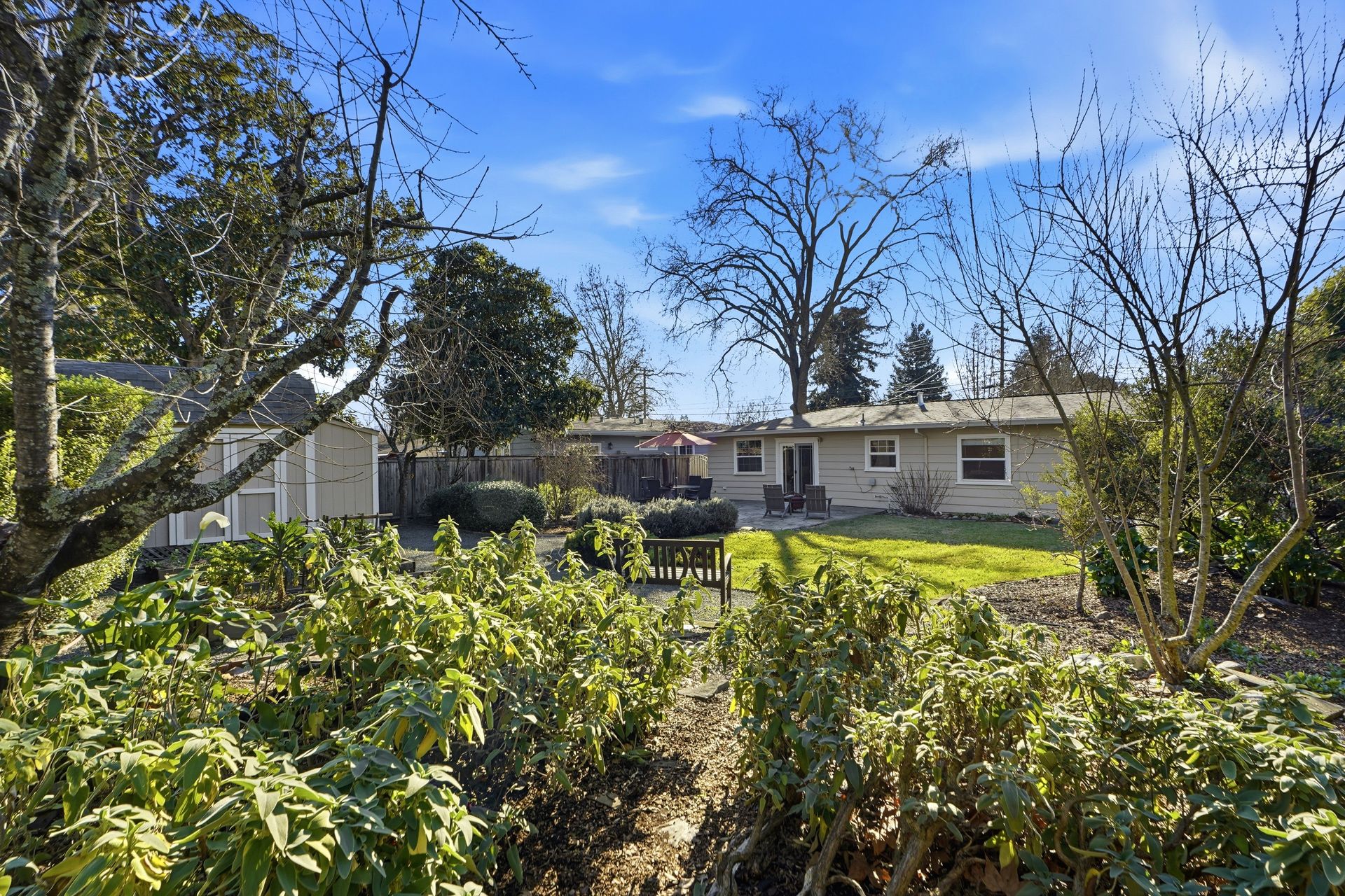 Welcome to this single-story home offering three bedrooms and a beautifully remodeled bathroom. Enjoy a cozy living room and a light-filled kitchen and dining area with sliding glass doors opening to an expansive, sunny, and private backyard. Outdoor highlights include a paver-style patio, raised garden beds, fruit trees, a lawn area, and a walking path leading to a large, barn-style storage shed and a garden shed. The largest of the bedrooms looks out to the backyard and features a slider that brings in abundant natural light and garden views. Additional features include dual-pane windows, a newer roof, owned solar panels, and central heating and air provided by an efficient electric heat pump. Enjoy being conveniently located near Howarth Park, Spring Lake, Whole Foods, and Montgomery Village.