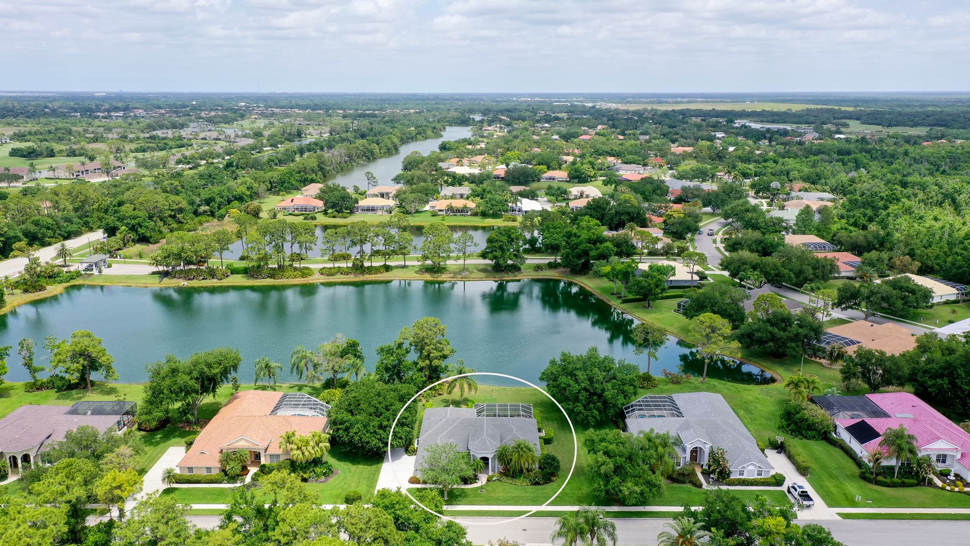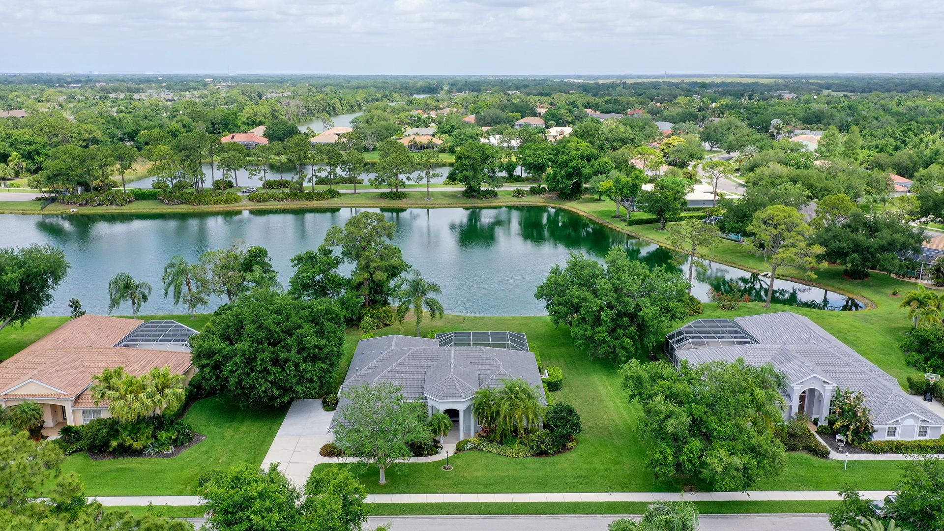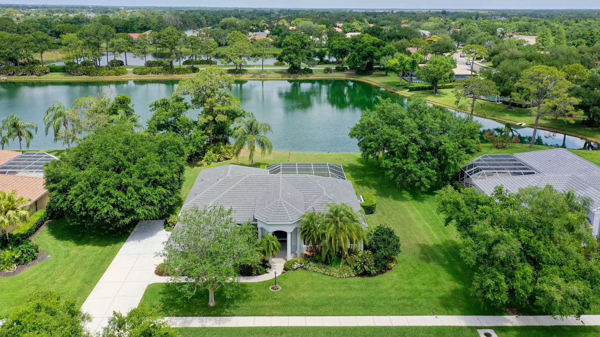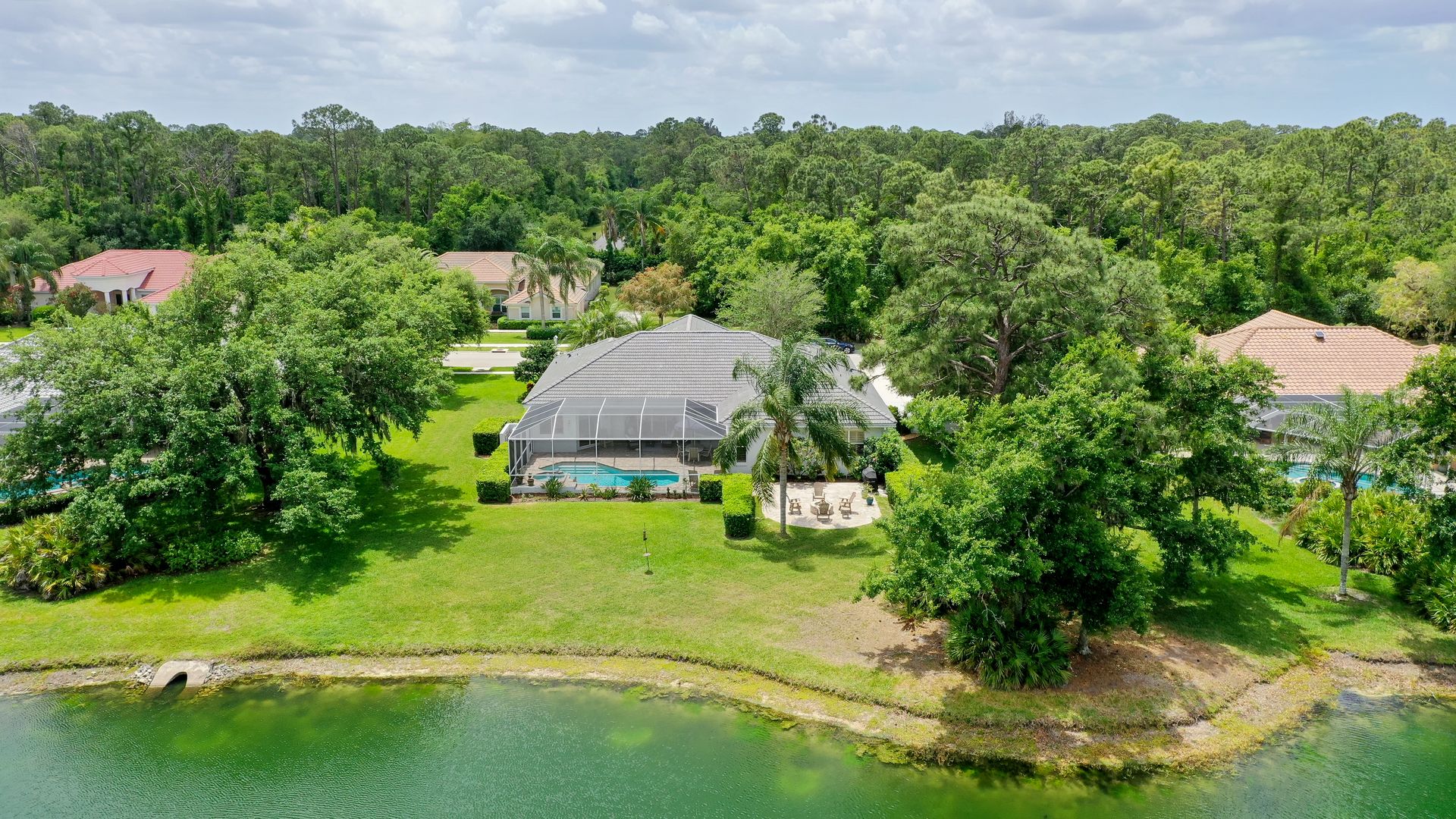 Within the gates of The Preserve at Misty Creek, this approximately 2,900 square foot home situated on a half-acre, beautifully landscaped, lakefront lot, feels like a retreat. Upon entering, you'll be greeted by a newly upgraded kitchen featuring solid wood cabinetry, stone counters, updated lighting, modern appliances including a wine refrigerator and finishes that seamlessly blend style and function. The bathrooms have also been thoughtfully updated, providing a spa-like ambiance. Volume ceilings, crown molding and Plantation Shutters contribute to the overall appeal of this well-appointed home. Major systems and functional upgrades provide peace of mind. The property features NEW TILE ROOF 2024, two newer air conditioning systems, updated electronic heat assembly, and a variety of mechanical improvements that reflect careful ownership. The primary suite is located on the opposing side of home from the guest rooms in this split floor plan. The screened, heated pool and spa overlook the lake, framed by updated and sealed pool pavers and a refreshed enclosure. A newer pool heater, motor, and actuator ensure everything operates seamlessly. The outdoor living space has been expanded with a custom patio and fire pit area for entertaining or simply unwinding. Watch birds diving for fish while enjoying your lakefront property in this tranquil setting. The combination of the spacious interior, well-manicured grounds and sought-after lakefront setting make this property an ideal choice. Living in Misty Creek means enjoying a 24-hour guard-gated community with LOW HOA fees, spacious lots, X-zone benefits and optional golf membership.