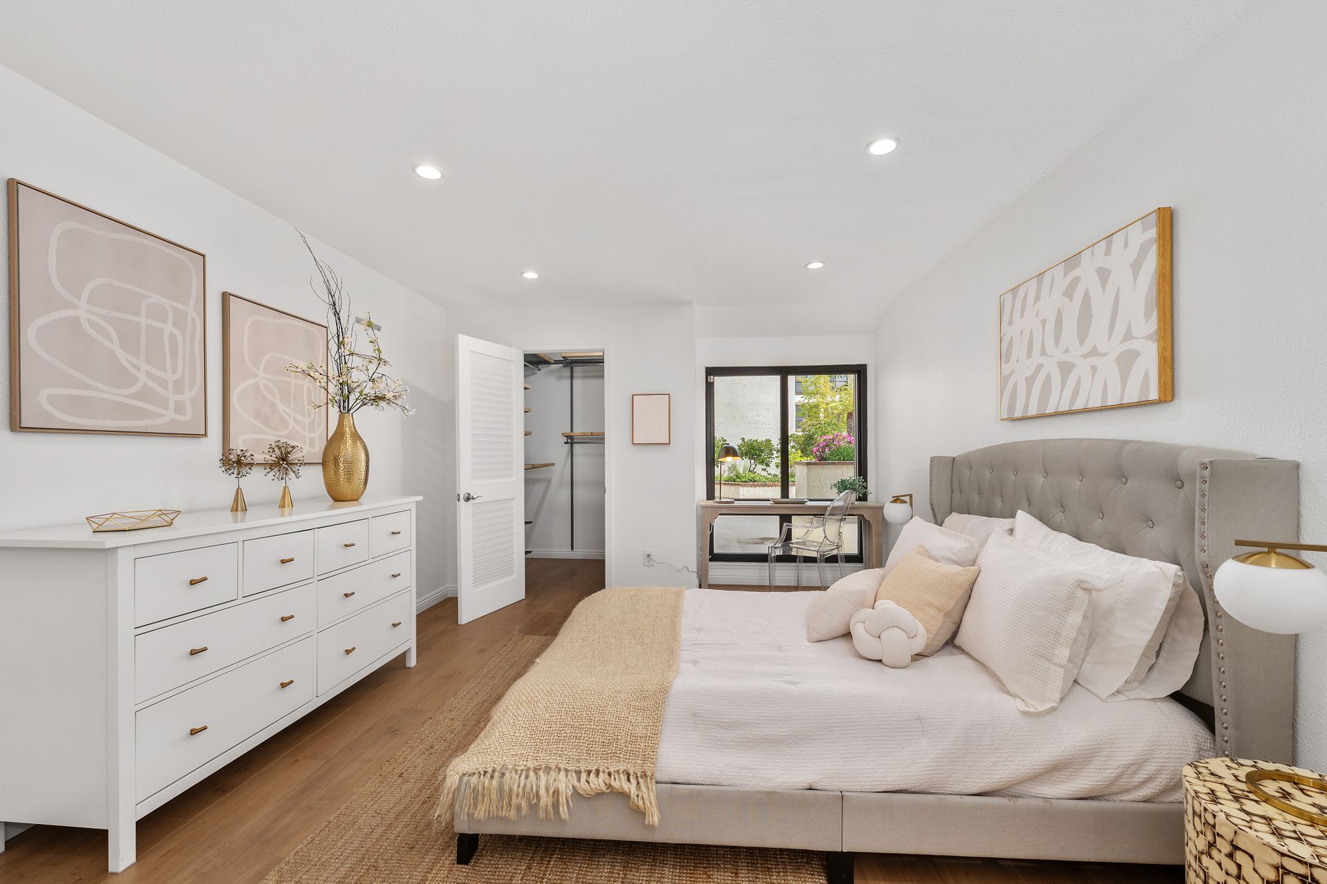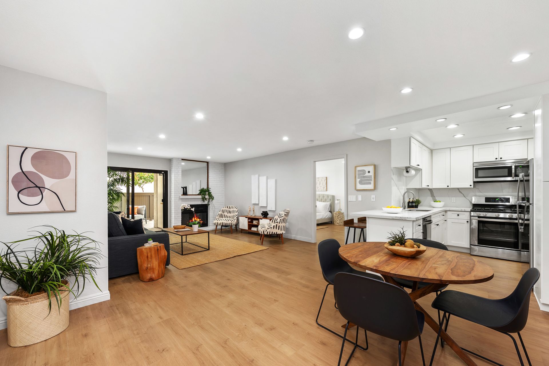 Totally redone with designer upgrades, this condo features newer manufactured wood flooring throughout, recessed lighting and a completely renovated kitchen with stainless steel appliances and quartz countertops. Each bedroom comes with a walk-in closet, providing ample storage space. The interior has been freshly painted, offering a crisp, modern feel. The cozy living room includes a fireplace, adding warmth and charm to the space. Enjoy the large private back patio for relaxing or entertaining.