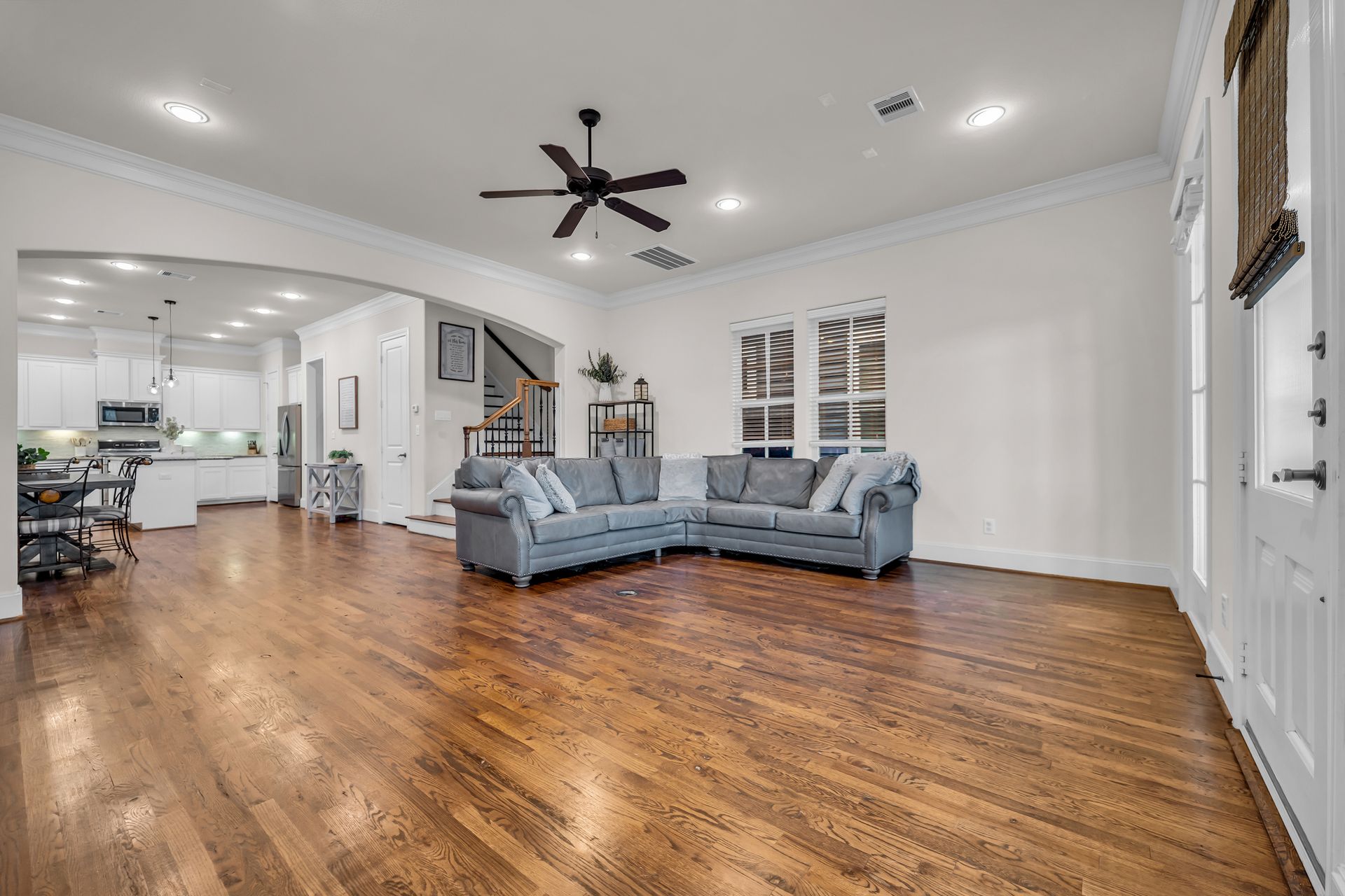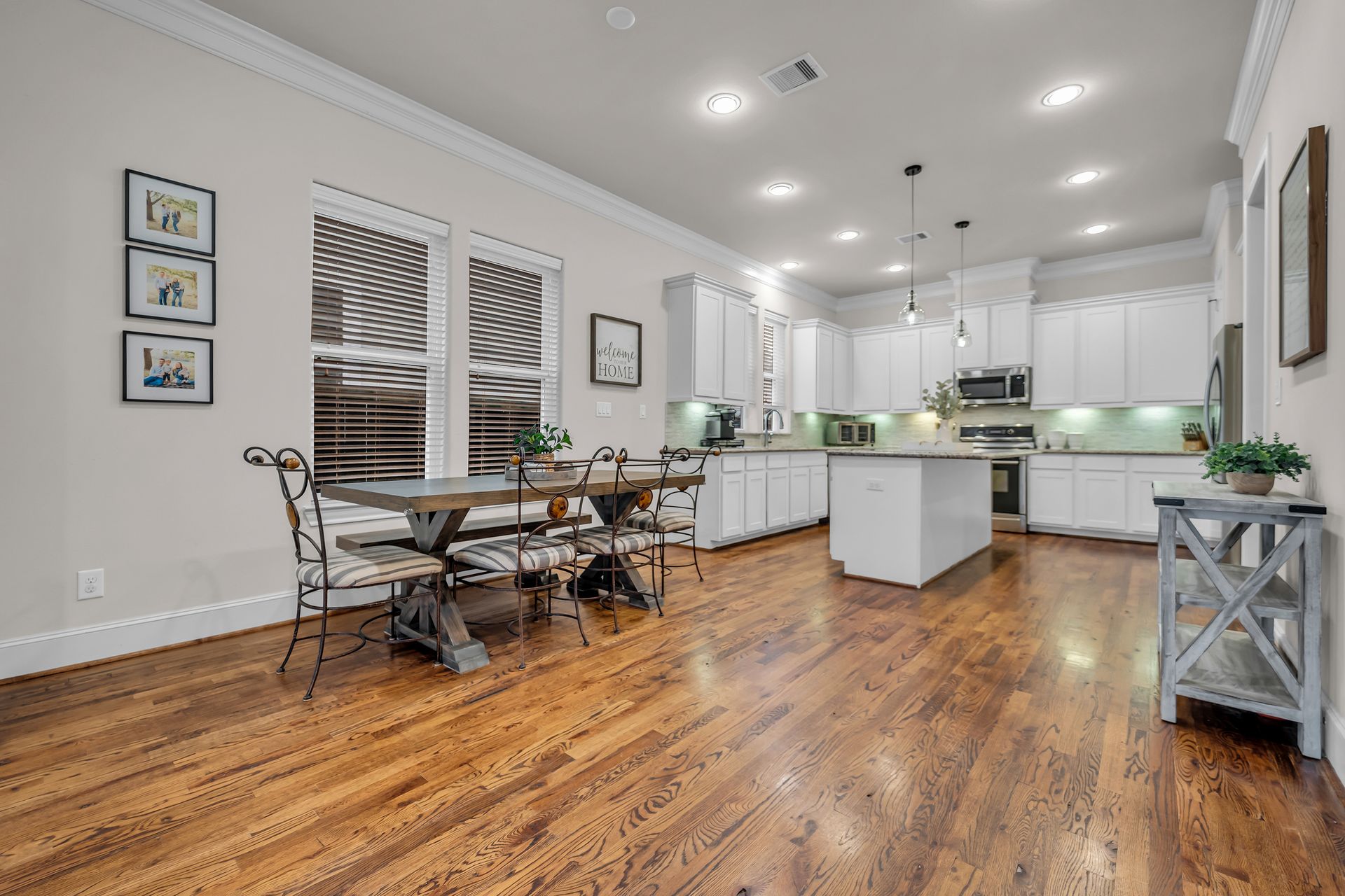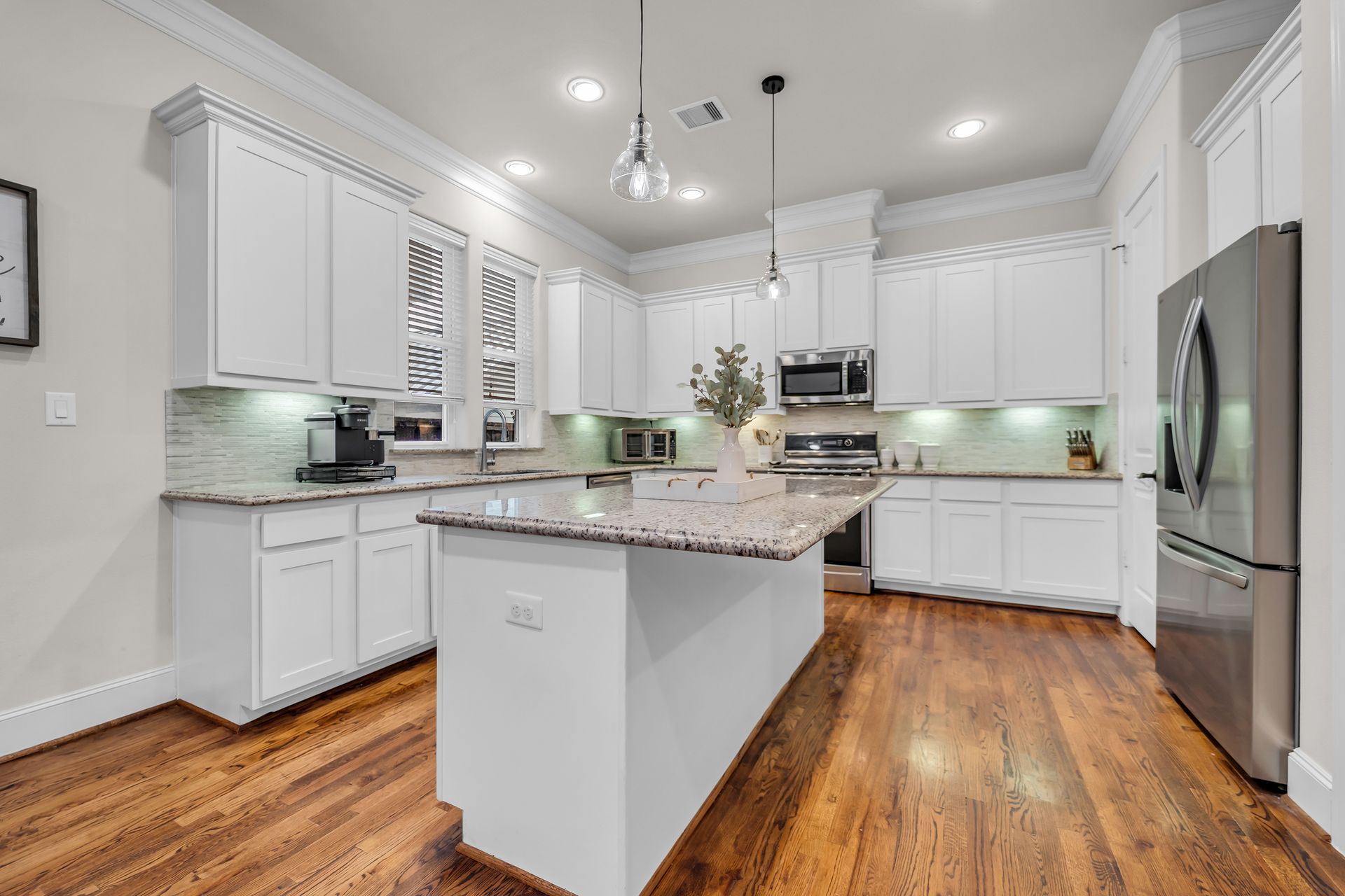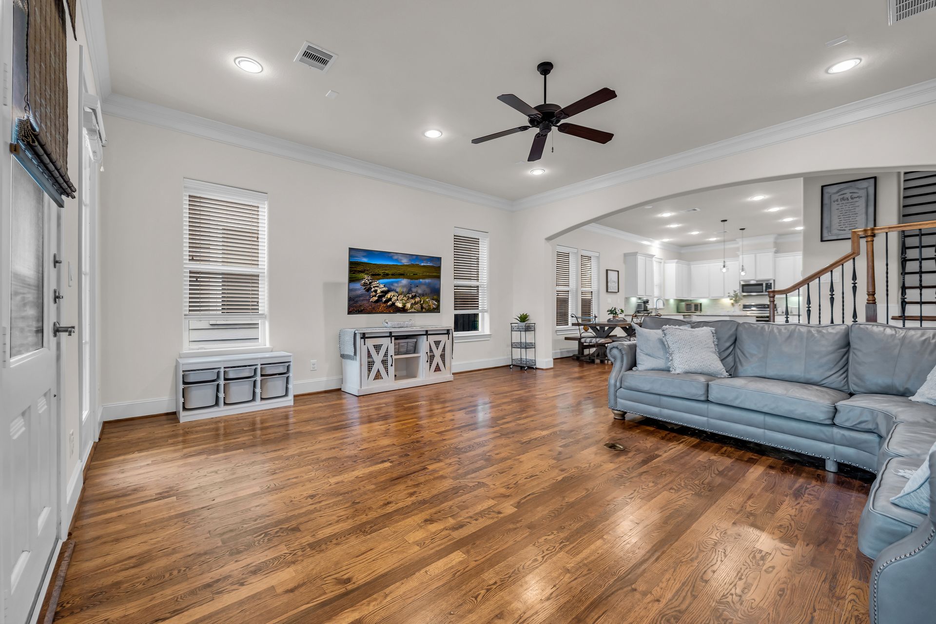 Welcome to 8720 Kempwood — where timeless style meets modern comfort in the heart of Spring Branch. This beautifully designed three-bedroom, two-and-a-half-bath home features a charming covered front porch, classic wood floors, soaring ceilings, crisp crown molding, and large windows that fill the home with natural light. The spacious open-concept layout is perfect for entertaining, while the chef-inspired kitchen boasts a massive functional island, granite countertops, and high-end finishes throughout. The oversized primary suite offers a luxurious retreat with two large walk-in closets and a spa-like bath adorned with designer touches. Outside, enjoy private gate access to the garage, additional parking, and a sprinkler system for easy lawn maintenance. Conveniently located near Beltway 8, I-10, Hwy 290, and the 610 Loop, providing quick access to Downtown, Memorial Park, the Galleria, and the Energy Corridor. No flooding during Harvey and no MUD tax. Make your appointment to see this gem today!