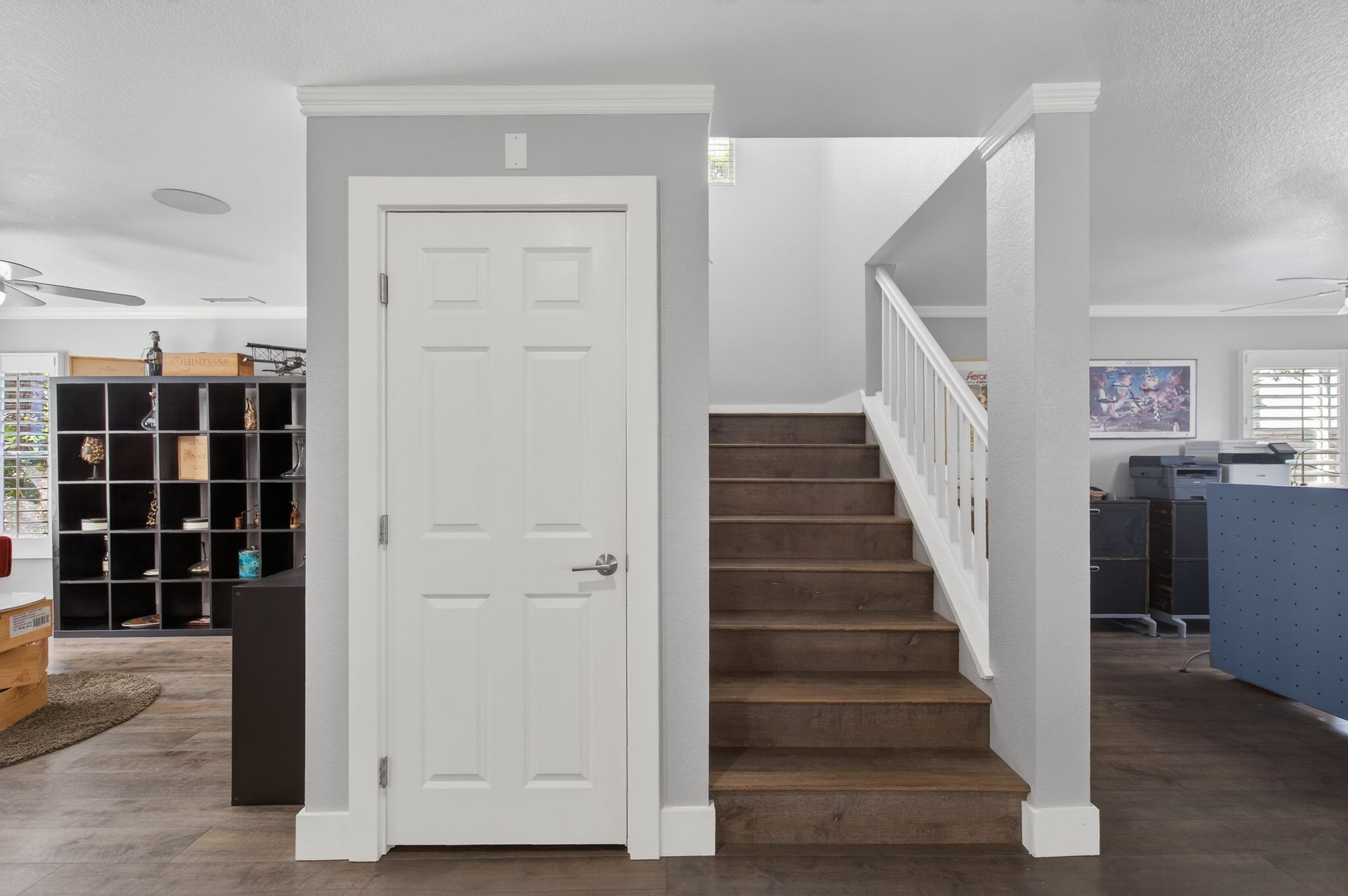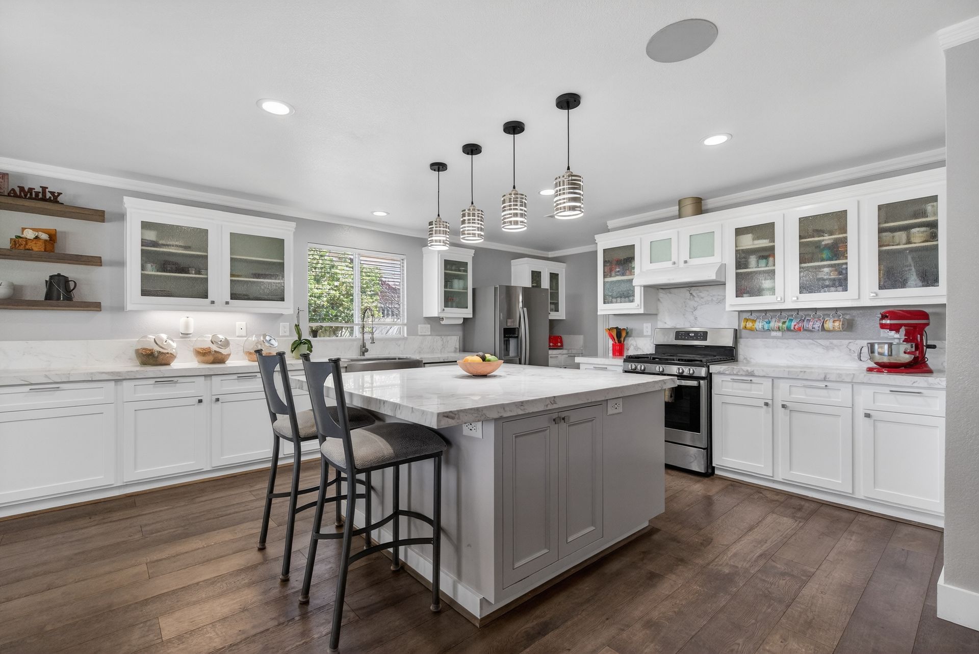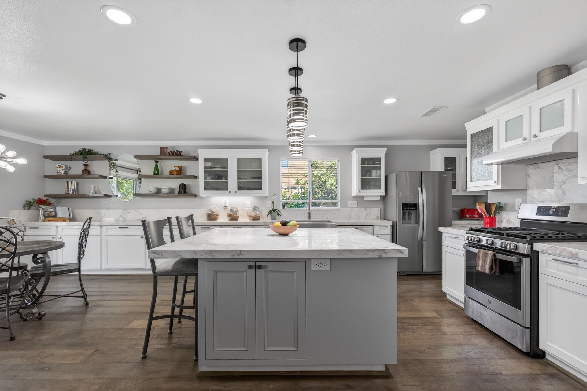 Inside, the expansive open floor plan includes a spacious chef’s kitchen with a large marble island, extensive cabinetry, full‑wall marble countertops, and a generous walk‑in pantry with space for a second refrigerator. A custom stone‑façade, climate‑controlled 200‑bottle wine cellar is discreetly tucked under the staircase. The home offers four large bedrooms, a downstairs office, a versatile loft, and 3.5 elegantly remodeled bathrooms with marble vanities and marble shower walls.