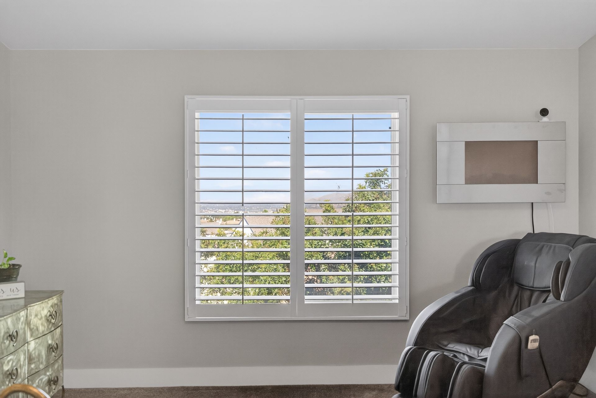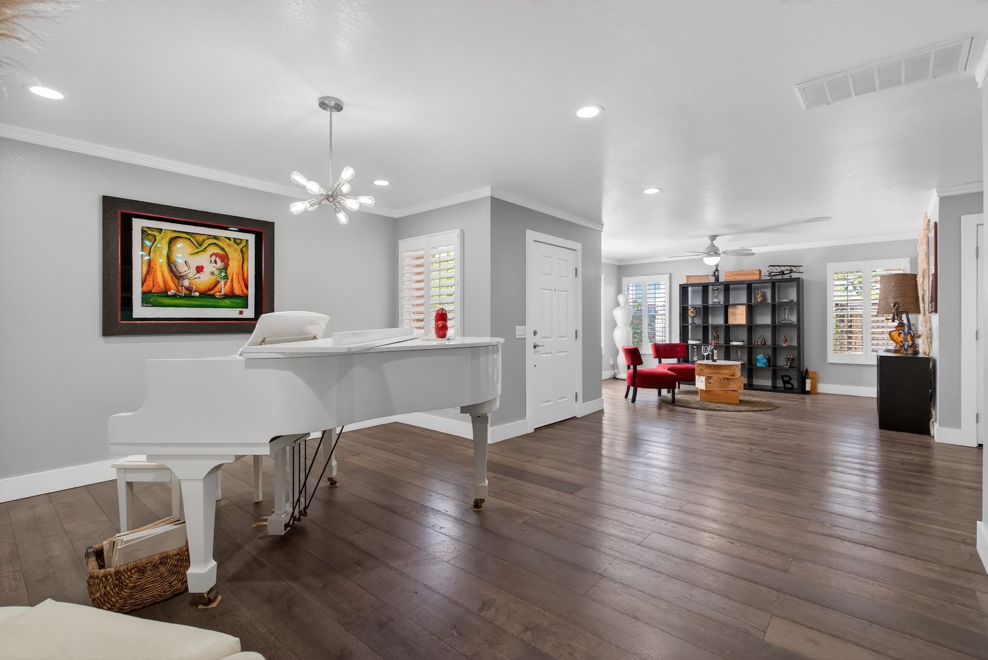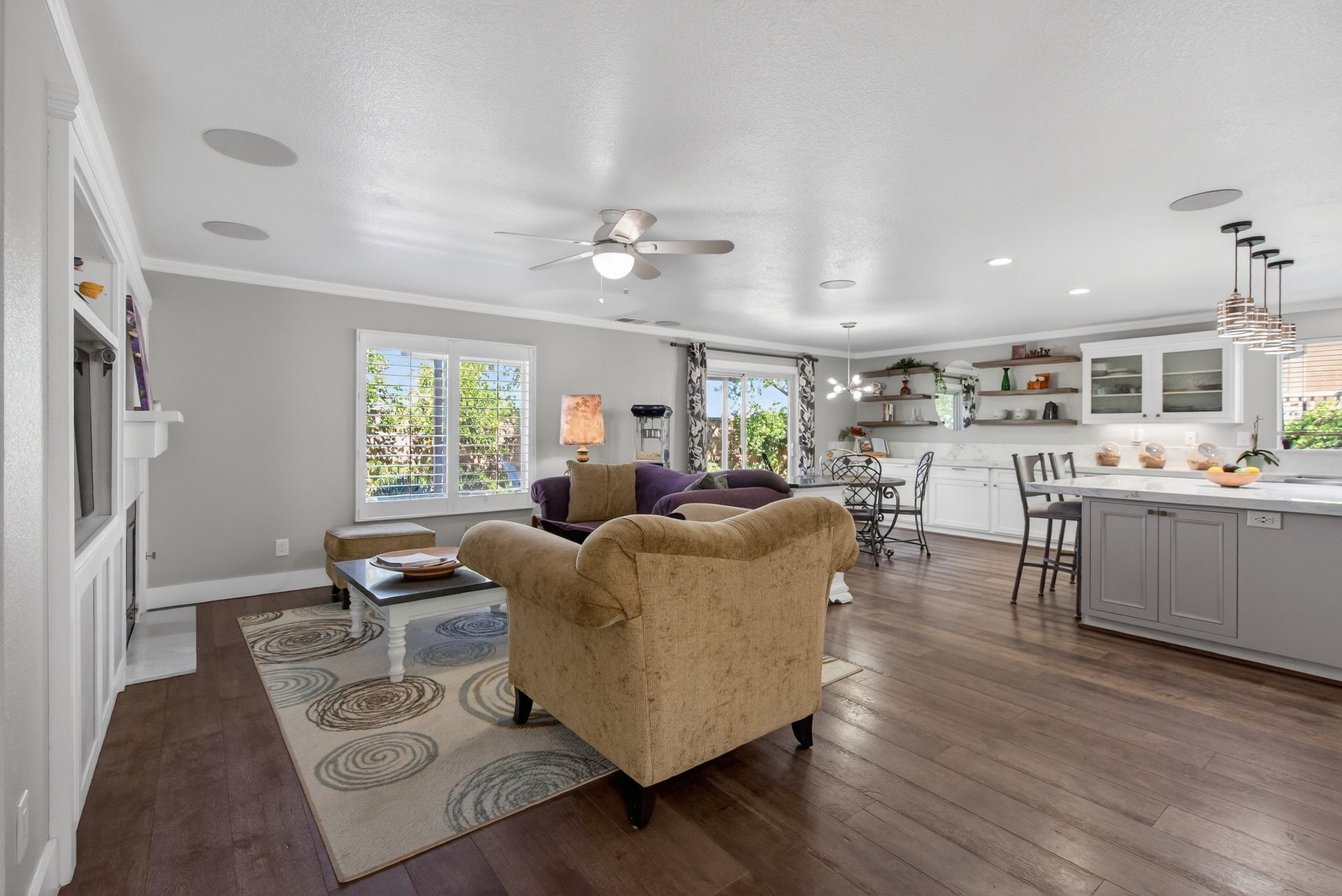 Premium finishes include real wood flooring, custom cabinetry, designer lighting, and a THX Ultra sound system with multiple audio zones throughout the main level and primary suite. A fully paid‑off solar system adds incredible energy savings—currently operating at a credit.