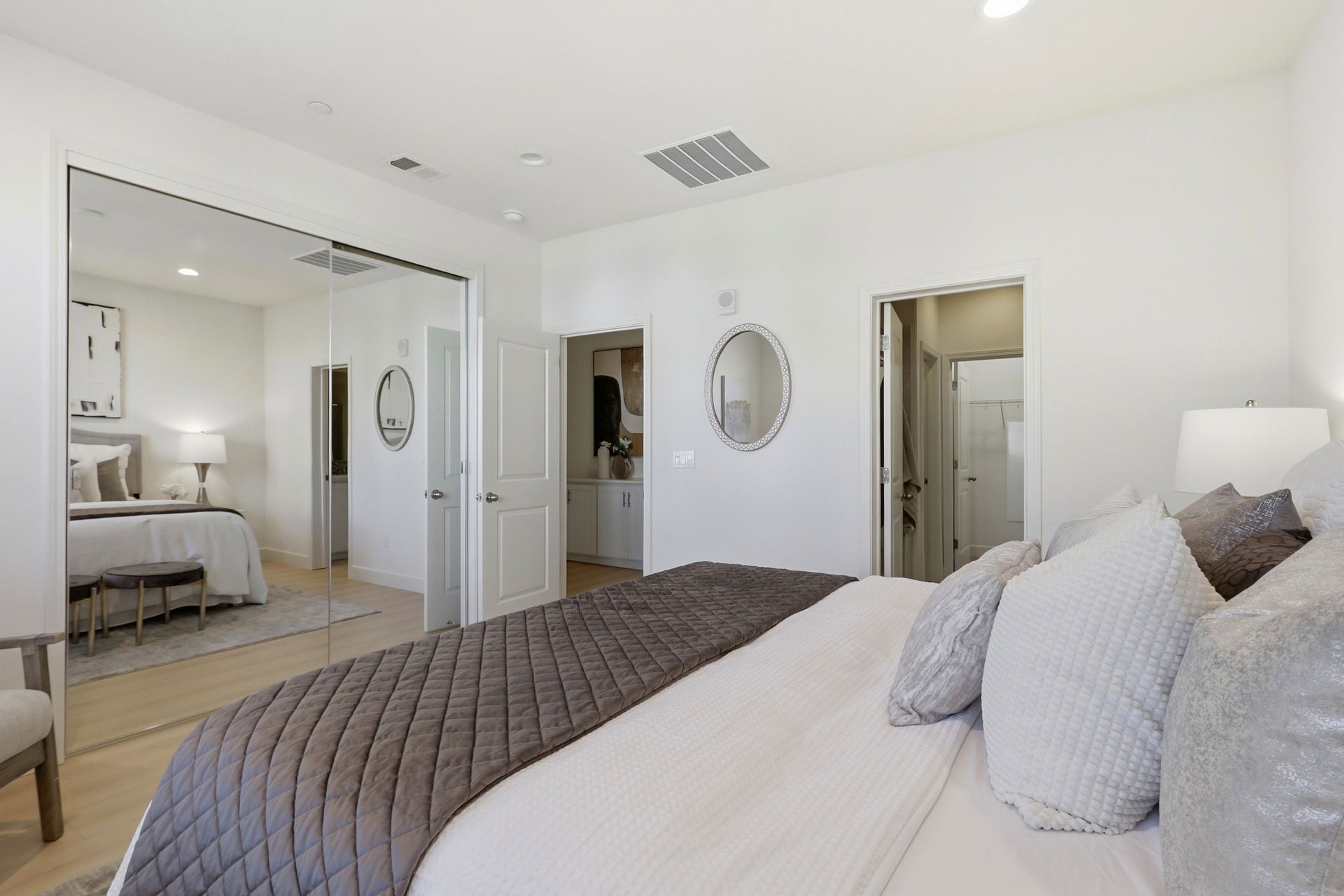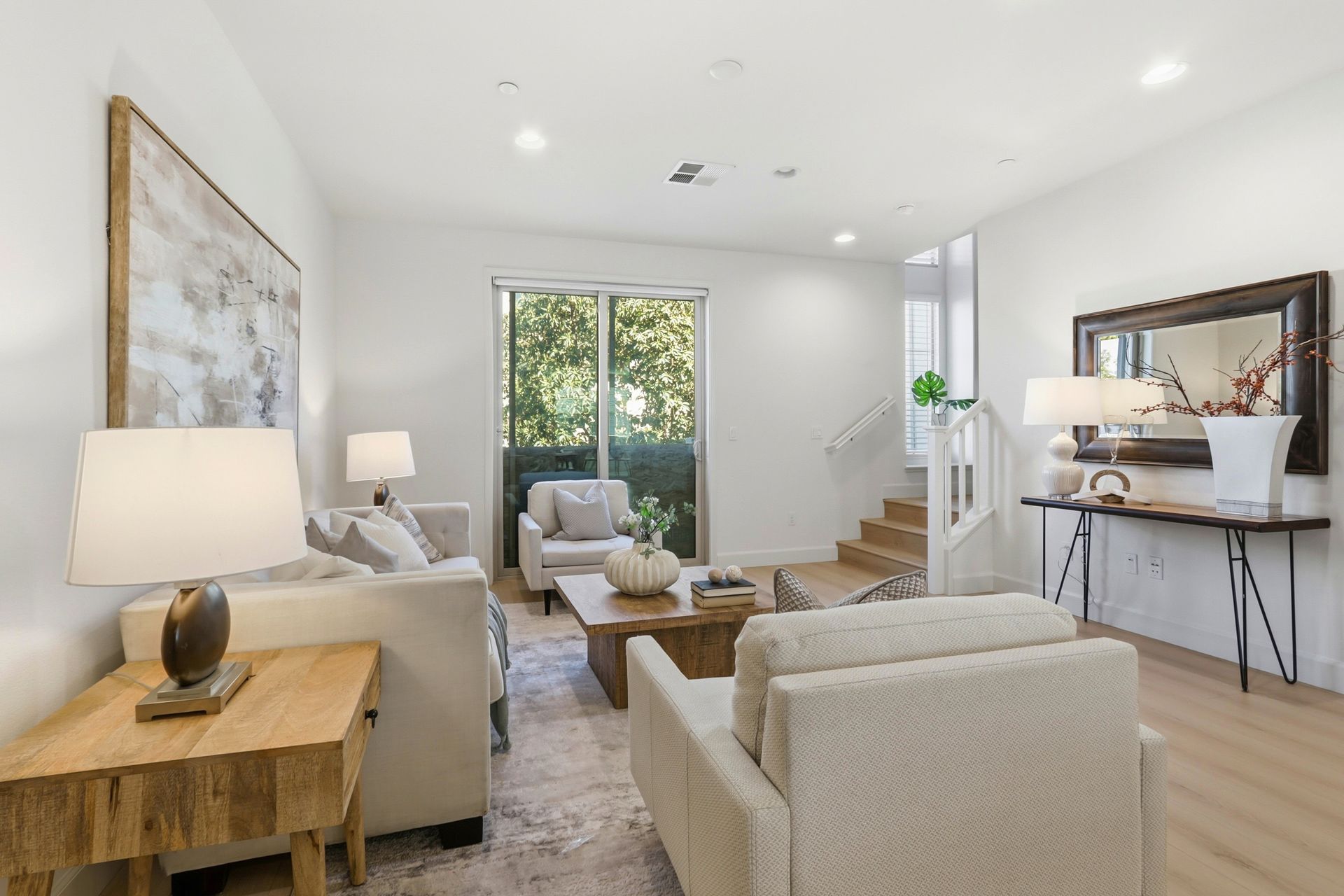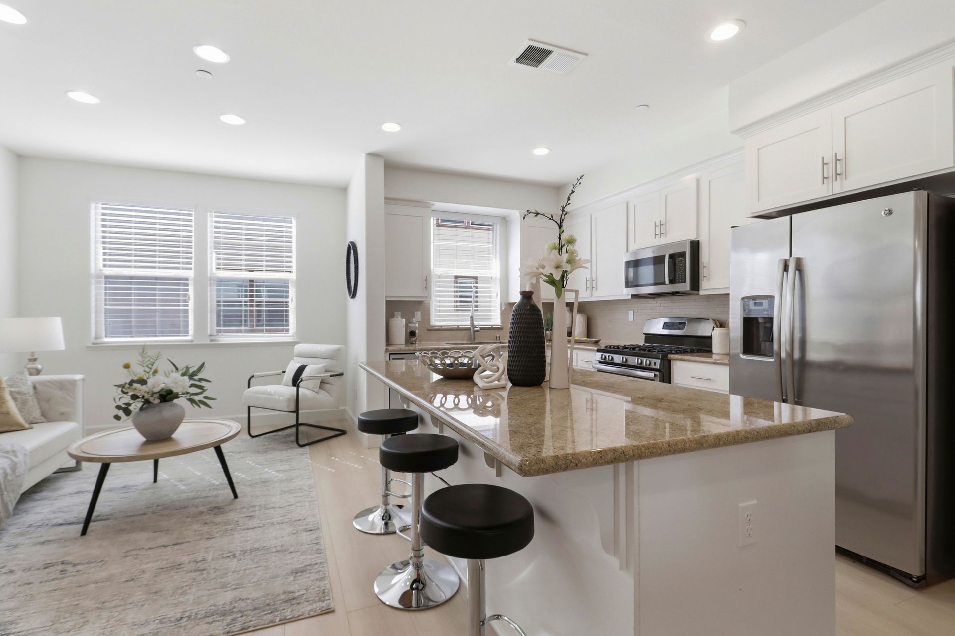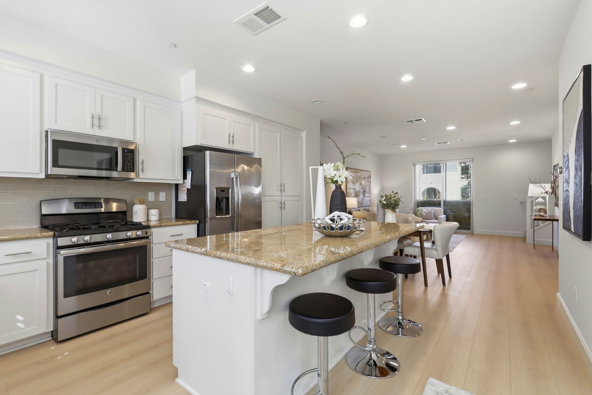Welcome to comfort and elegance! This home offers approximately 1,730-square feet of living space with three bedrooms and three and a half baths! One bedroom with en-suite bath is located on the ground floor, while level 2 offers an open floor plan boasting a living room with balcony access, a dining area, a half bath and a kitchen with granite counters, a large island and stainless-steel appliances, including a gas cooktop. On the third floor sits the primary bedroom and junior suite. This home also has indoor laundry, central A/C and a two-car garage. Complex has a swimming pool, BBQ area and playground and is next to Central Park. Easy access to the Apple Campus, shopping, schools and Kaiser.