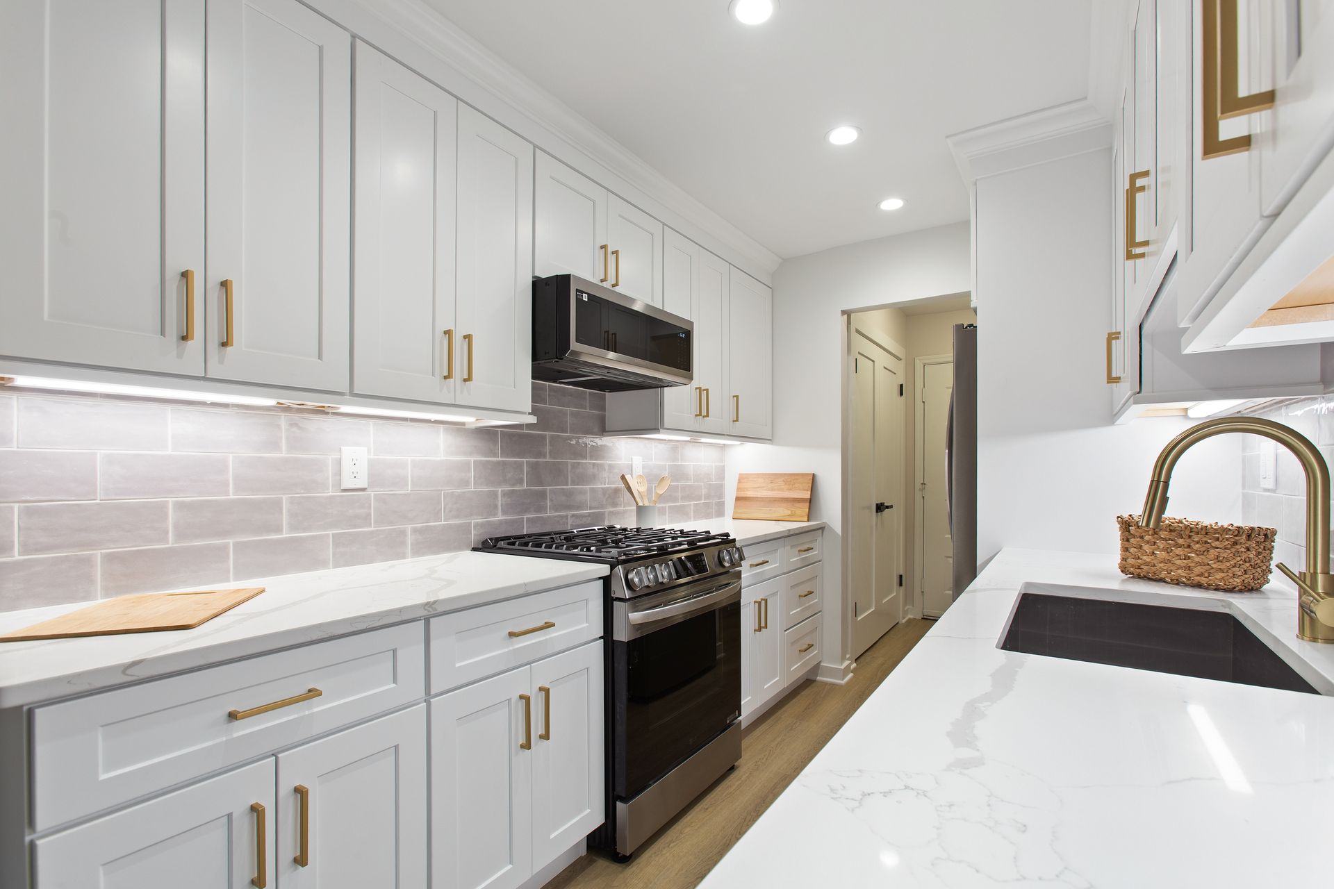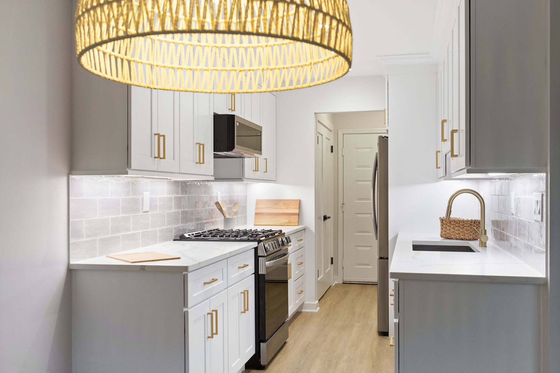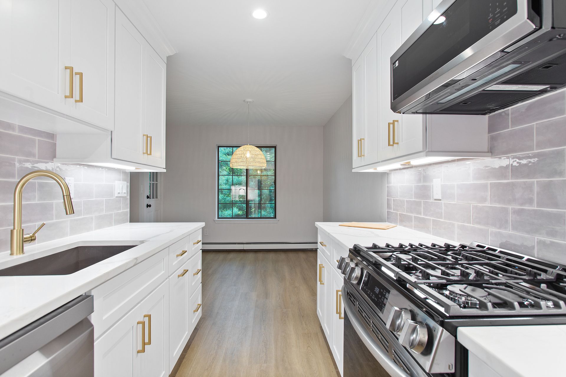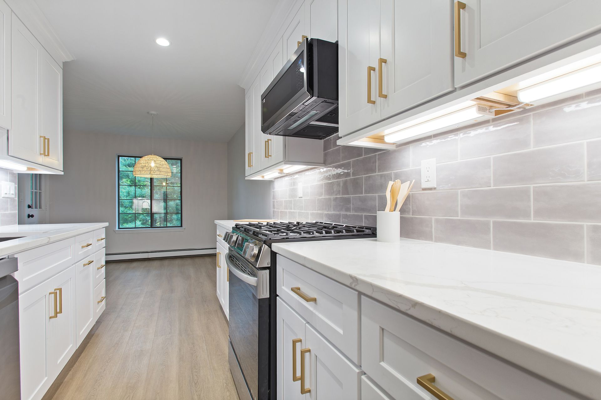 The kitchen has been designed with a custom quartz countertop and designer backsplash tile with top-of-the-line stainless steel appliances.