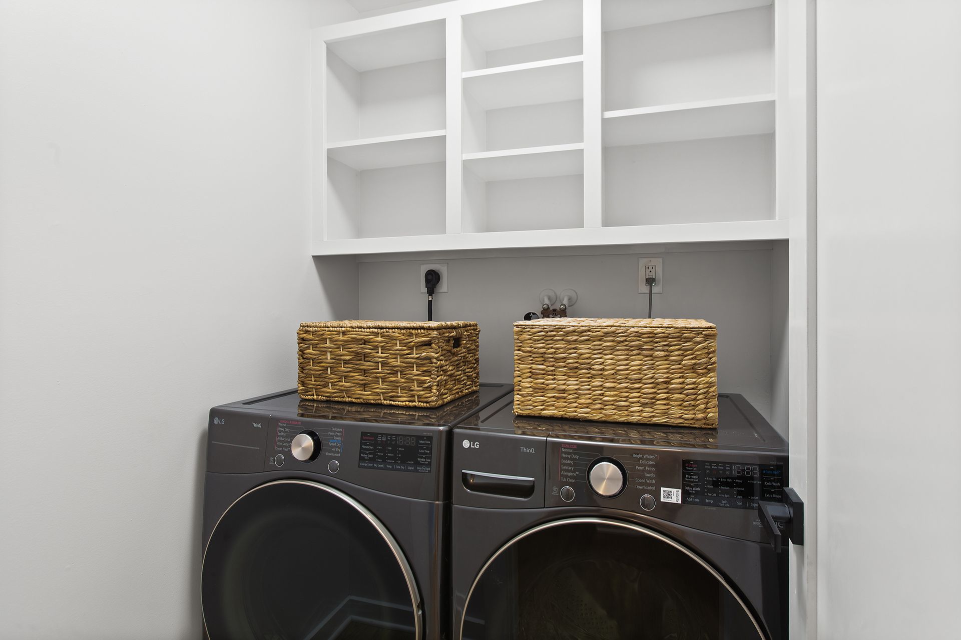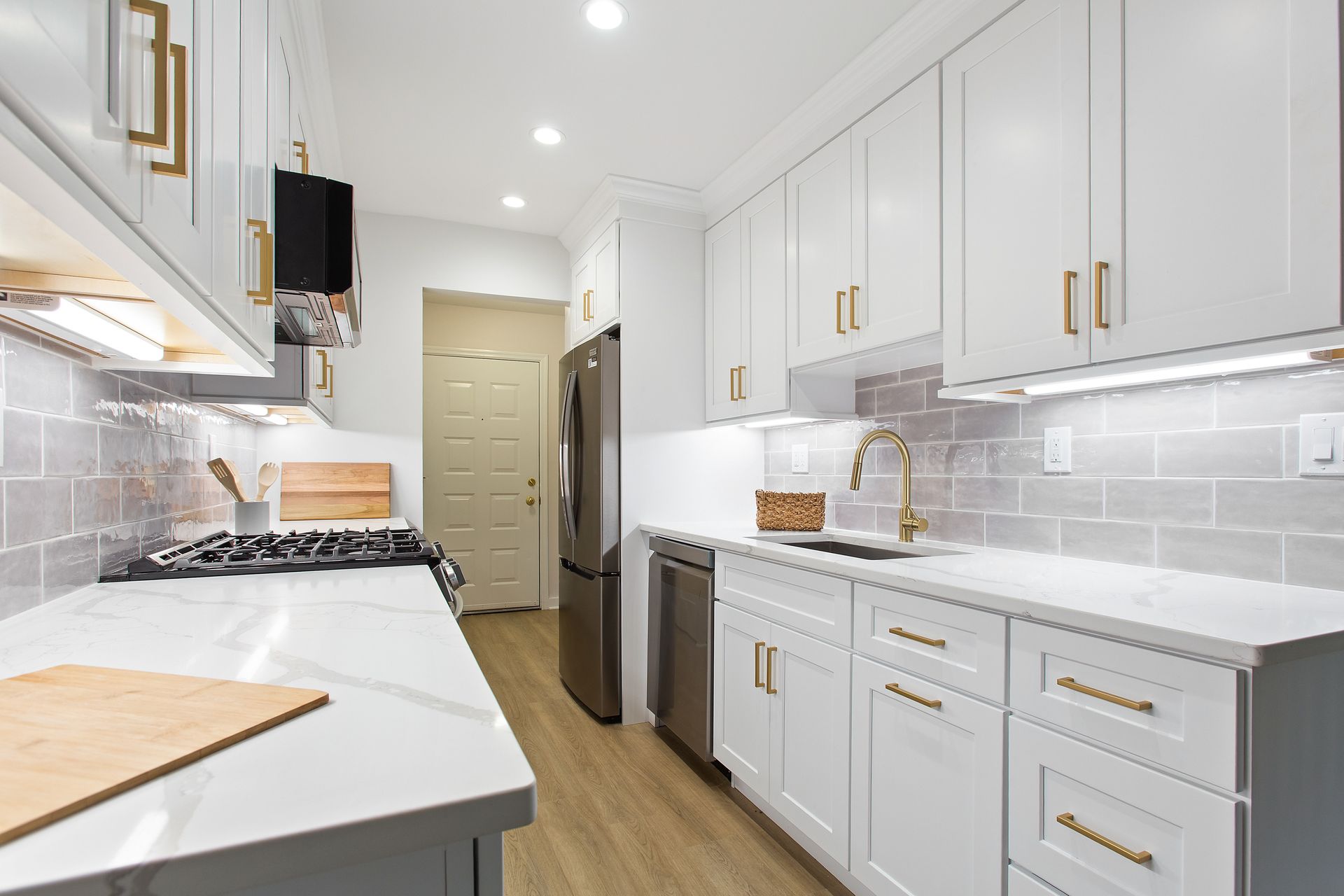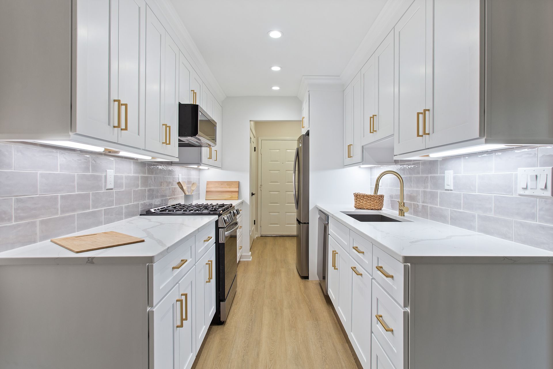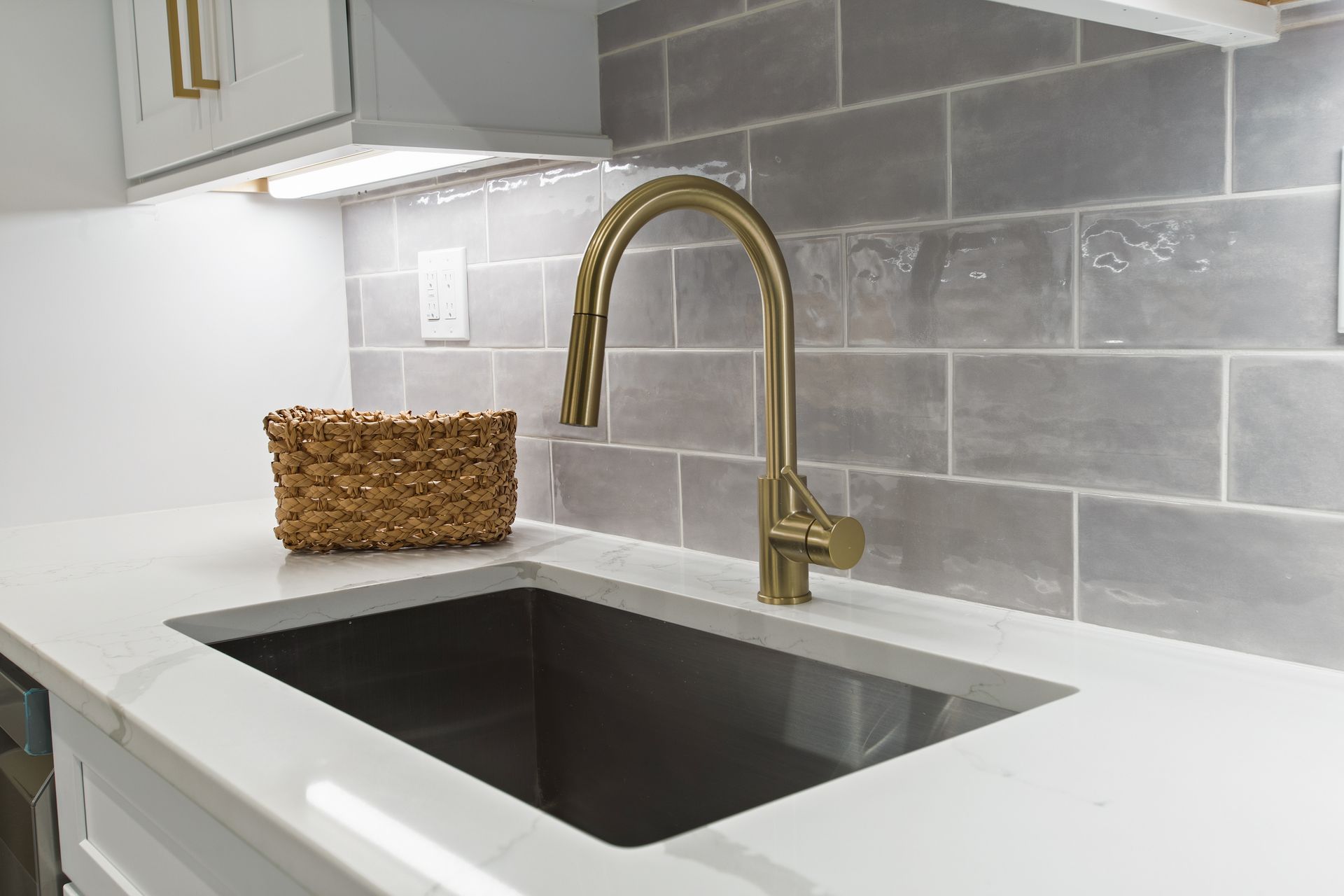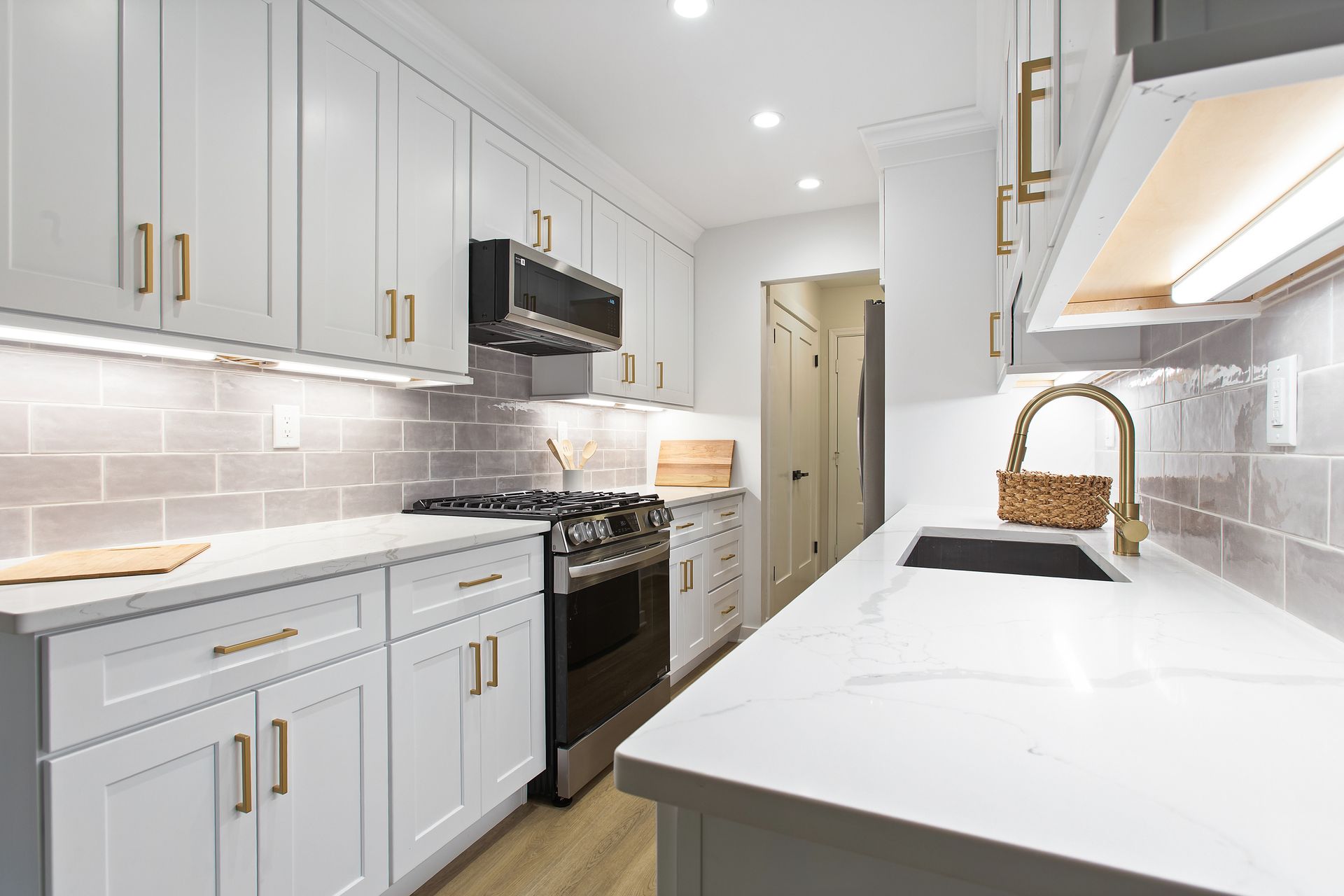 The kitchen has been designed with a custom quartz countertop and designer backsplash tile with top-of-the-line stainless steel appliances.