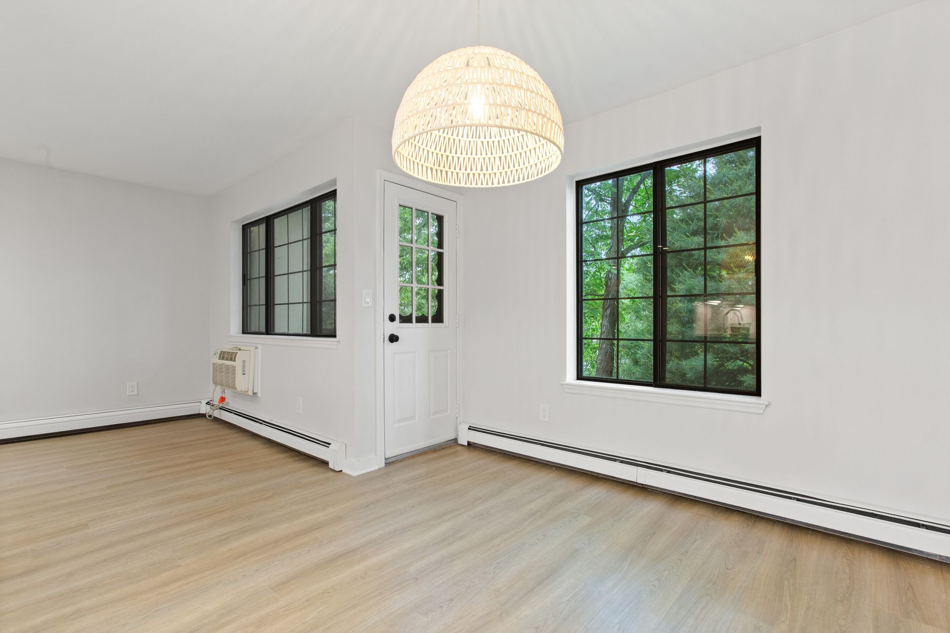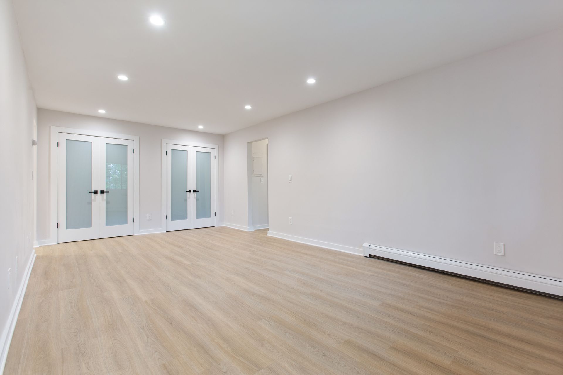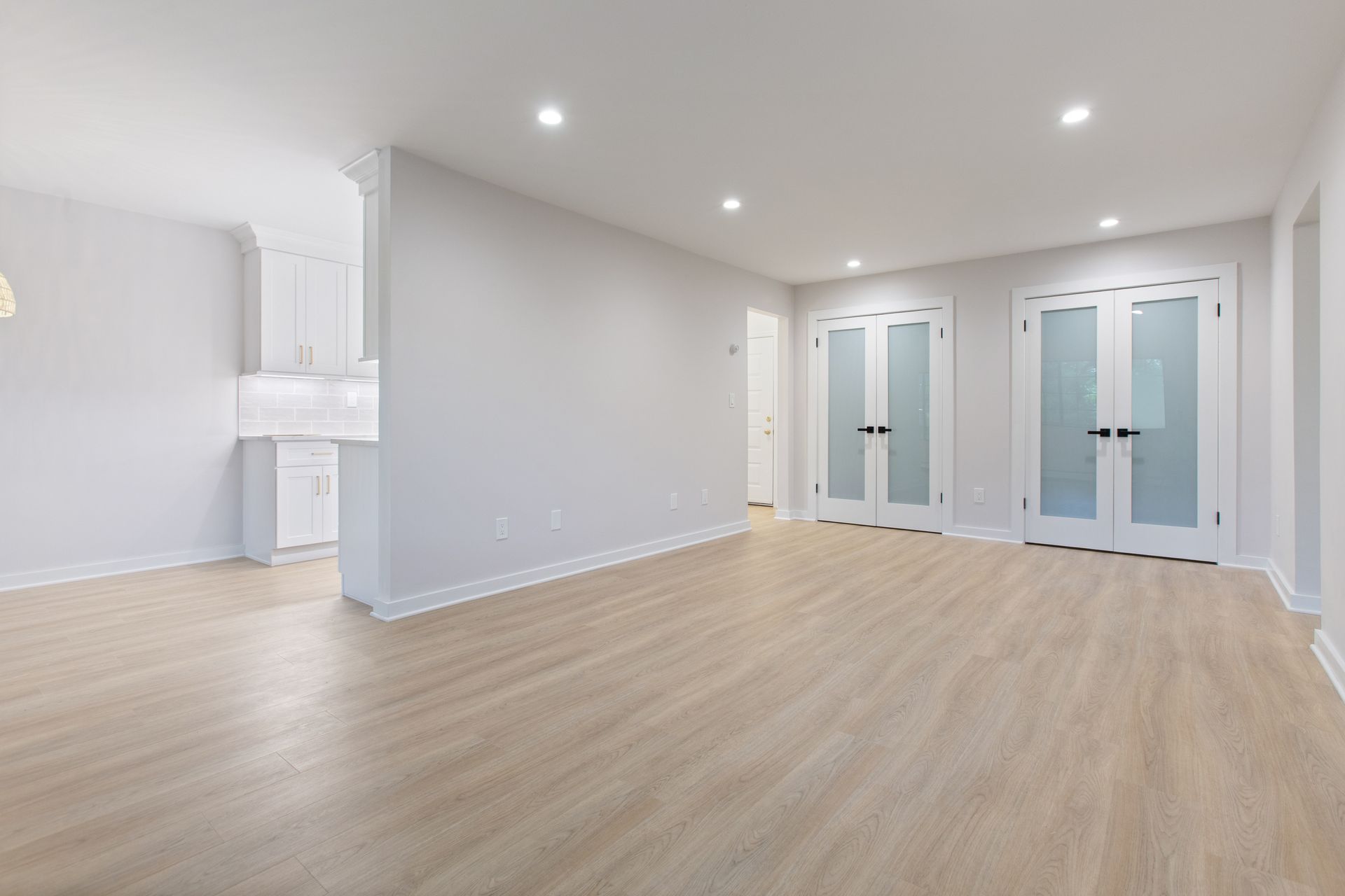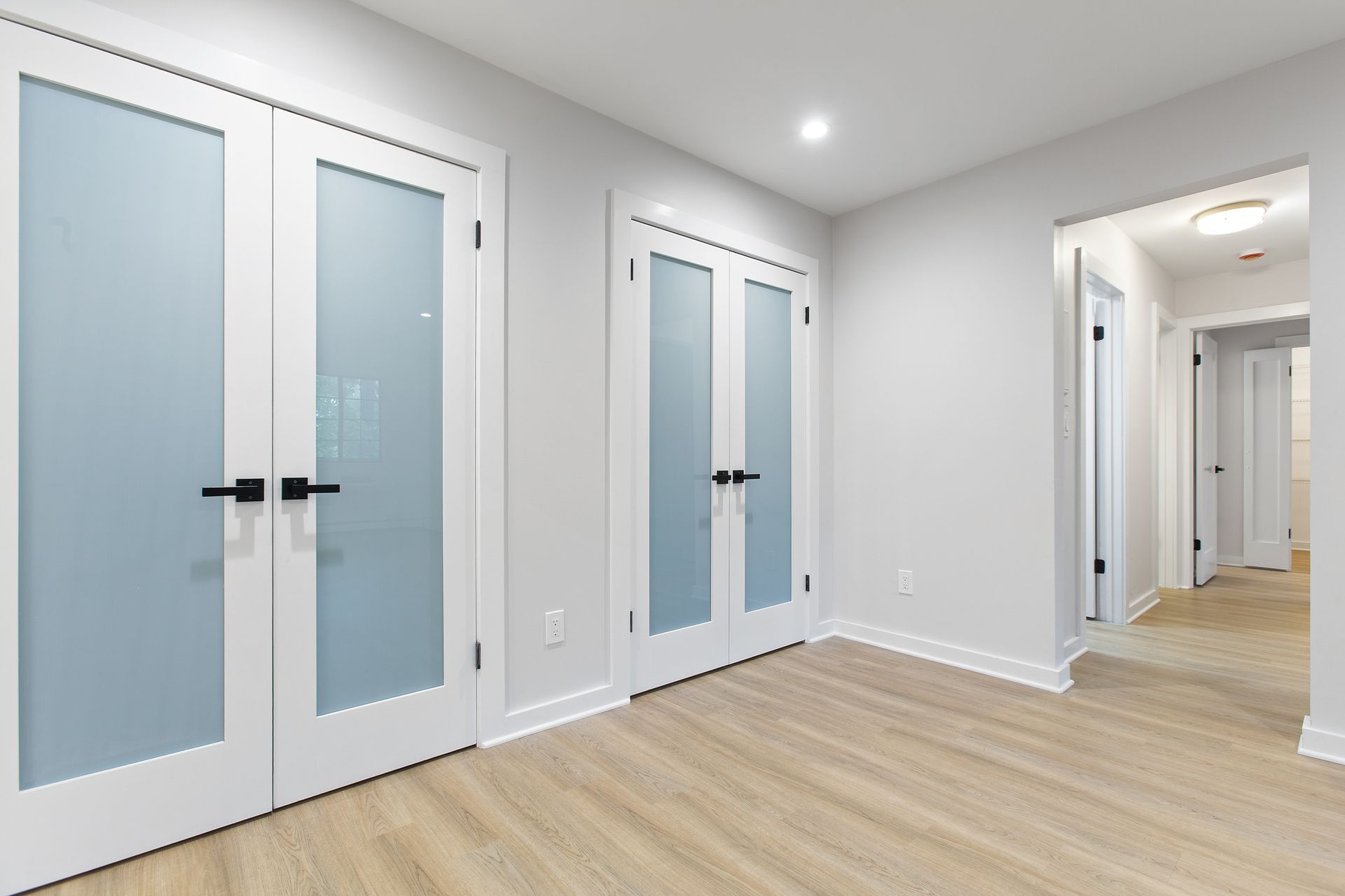 All the doors have been replaced with modern style single panels showcasing an elegant in style door knob. In addition, the new closets storage space and pantry have full glass frosted windows- just a design element that makes the living room so much more elegant.