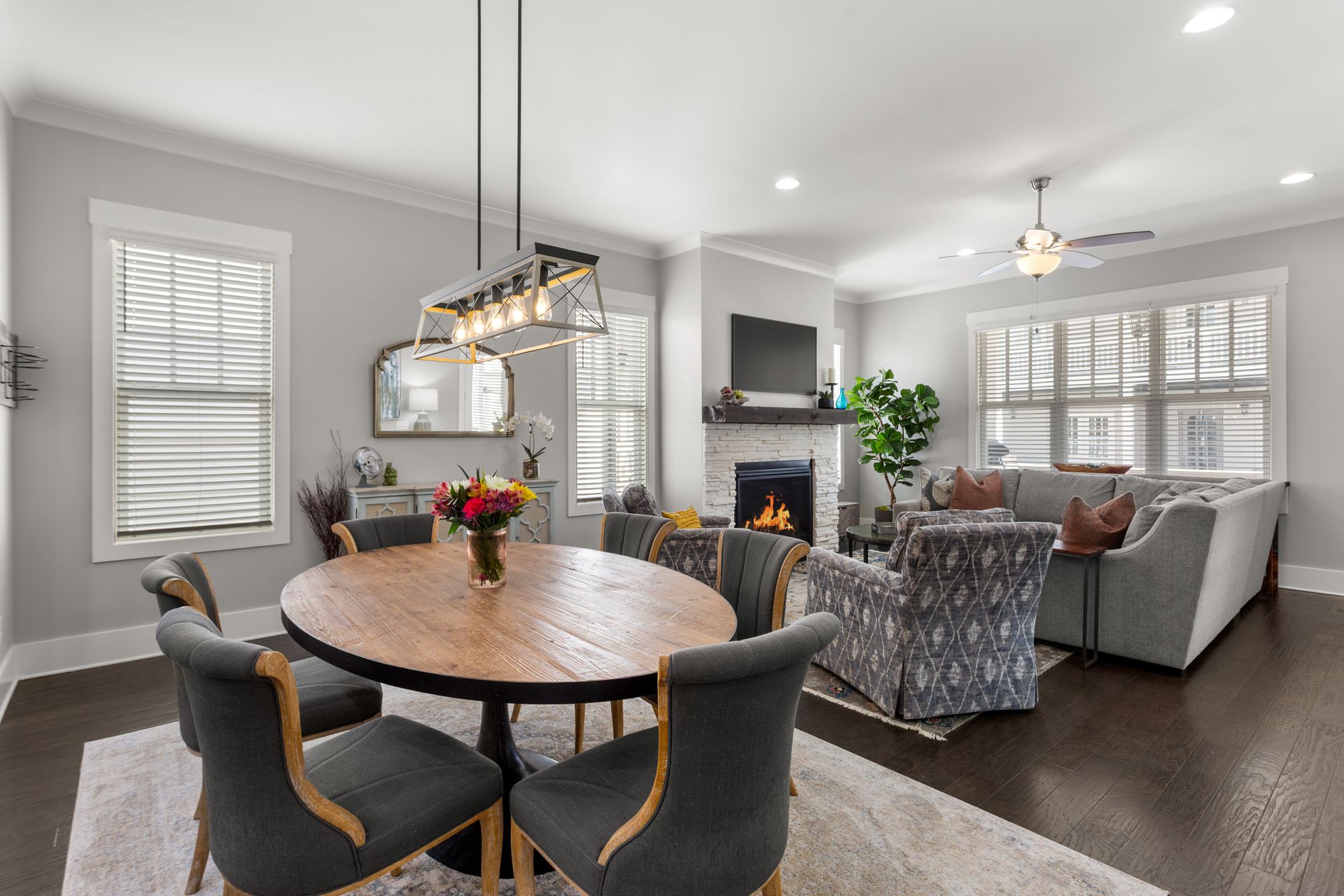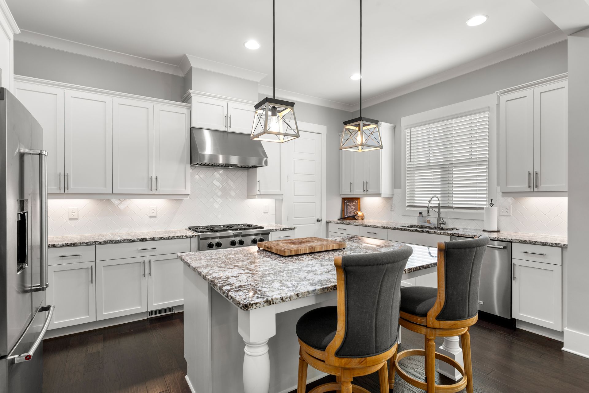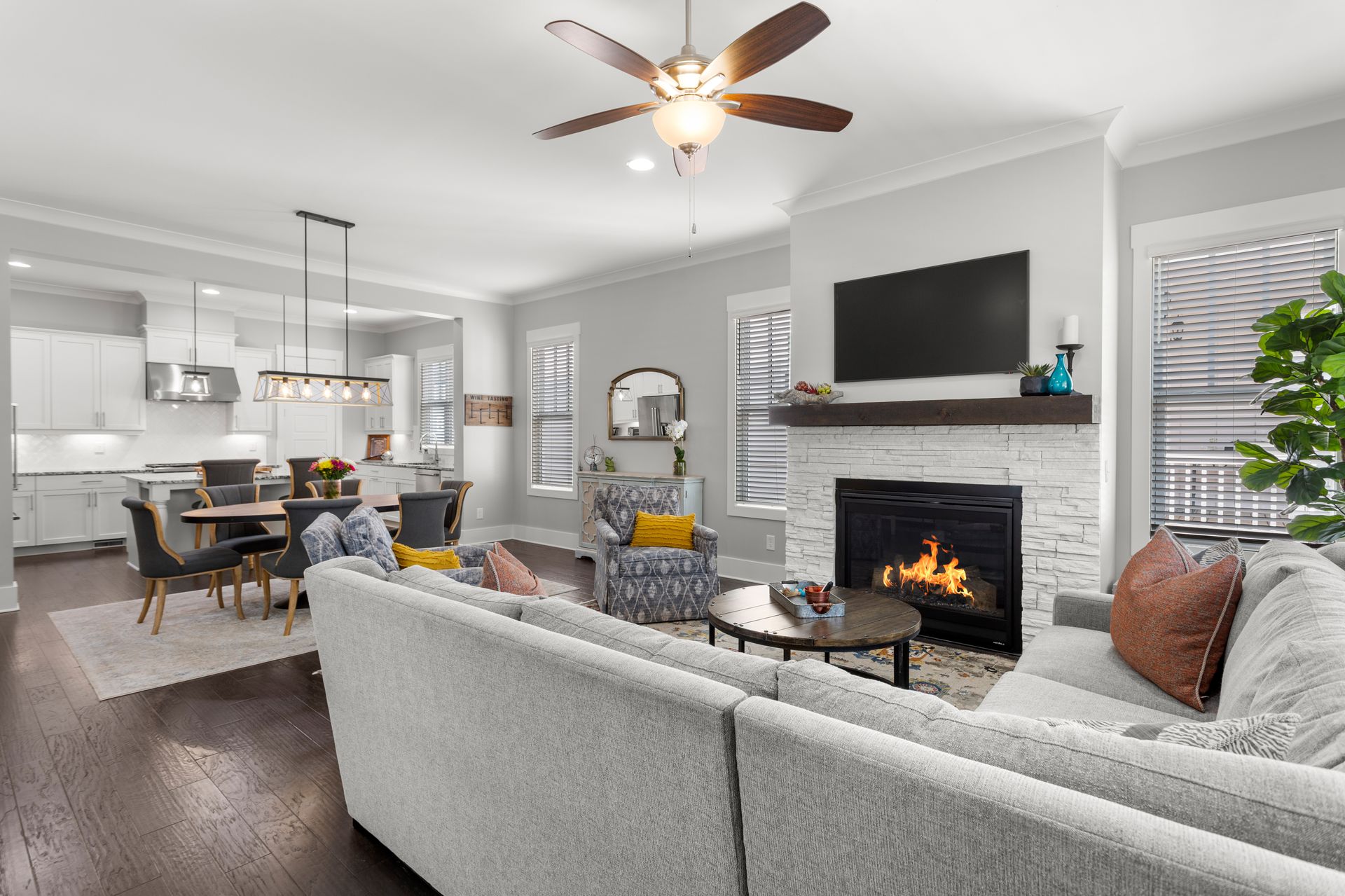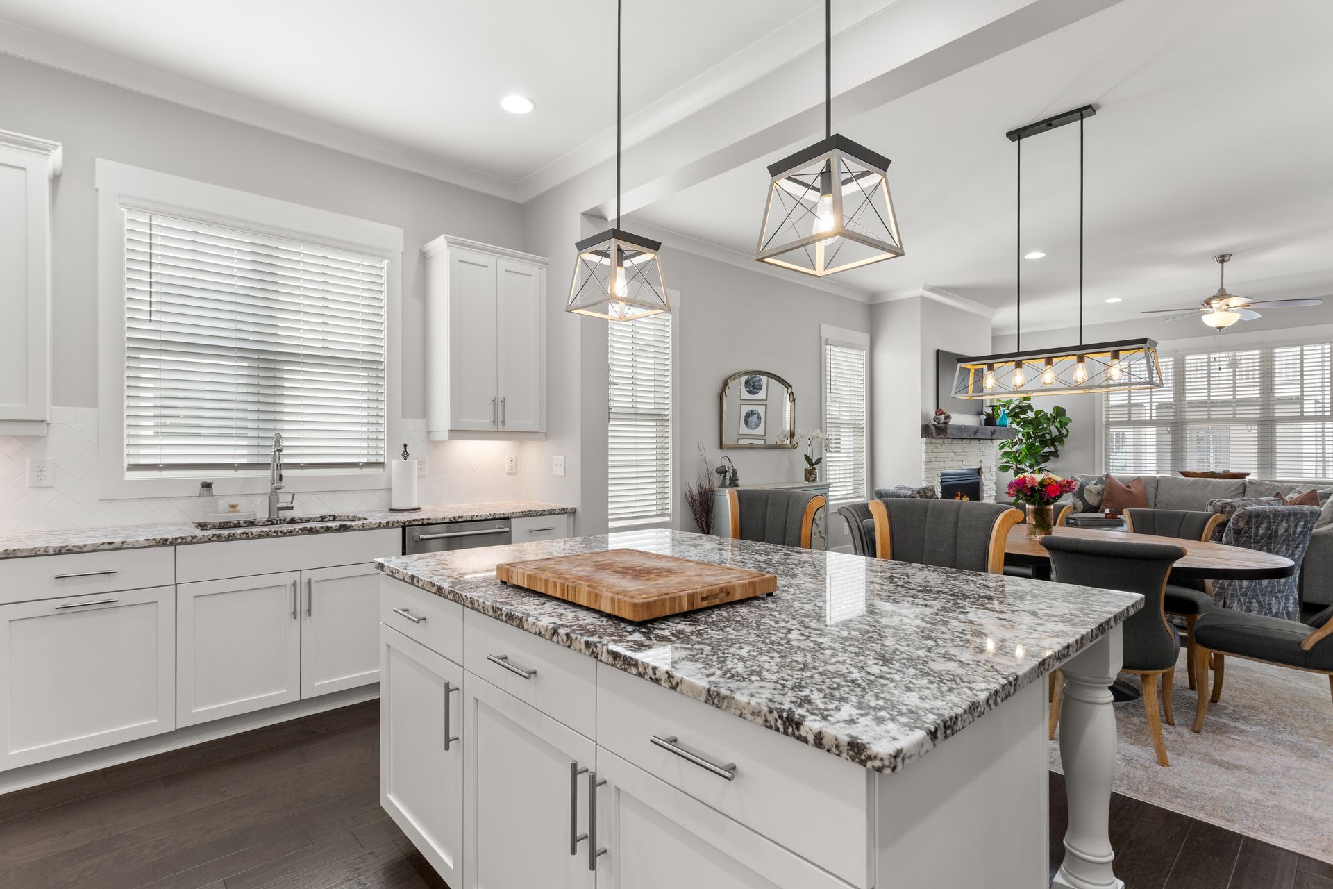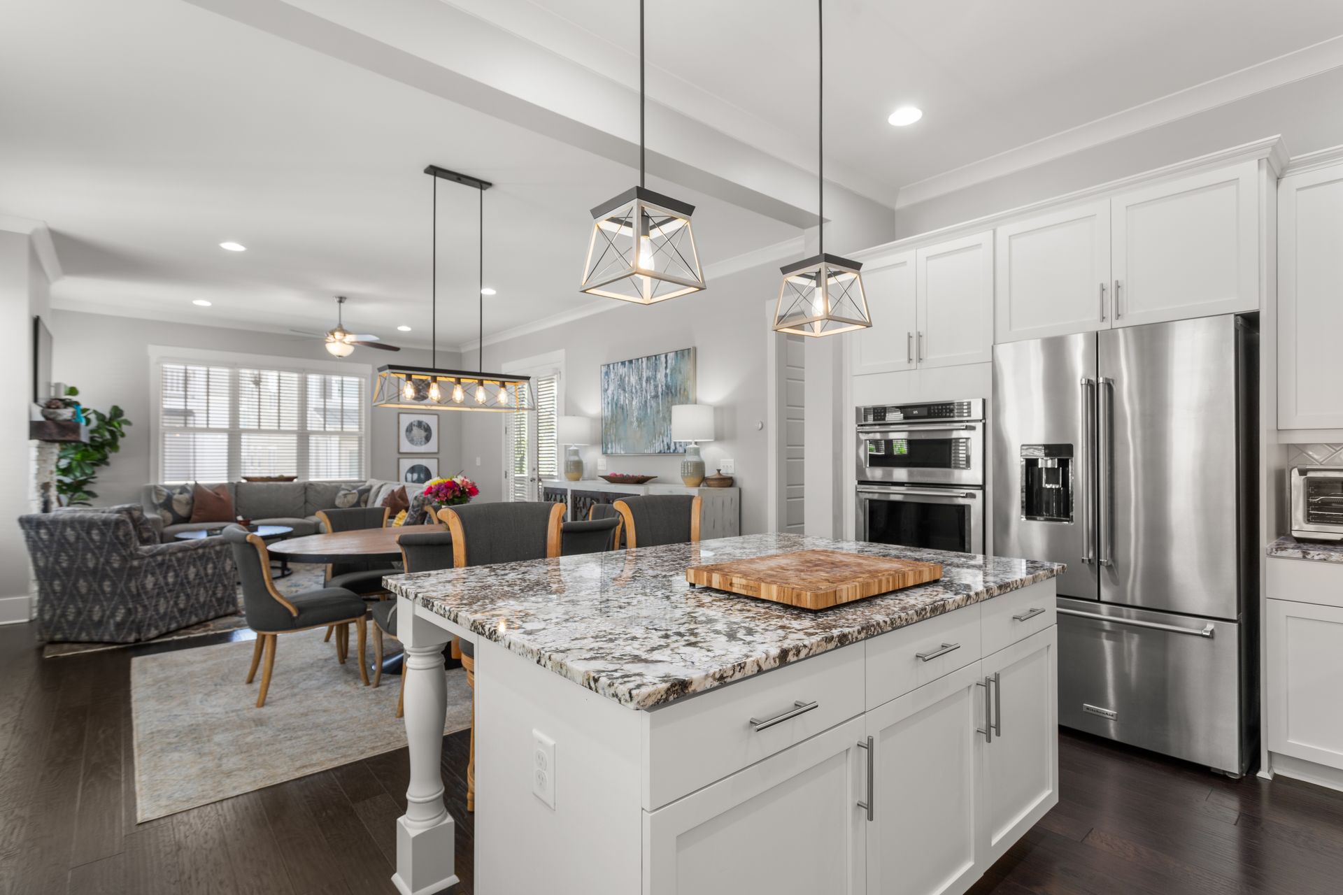 The bright, open-concept living room features a gas fireplace and large windows, flowing seamlessly into the dining area and designer kitchen. The kitchen boasts luxury granite countertops, high-end KitchenAid appliances, an oversized island, and a butler’s pantry with a wet bar, wine cooler, and commercial ice machine.