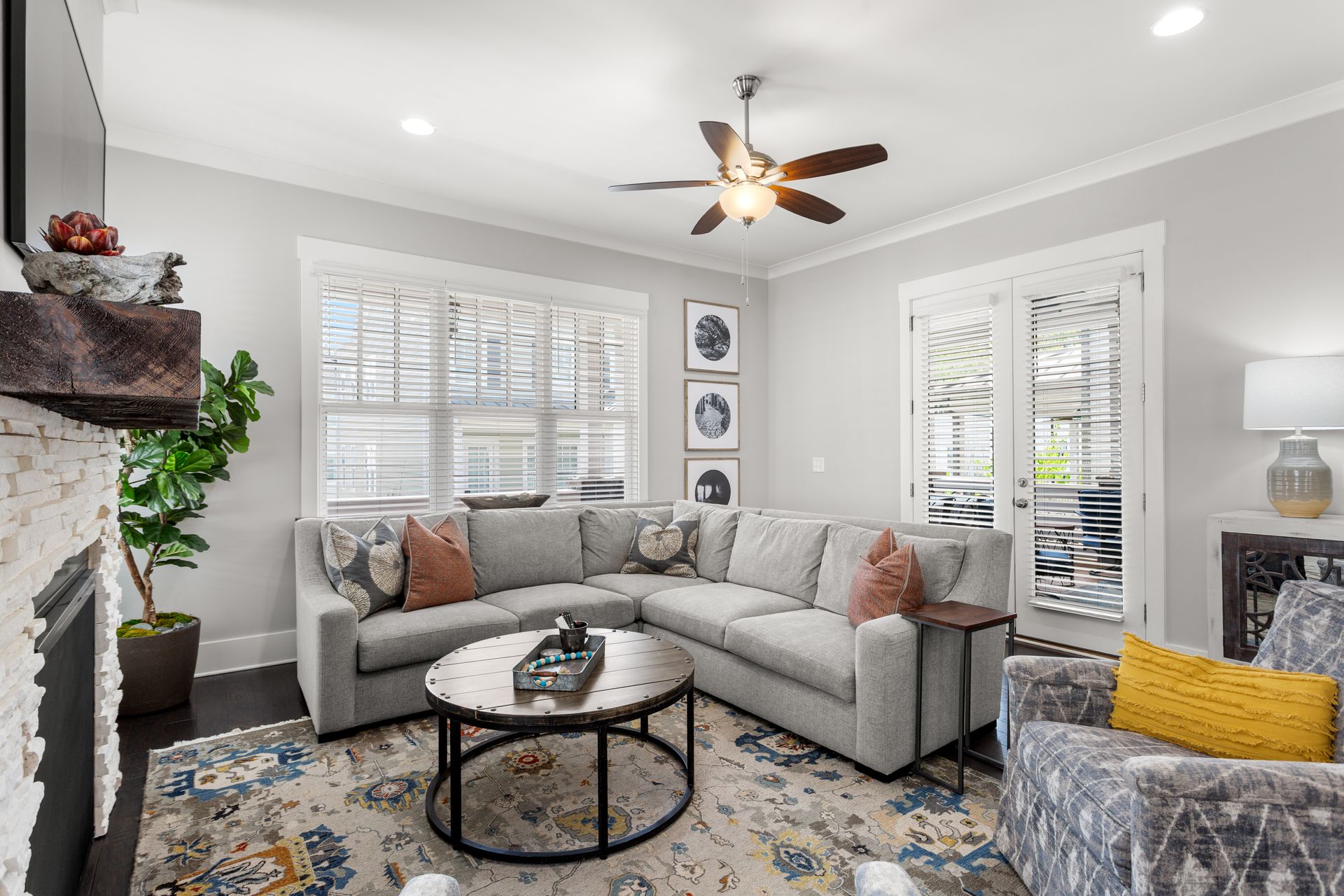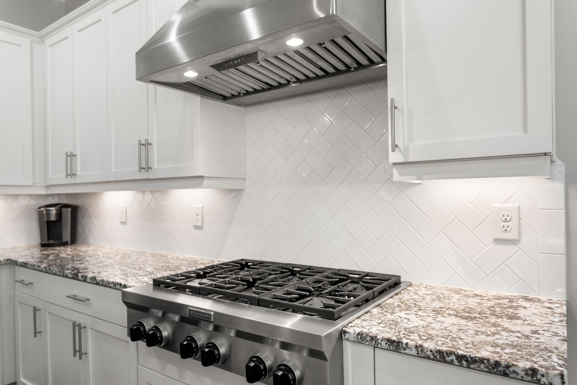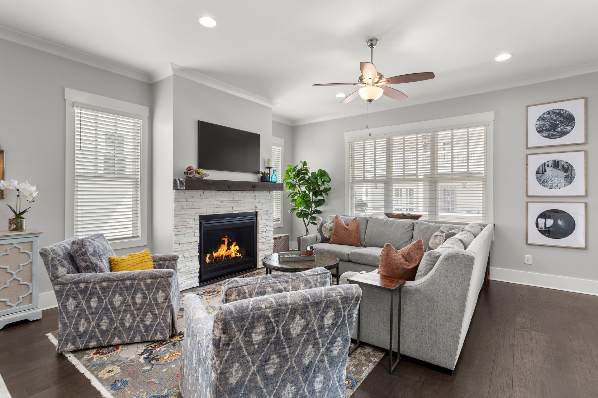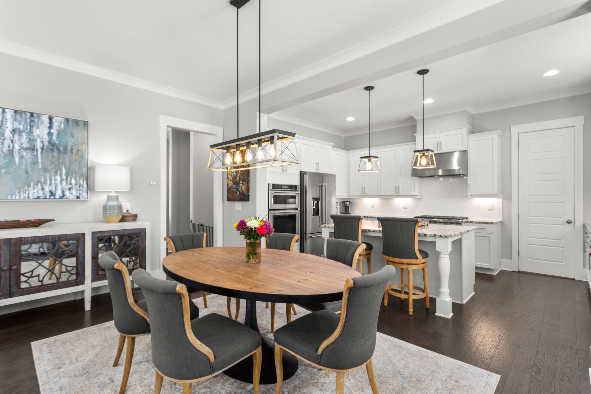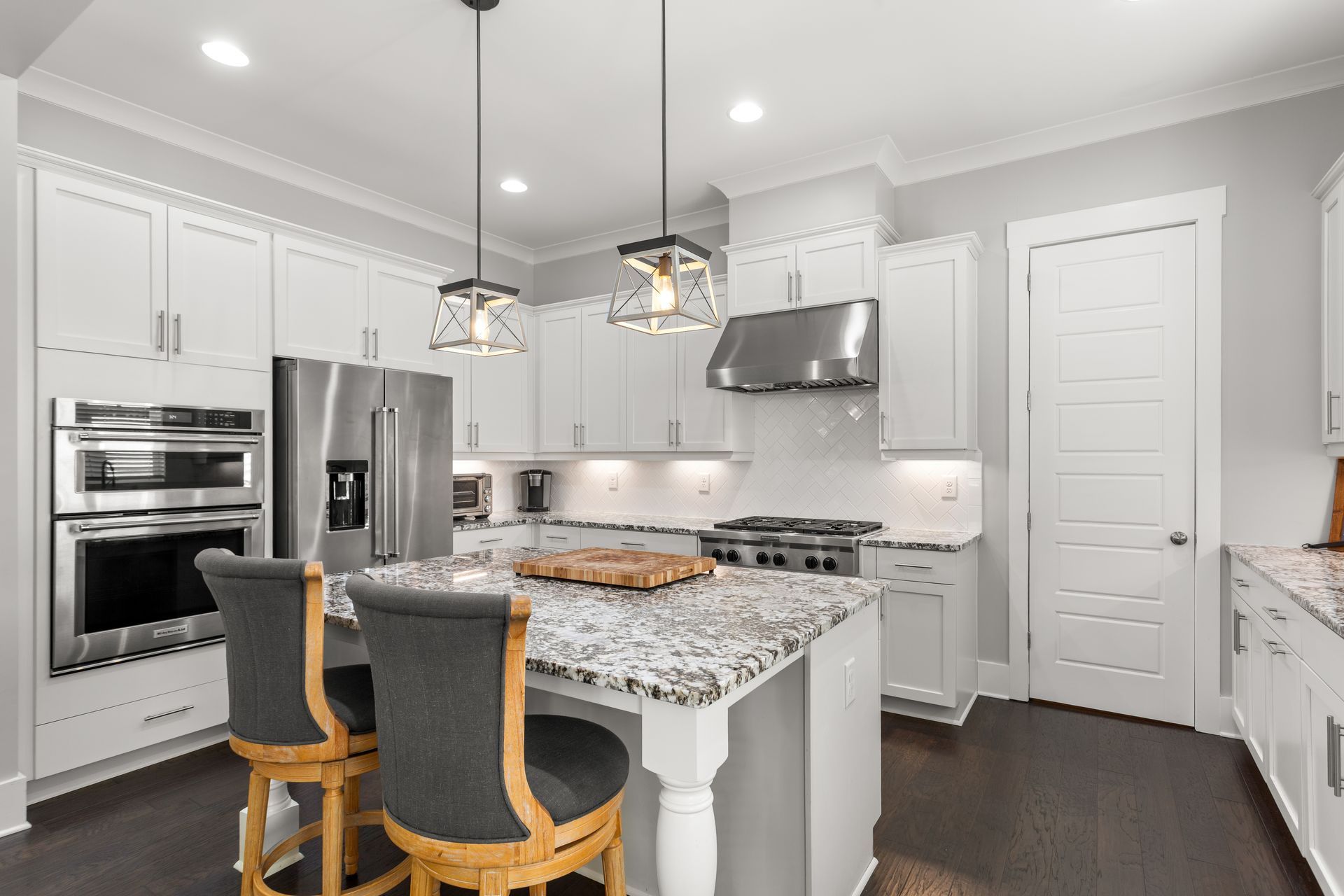 The bright, open-concept living room features a gas fireplace and large windows, flowing seamlessly into the dining area and designer kitchen. The kitchen boasts luxury granite countertops, high-end KitchenAid appliances, an oversized island, and a butler’s pantry with a wet bar, wine cooler, and commercial ice machine.