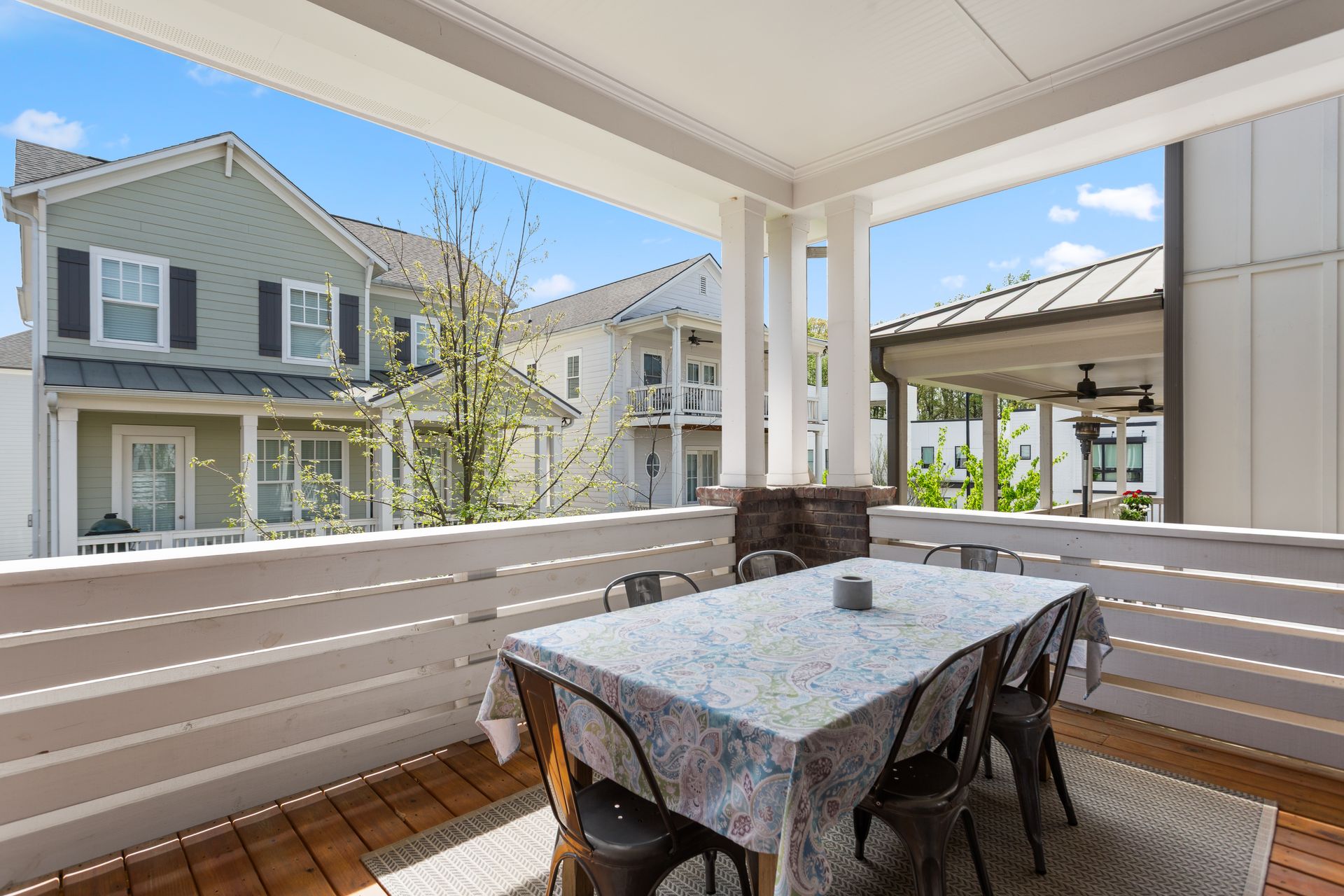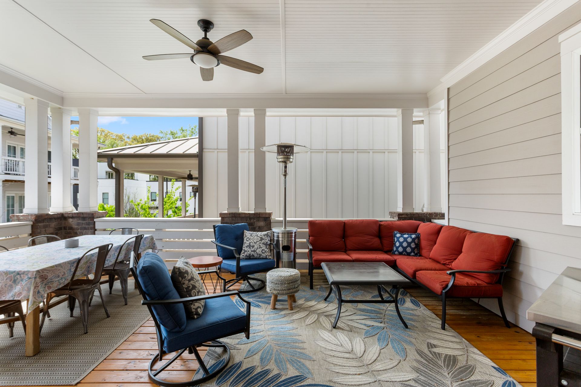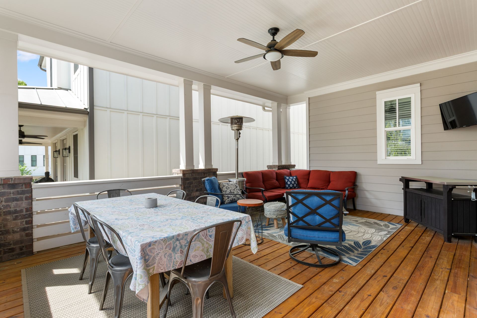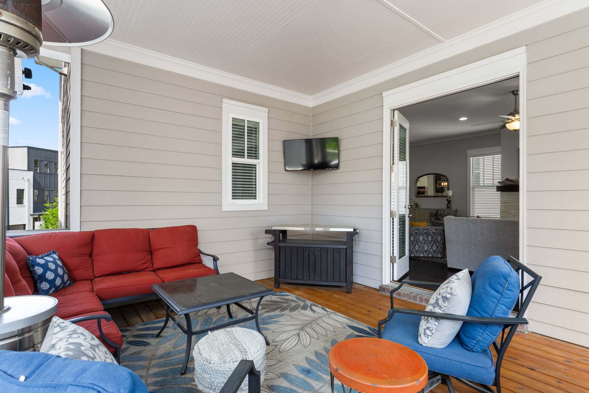 Outdoor spaces include a covered deck, recently sealed for durability, and a spacious front porch, perfect for a fire pit. Additional features include a redesigned laundry room, dual-zoned Nest thermostats, a UV-filtered HVAC system, and a tankless water heater. A built-in elevator shaft offers future accessibility.