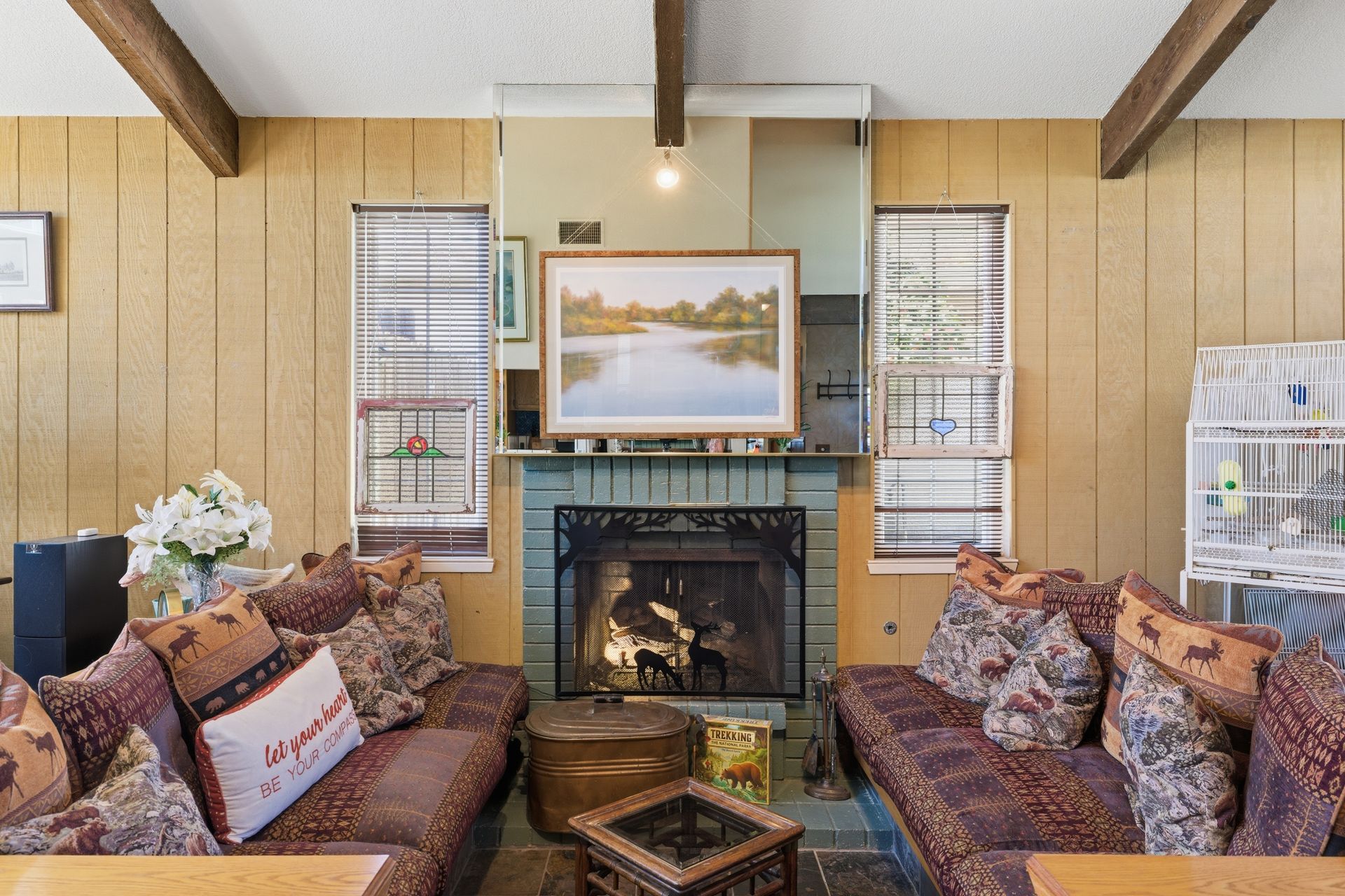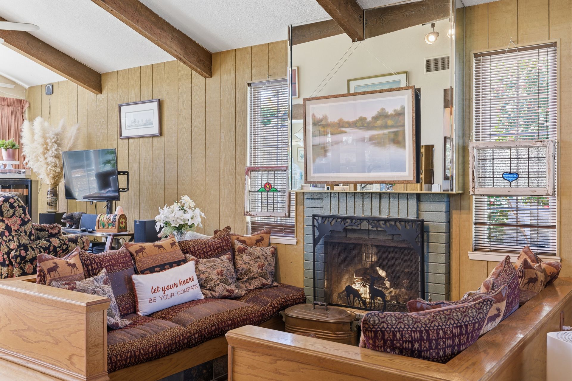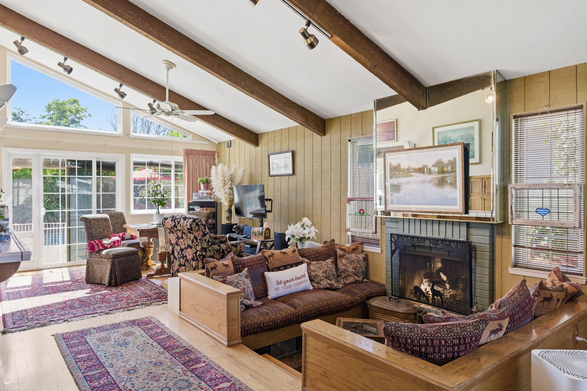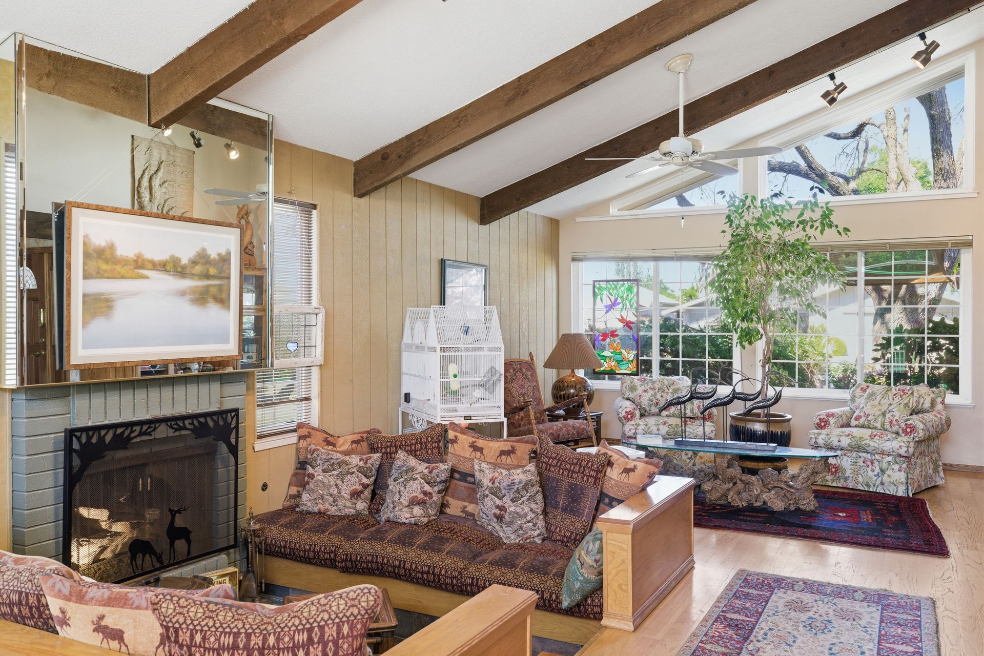 Inside, engineered hardwood floors and transom dual-pane windows that are strikingly framing serene views of trees and the sky brings the outdoors home. All the while, ceiling fans provide a gentle breeze throughout. In addition, a recessed conversation area creates an intimate gathering space centered around a cozy fireplace, with a convenient wet bar just moments away, ideal for hosting or unwinding.
