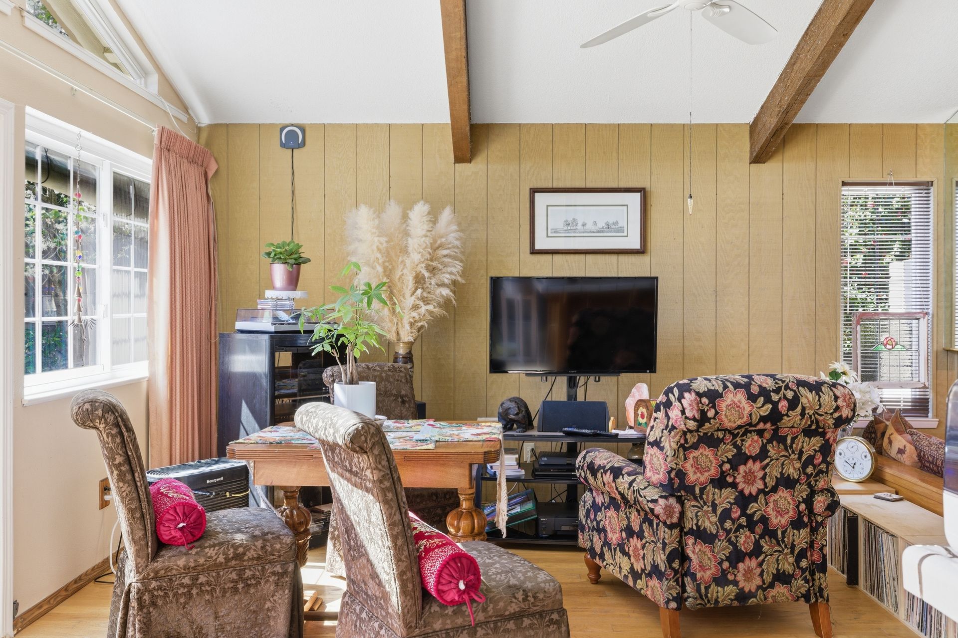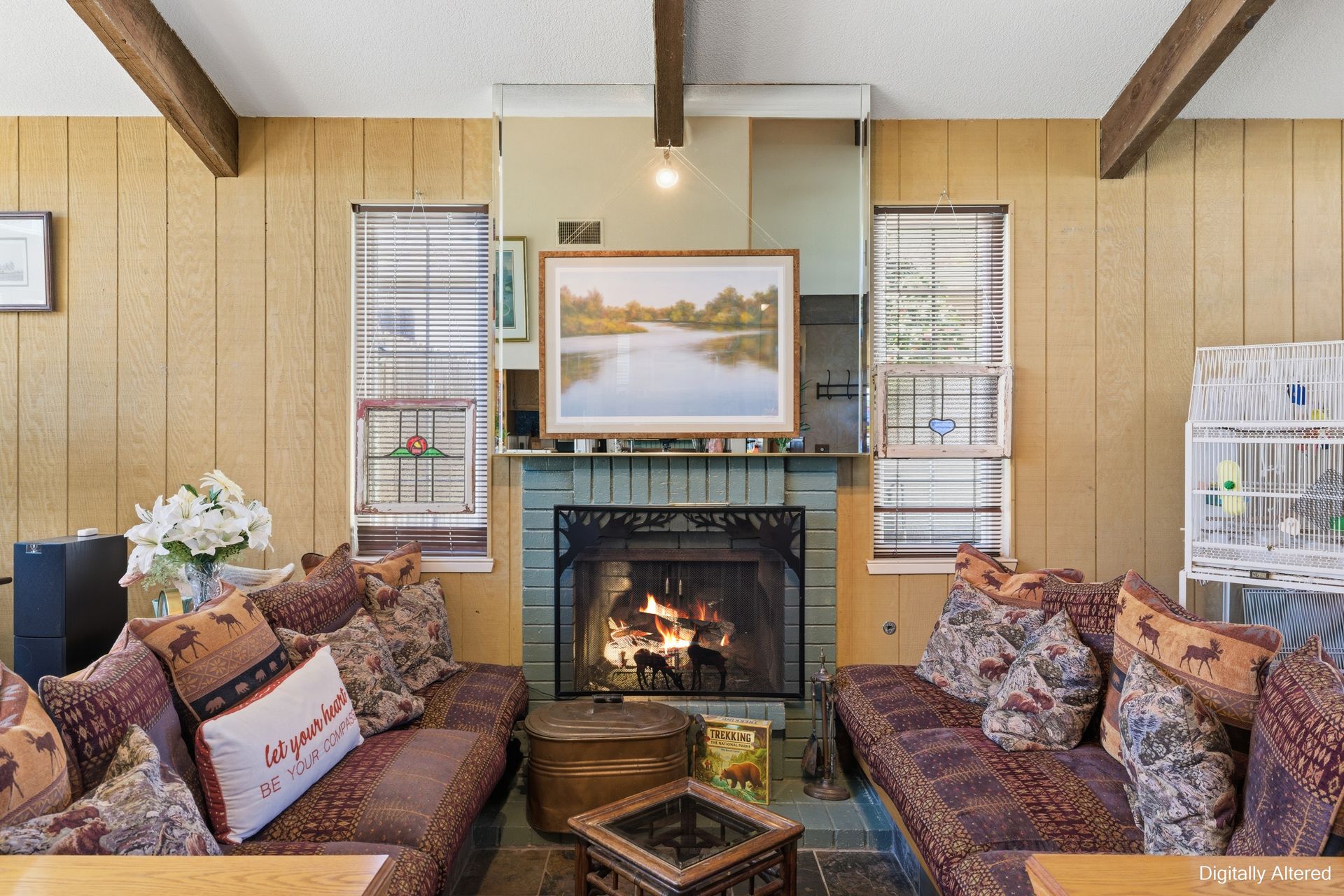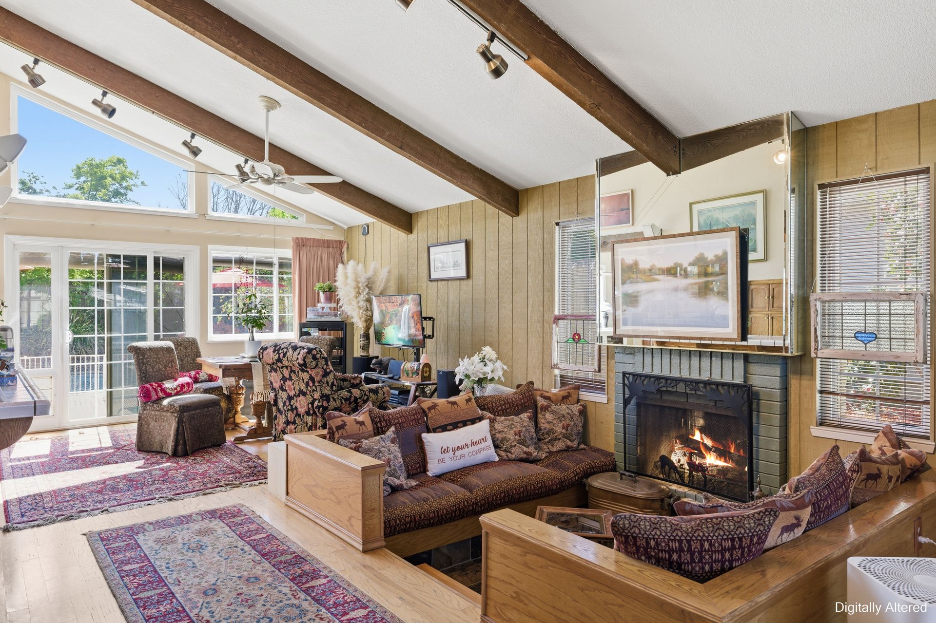 Inside, engineered hardwood floors and transom dual-pane windows that are strikingly framing serene views of trees and the sky brings the outdoors home. All the while, ceiling fans provide a gentle breeze throughout. In addition, a recessed conversation area creates an intimate gathering space centered around a cozy fireplace, with a convenient wet bar just moments away, ideal for hosting or unwinding.