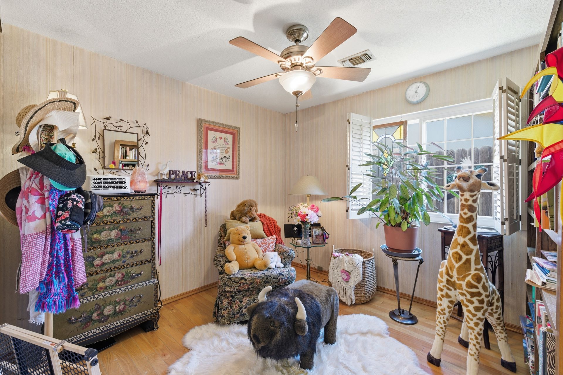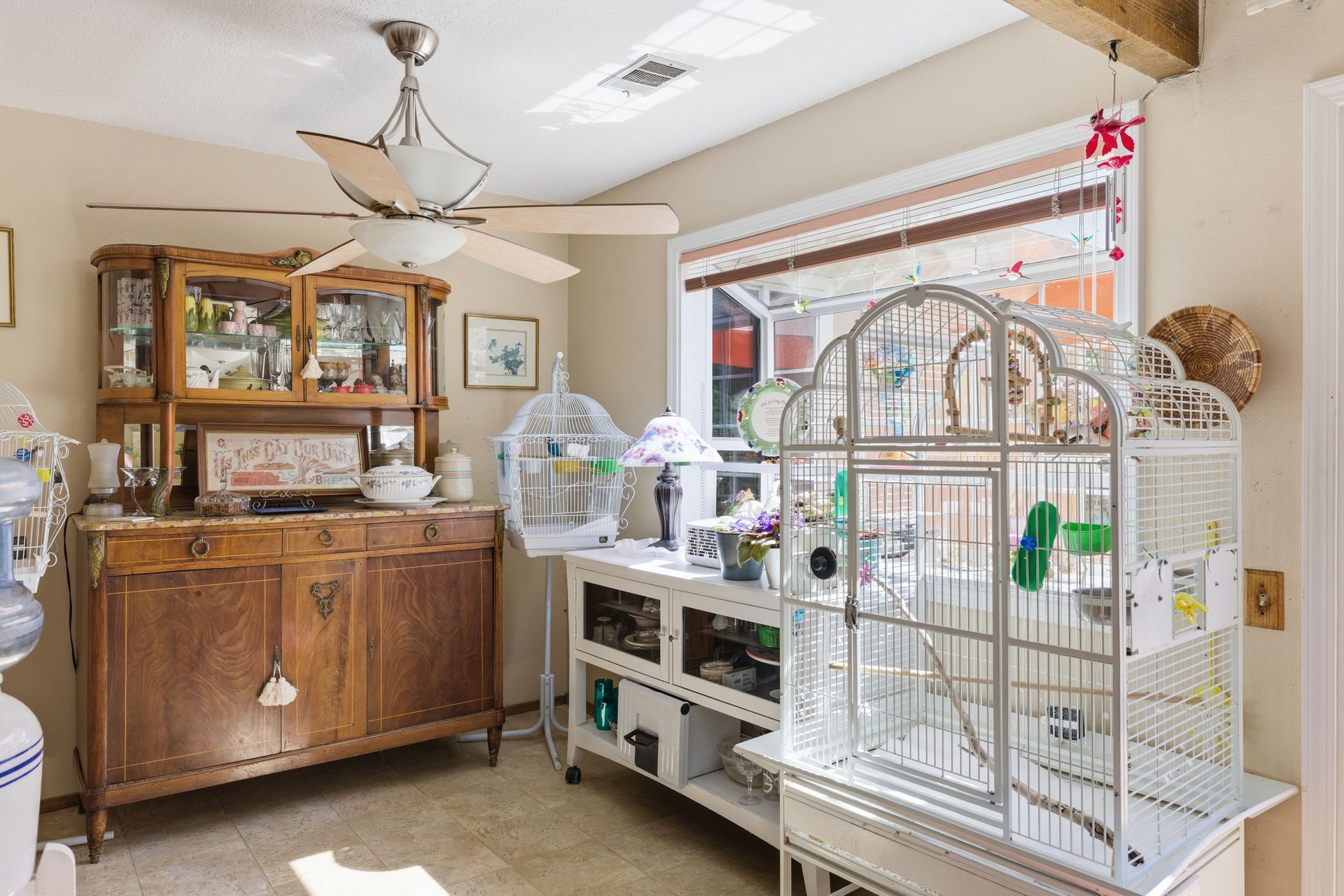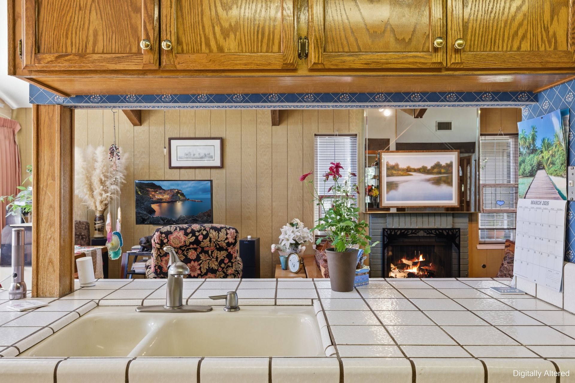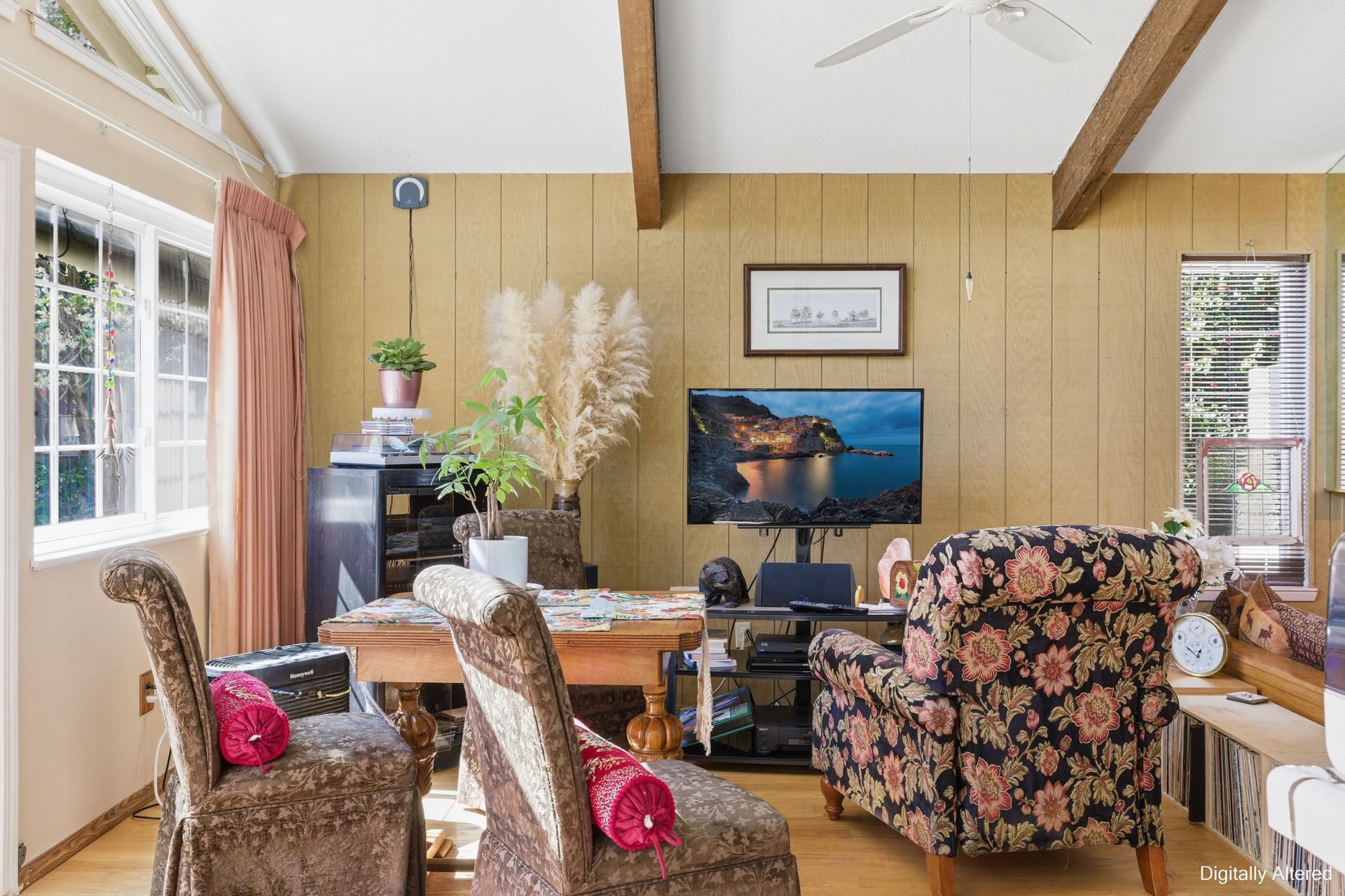 Inside, engineered hardwood floors and transom dual-pane windows that are strikingly framing serene views of trees and the sky brings the outdoors home. All the while, ceiling fans provide a gentle breeze throughout. In addition, a recessed conversation area creates an intimate gathering space centered around a cozy fireplace, with a convenient wet bar just moments away, ideal for hosting or unwinding.