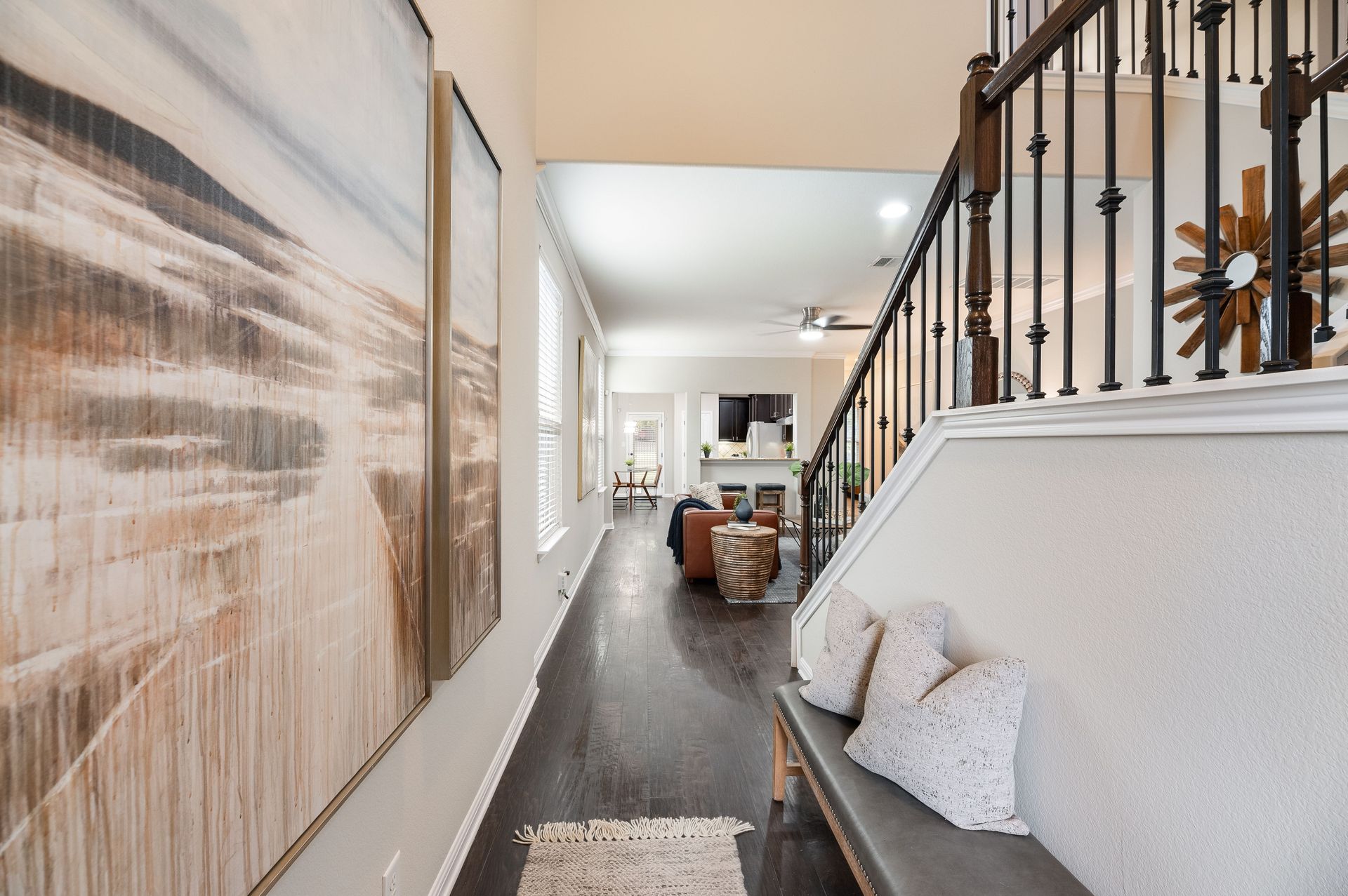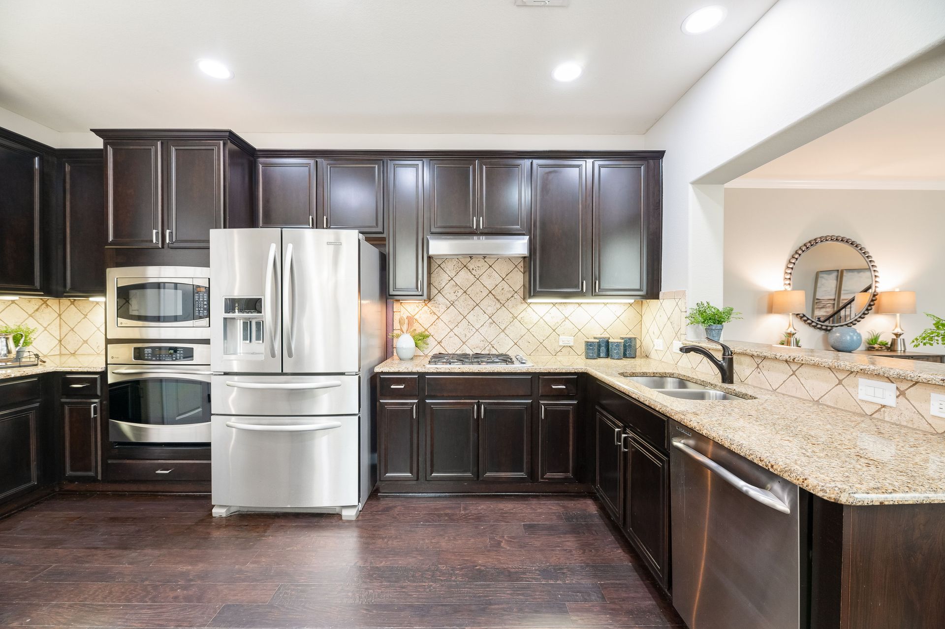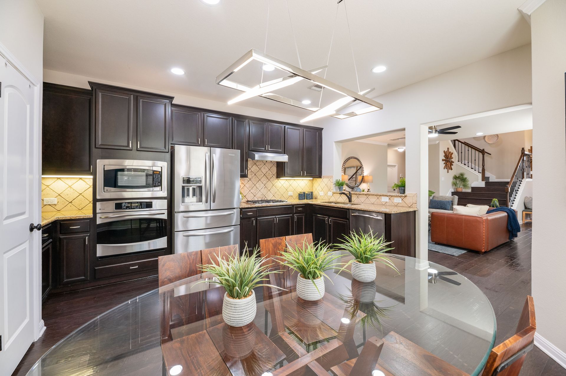 Inside, the entire interior has been freshly painted, creating a crisp, move-in-ready atmosphere that complements the home’s open floor plan. Natural light pours through energy-efficient tinted windows, while Nest thermostats add a touch of modern convenience. Rich dark mahogany wood flooring flows through the main level and stairwell, leading to a stylish eat-in kitchen complete with stainless steel appliances, granite countertops, and a refrigerator that conveys with the home. The main-level primary suite provides a true retreat, featuring an oversized walk-in closet, dual vanity, and walk-in shower. Upstairs provides three bedrooms and one bath, while a versatile flex room offers the perfect space for a home office, media lounge, or game room.