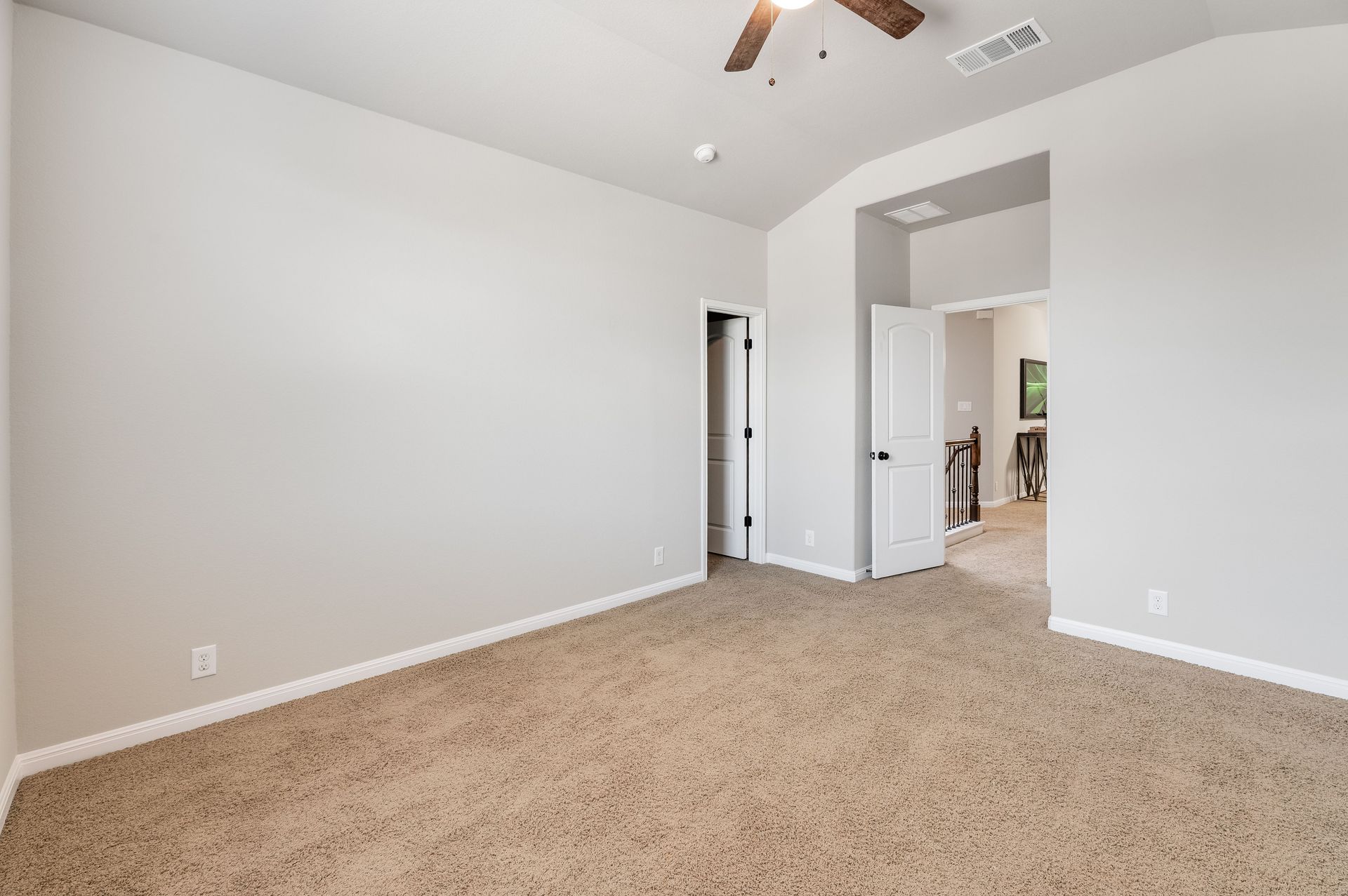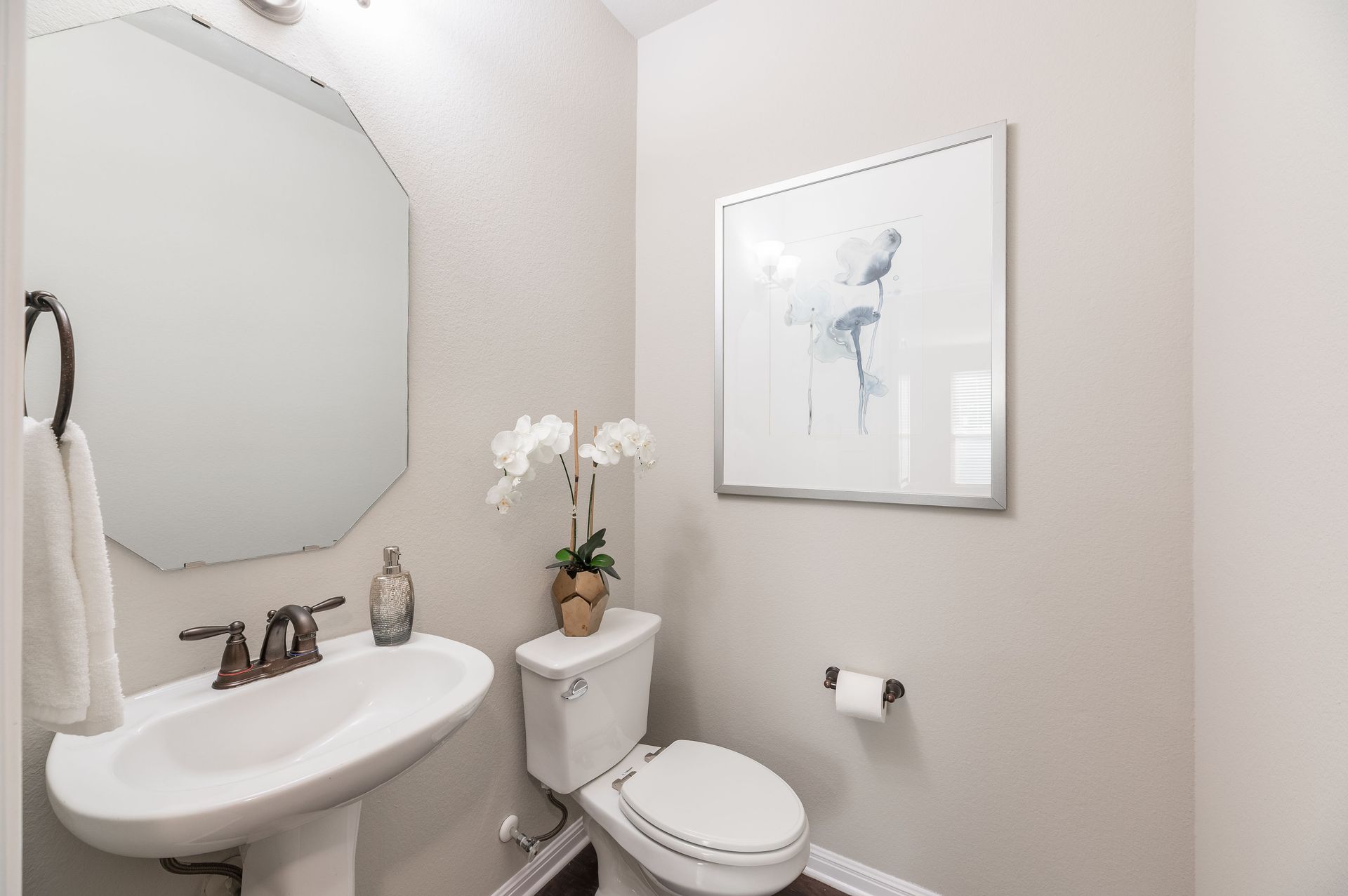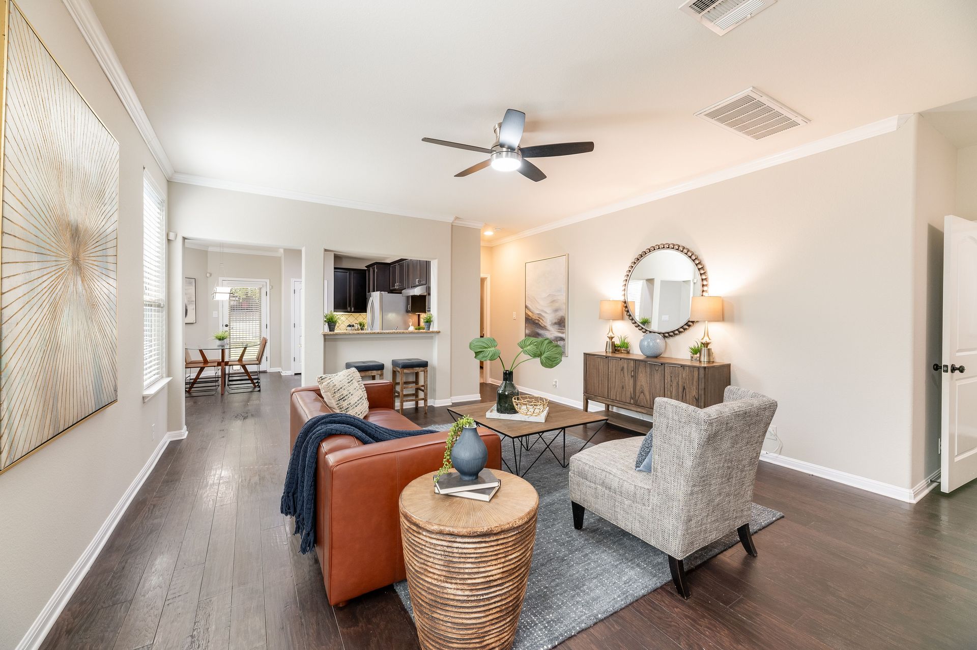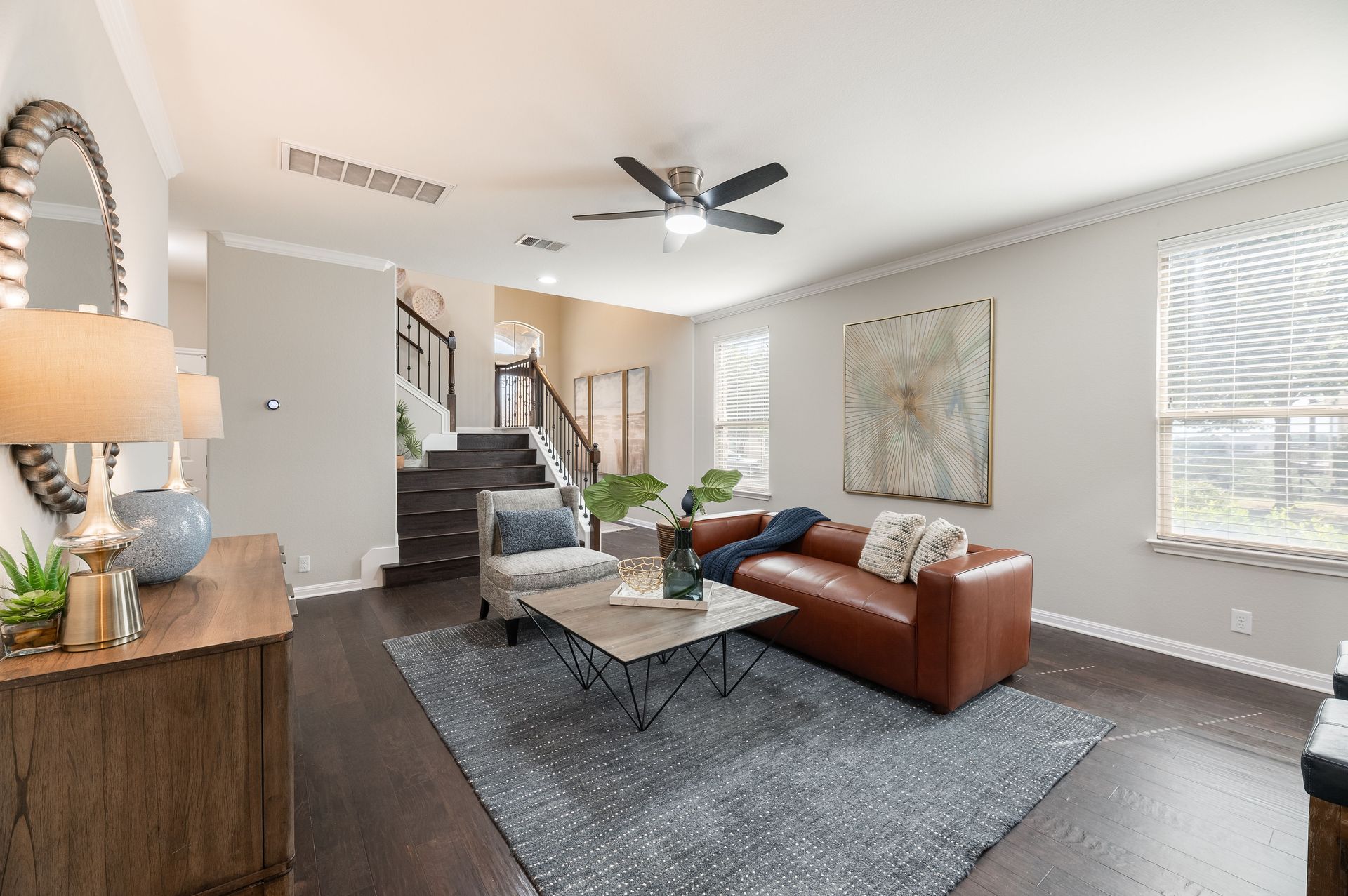 Inside, the entire interior has been freshly painted, creating a crisp, move-in-ready atmosphere that complements the home’s open floor plan. Natural light pours through energy-efficient tinted windows, while Nest thermostats add a touch of modern convenience. Rich dark mahogany wood flooring flows through the main level and stairwell, leading to a stylish eat-in kitchen complete with stainless steel appliances, granite countertops, and a refrigerator that conveys with the home. The main-level primary suite provides a true retreat, featuring an oversized walk-in closet, dual vanity, and walk-in shower. Upstairs provides three bedrooms and one bath, while a versatile flex room offers the perfect space for a home office, media lounge, or game room.