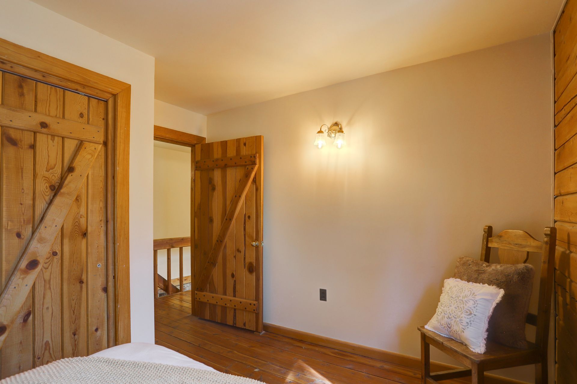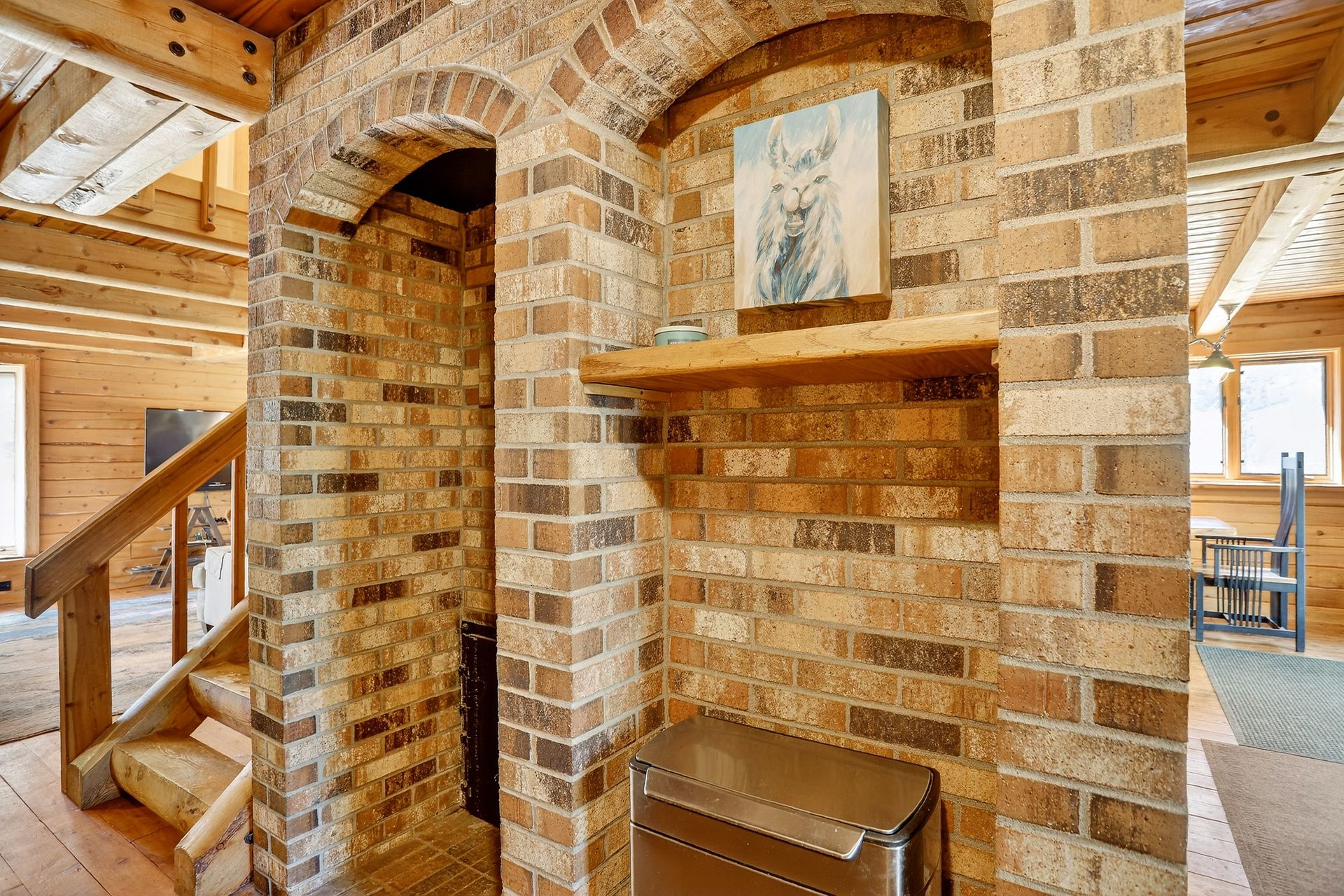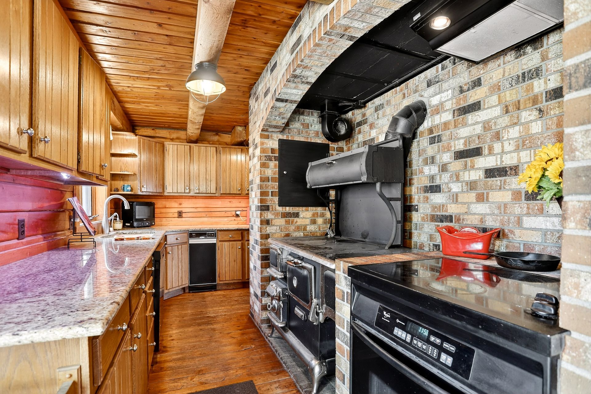 ~ The family room features window seats, wood beams, brick wall & wood stove. The adjoining dining area with French doors leading to the private yard. Charming kitchen with vintage wood cooking stove & brick walls. The upper-level features primary en-suite, 2 beds & full bath.