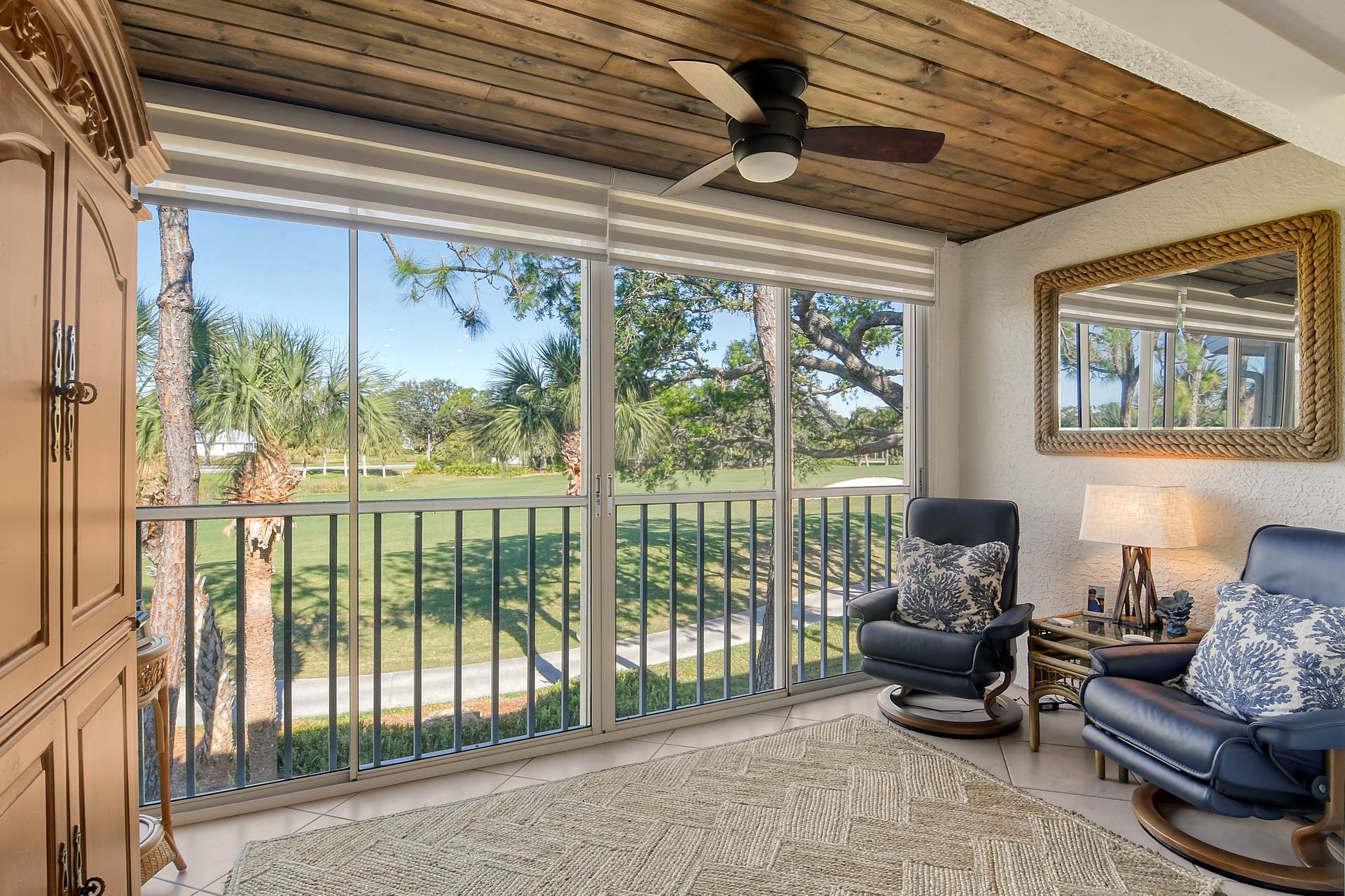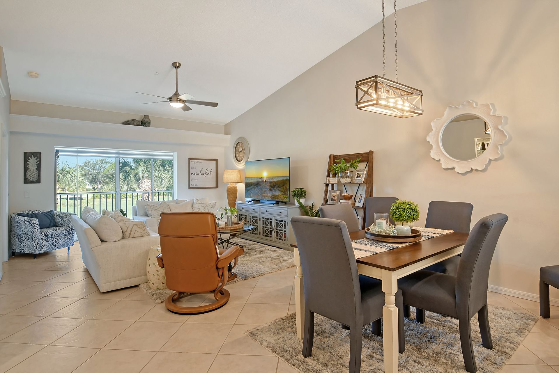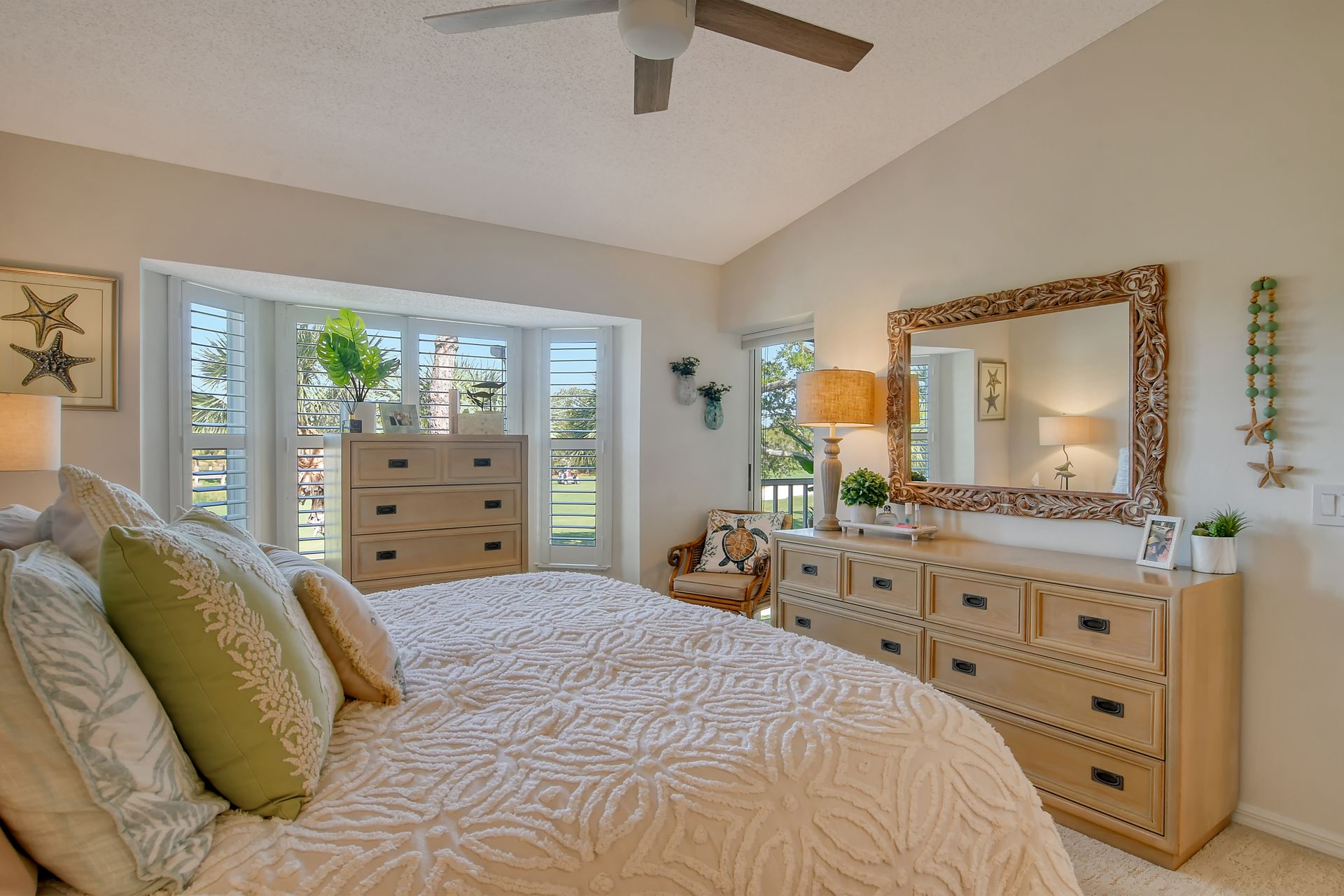 This two-bedroom, two-bathroom condo offers approximately 1,333 square feet of living space. The property features beautiful golf views and is located on the second floor within a golf community. The interior boasts cathedral ceilings, updated bathrooms, and a new roof. Residents can enjoy access to community amenities, including golf, pool, tennis courts, and pickleball court. The open floor plan creates a seamless flow between the living room and dining room. Tile floors and new carpet throughout provide a warm and inviting atmosphere. The primary bedroom includes two walk-in closets and an updated primary bathroom that features a modern shower stall. The second bedroom is well-sized, and the guest bathroom has also been recently updated. New roof is paid for and currently being installed, March 2025. The home's two lanais offer the ideal space for indoor-outdoor living, with a screened-in area and glassed-in area with stunning sunset views. The detached one-car garage provides convenient access. This condo includes a laundry room. The property is located just a short distance from the Legacy Trail, as well as the beaches, downtown Sarasota, and downtown Venice. Residents of this maintenance-free golf community can take advantage of the updated golf course, fitness center, and other resort-style amenities. Additional features include new lighting, updated window treatments, a high-tech thermostat, and solid surface countertops in the eat-in kitchen. This home is ideal for those seeking the perfect balance of comfort, convenience, and Florida living.