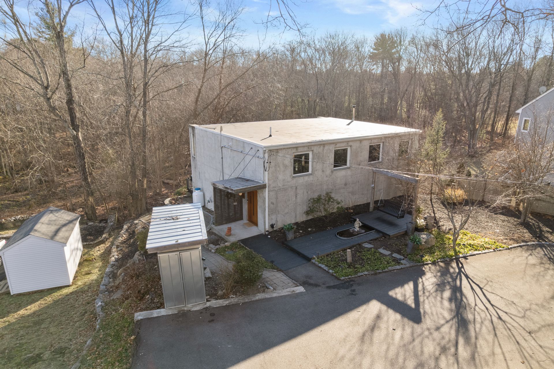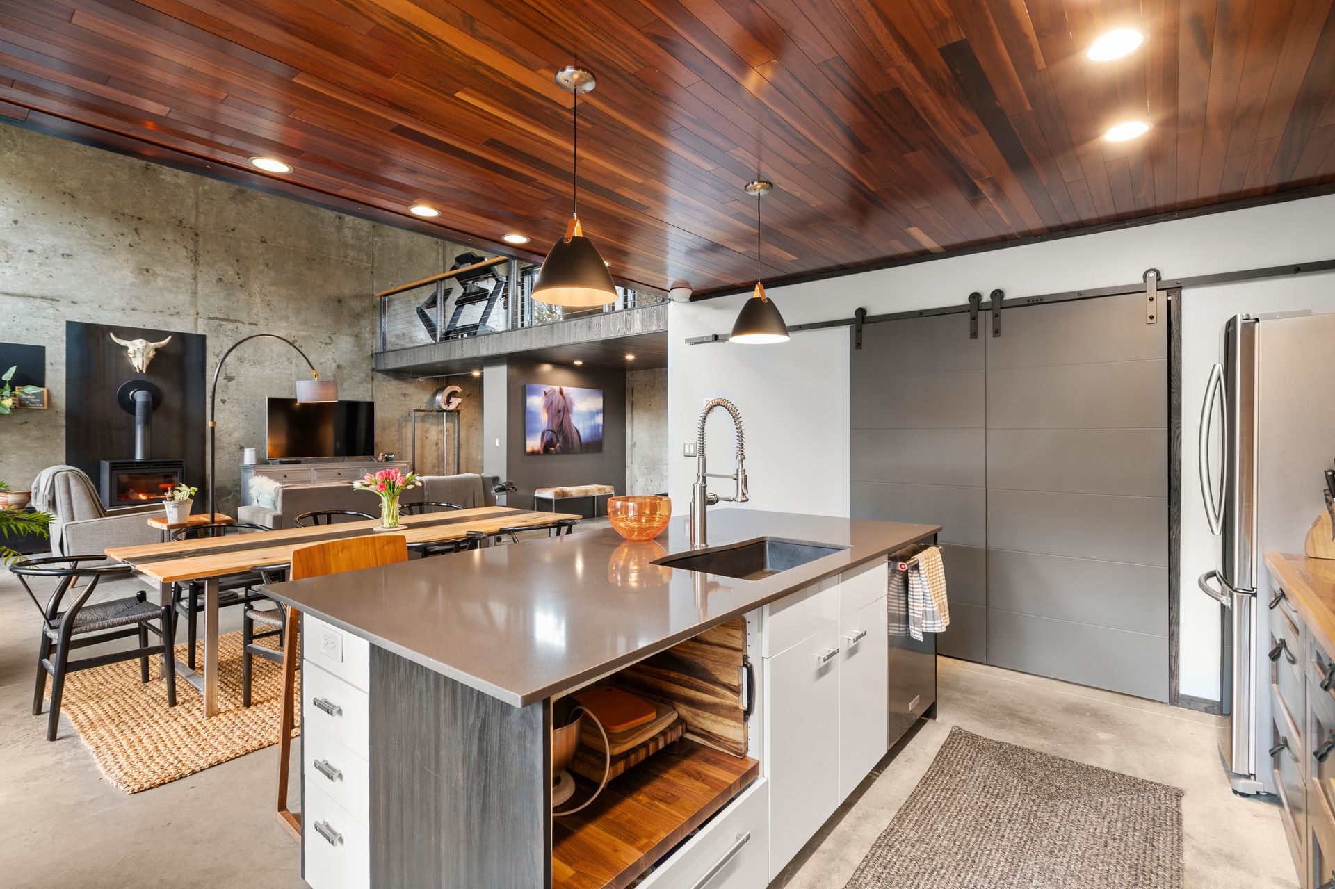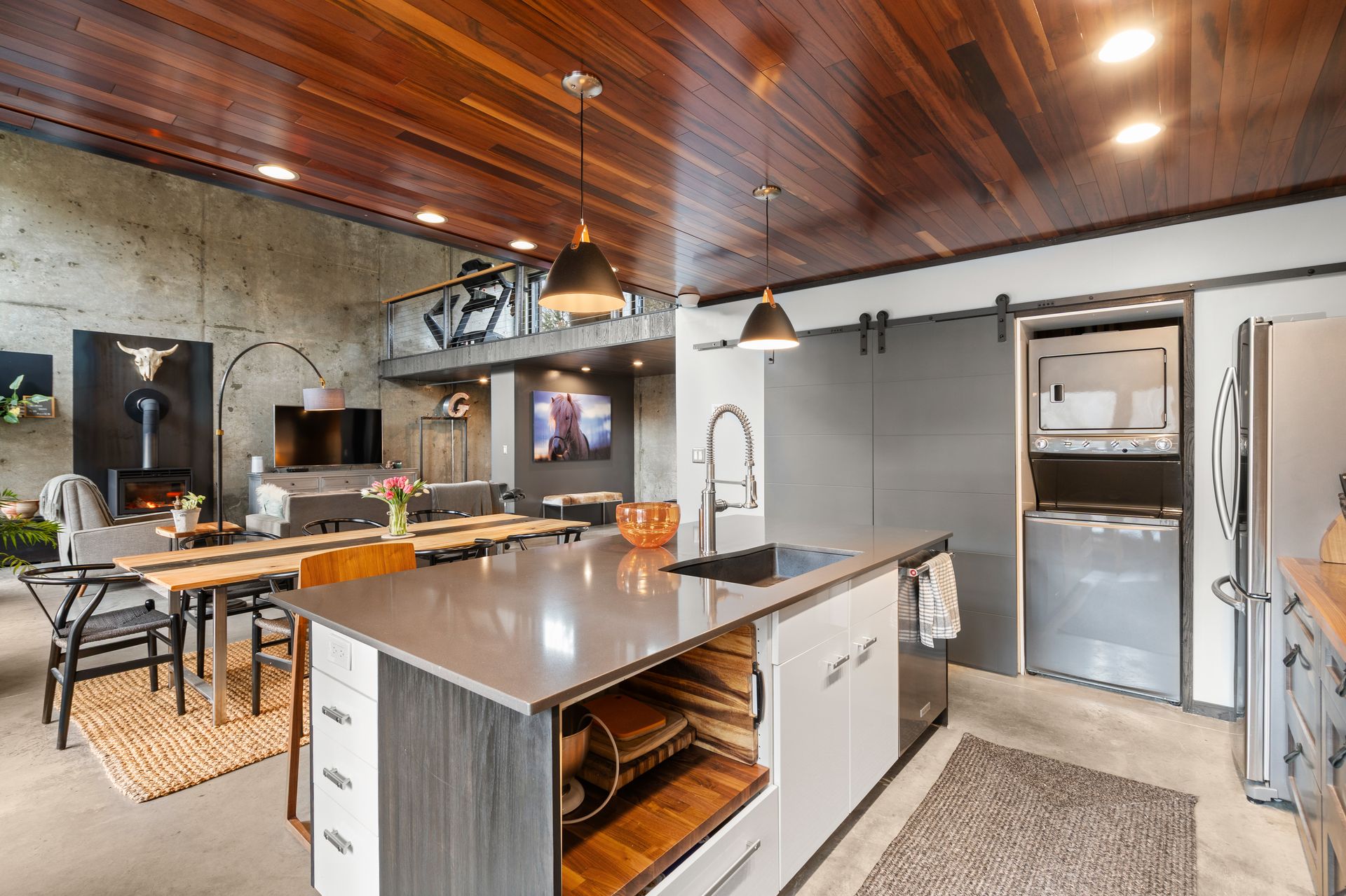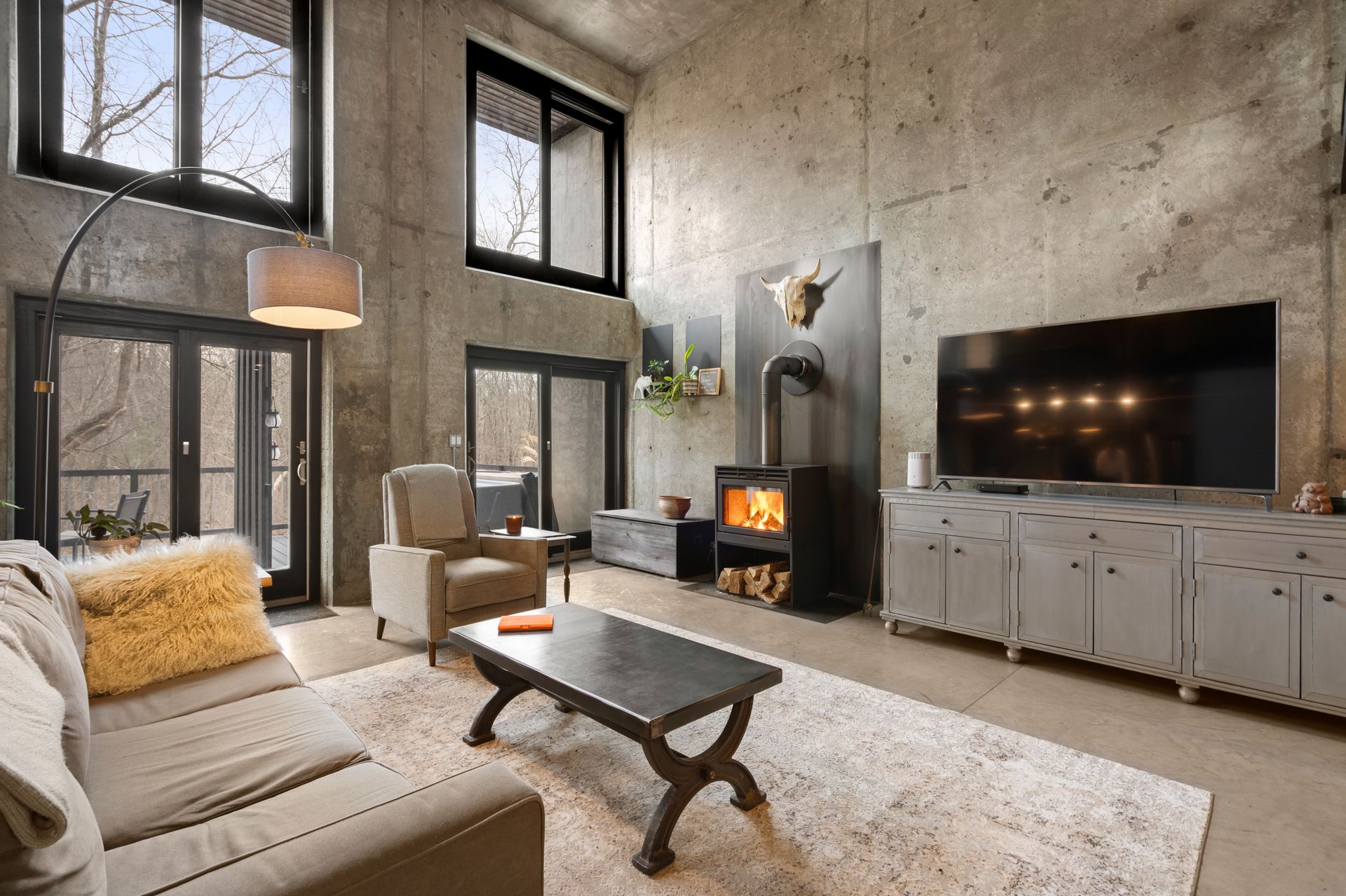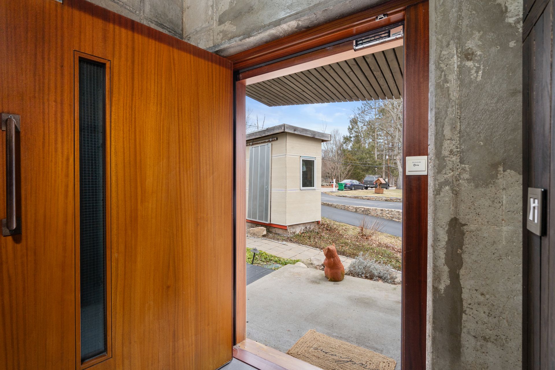 Designed in collaboration with architect Michael Kim, the home is also a true passive‑solar residence. Thermomass‑insulated concrete walls create a durable, minimalist aesthetic while acting as a natural thermal mass, maintaining consistent temperatures year‑round. South‑facing orientation, strategic window placement, and seasonal exterior shading maximize winter sun and moderate summer heat, delivering exceptional energy efficiency.