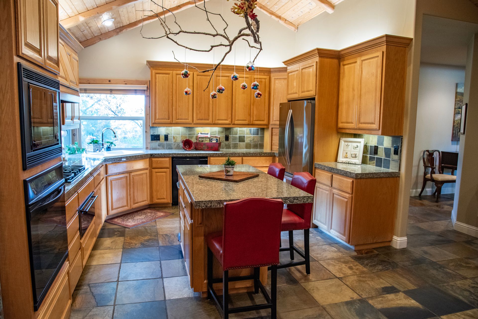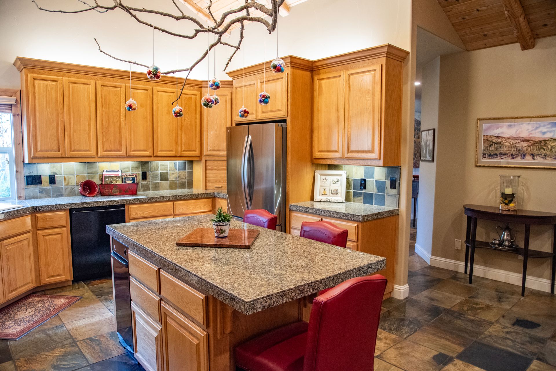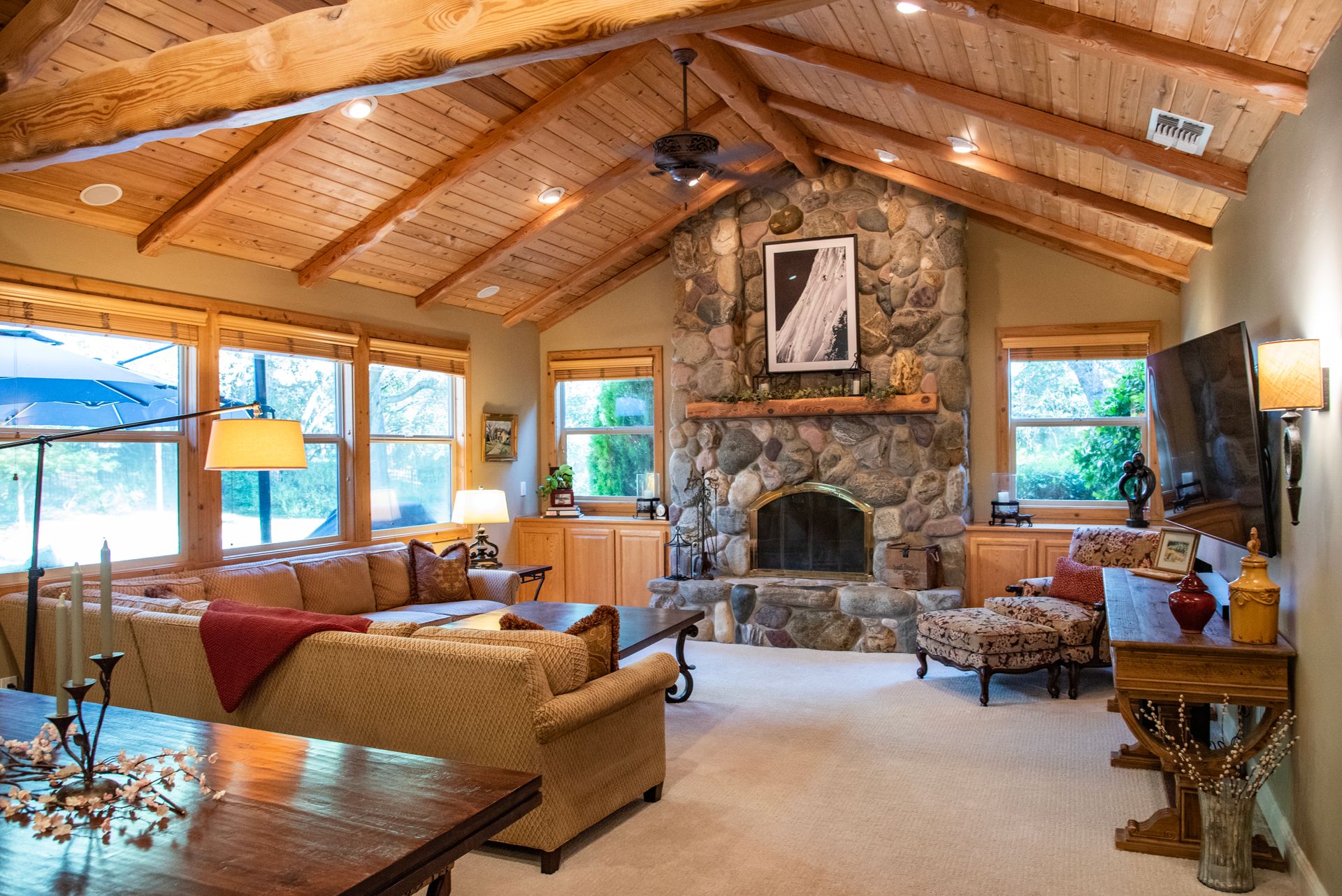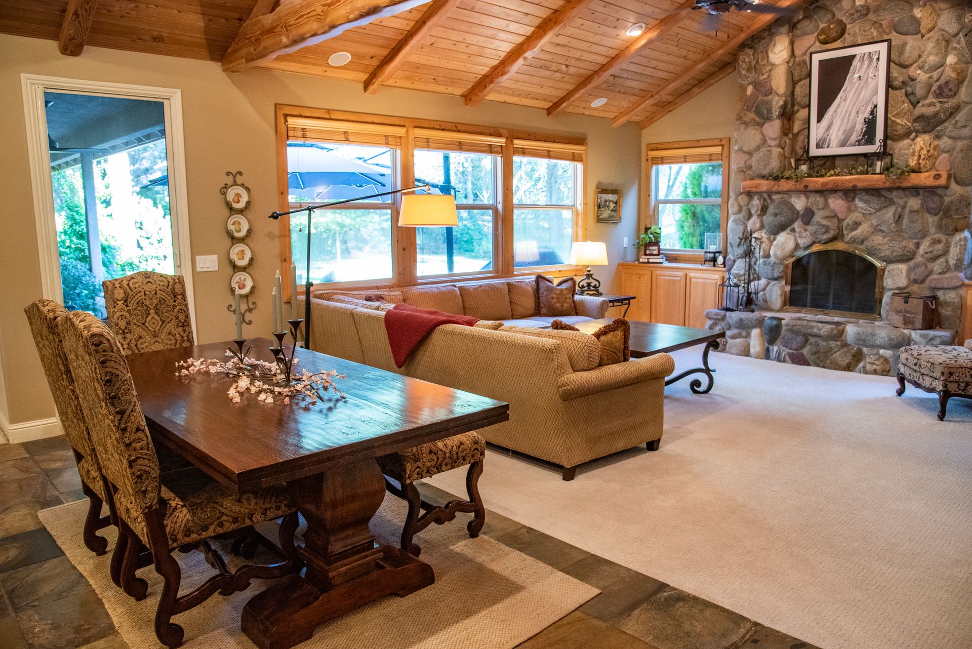 This approximately 4,589 square foot home boasts five bedrooms and five bathrooms, offering ample space and versatility. The home's rustic charm is evident in the vaulted ceilings and cozy fireplace, while the spacious kitchen features abundant cabinetry and slate tile flooring, providing a functional and inviting cooking space.