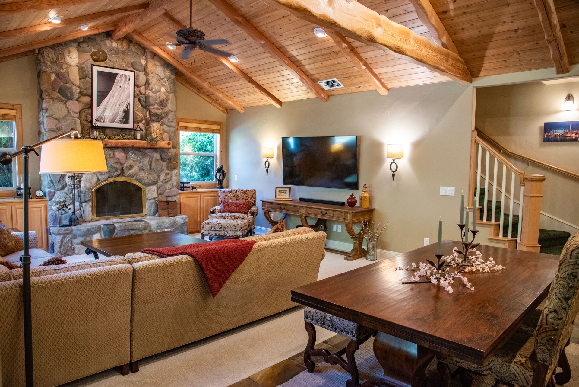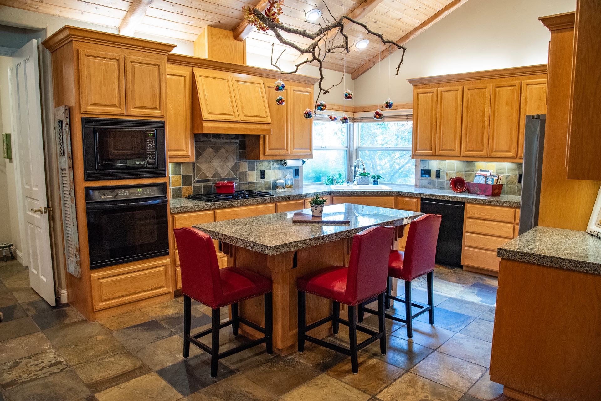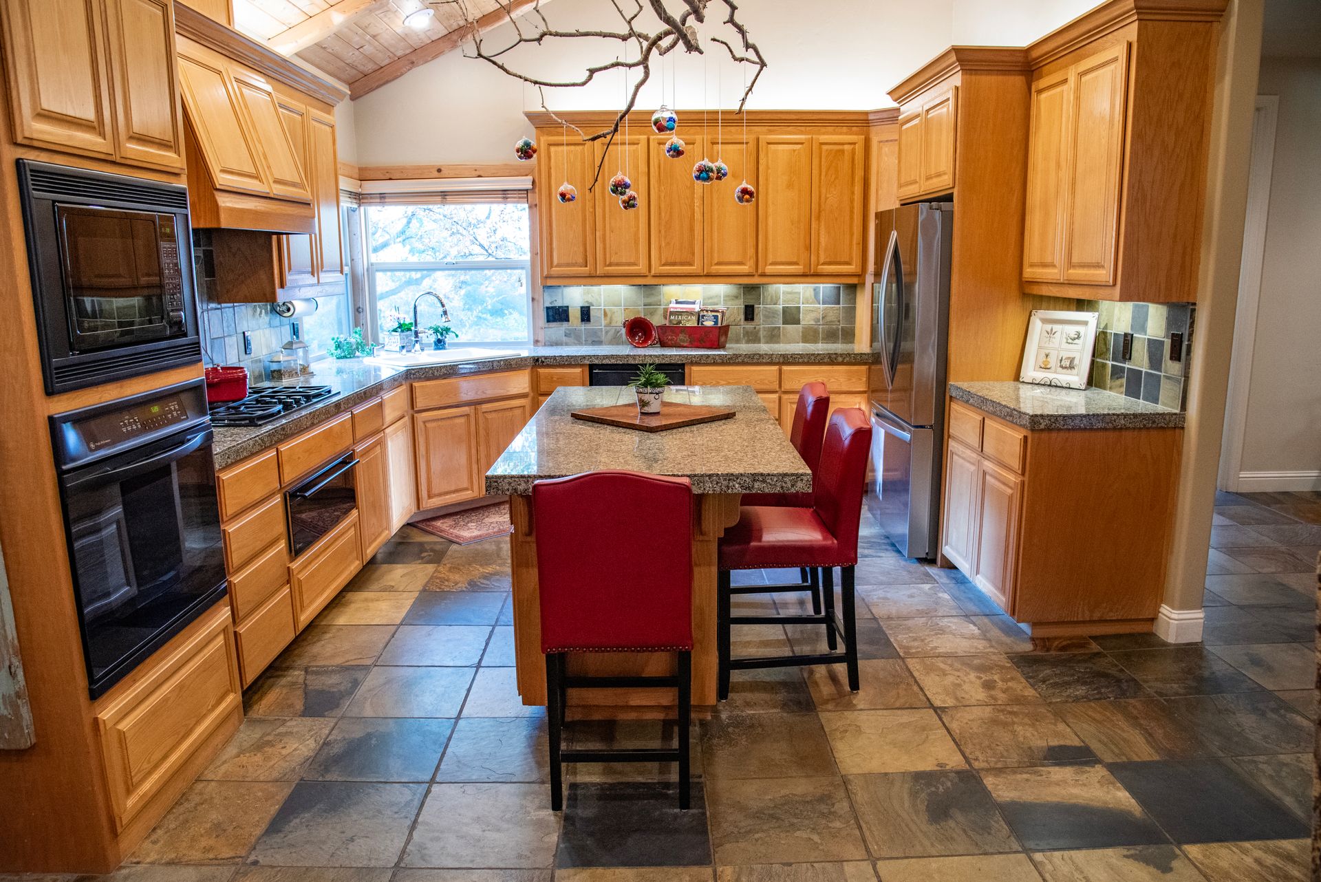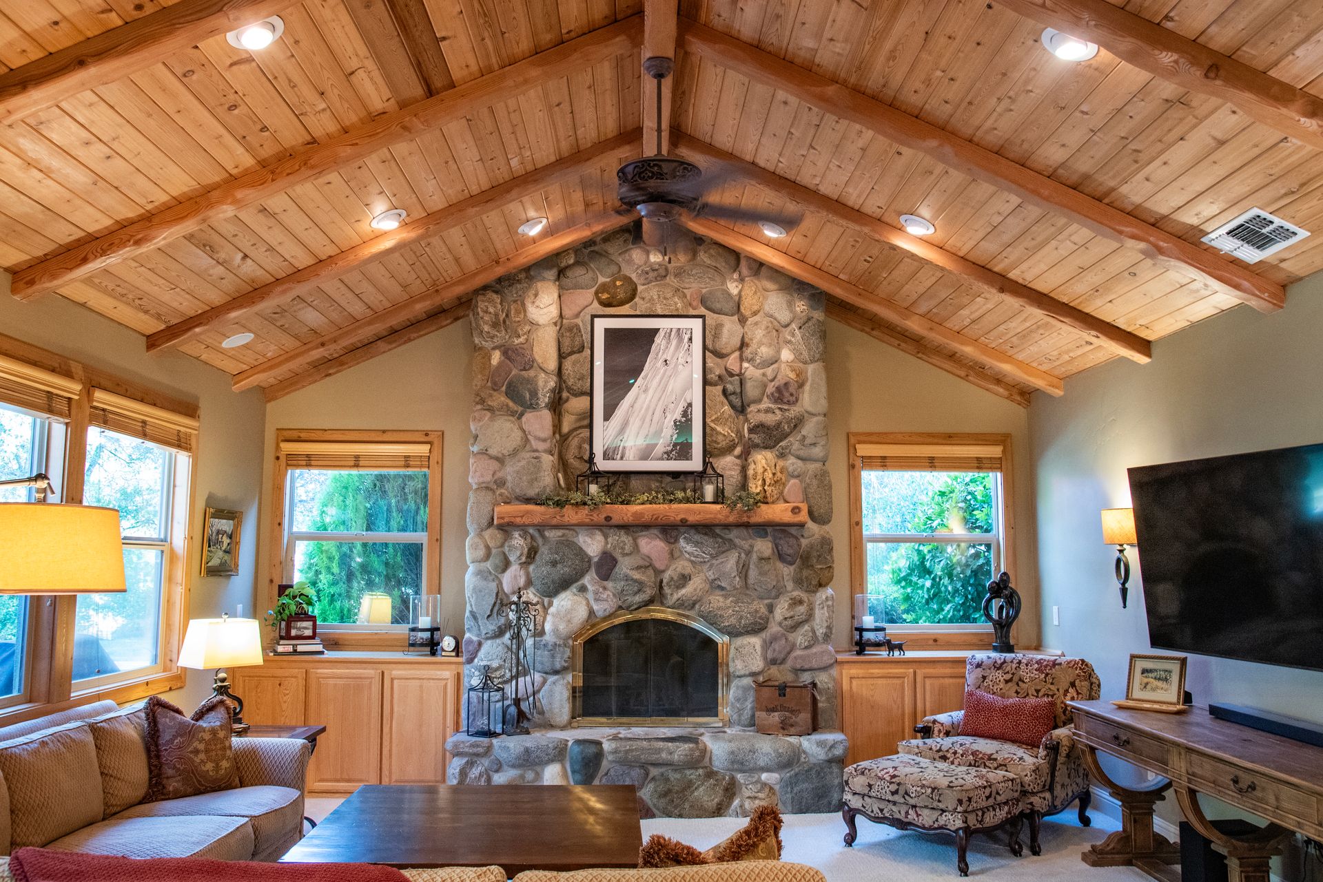 This approximately 4,589 square foot home boasts five bedrooms and five bathrooms, offering ample space and versatility. The home's rustic charm is evident in the vaulted ceilings and cozy fireplace, while the spacious kitchen features abundant cabinetry and slate tile flooring, providing a functional and inviting cooking space.