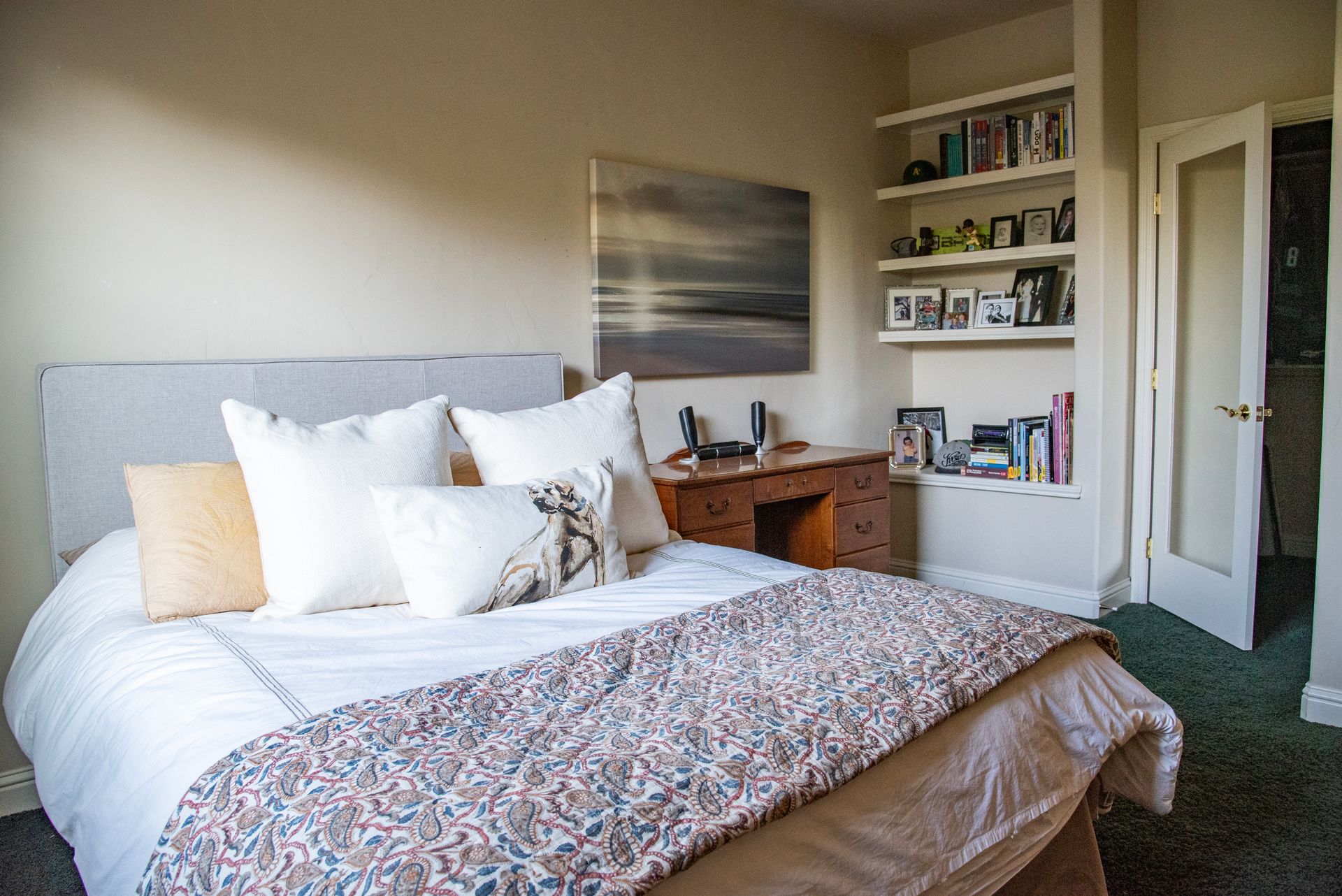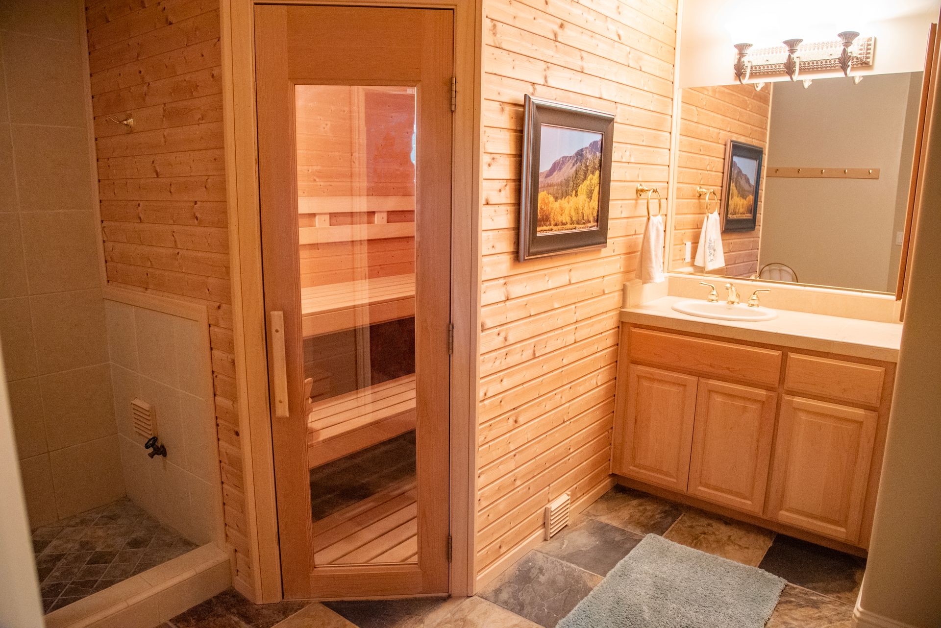 The lower level offers a complete suite with living area, kitchenette, bedroom, and bath with a full-sized sauna.