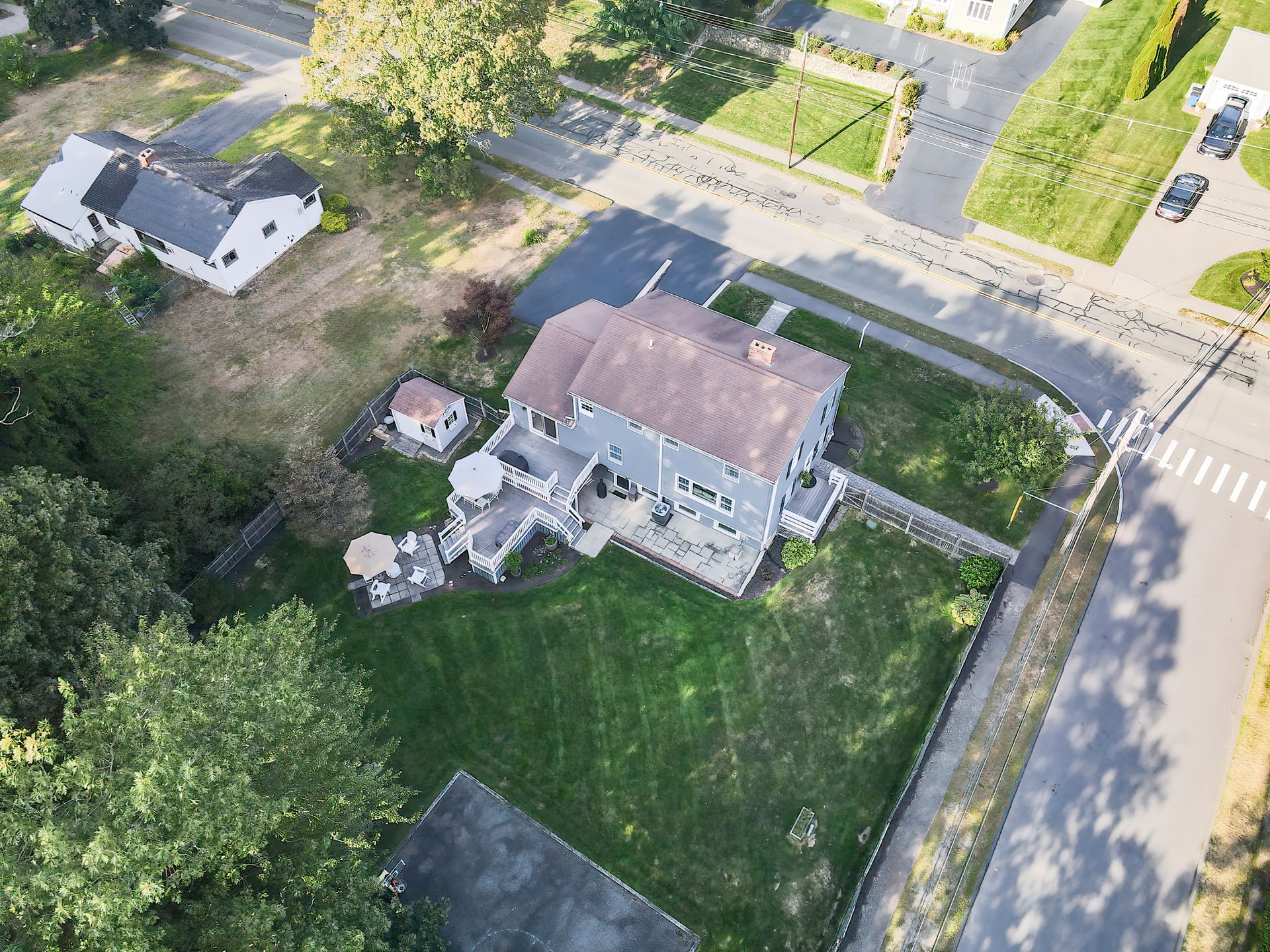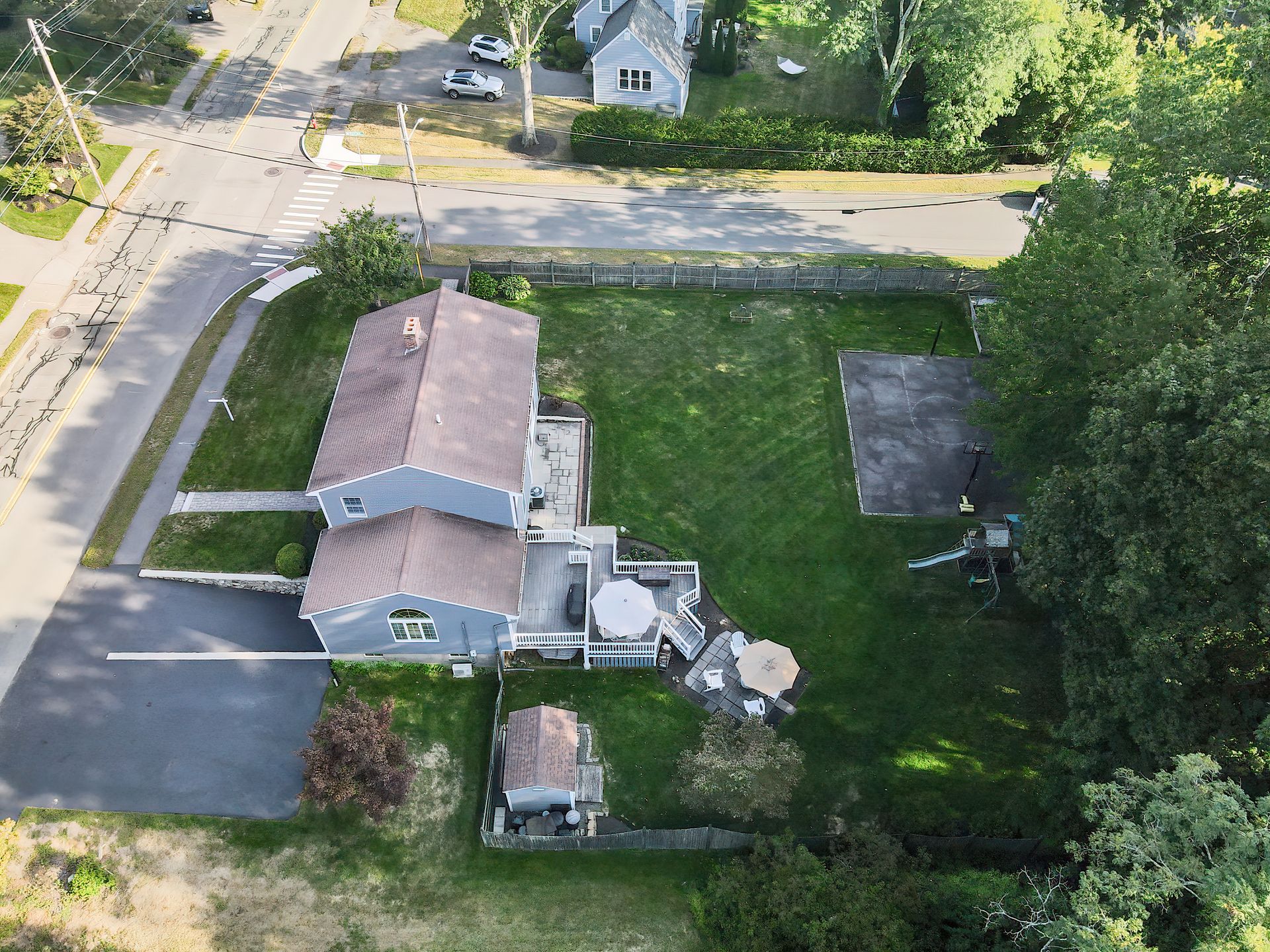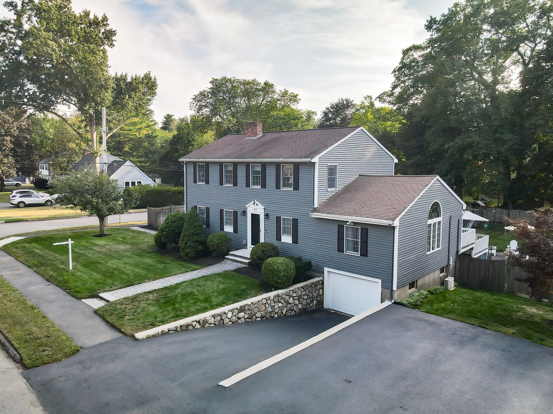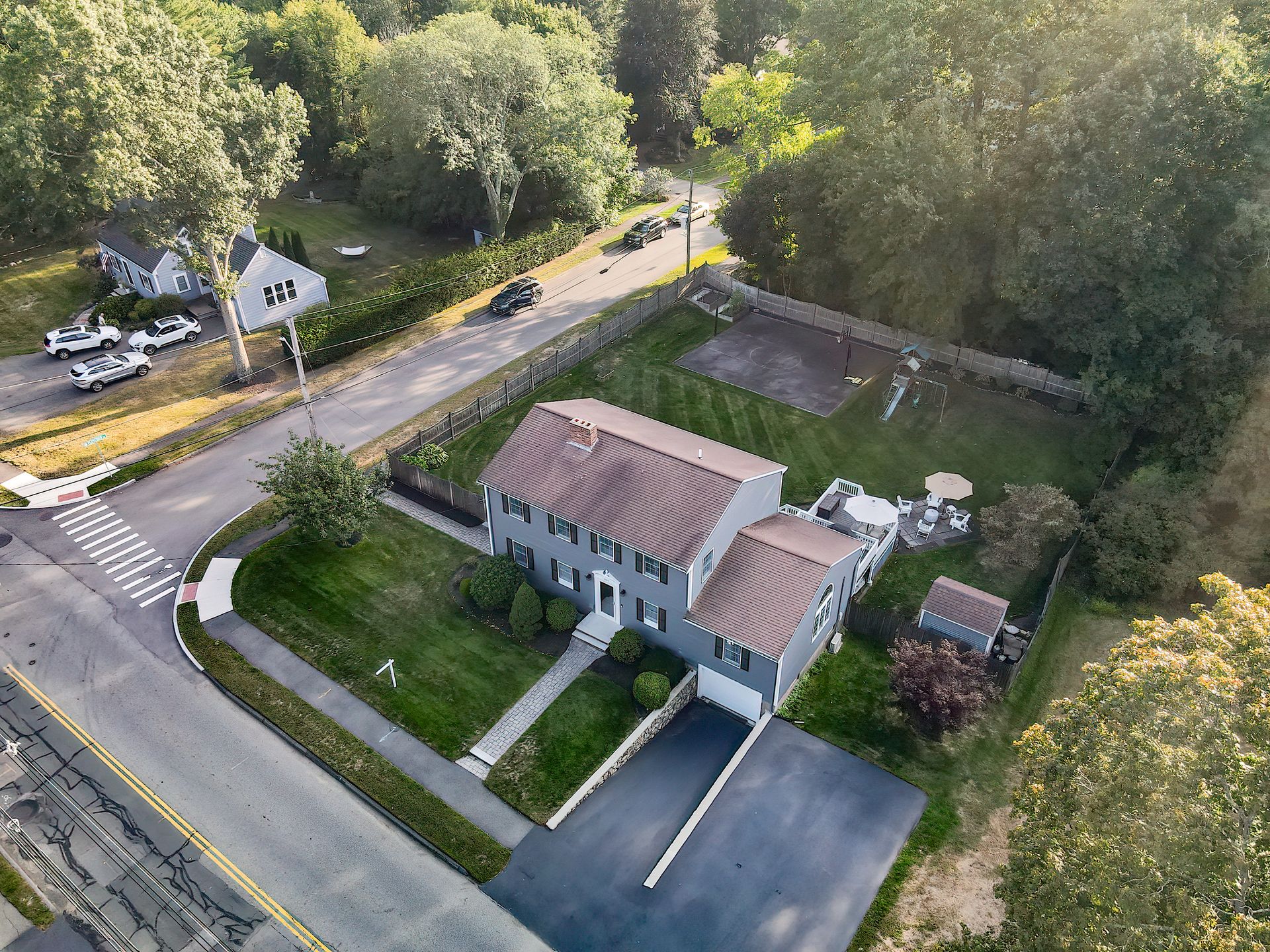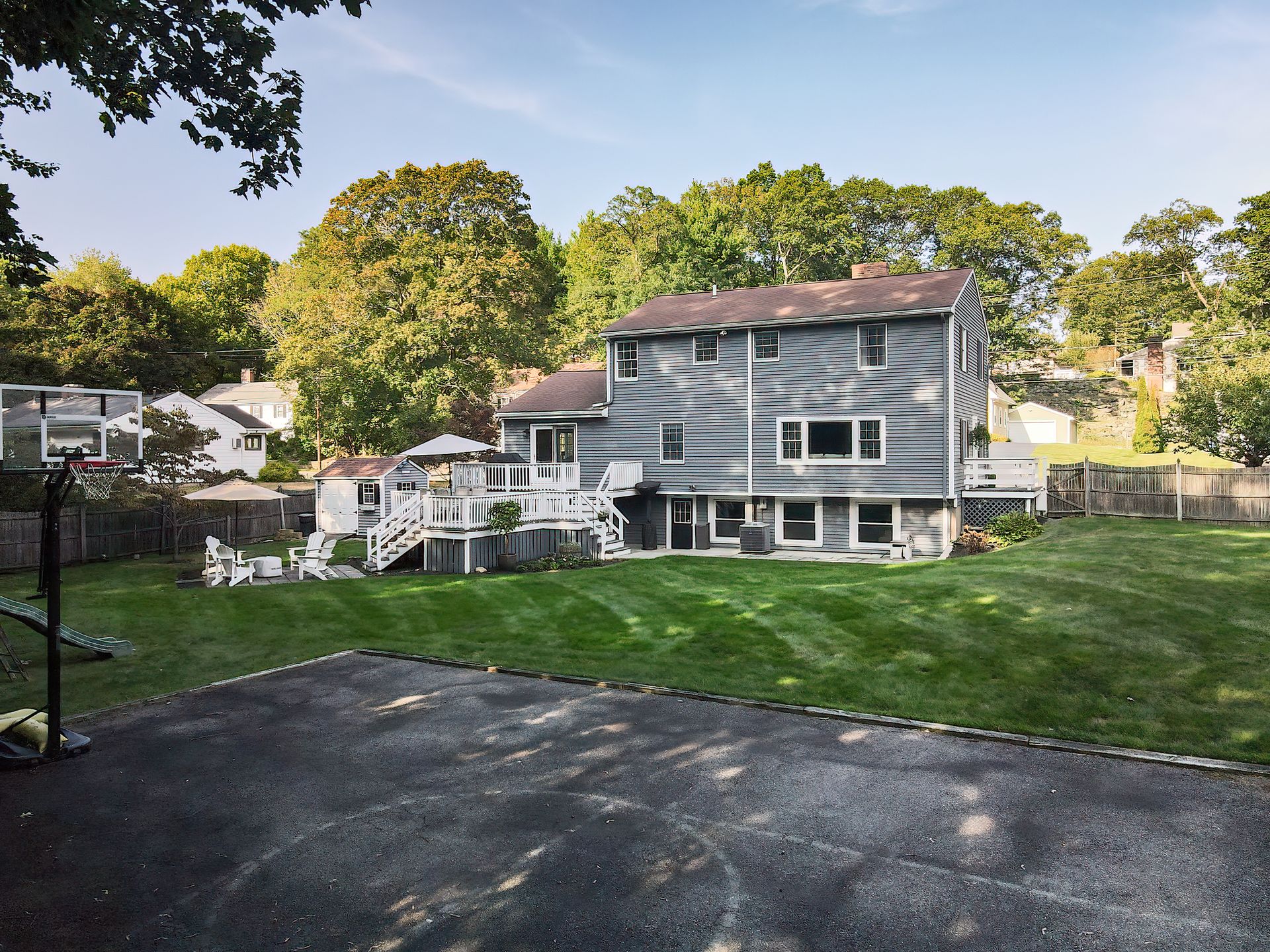 Nestled on a spacious corner lot, this charming three-bedroom Colonial offers an exceptional blend of classic design and modern amenities. The fully fenced yard is a private retreat featuring a deck, patio, shed and sport court—perfect for outdoor entertaining and recreation. Inside, the first floor boasts a well-appointed kitchen with gas cooking, granite countertops and an inviting eat-in area. The fireplaced living room flows seamlessly into the dining area, while a large vaulted-ceiling family room with sliders opens directly to the deck and yard, creating a bright and airy gathering space. A convenient half bath with laundry completes the main level. Upstairs, you'll find three generously sized bedrooms and a full bath with double sinks and a shower/tub combo. The spacious primary suite includes an ensuite bathroom and a sunlit walk-in closet with windows. The finished lower level offers versatile space ideal for a playroom, home office, or media room, with walkout access to the patio and yard, an additional half bath and a one-car garage. This home combines timeless appeal with thoughtful updates—ready to welcome its next owner.