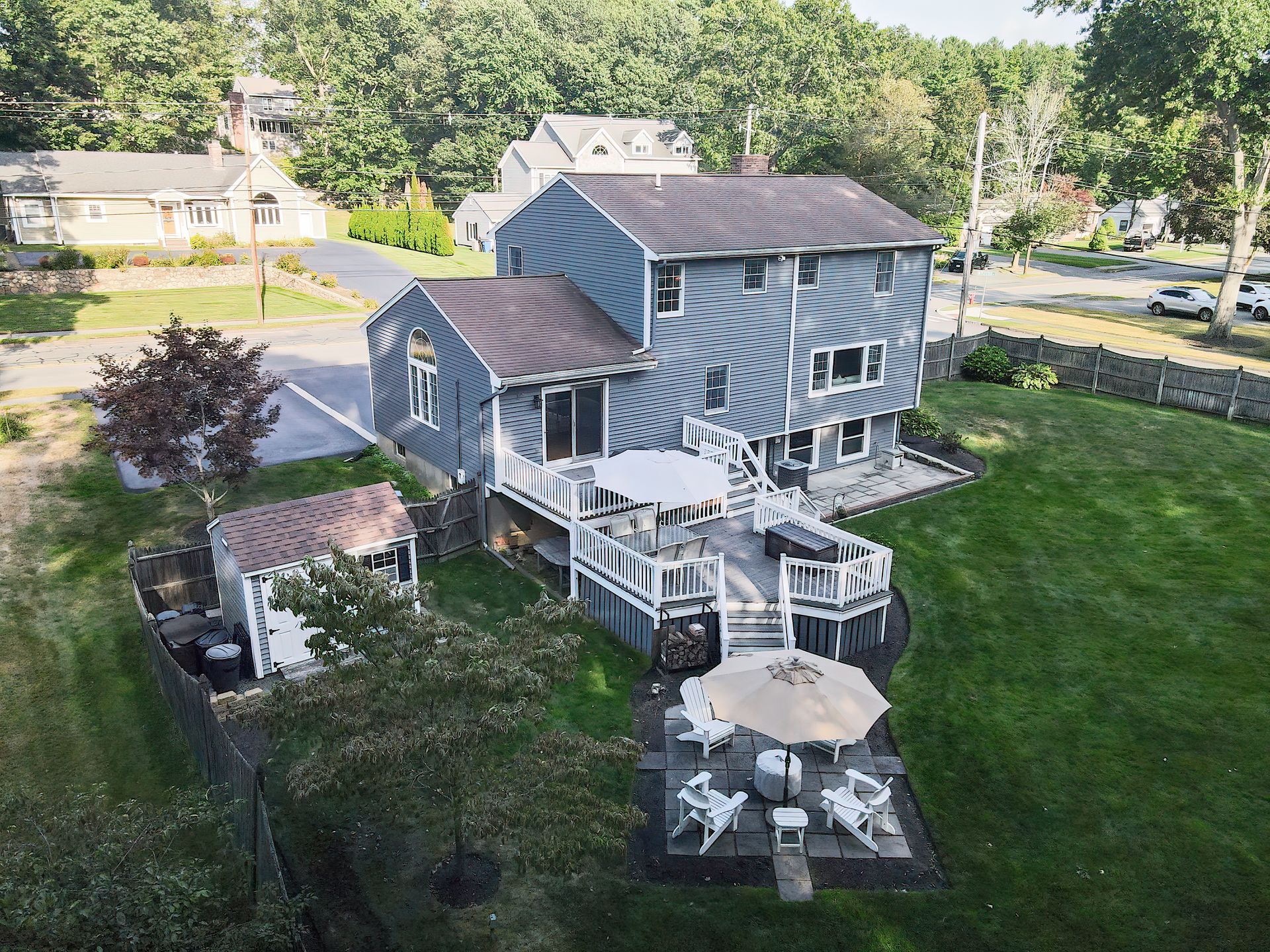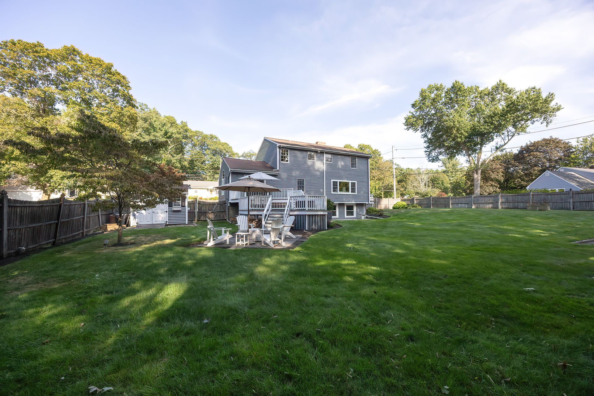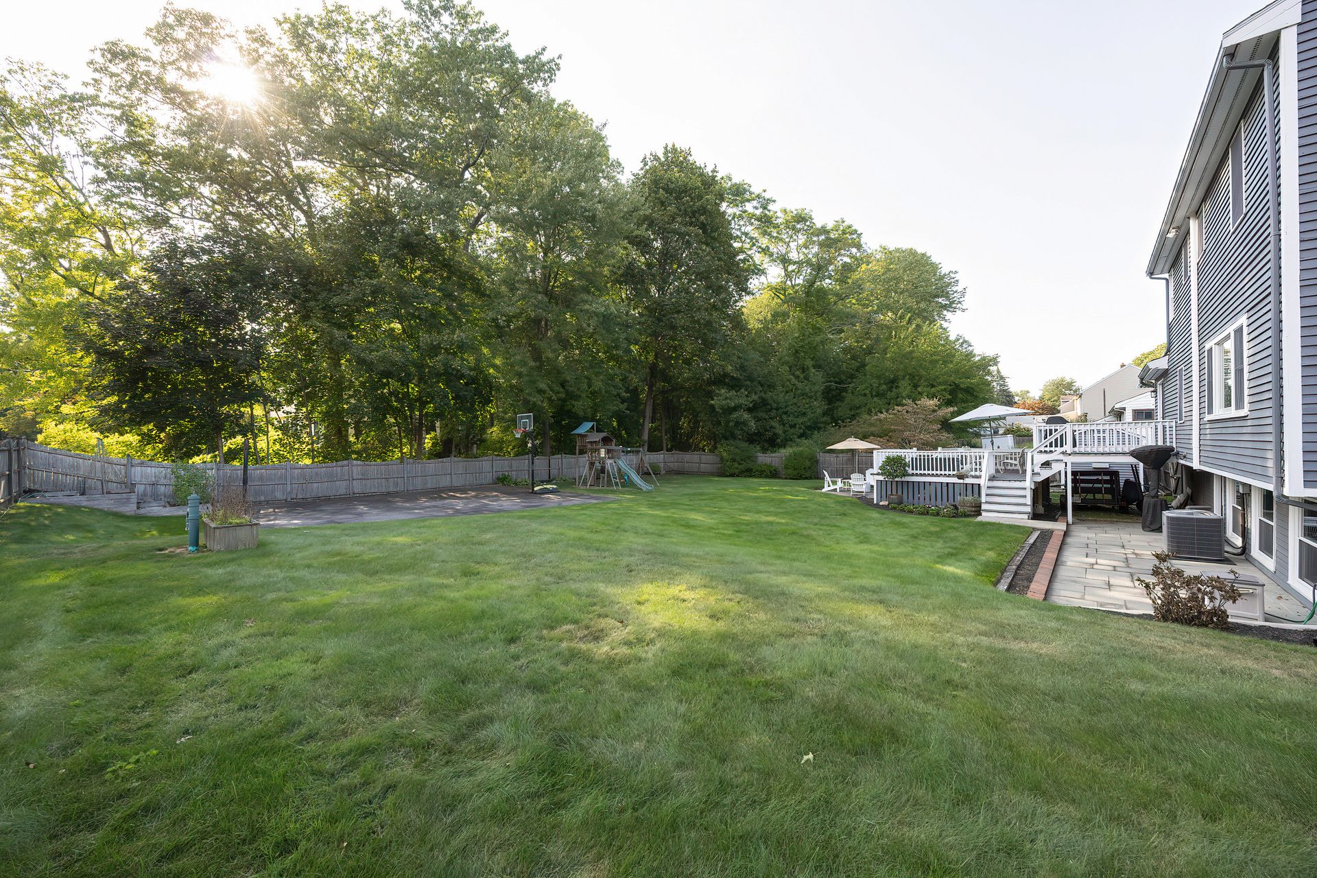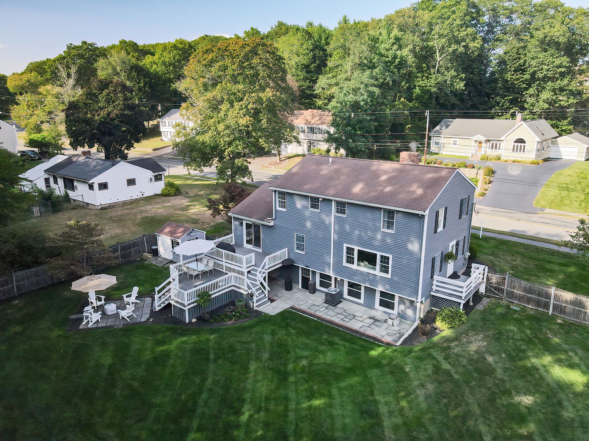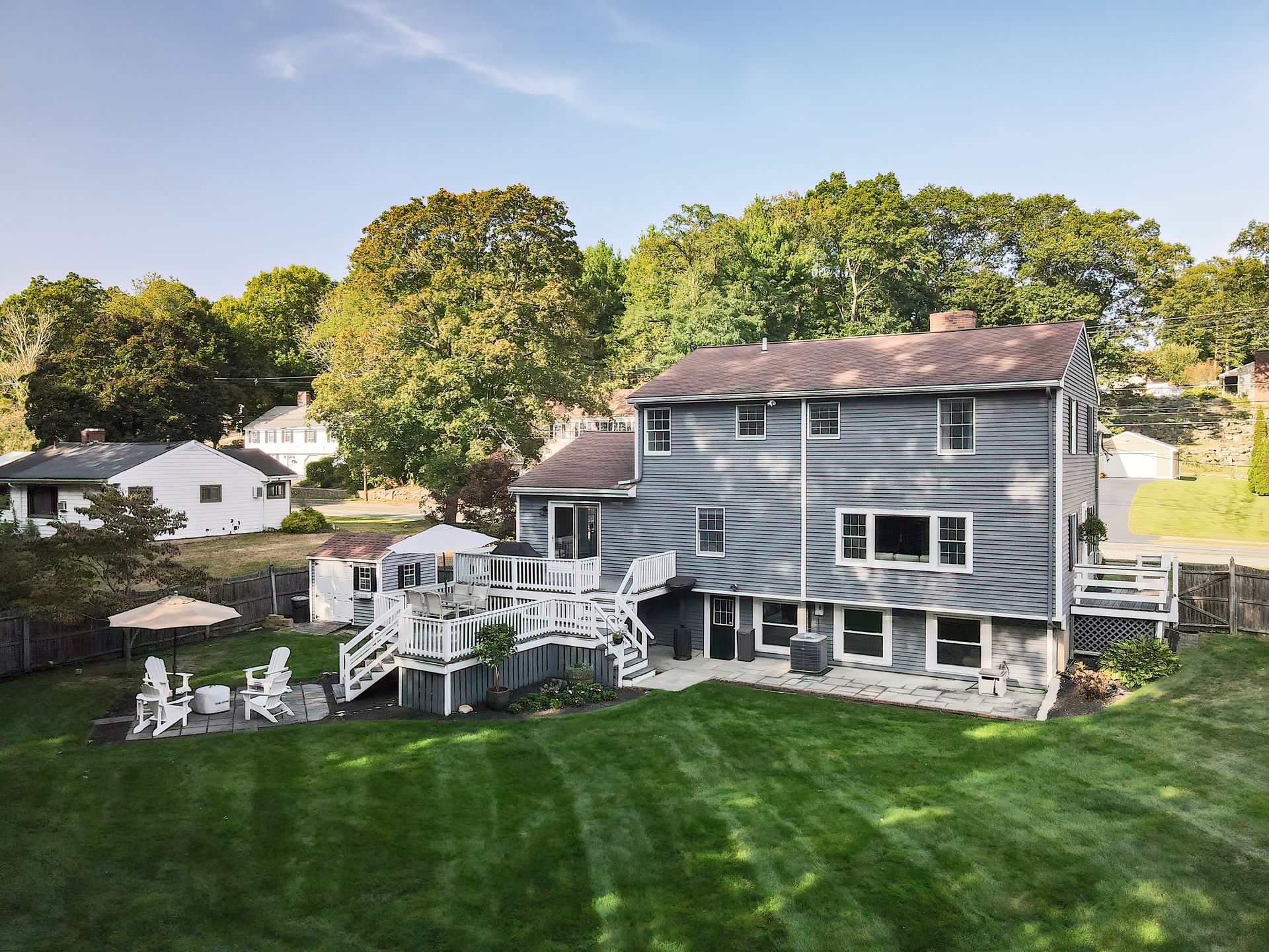 Nestled on a spacious corner lot, this charming three-bedroom Colonial offers an exceptional blend of classic design and modern amenities. The fully fenced yard is a private retreat featuring a deck, patio, shed and sport court—perfect for outdoor entertaining and recreation. Inside, the first floor boasts a well-appointed kitchen with gas cooking, granite countertops and an inviting eat-in area. The fireplaced living room flows seamlessly into the dining area, while a large vaulted-ceiling family room with sliders opens directly to the deck and yard, creating a bright and airy gathering space. A convenient half bath with laundry completes the main level. Upstairs, you'll find three generously sized bedrooms and a full bath with double sinks and a shower/tub combo. The spacious primary suite includes an ensuite bathroom and a sunlit walk-in closet with windows. The finished lower level offers versatile space ideal for a playroom, home office, or media room, with walkout access to the patio and yard, an additional half bath and a one-car garage. This home combines timeless appeal with thoughtful updates—ready to welcome its next owner.