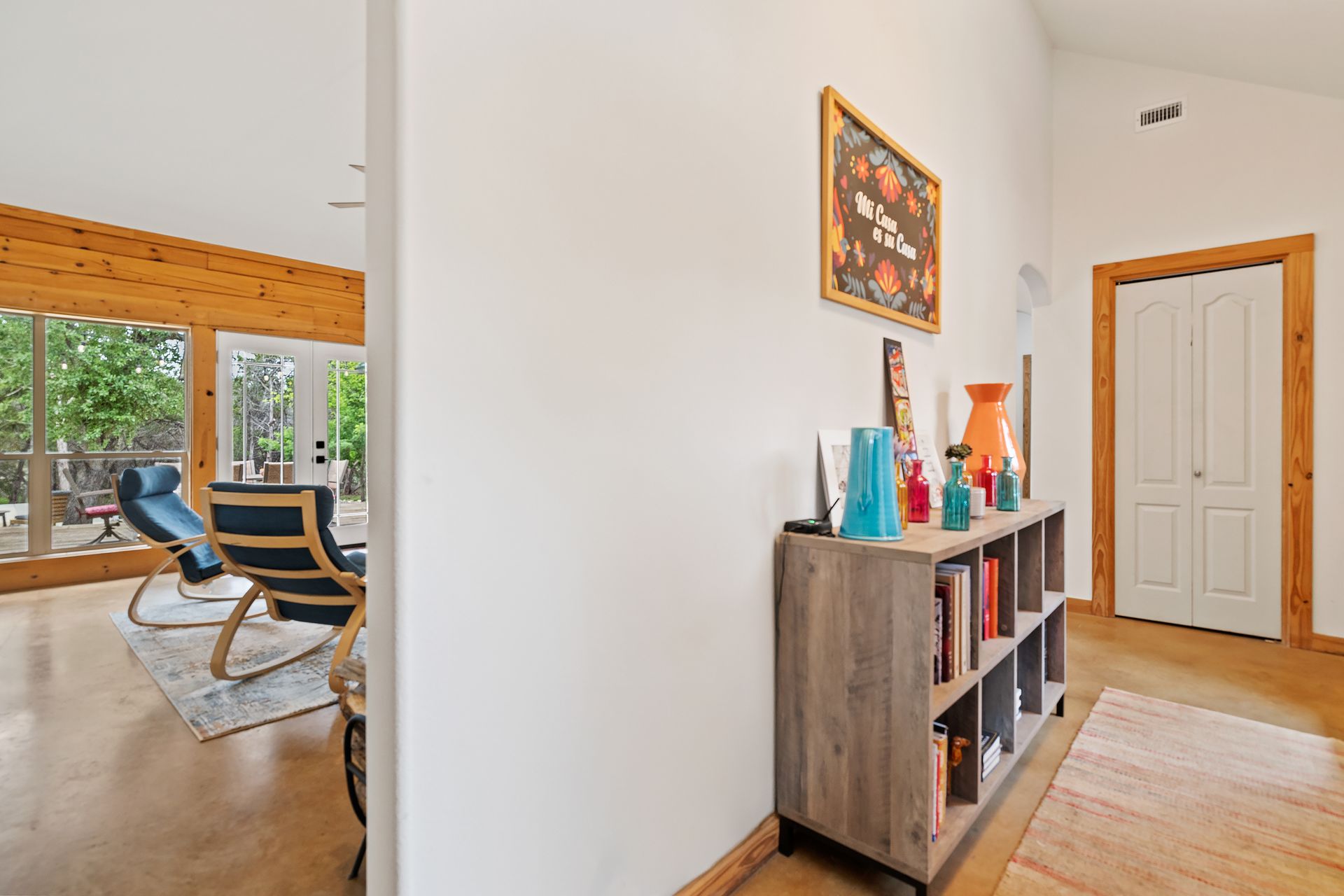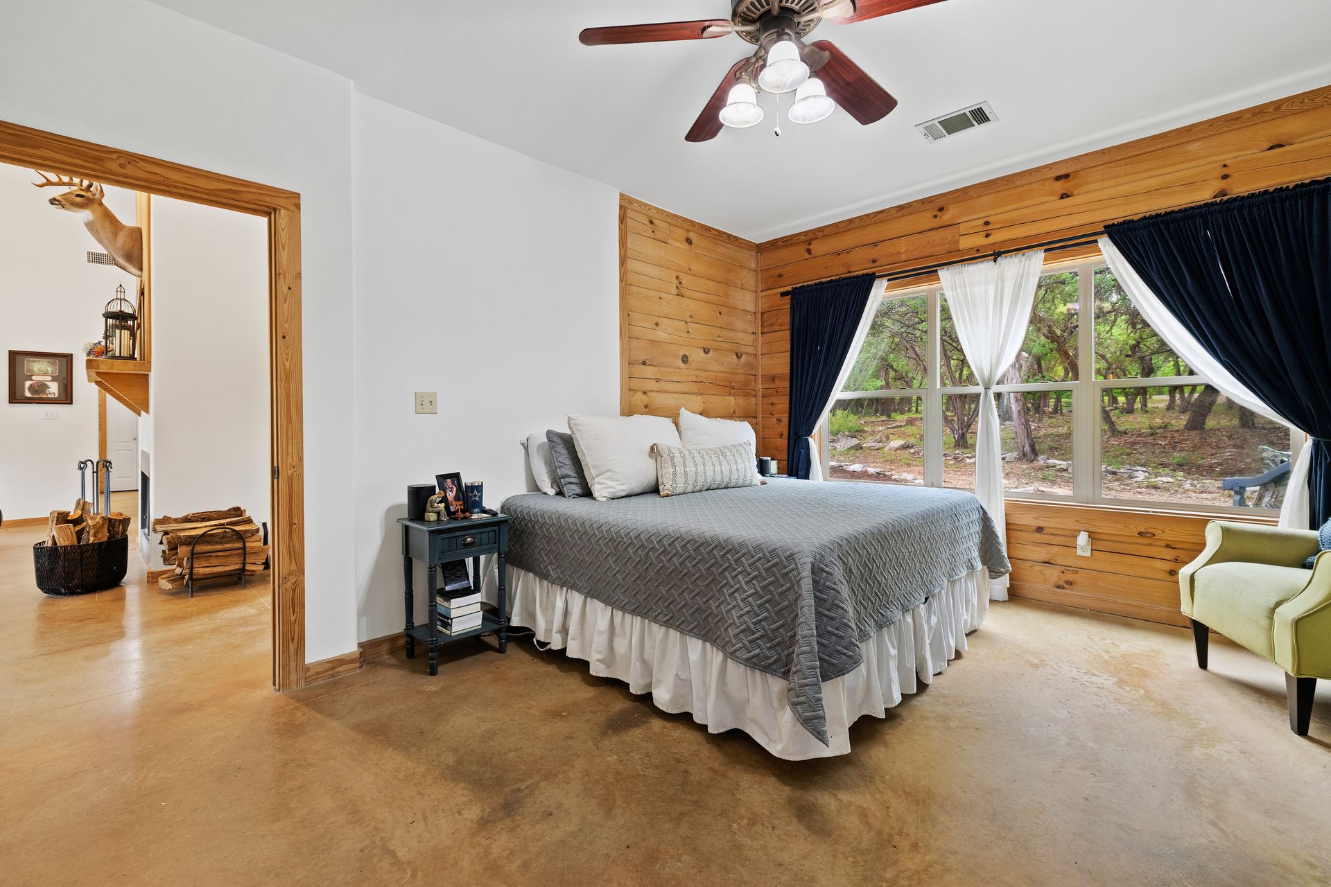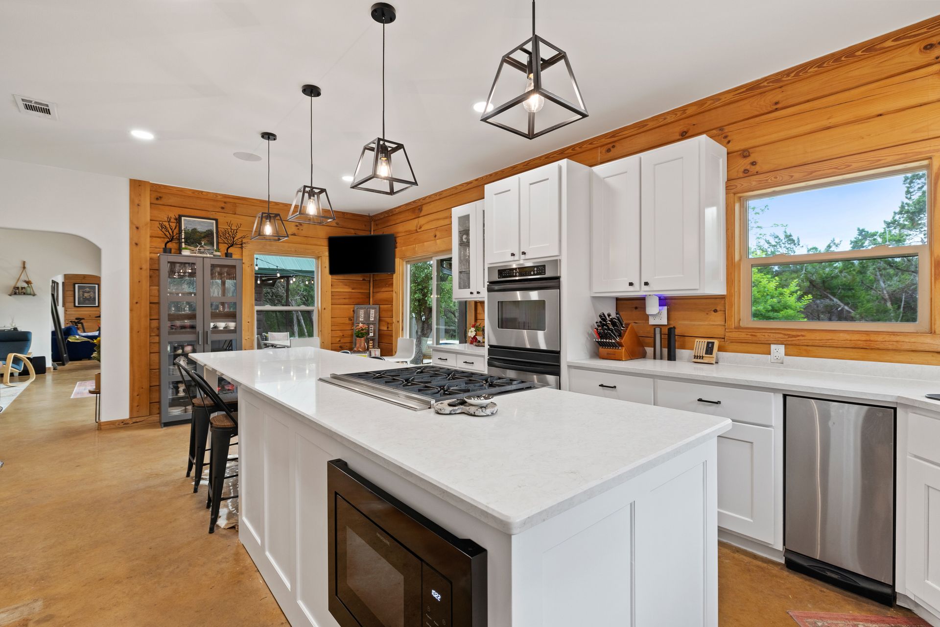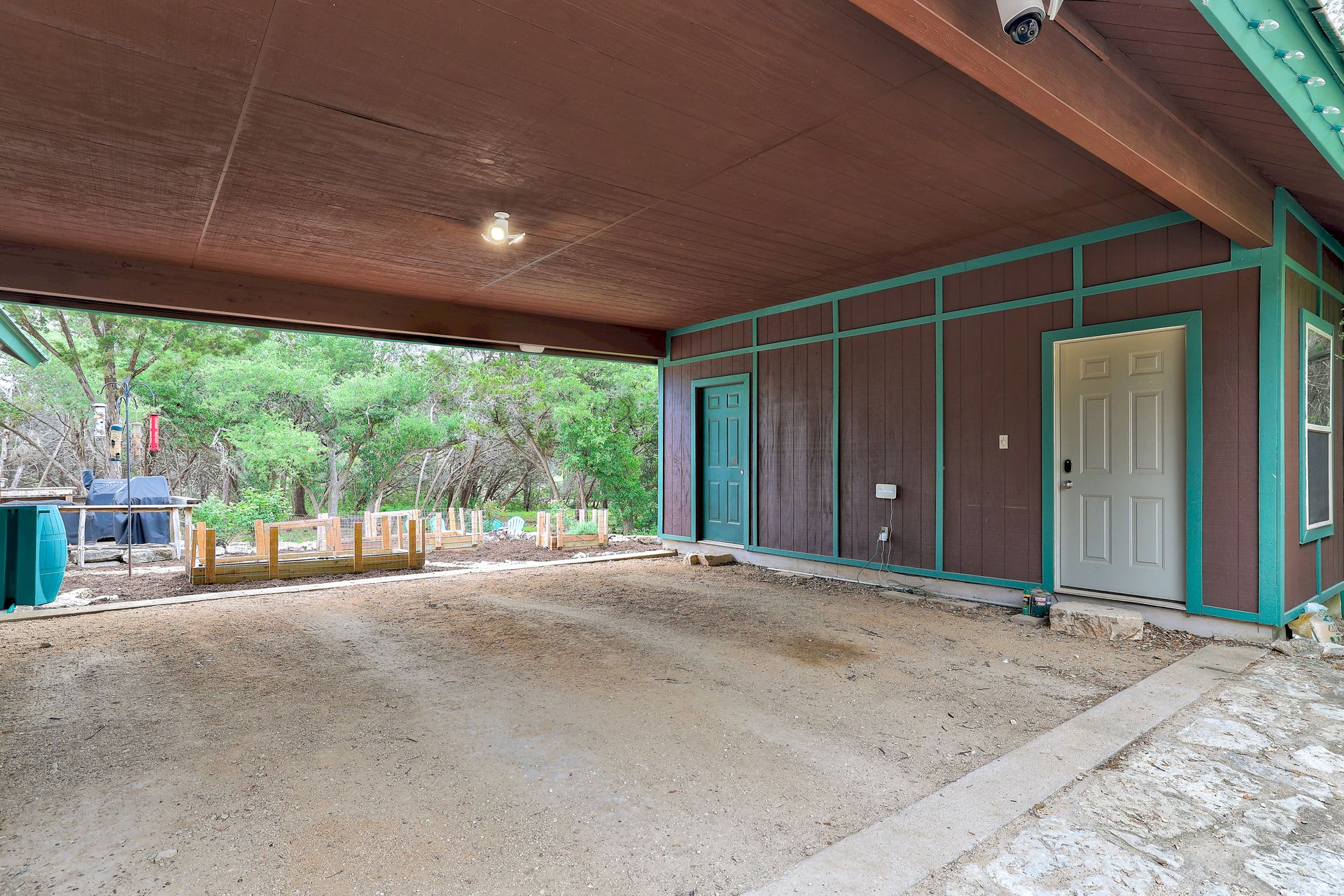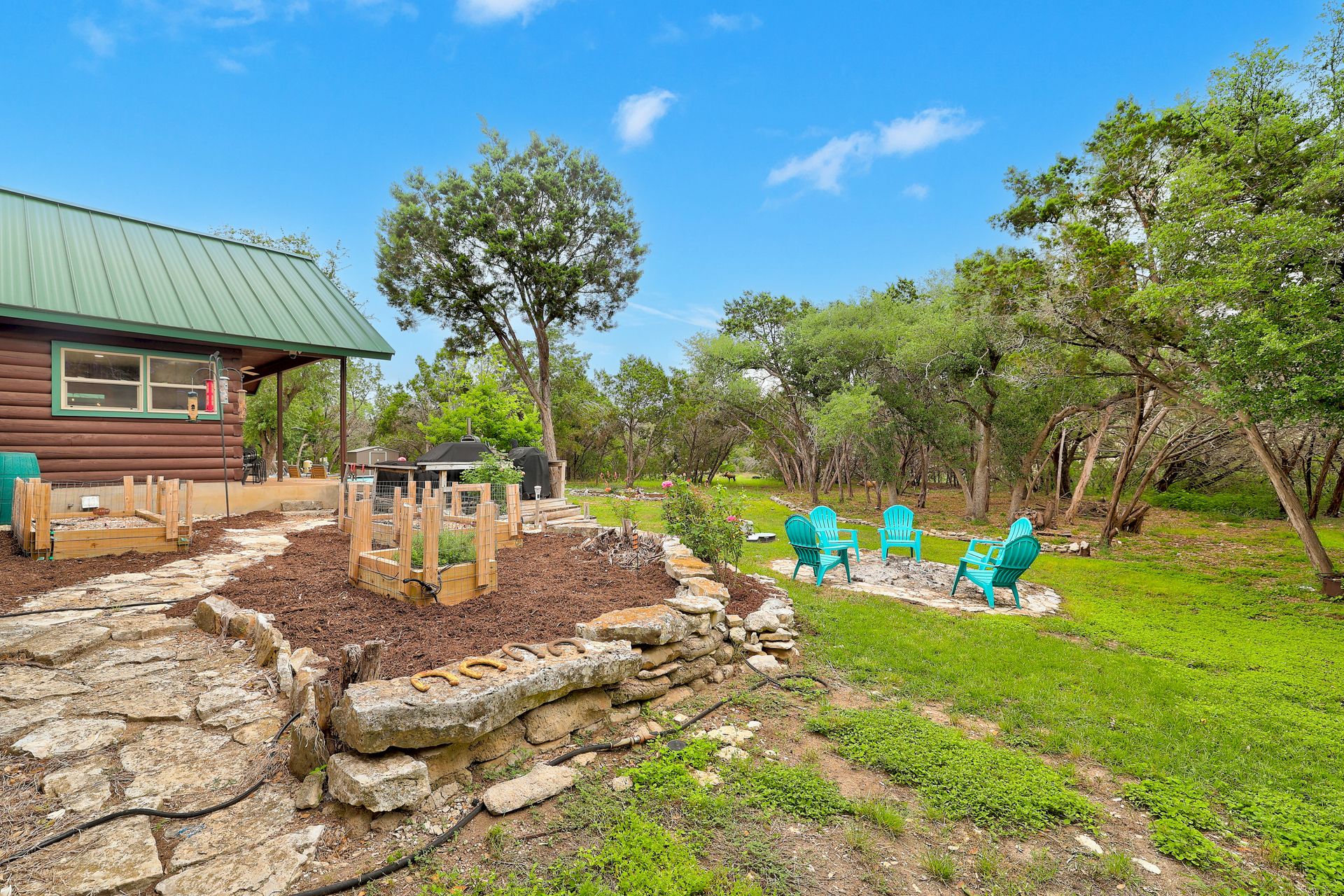 Yes, there is even more... 1.8 acres of this property have been recently professionally fenced with an automated driveway gate for the sellers' three dogs. Also, because it's in ETJ, you can bring almost any other types of critters as well. Plan to relax around the fire pit and garden all year round in the raised beds just outside the kitchen. It just gets better and better... inside the exquisite Craftsman-style front door, you’ll be taken in by the dramatic soaring ceiling with exposed wood all around the great room and a fireplace taking center stage, especially on cool Texas winter evenings.