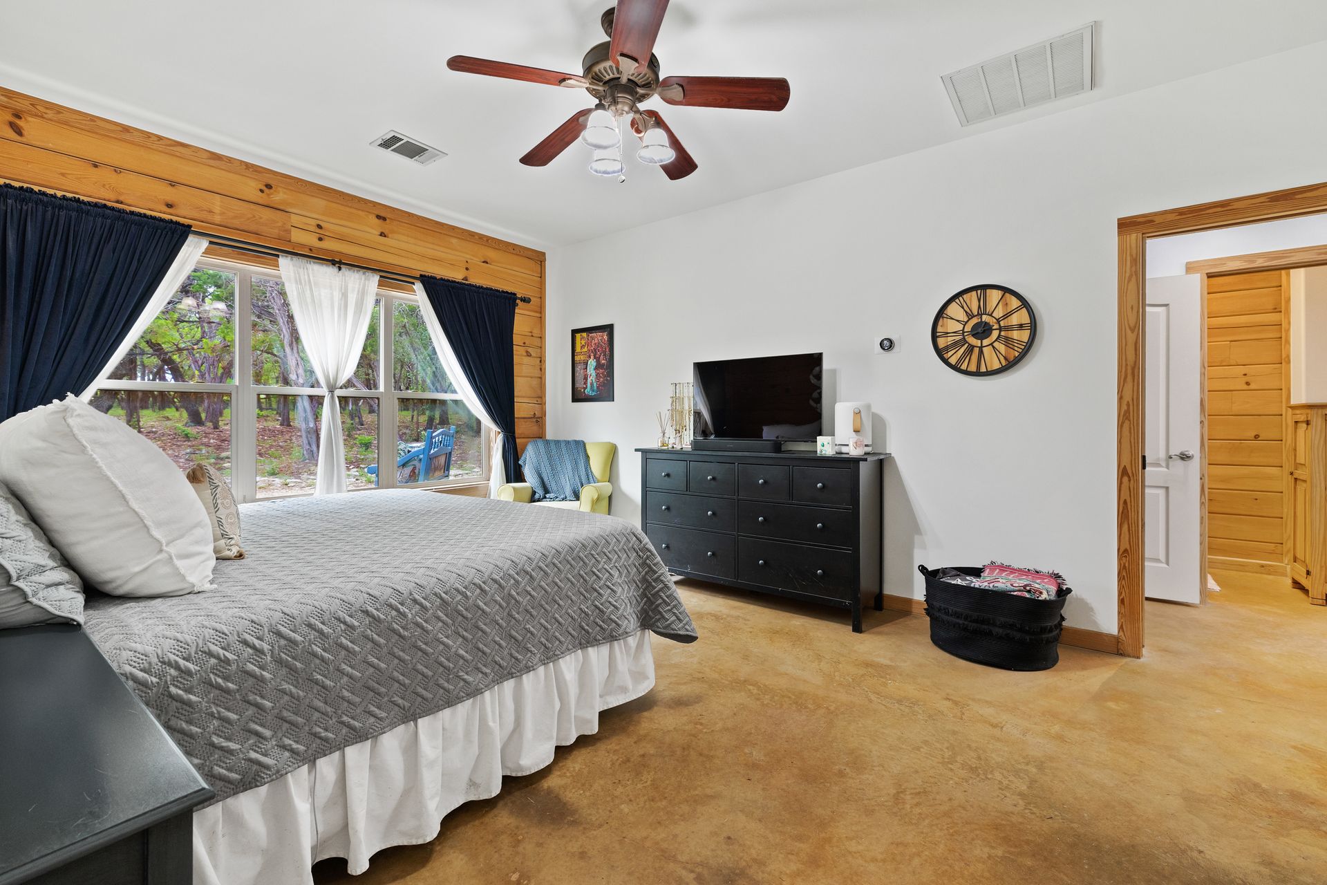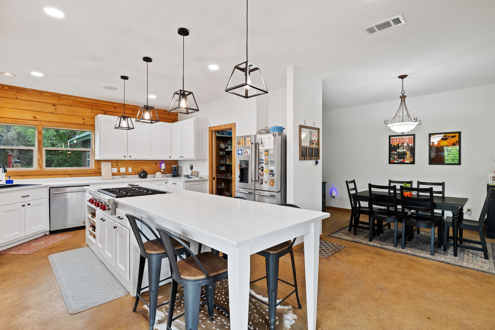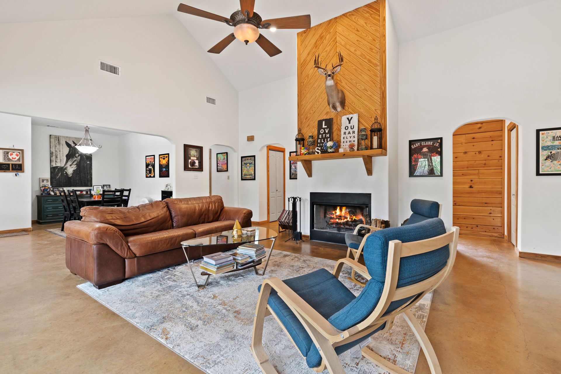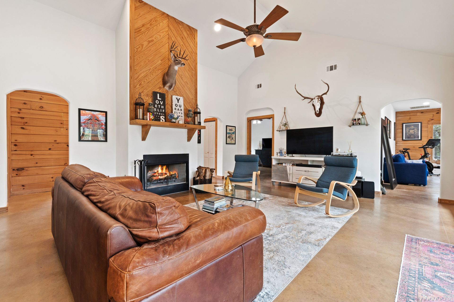 Yes, there is even more... 1.8 acres of this property have been recently professionally fenced with an automated driveway gate for the sellers' three dogs. Also, because it's in ETJ, you can bring almost any other types of critters as well. Plan to relax around the fire pit and garden all year round in the raised beds just outside the kitchen. It just gets better and better... inside the exquisite Craftsman-style front door, you’ll be taken in by the dramatic soaring ceiling with exposed wood all around the great room and a fireplace taking center stage, especially on cool Texas winter evenings.