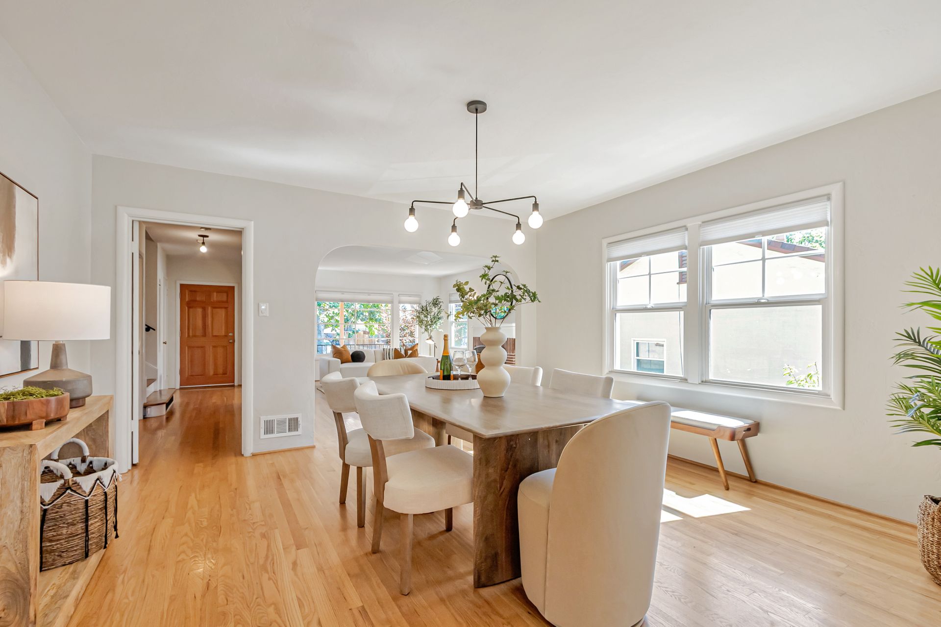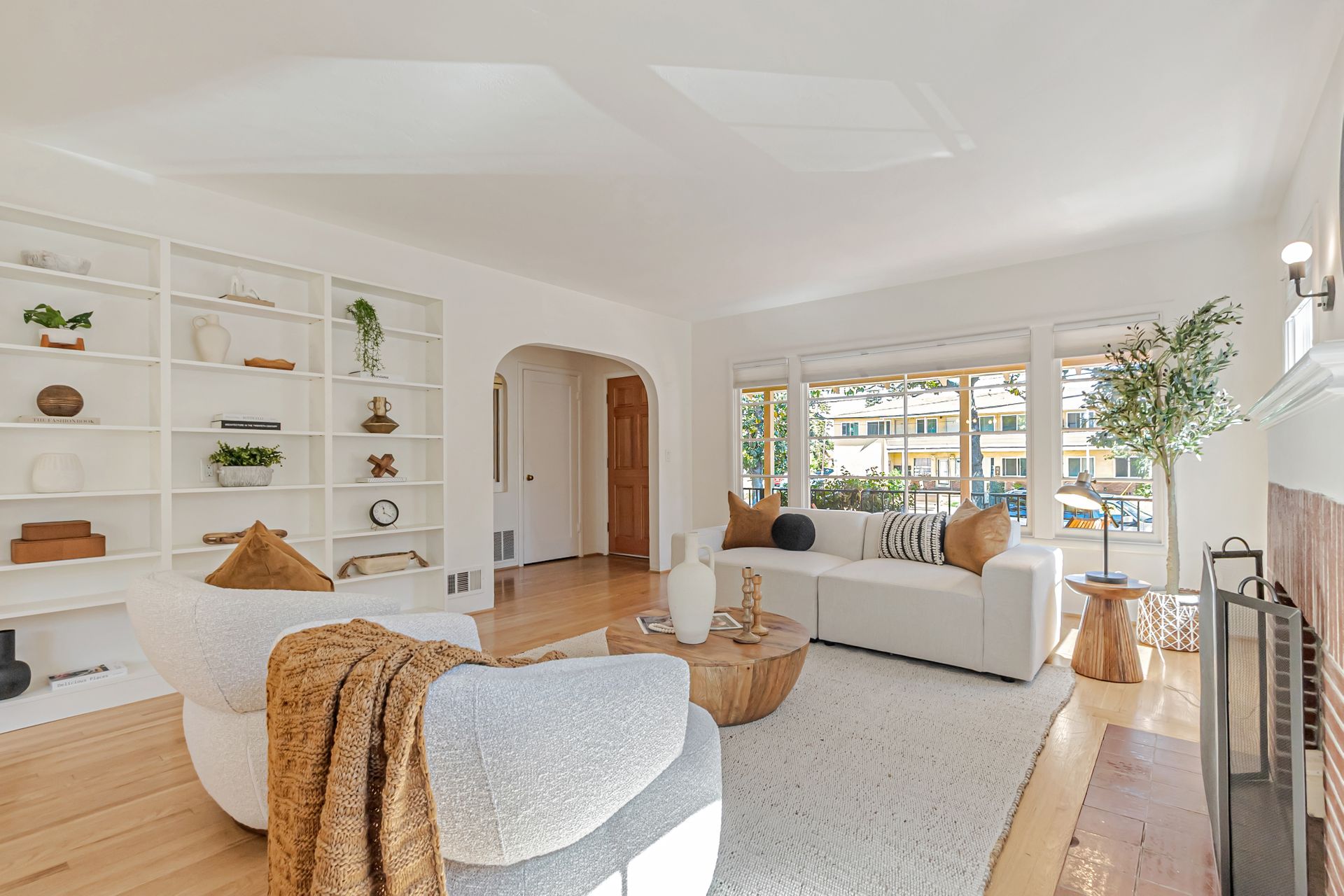 Upon entering, you’re greeted by gleaming hardwood floors and an abundance of natural light. The spacious living room boasts a large picture window, a cozy fireplace, and custom built-in bookcases, creating a welcoming space for relaxation or entertaining. The formal dining room features a designer light fixture, ideal for enjoying meals or hosting guests.