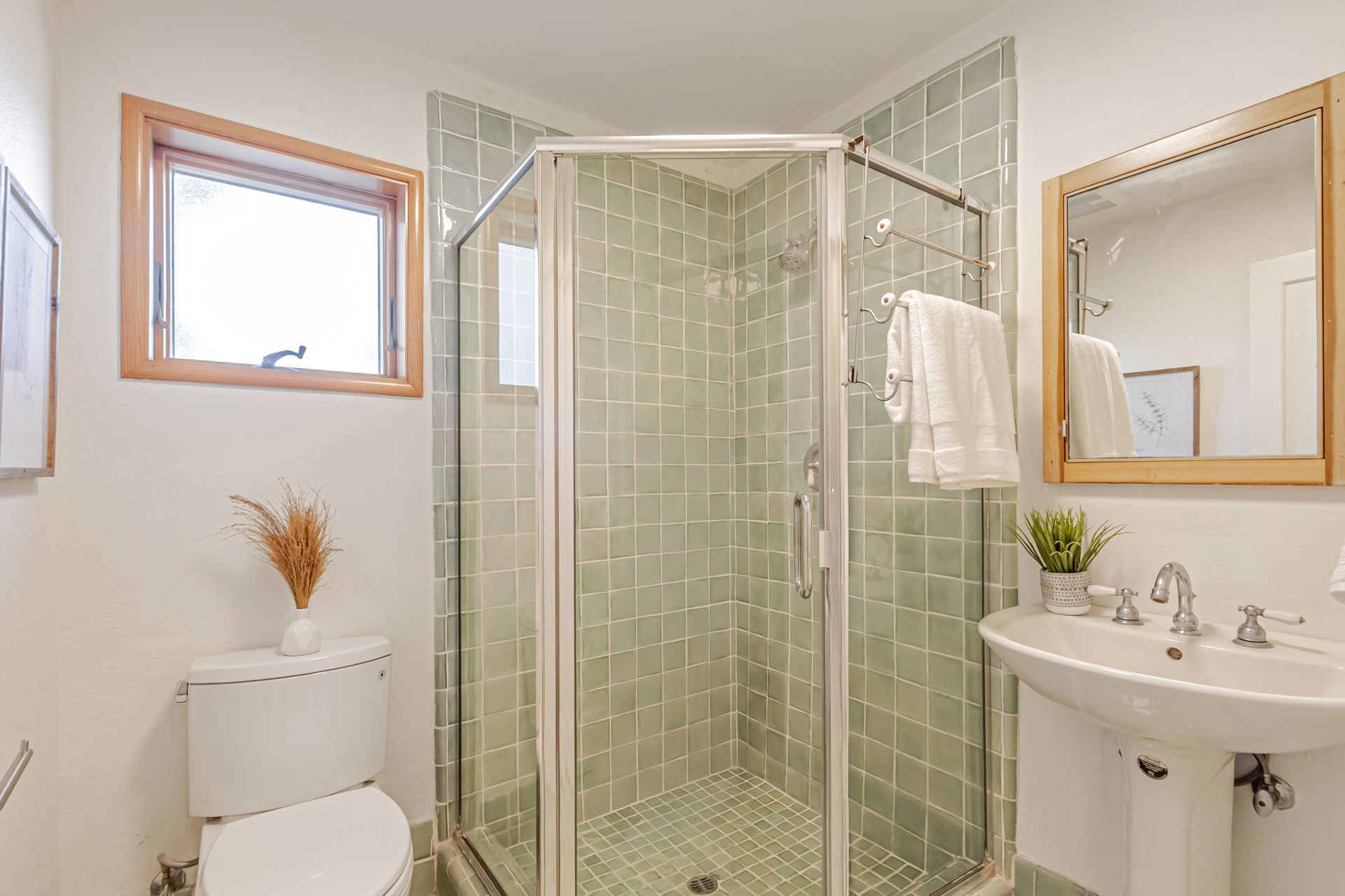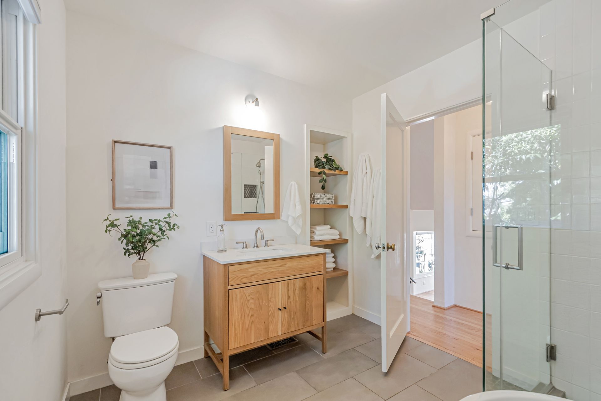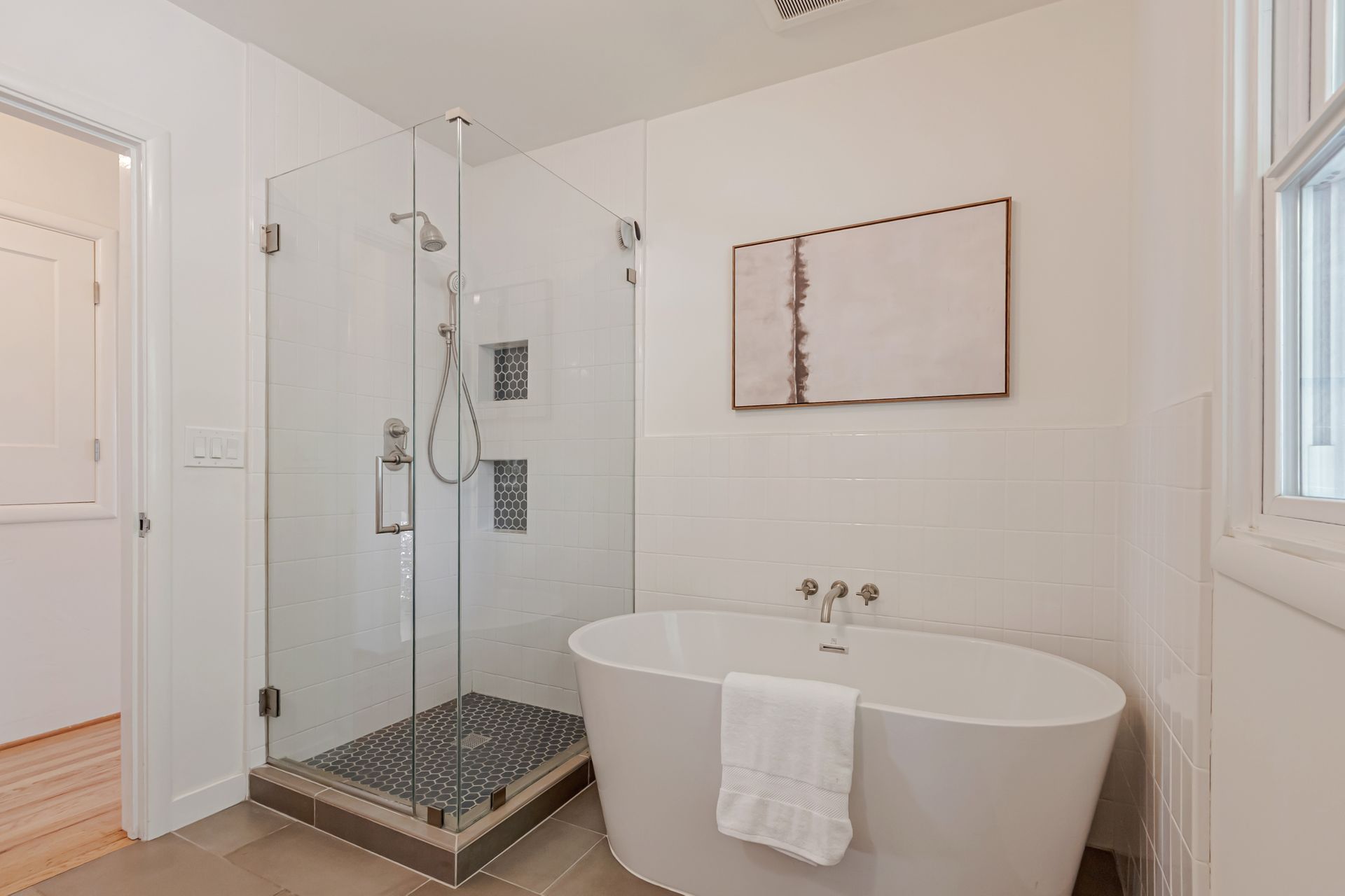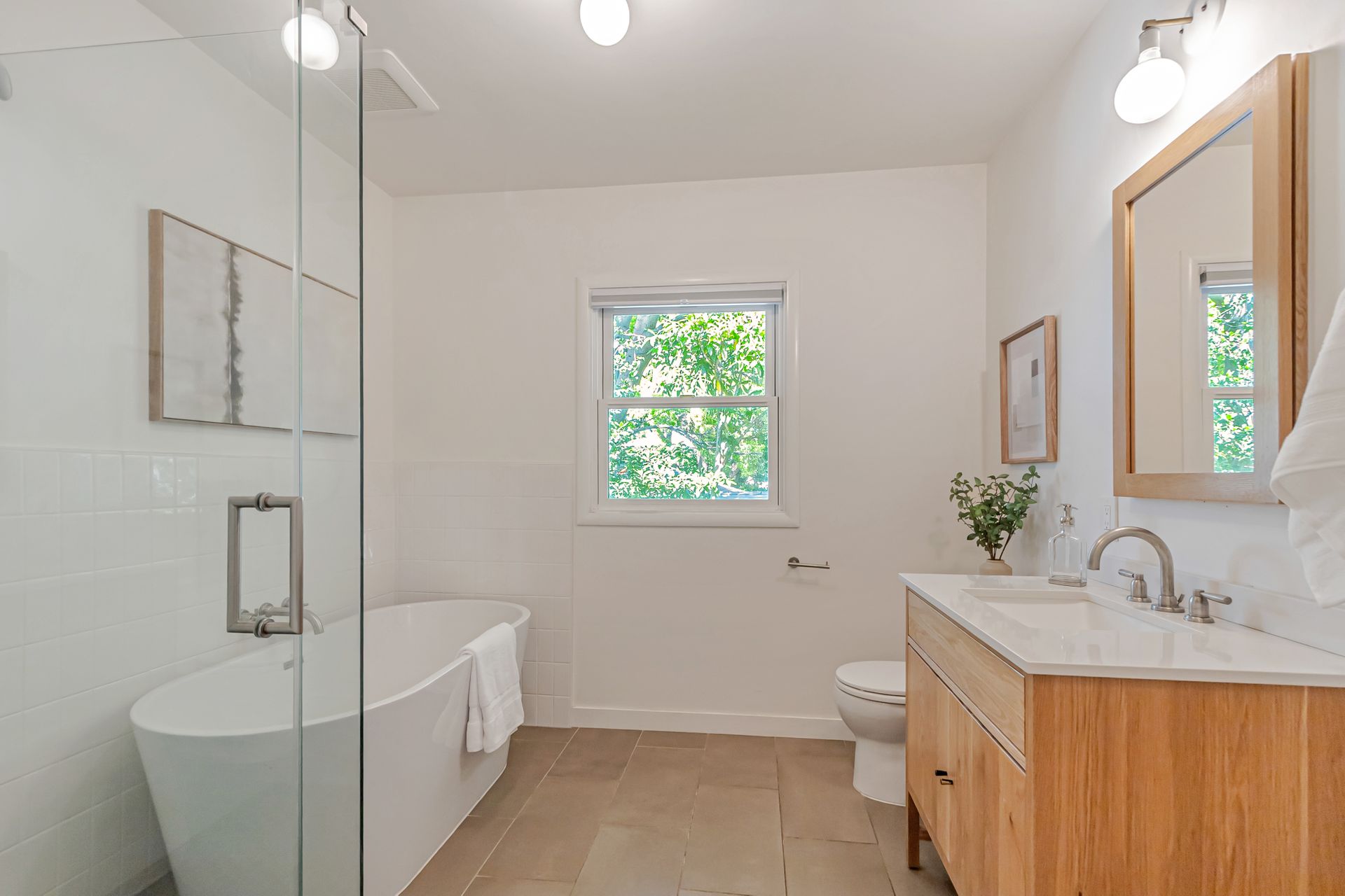The luxurious, remodeled upstairs bathroom includes a floating bathtub and a stylish tile stall shower—offering a spa-like retreat.