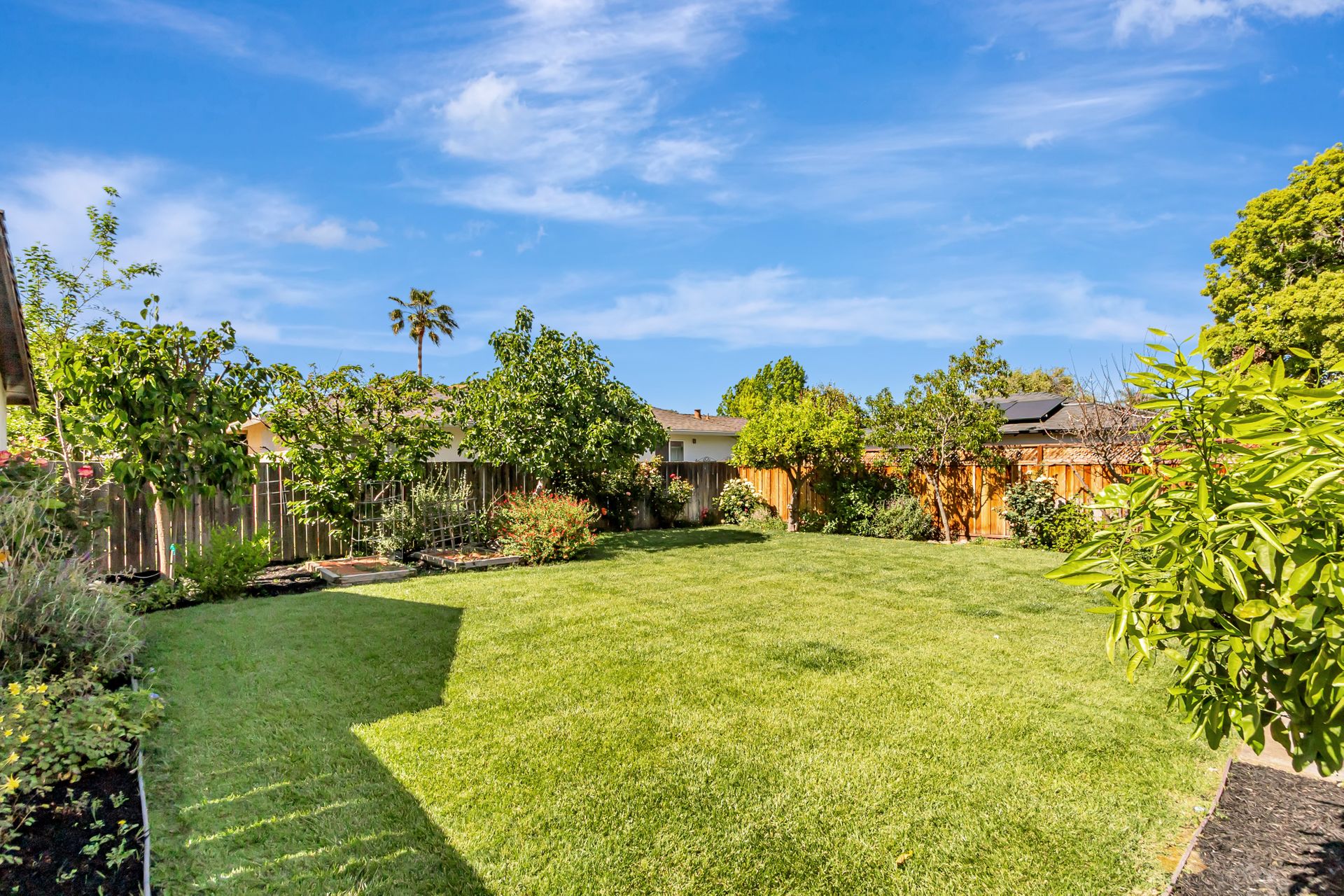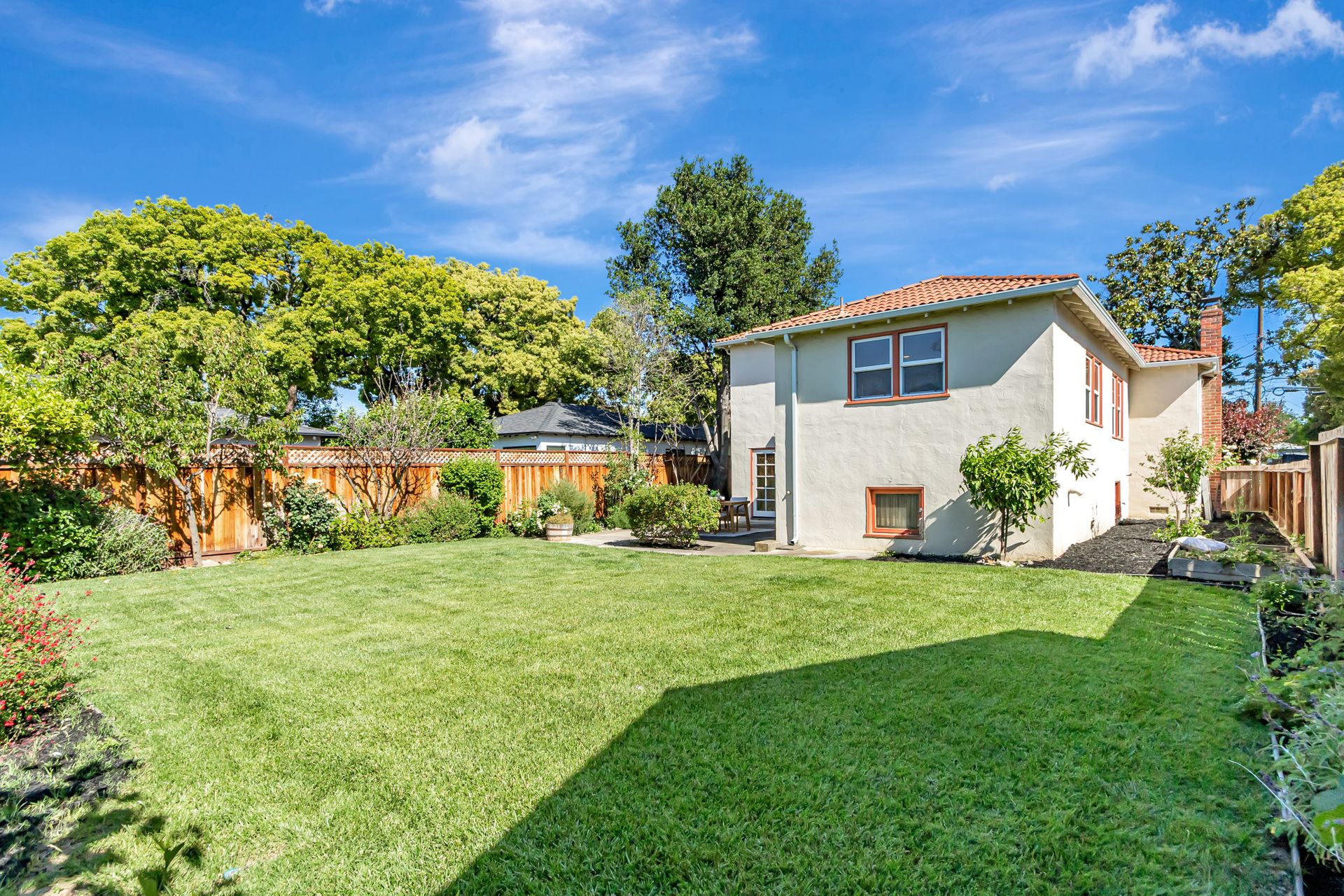 The professionally landscaped backyard is a true oasis, featuring mature trees, vibrant rose bushes, raised garden beds, and a lush lawn—ideal for outdoor living, gardening, or simply unwinding in your private space.